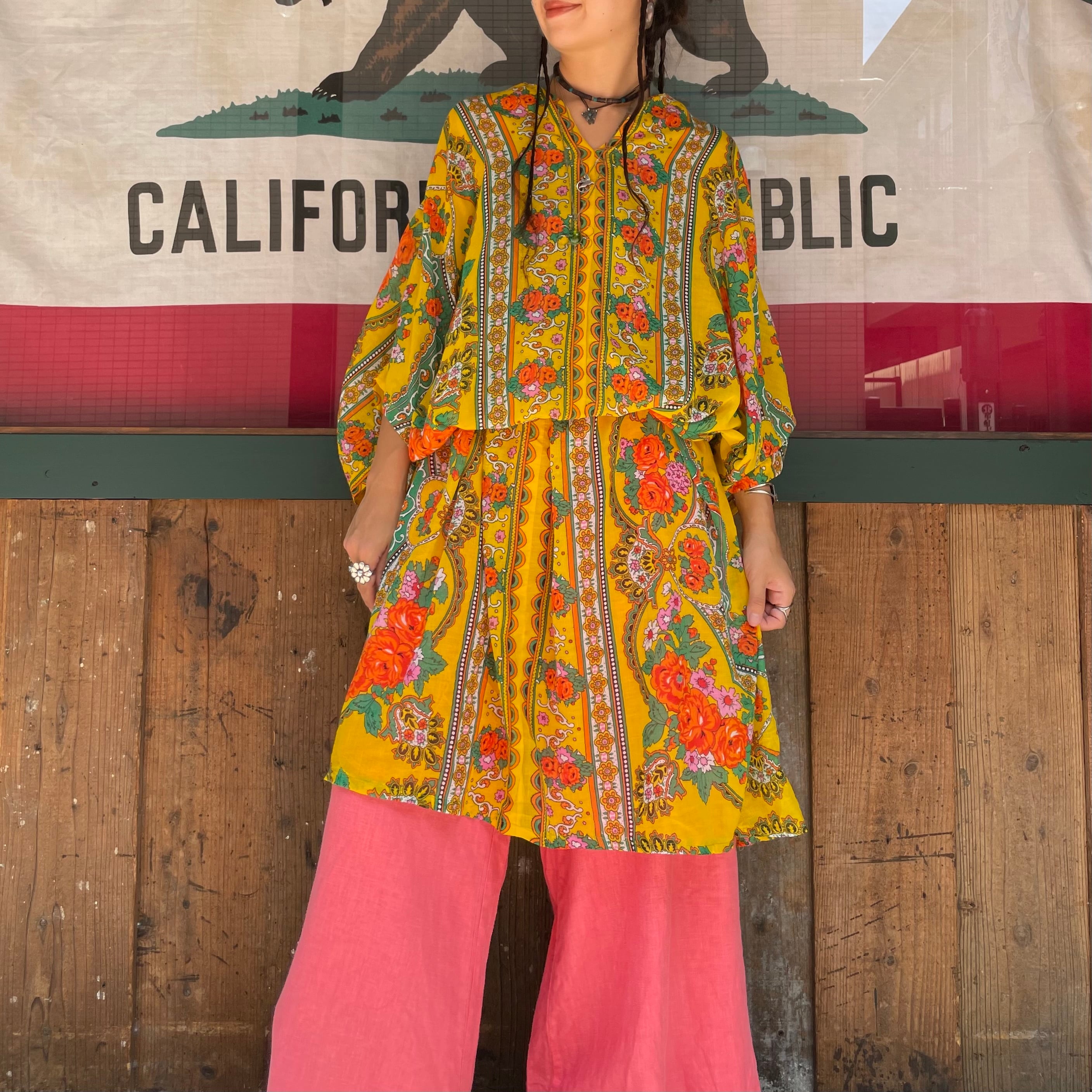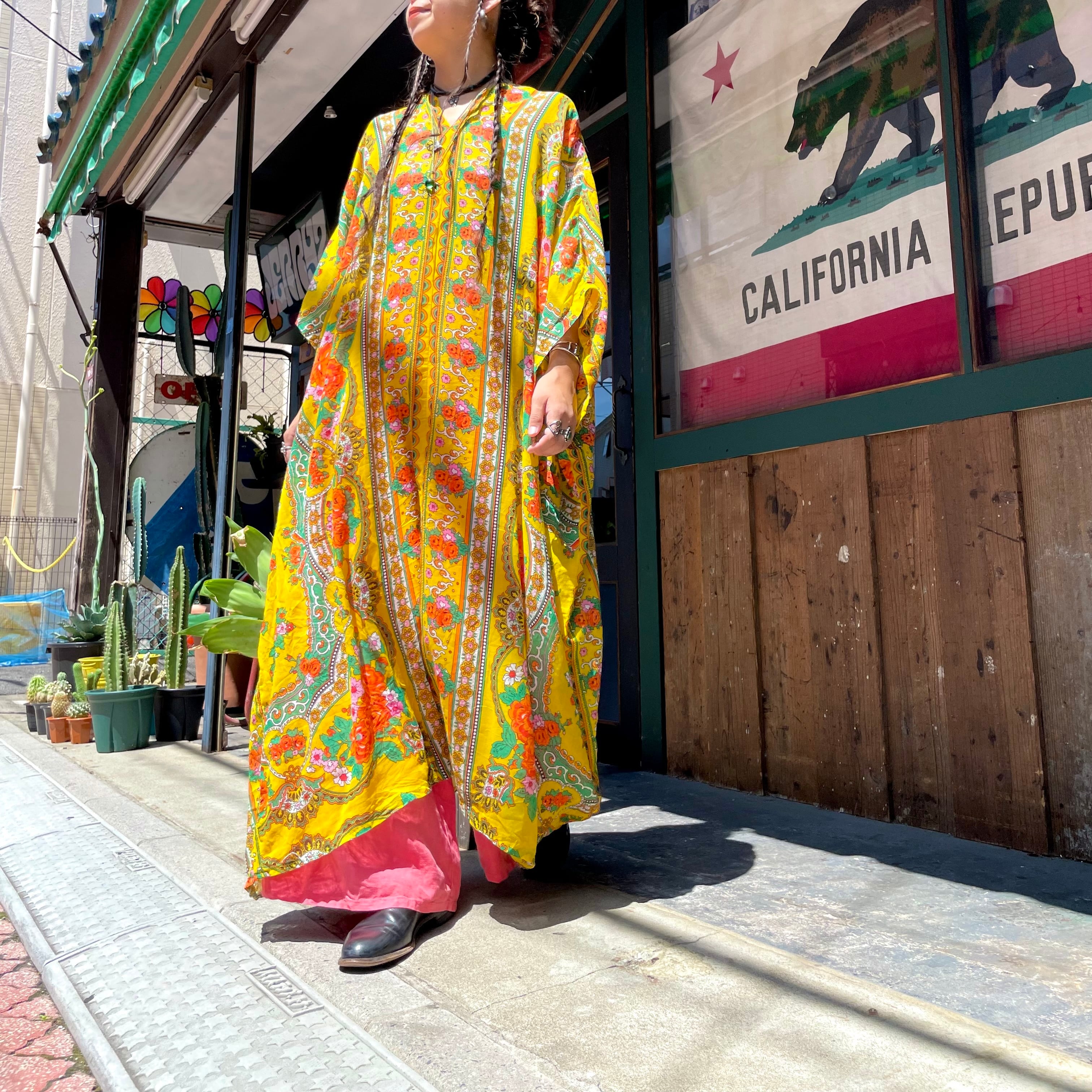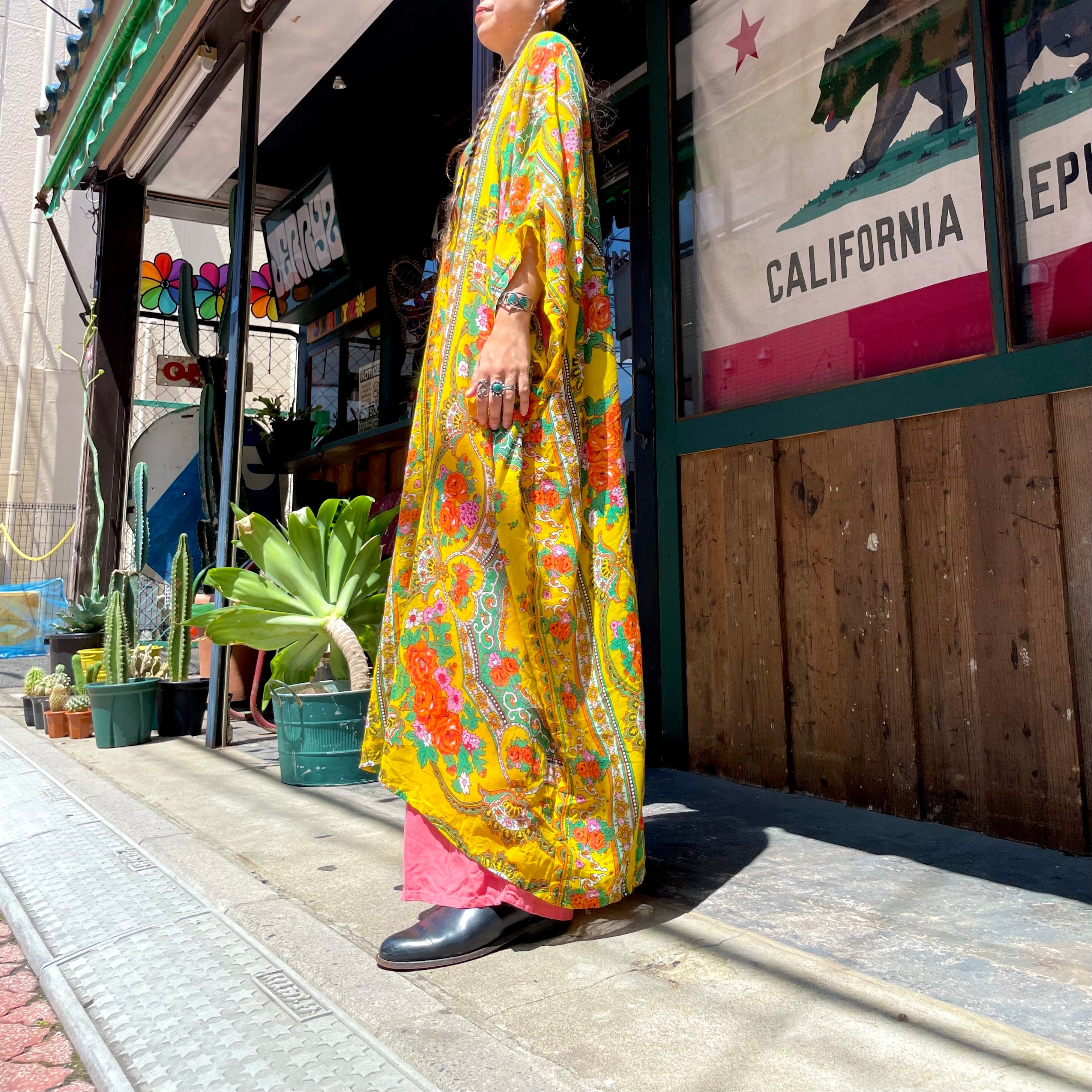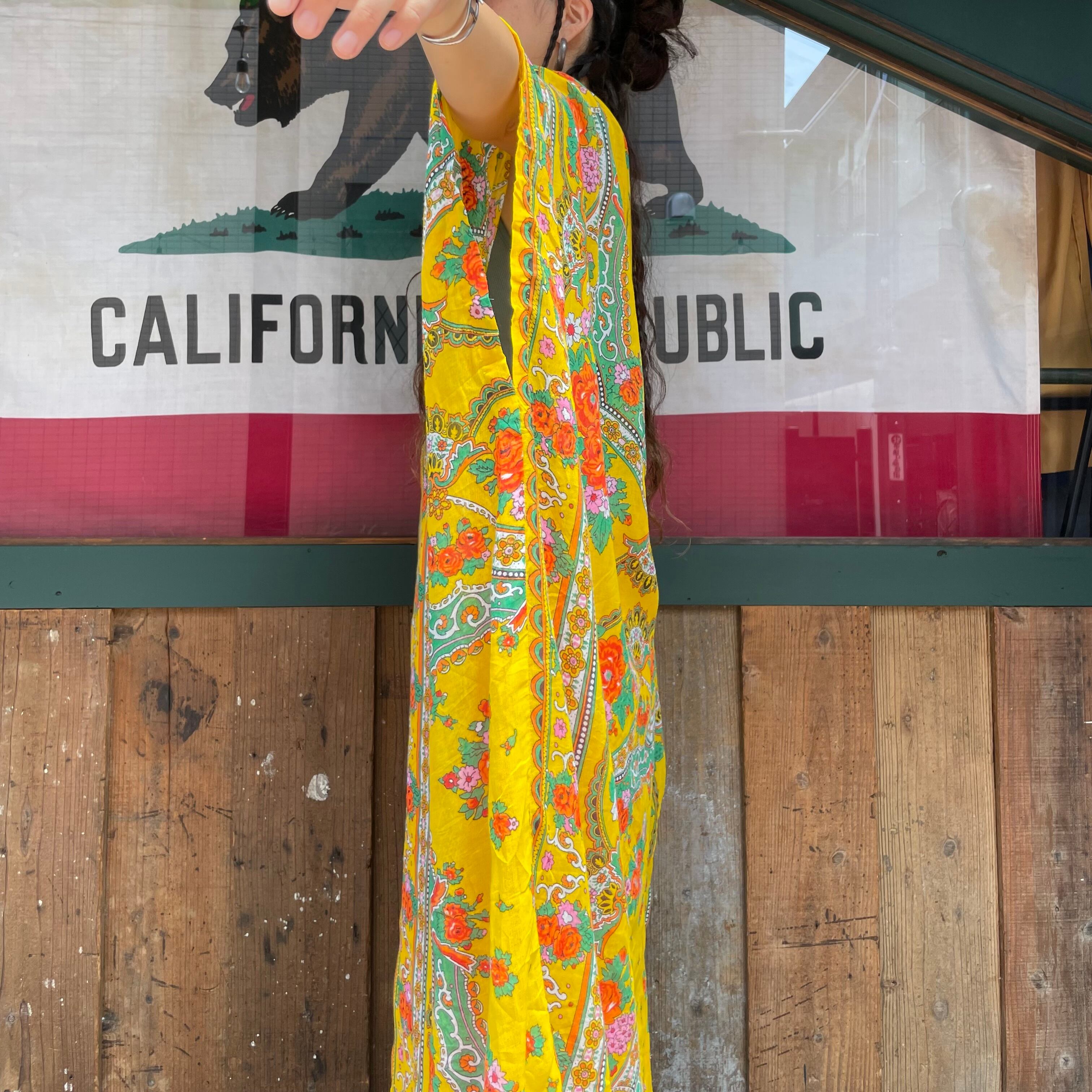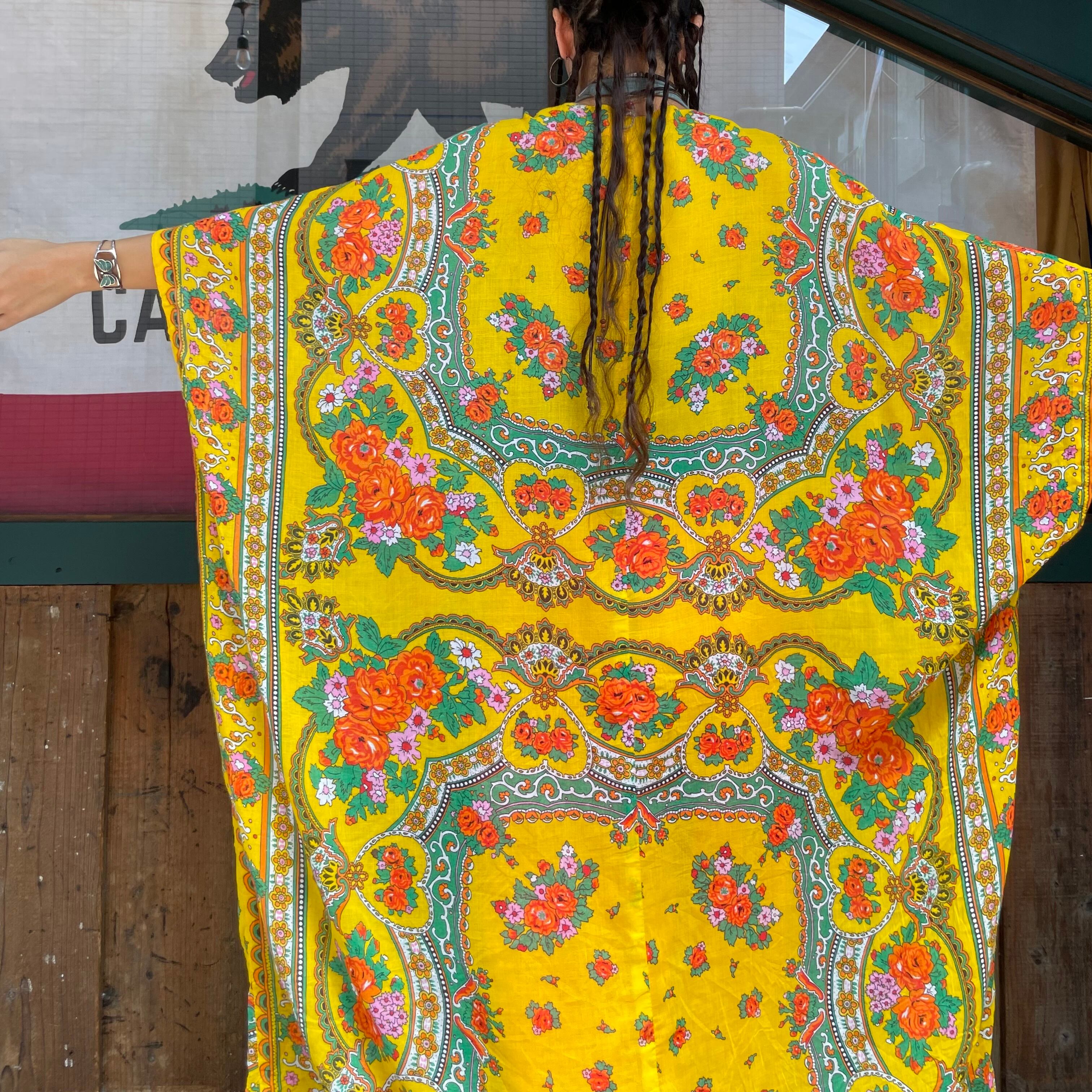 ハッピーな黄色に花柄がかわいいポンチョ型のようなワンピースです。袖口はありますが、袖は区切られておらず長方形なデザインです。