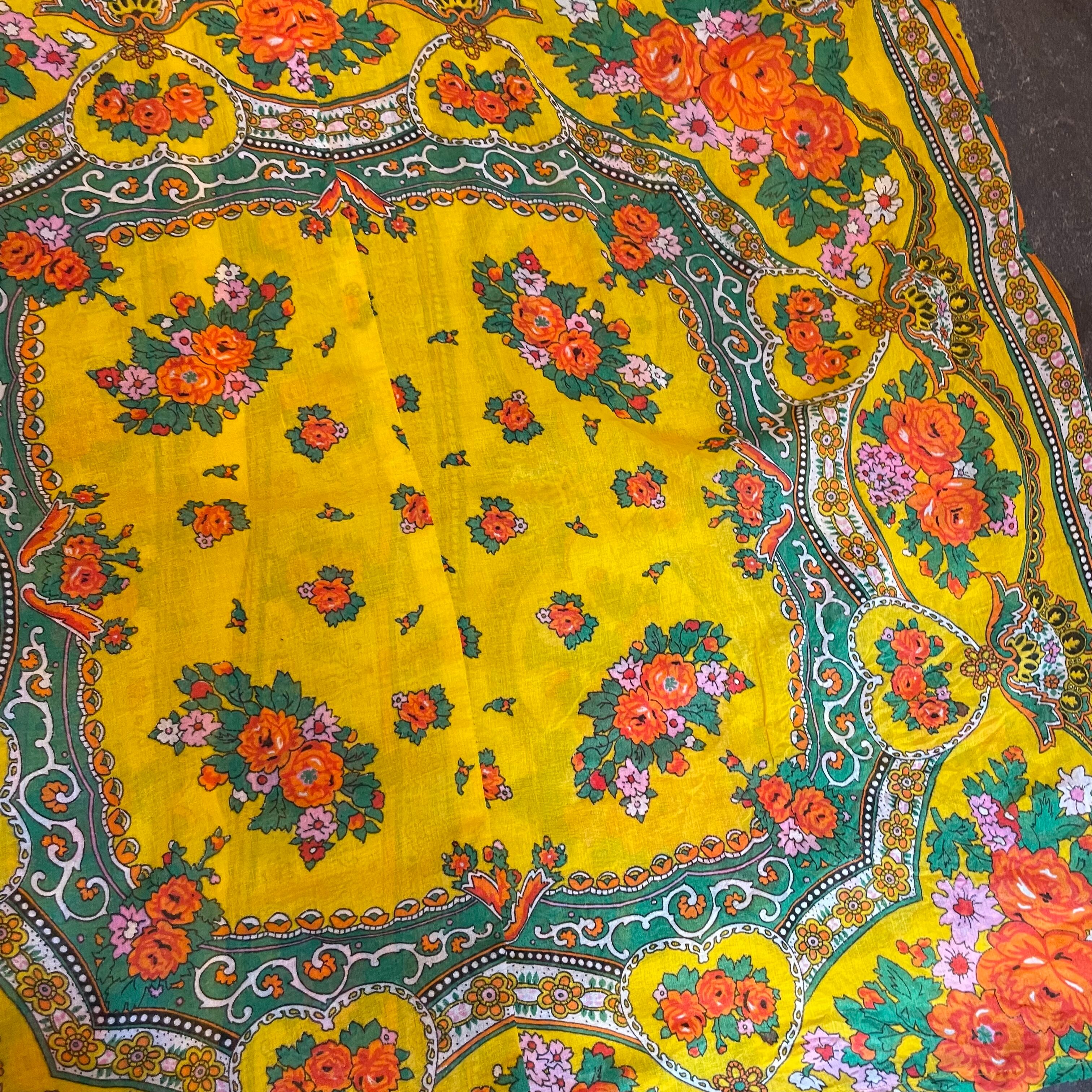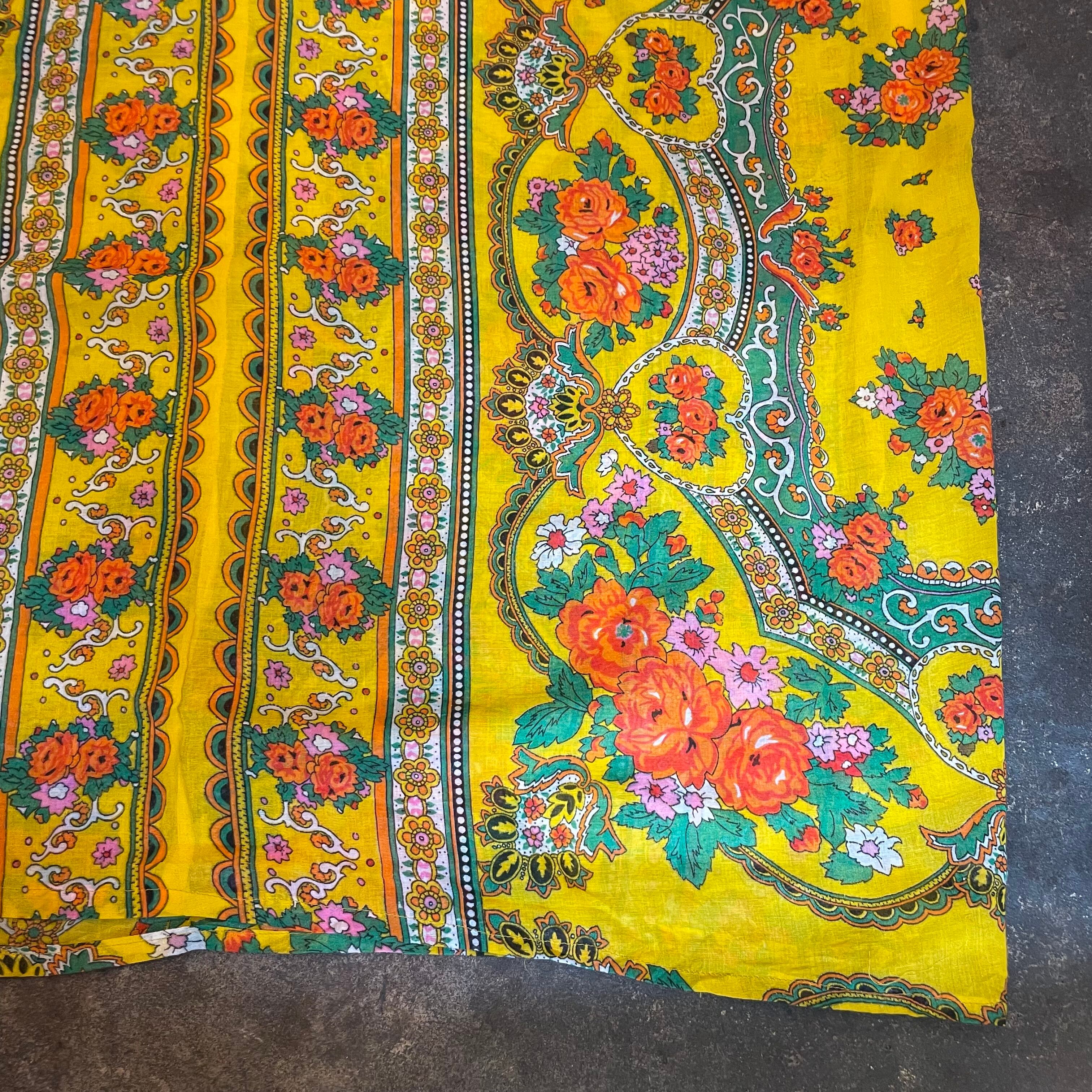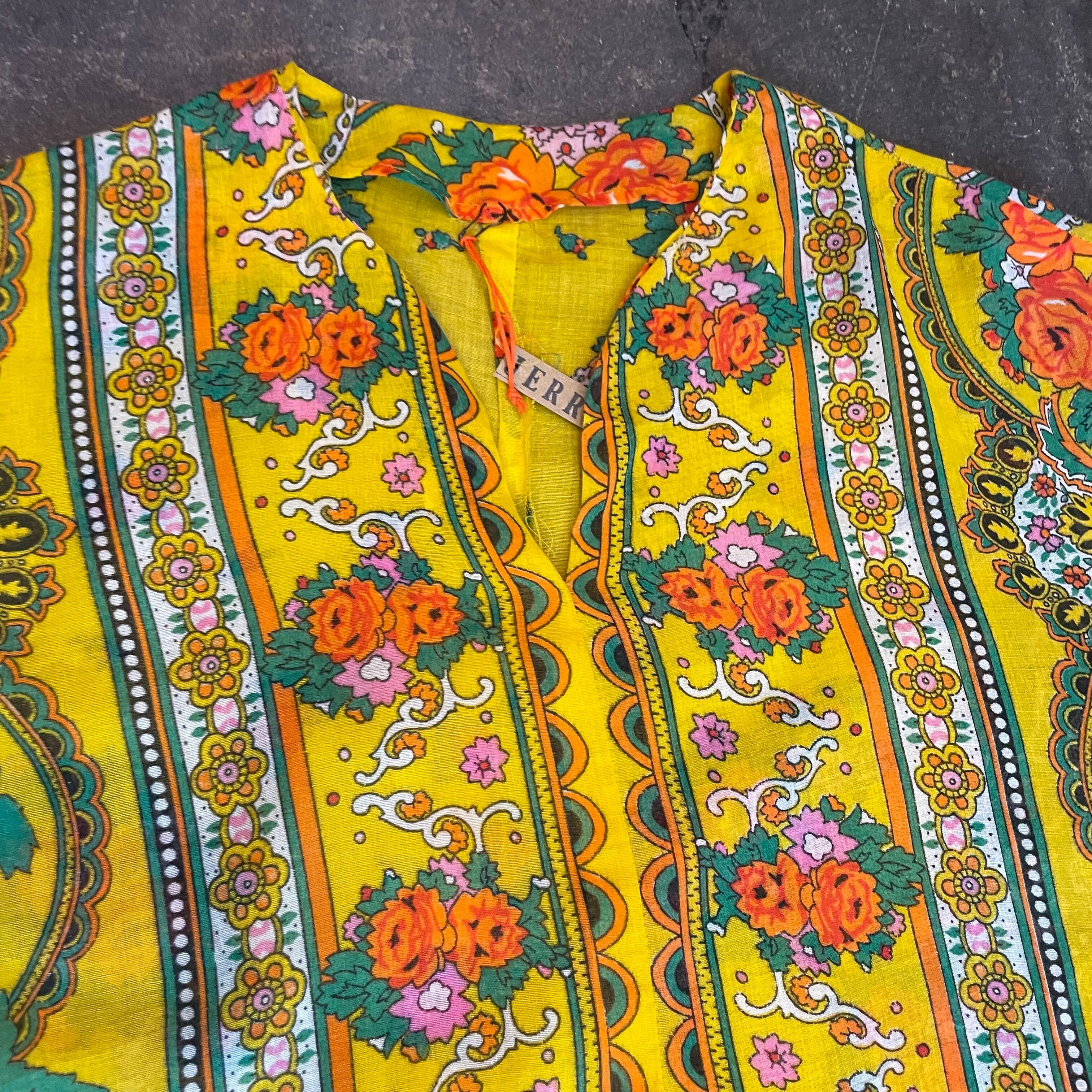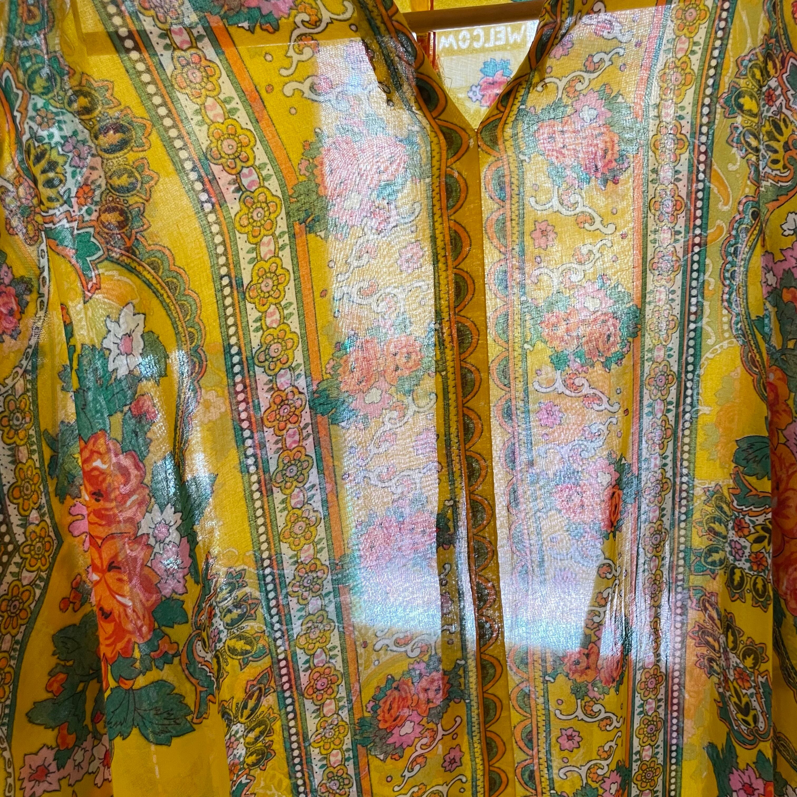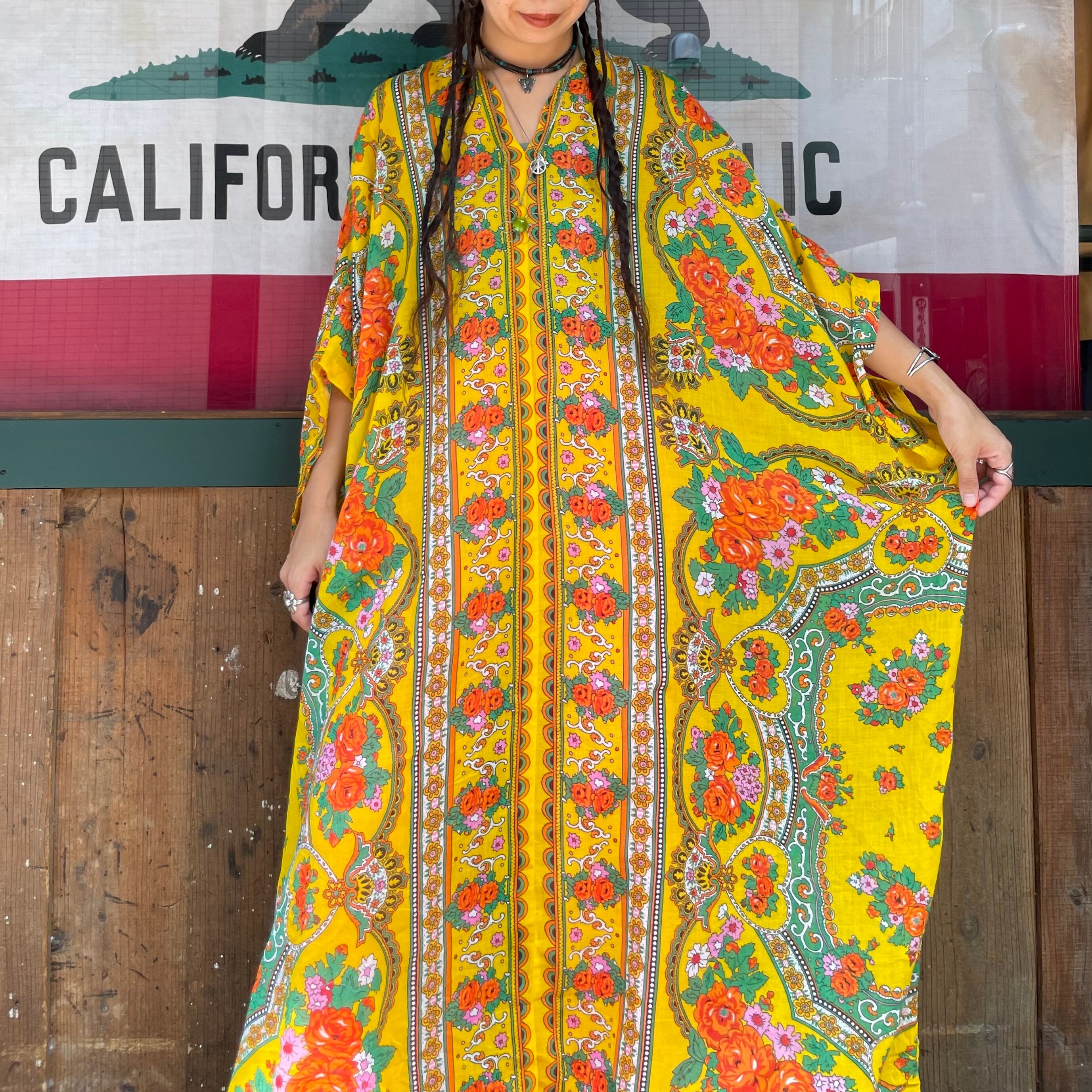ハッピーな黄色に花柄がかわいいポンチョ型のようなワンピースです。袖口はありますが、袖は区切られておらず長方形なデザインです。
