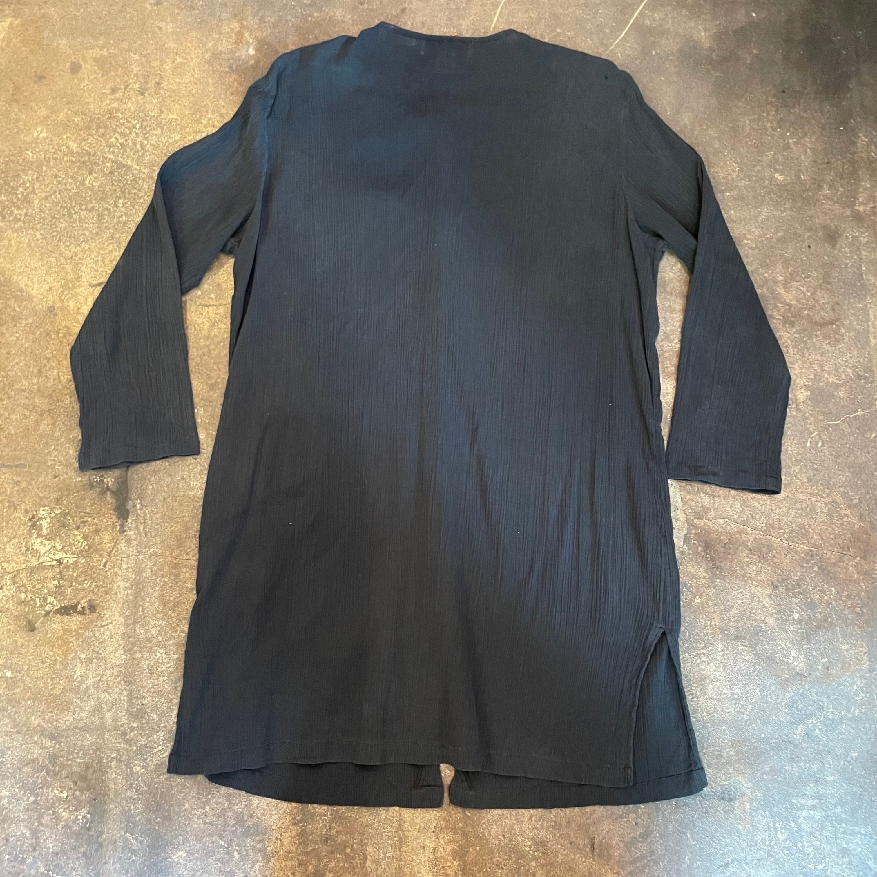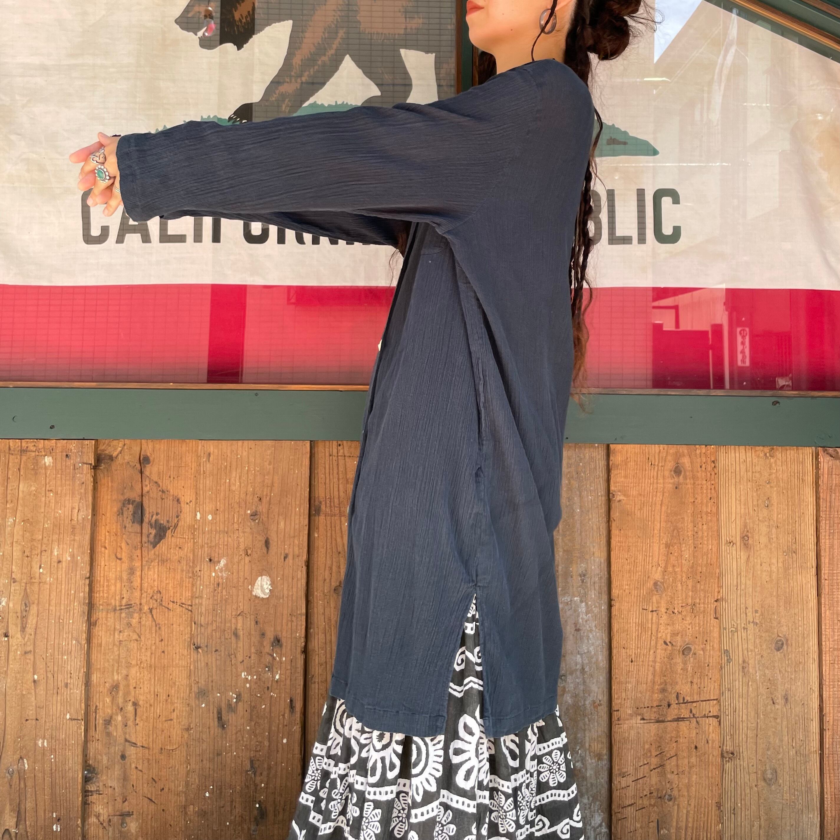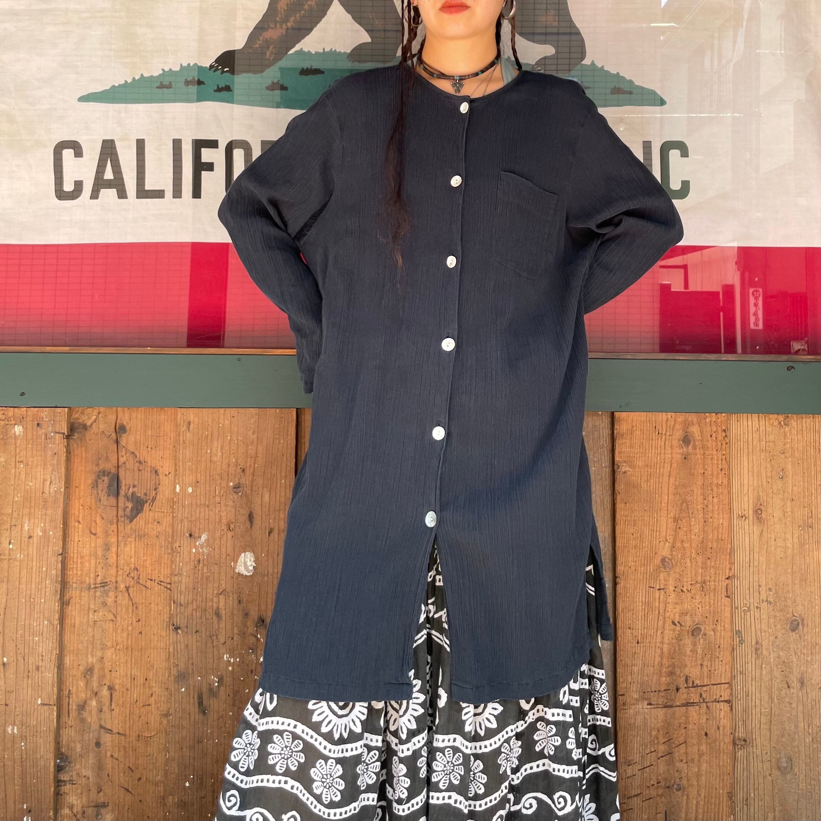 長袖で着丈も長くスリットや胸ポケットがありシンプルなデザインではありますが、シェルボタンがキラッとつやっと印象的ですし天然素材にこだわったナチュラルな雰囲気もあります。