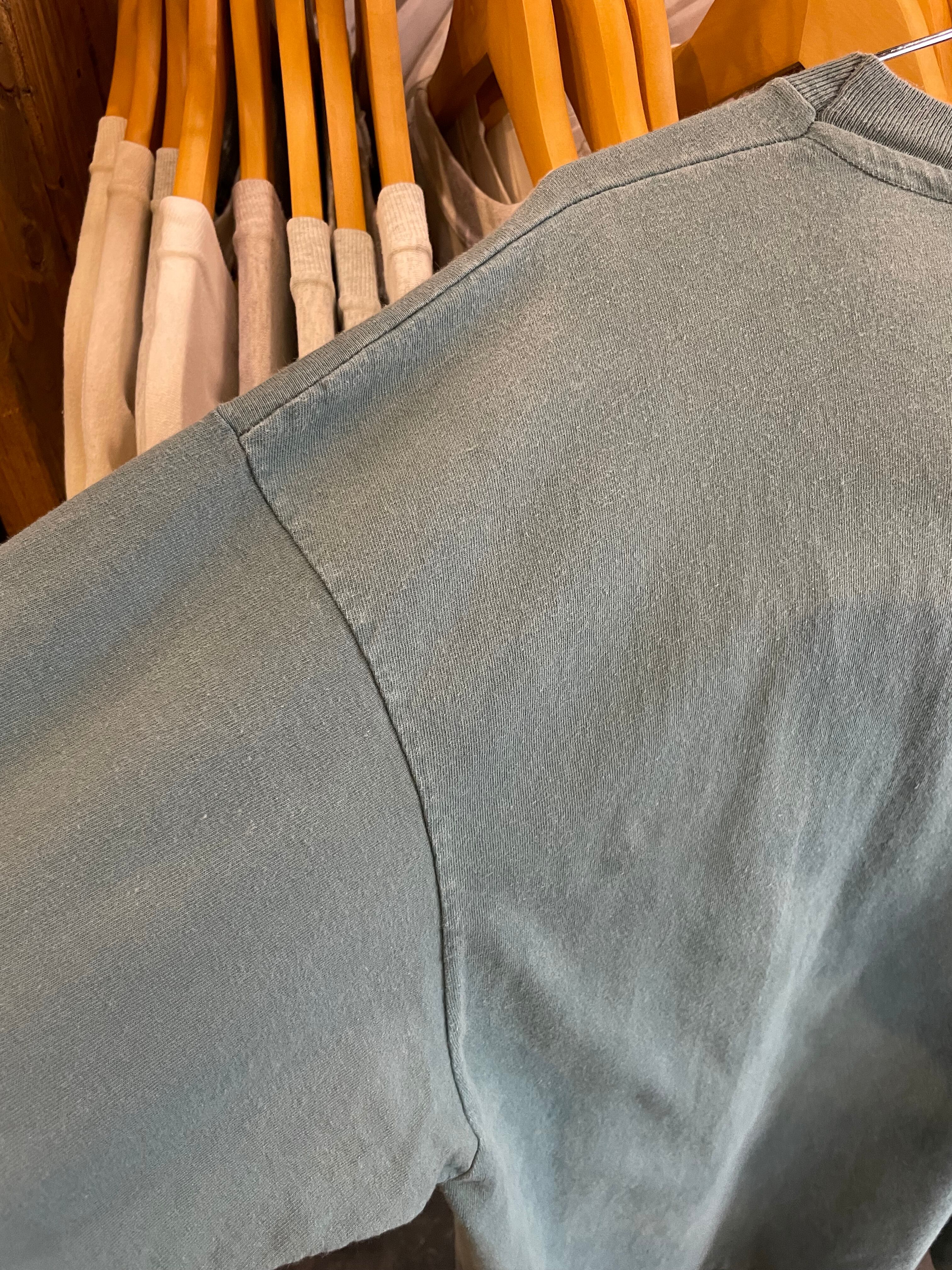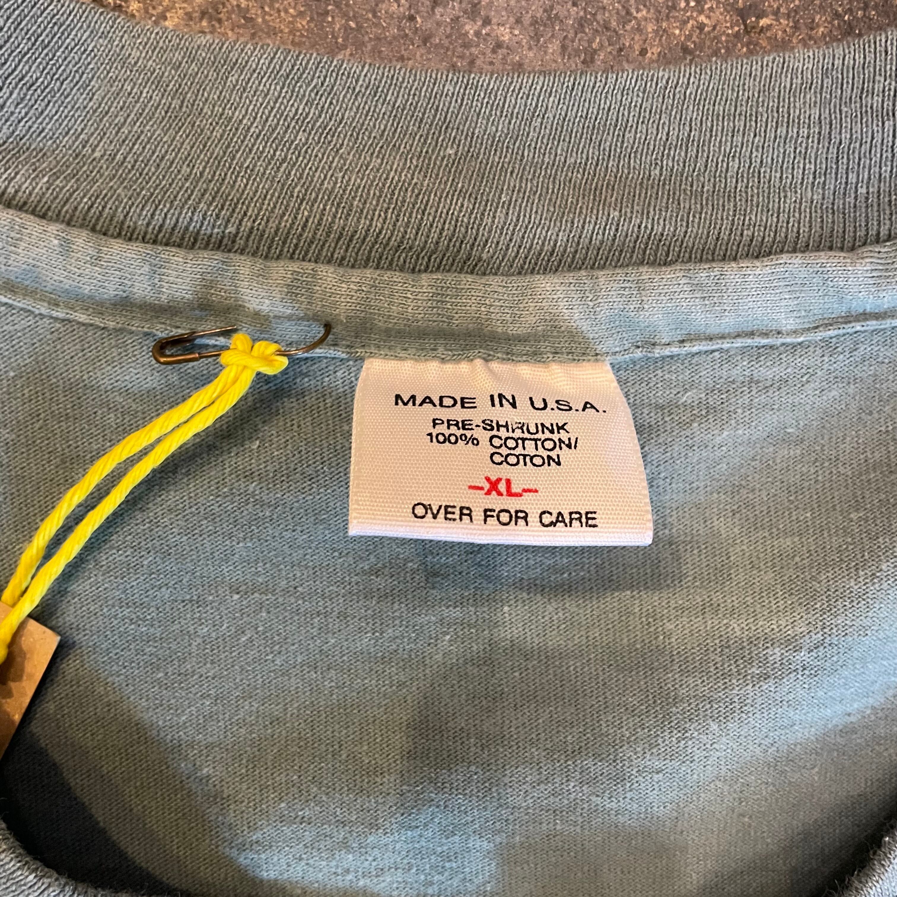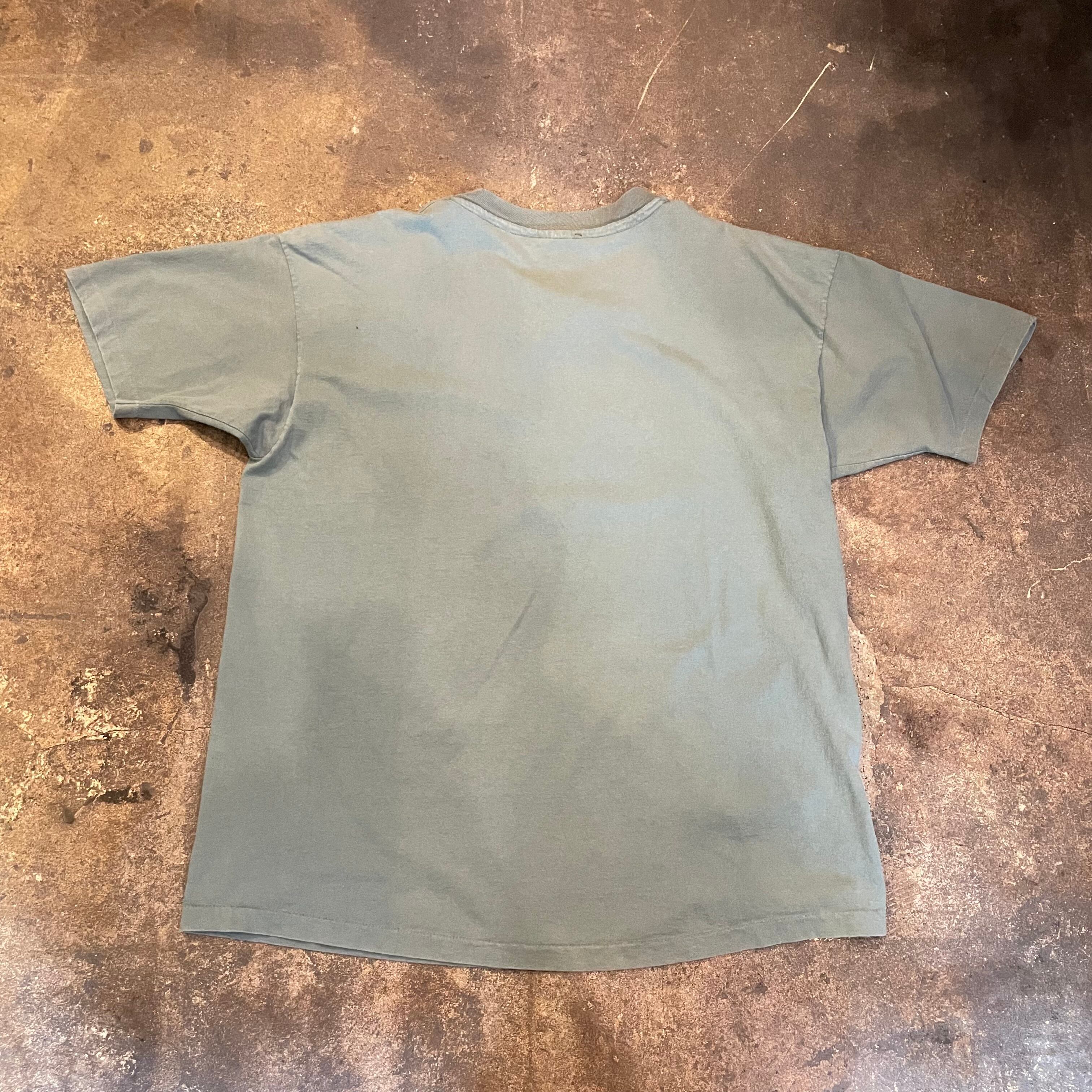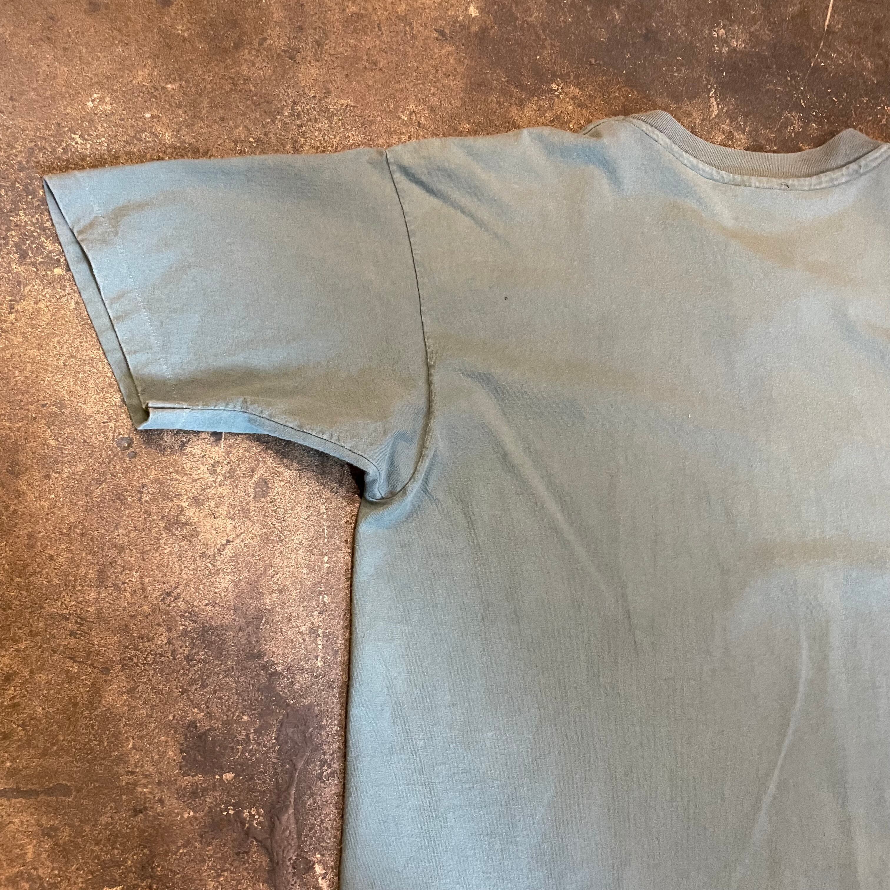 くすんだ青緑っぽい絶妙な色味がとても良い感じの90年代USA製のプリントTシャツです。