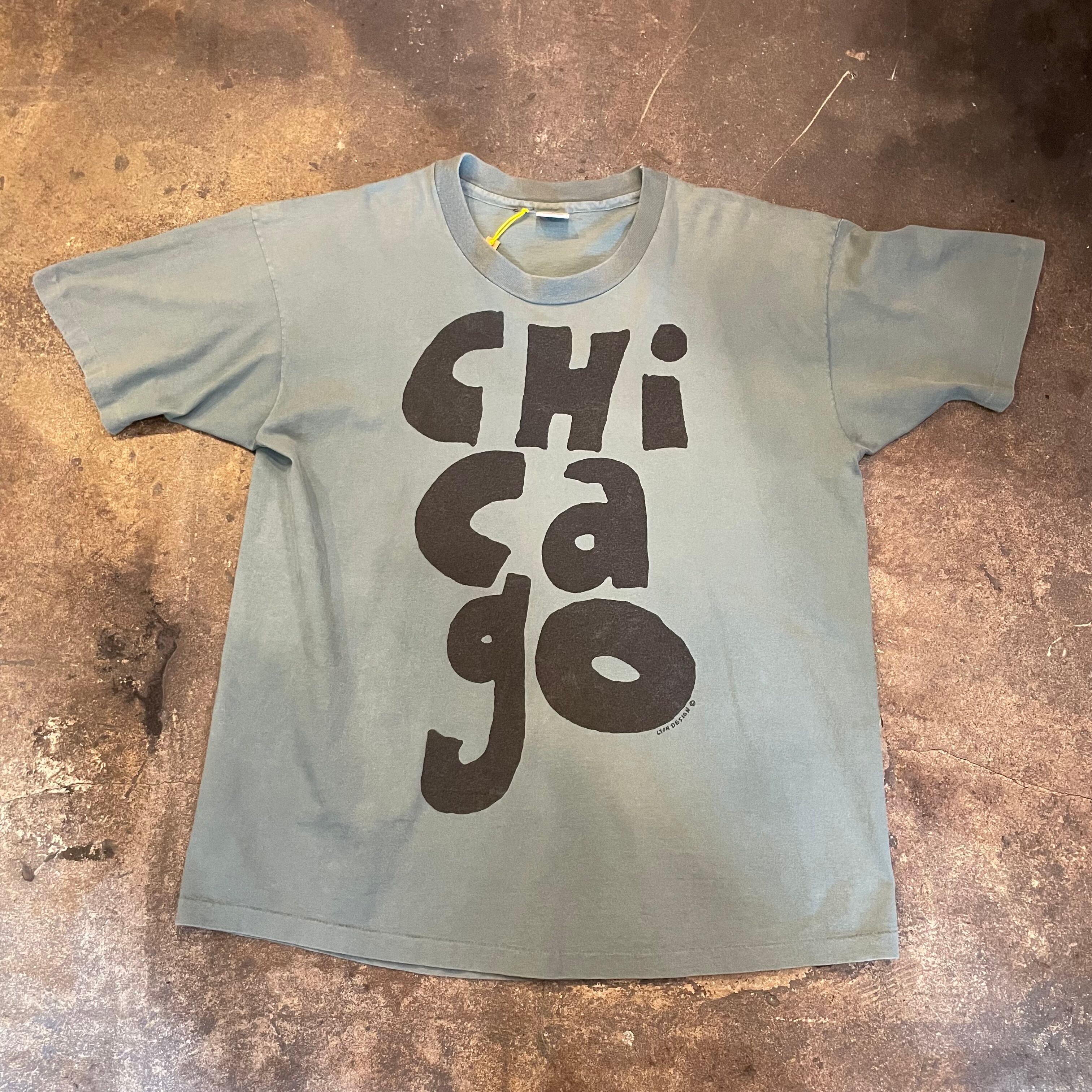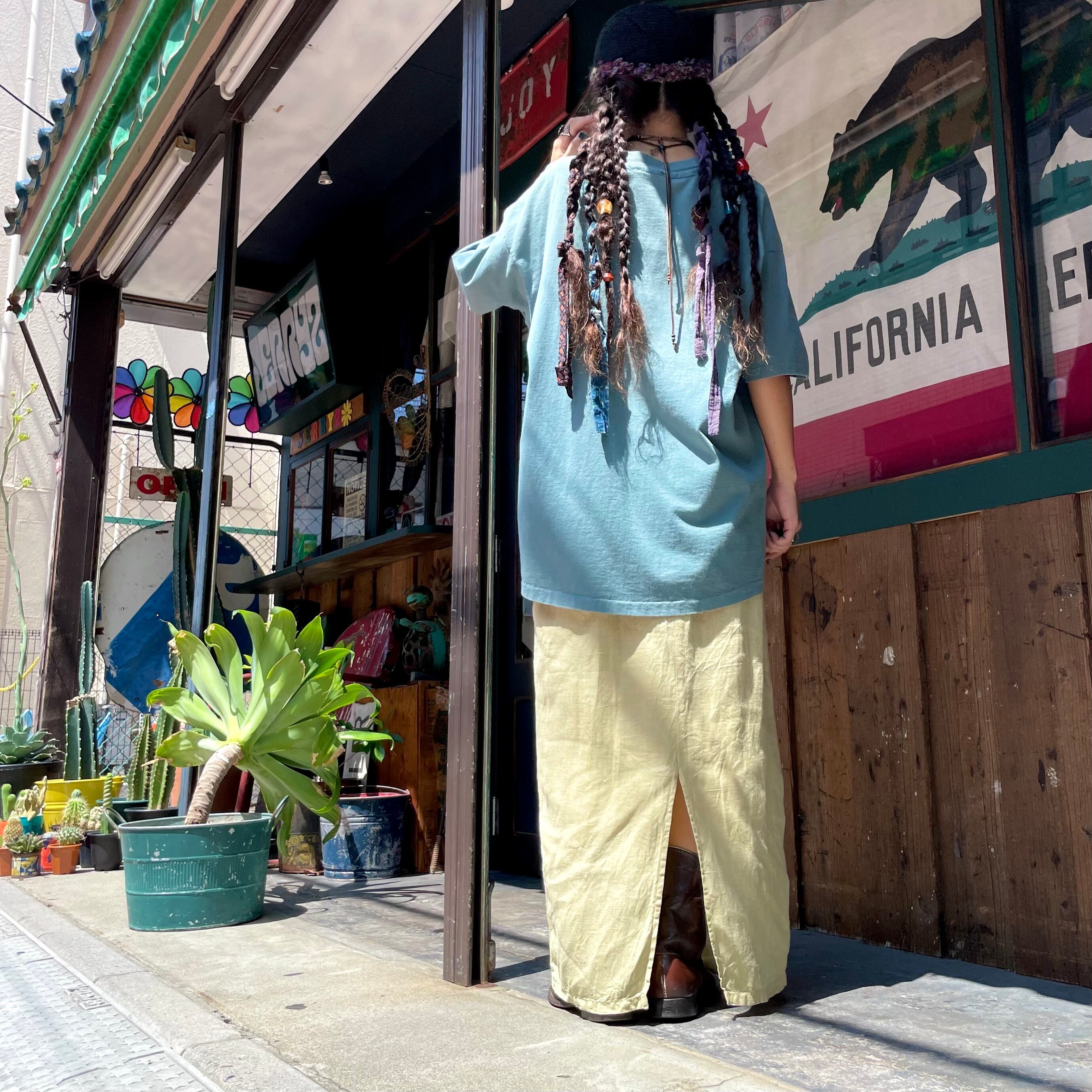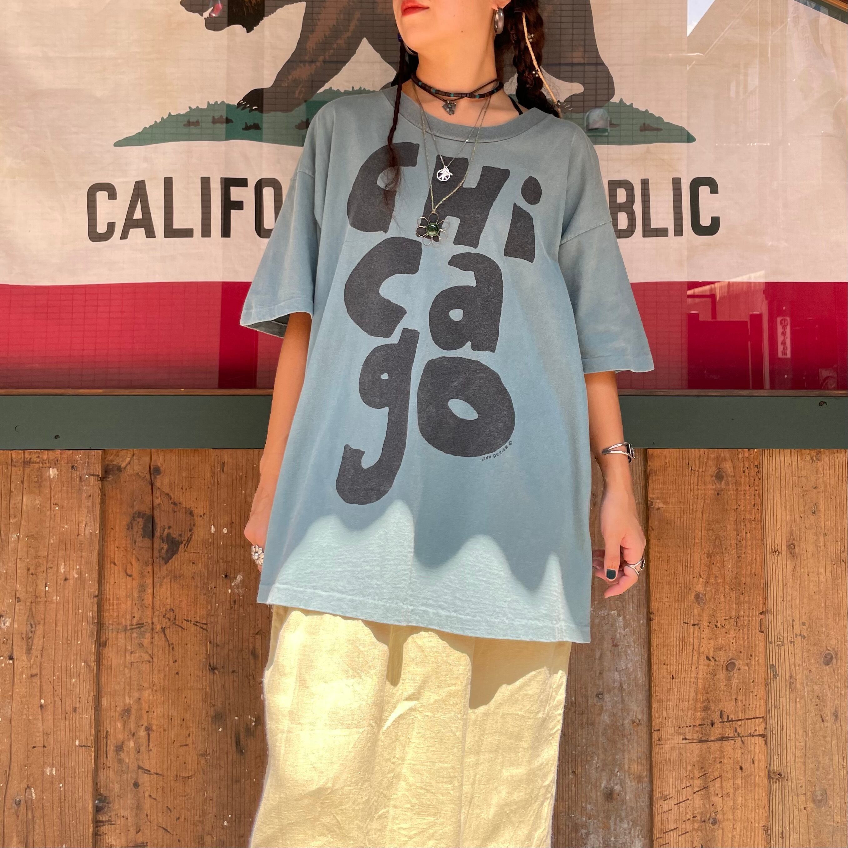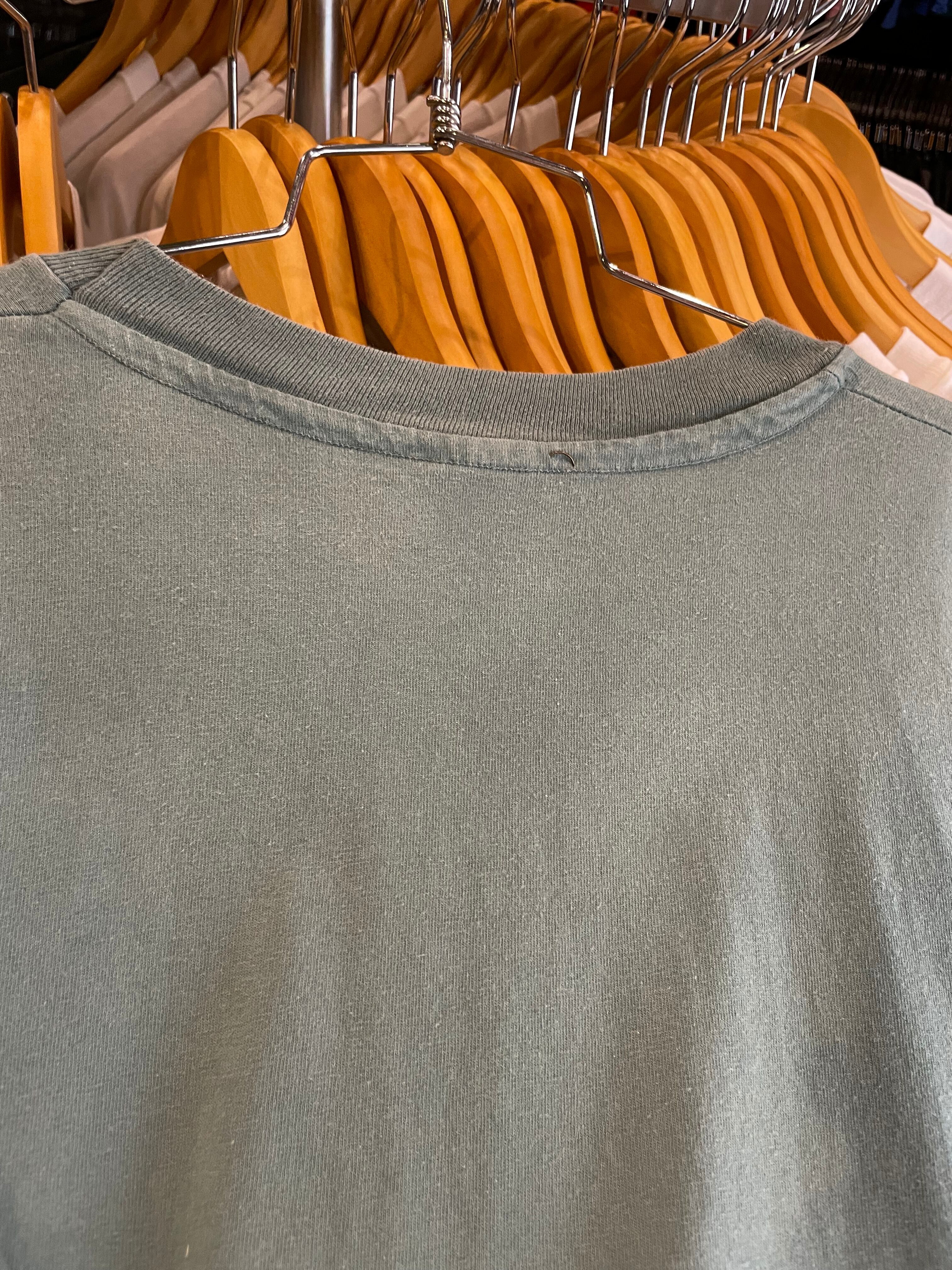 くすんだ青緑っぽい絶妙な色味がとても良い感じの90年代USA製のプリントTシャツです。