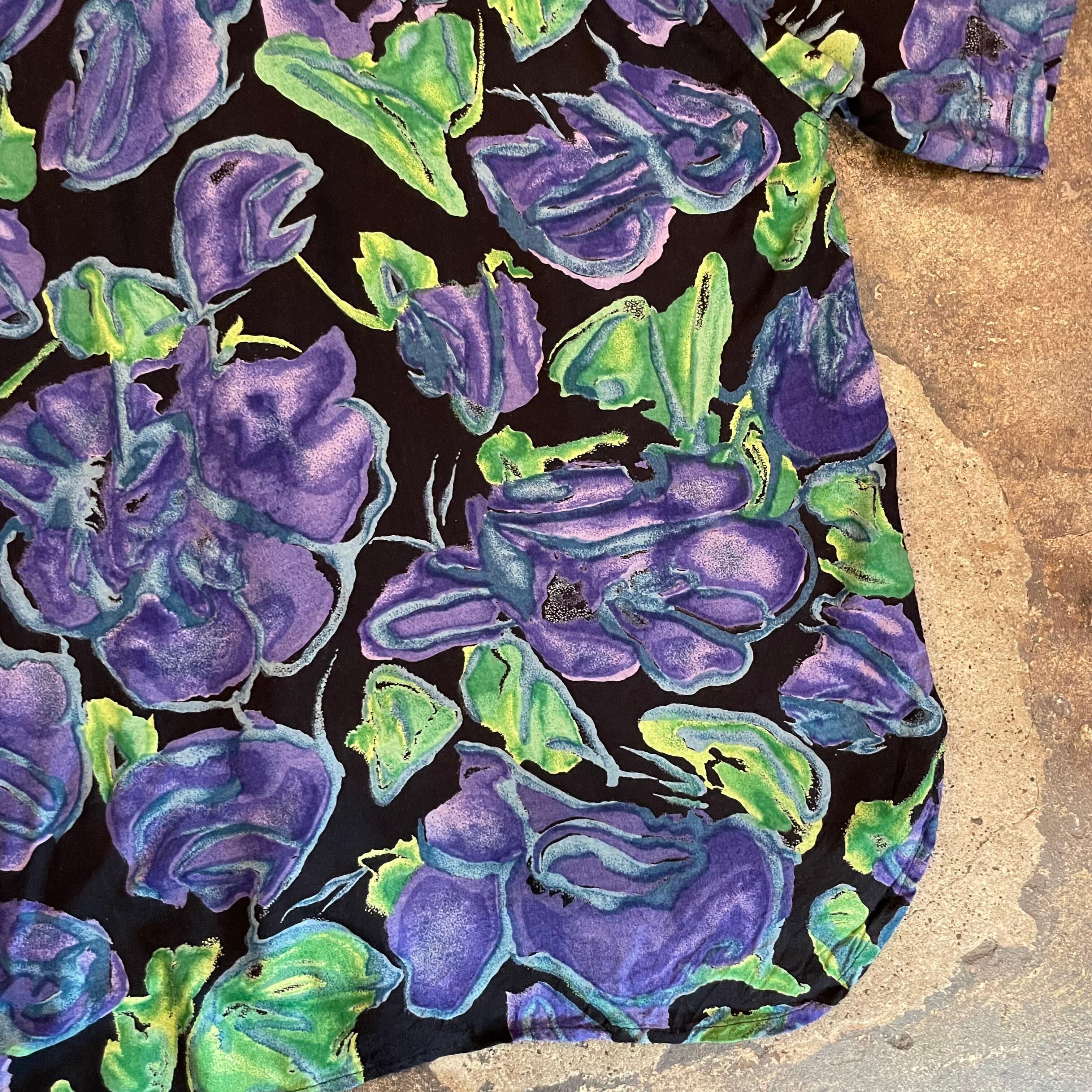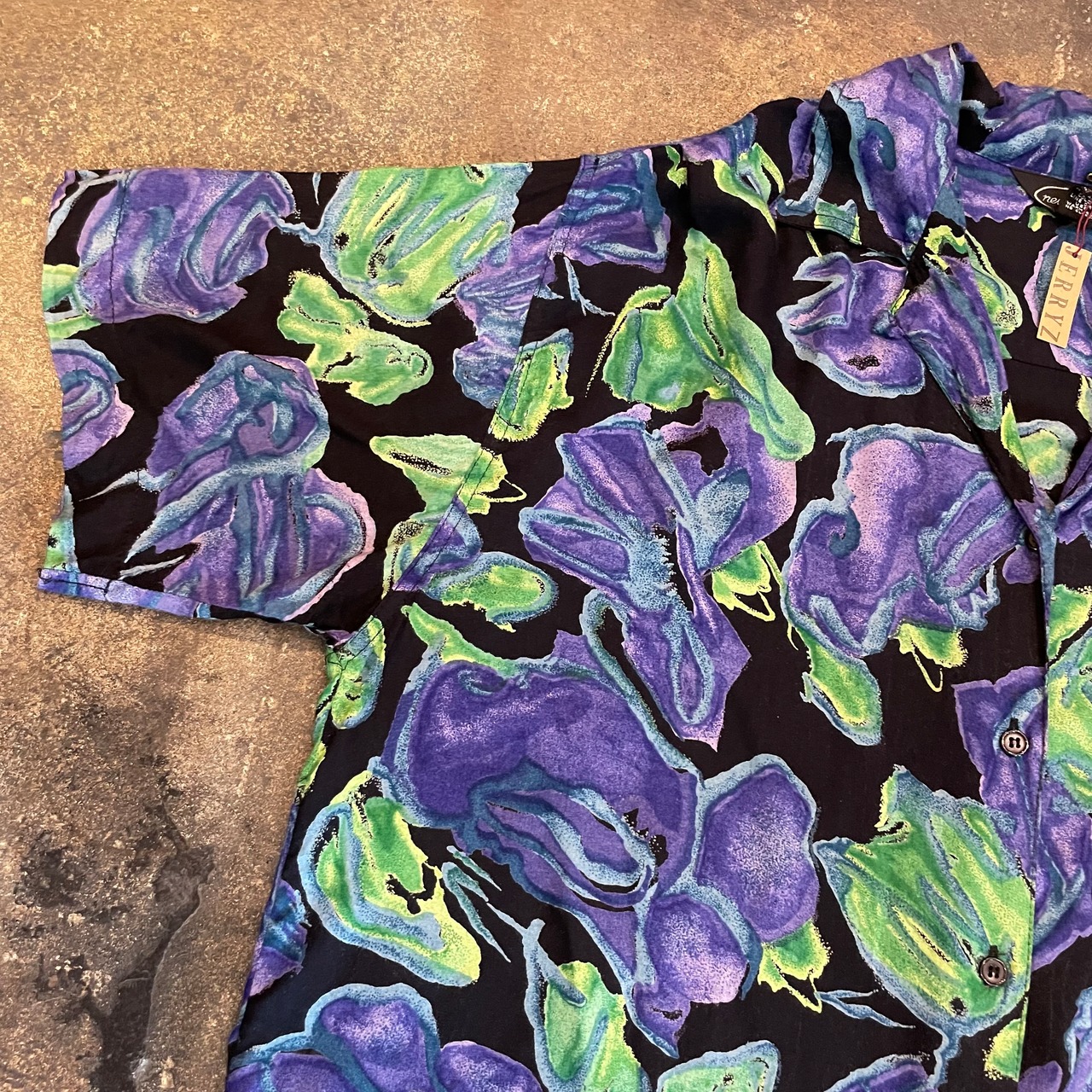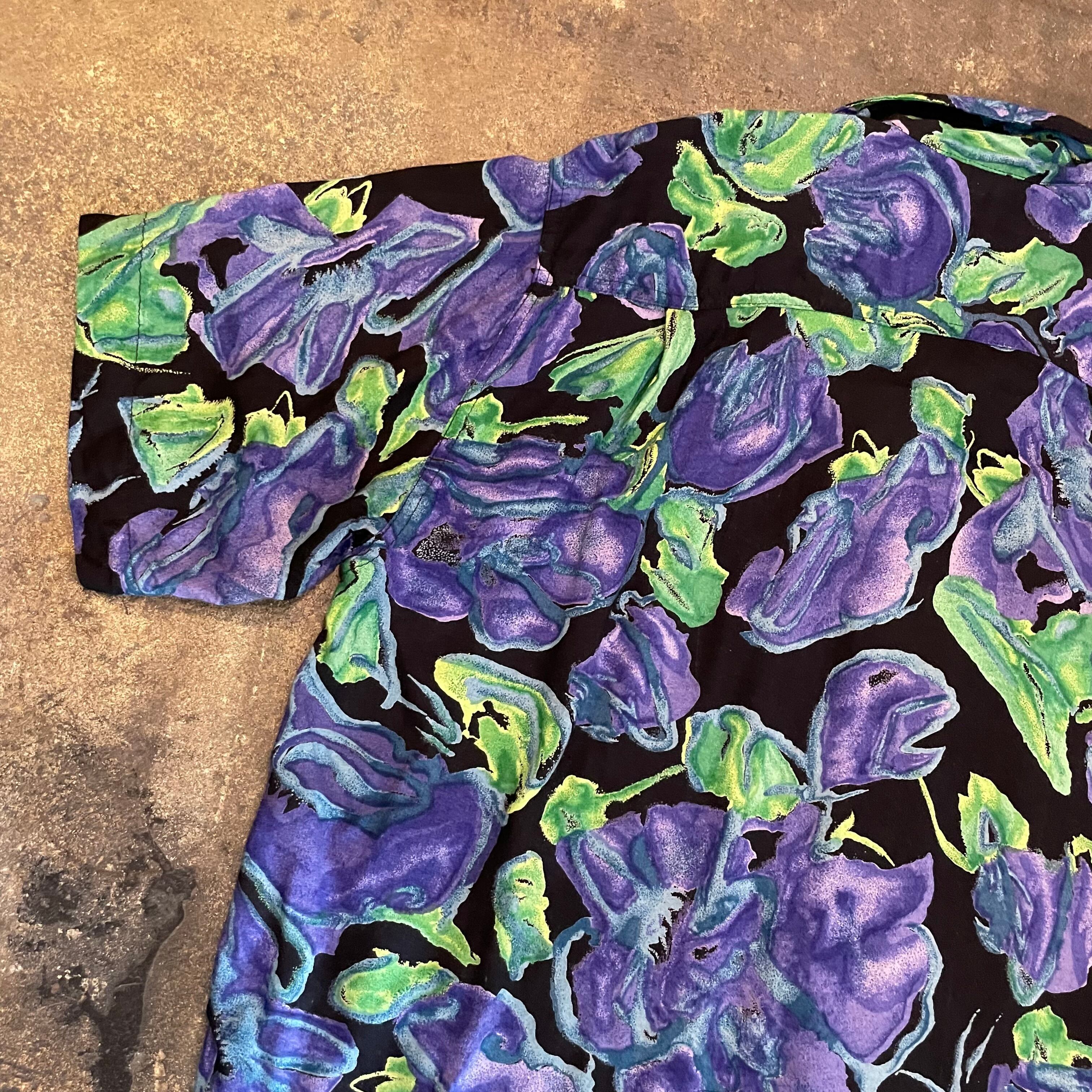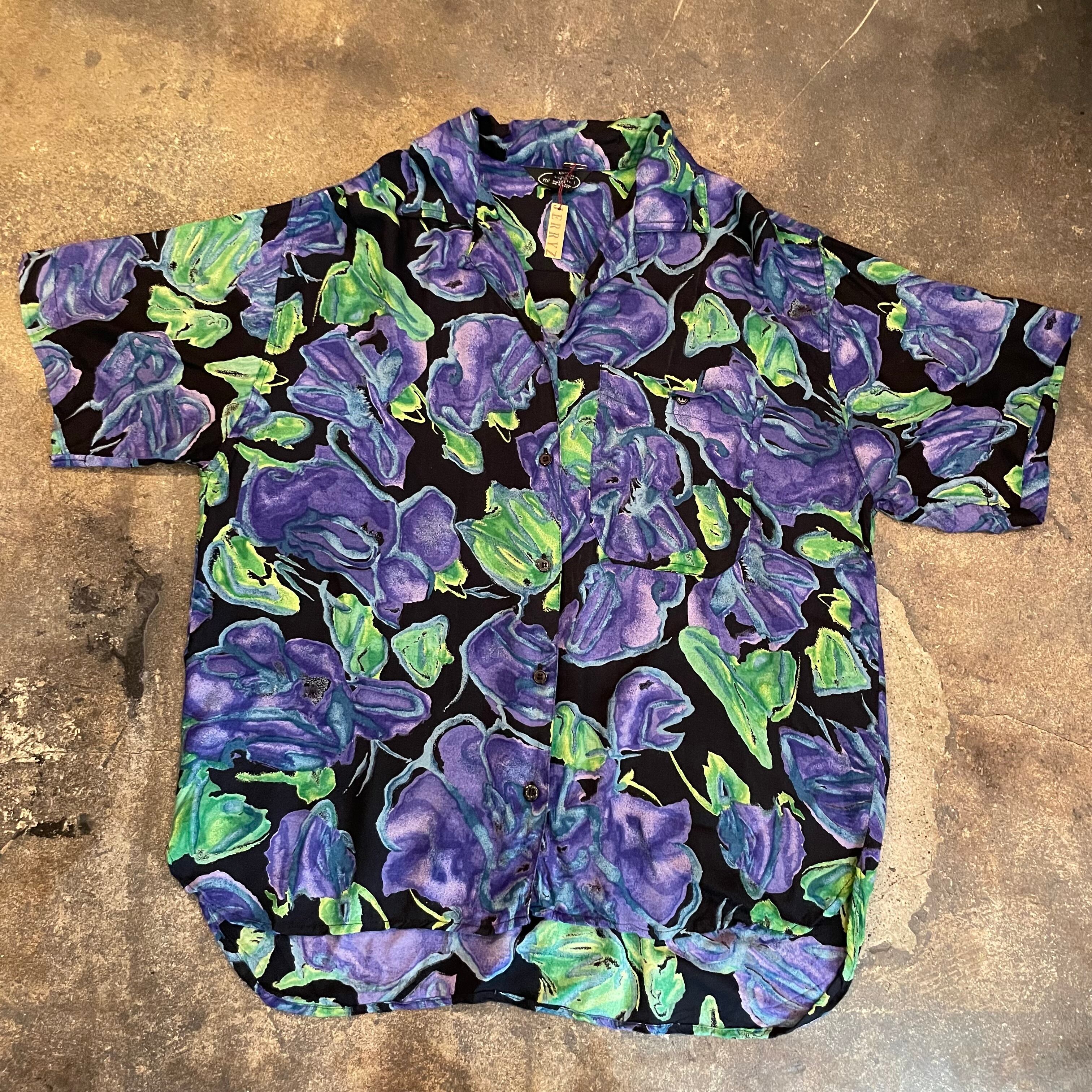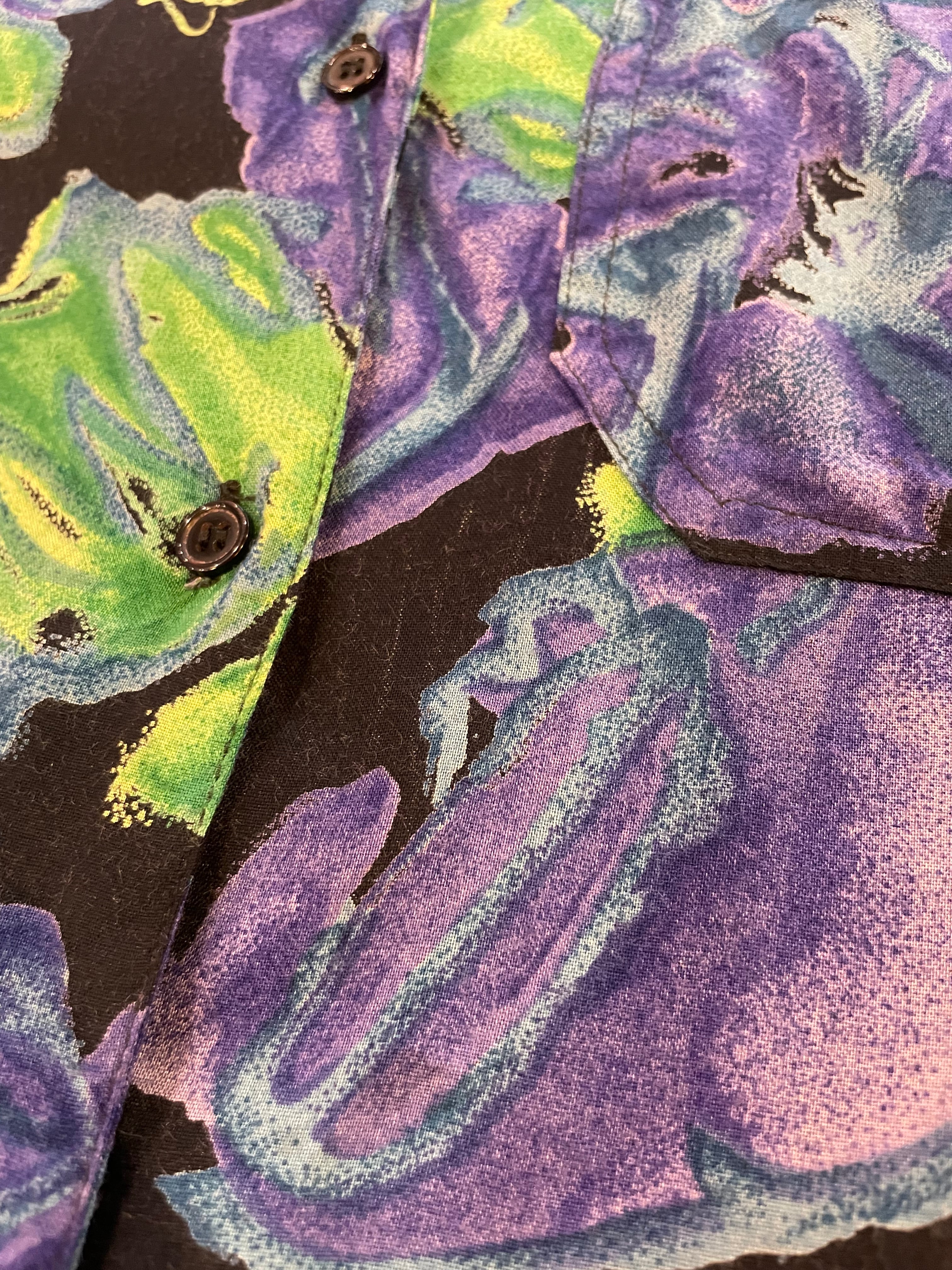 黒ベースに紫のお花?がかわいい開襟の半袖シャツです。