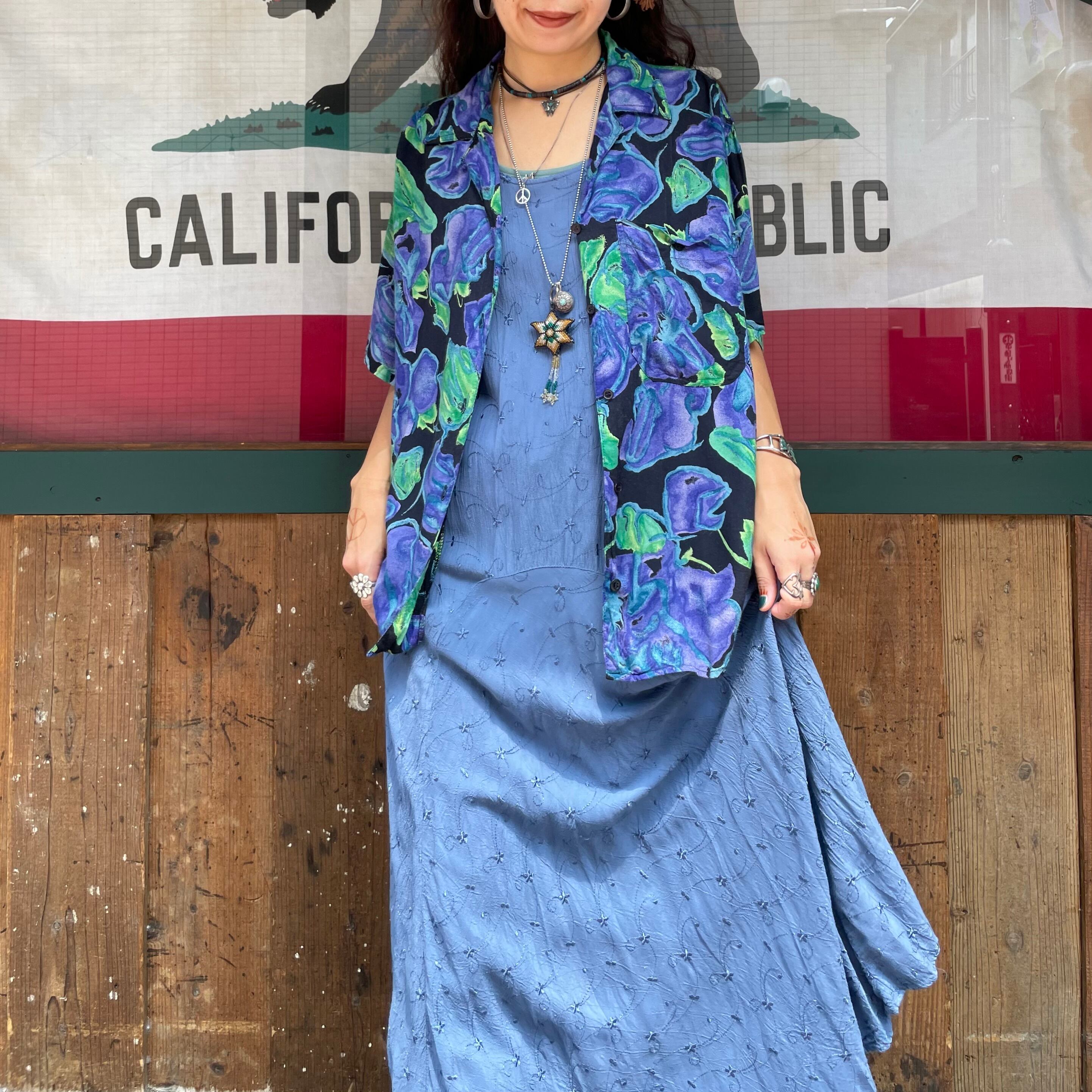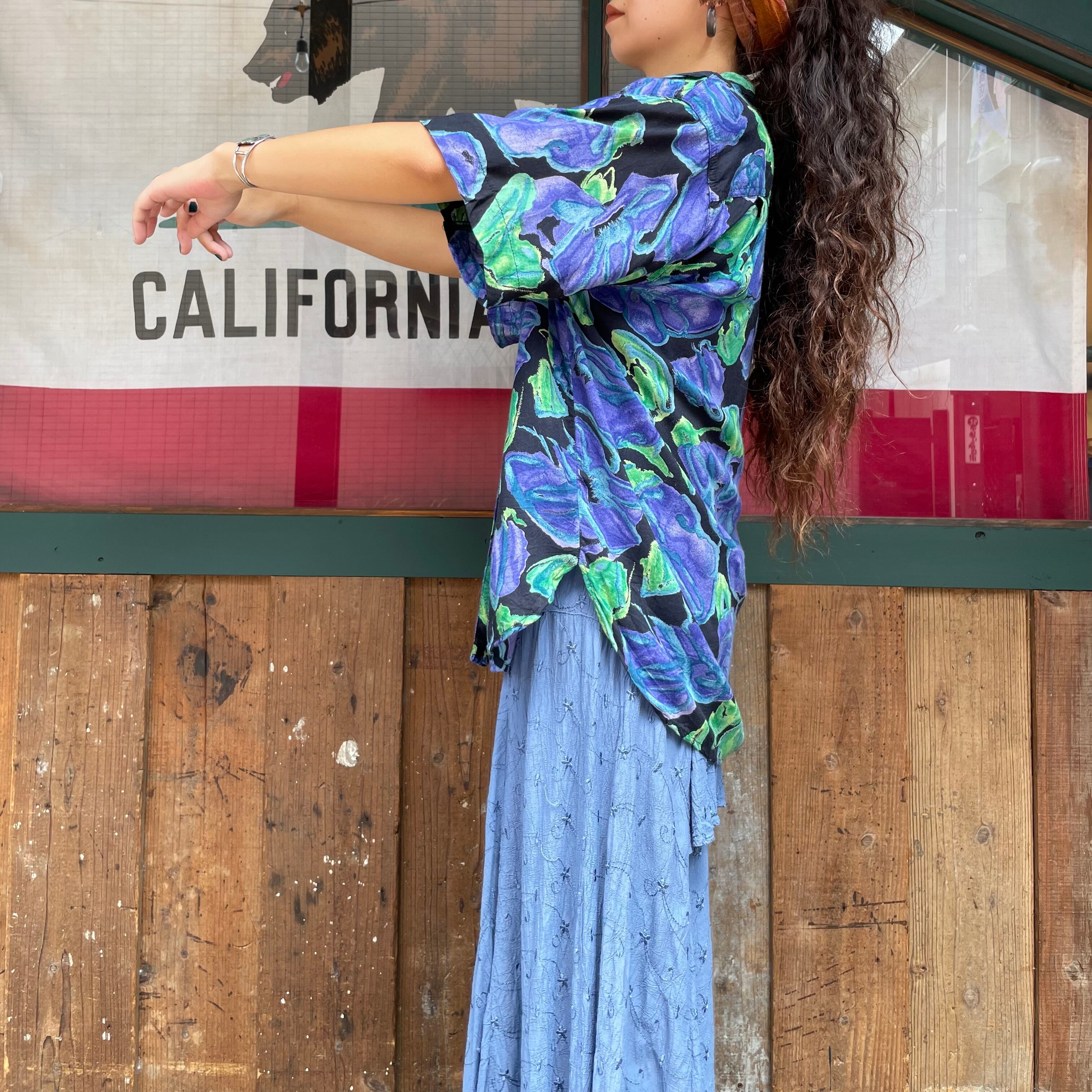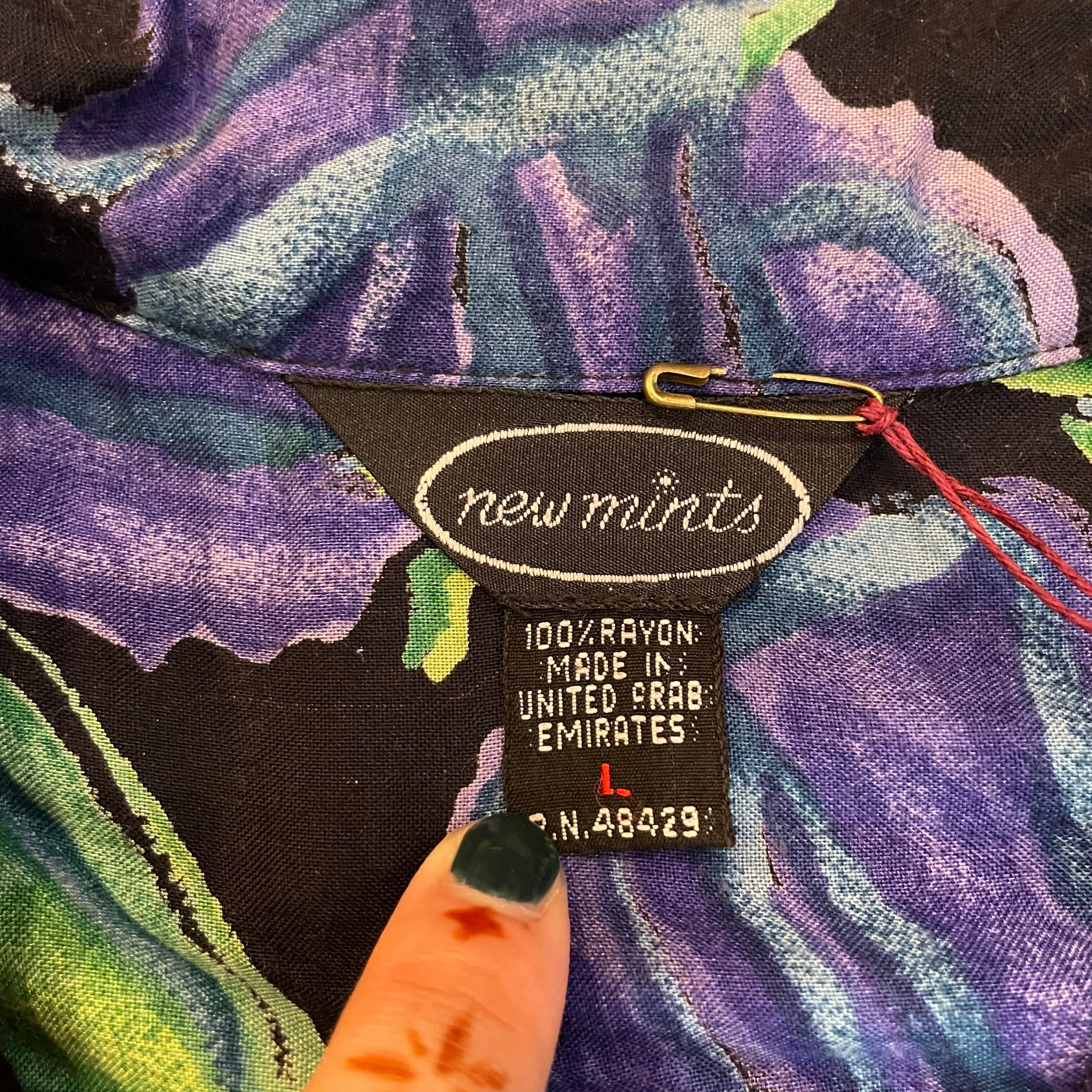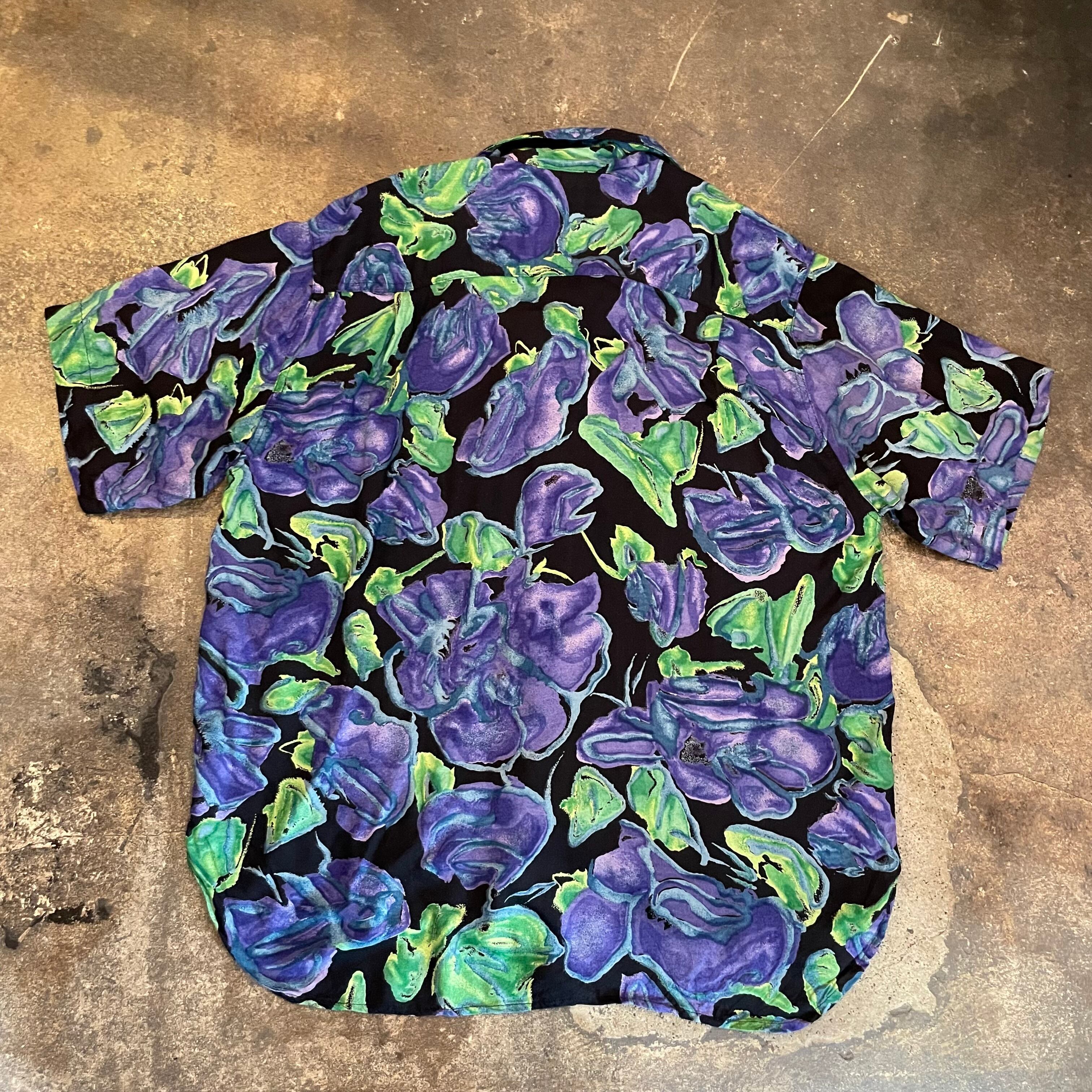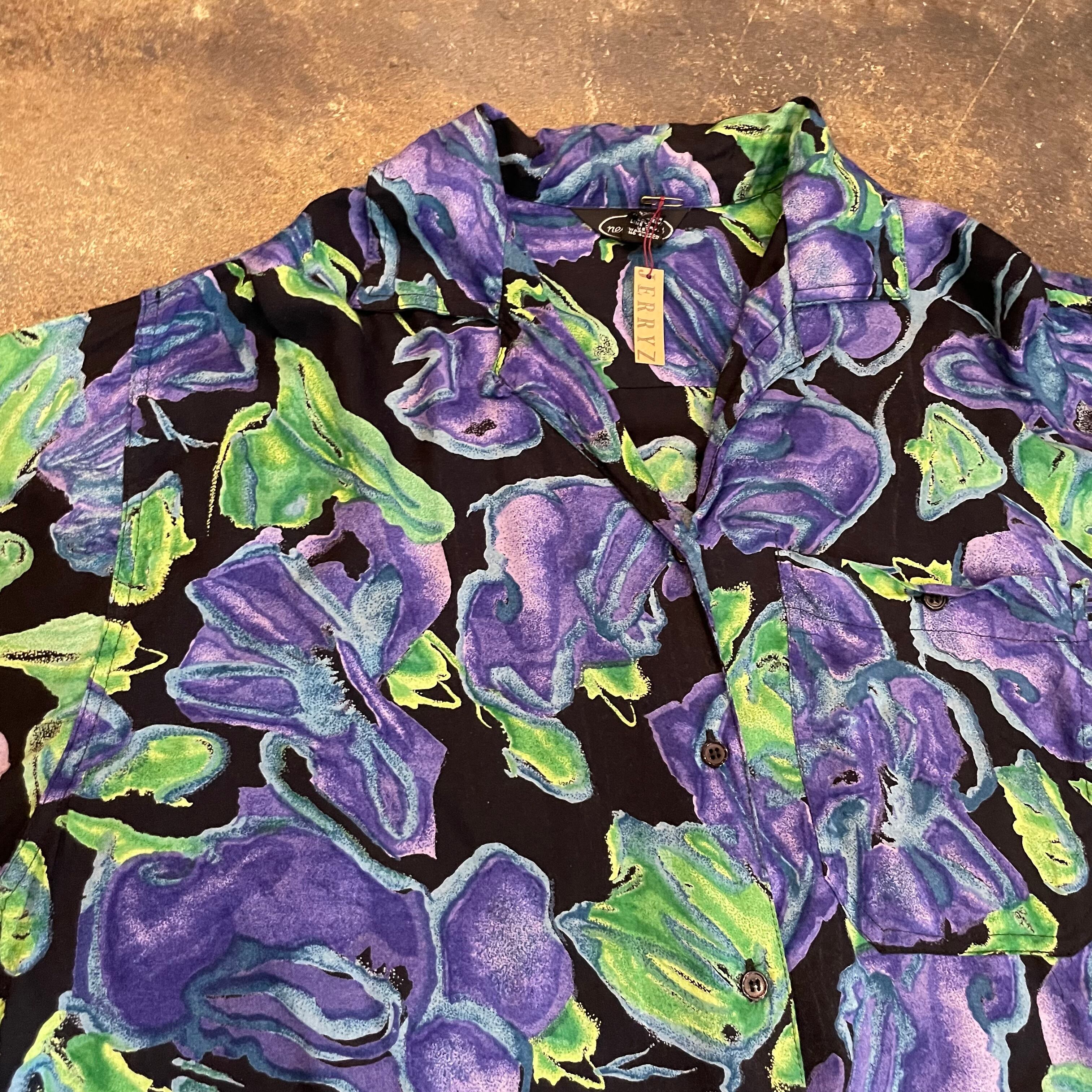 黒ベースに紫のお花?がかわいい開襟の半袖シャツです。