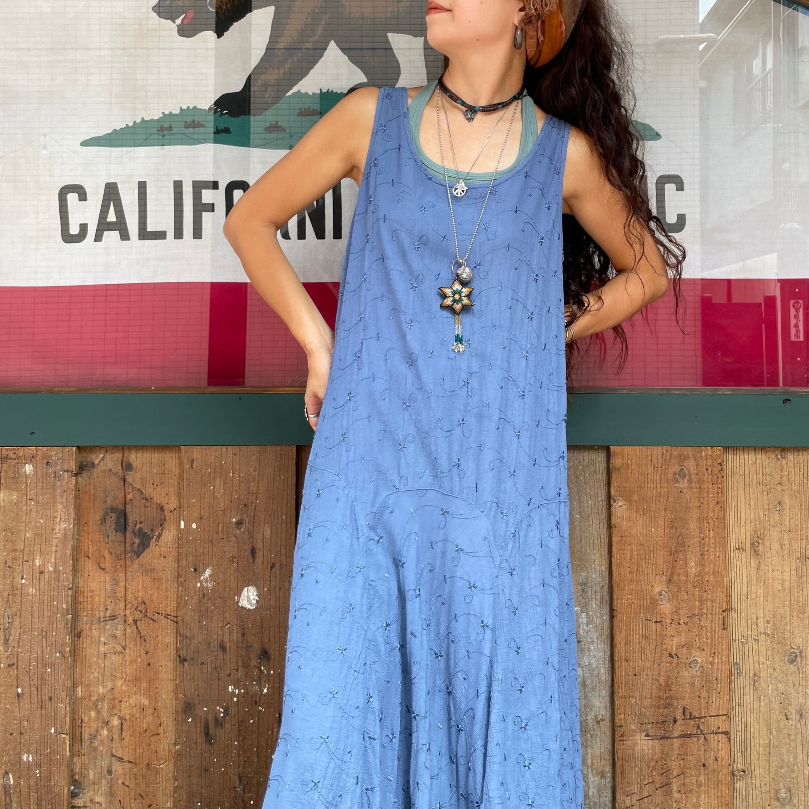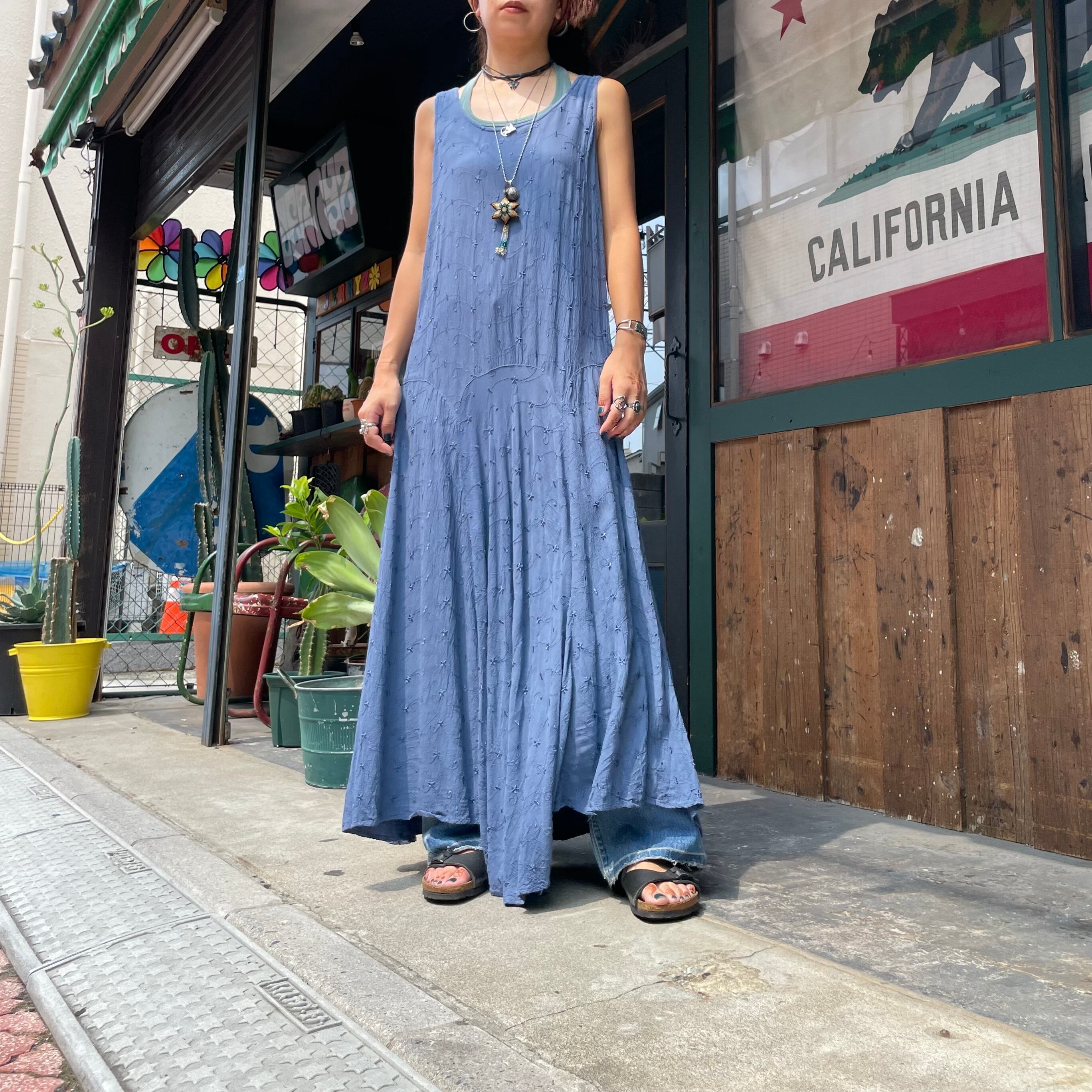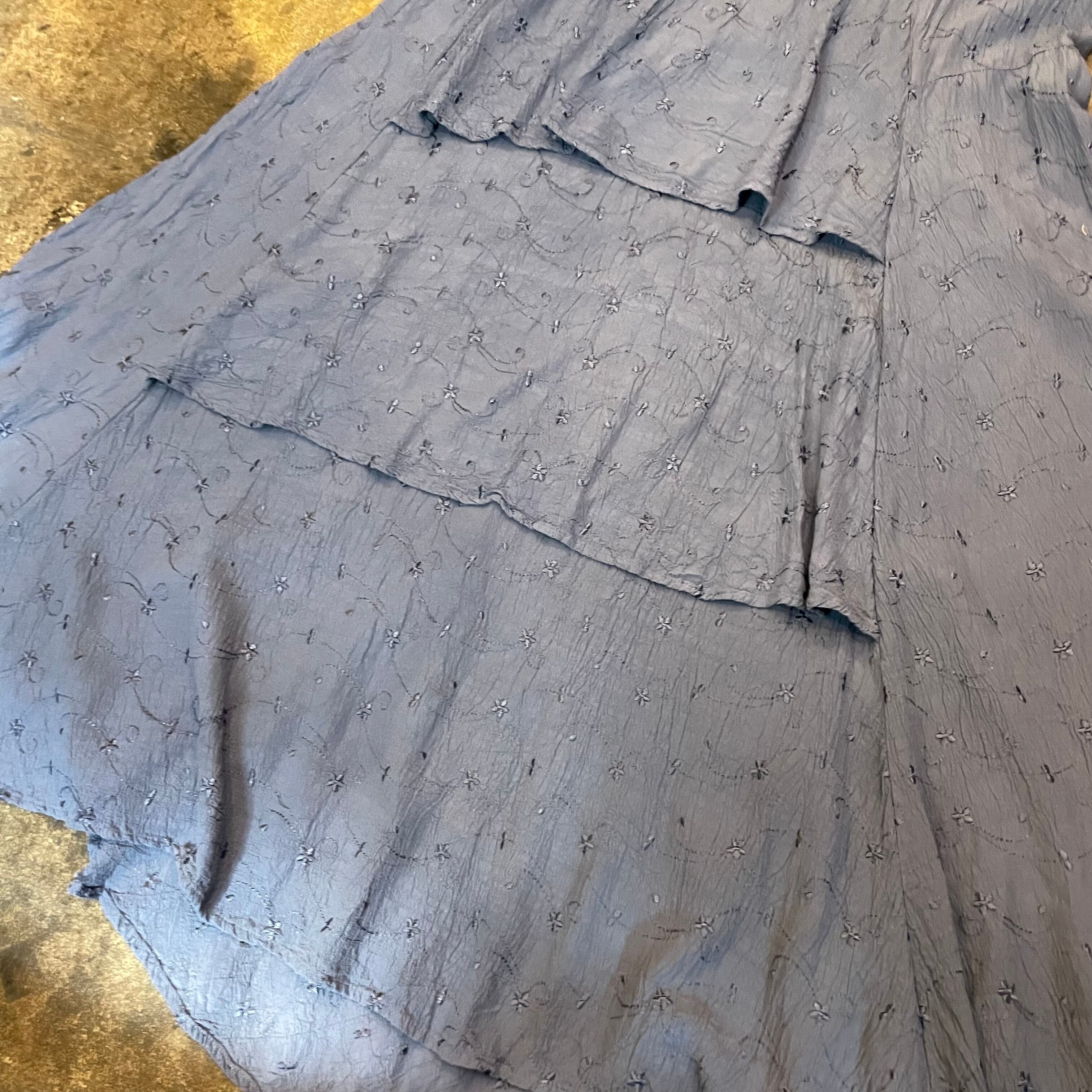 くすんだブルーが落ち着いていてかわいいワンピースです。全体的に刺繍が施されていてキラッとポイントになっていますね。