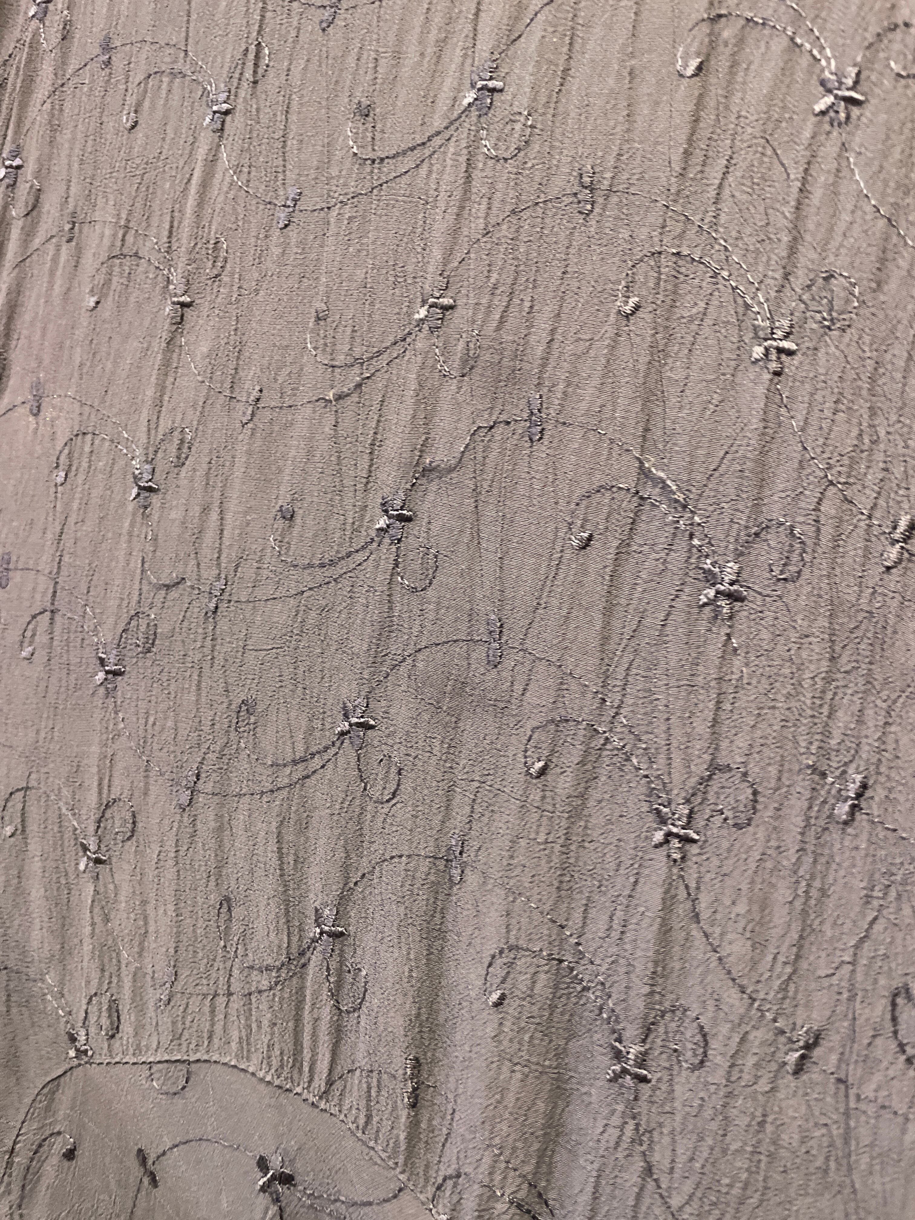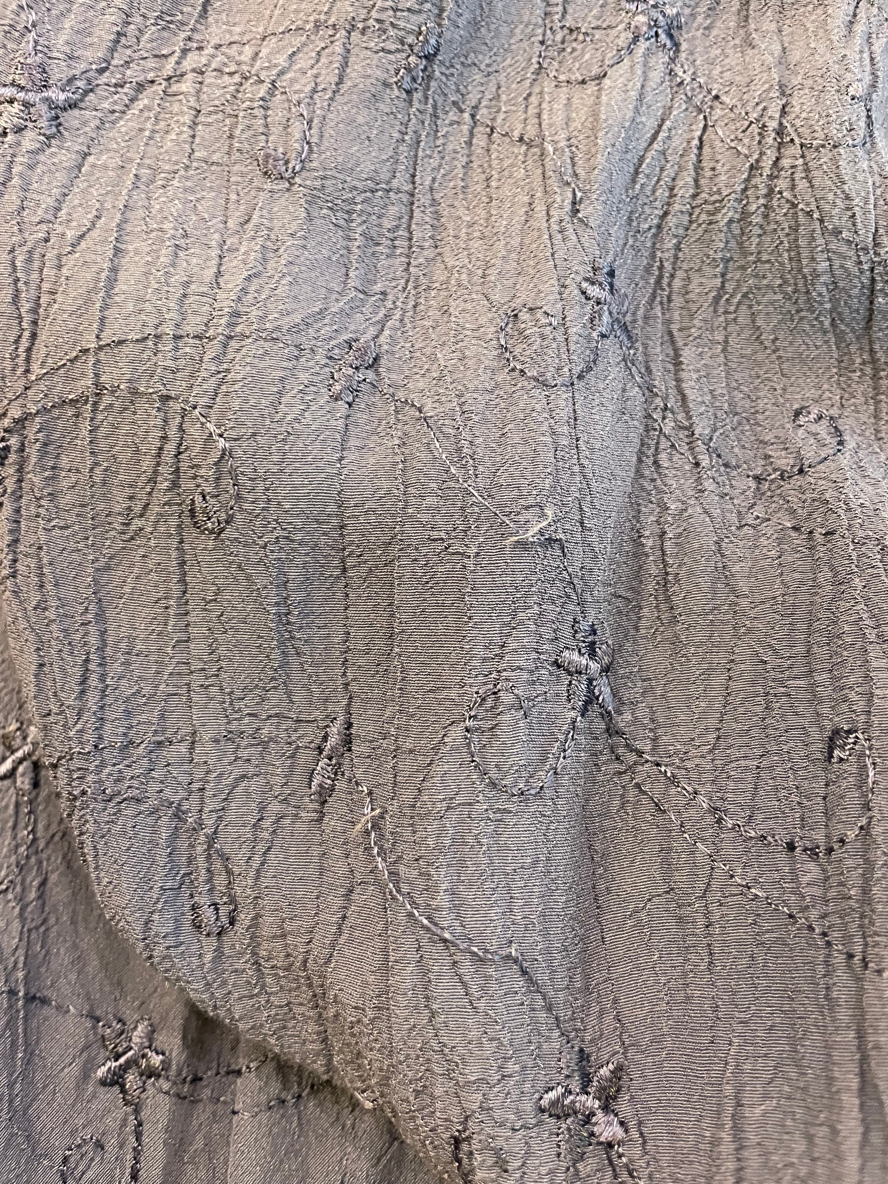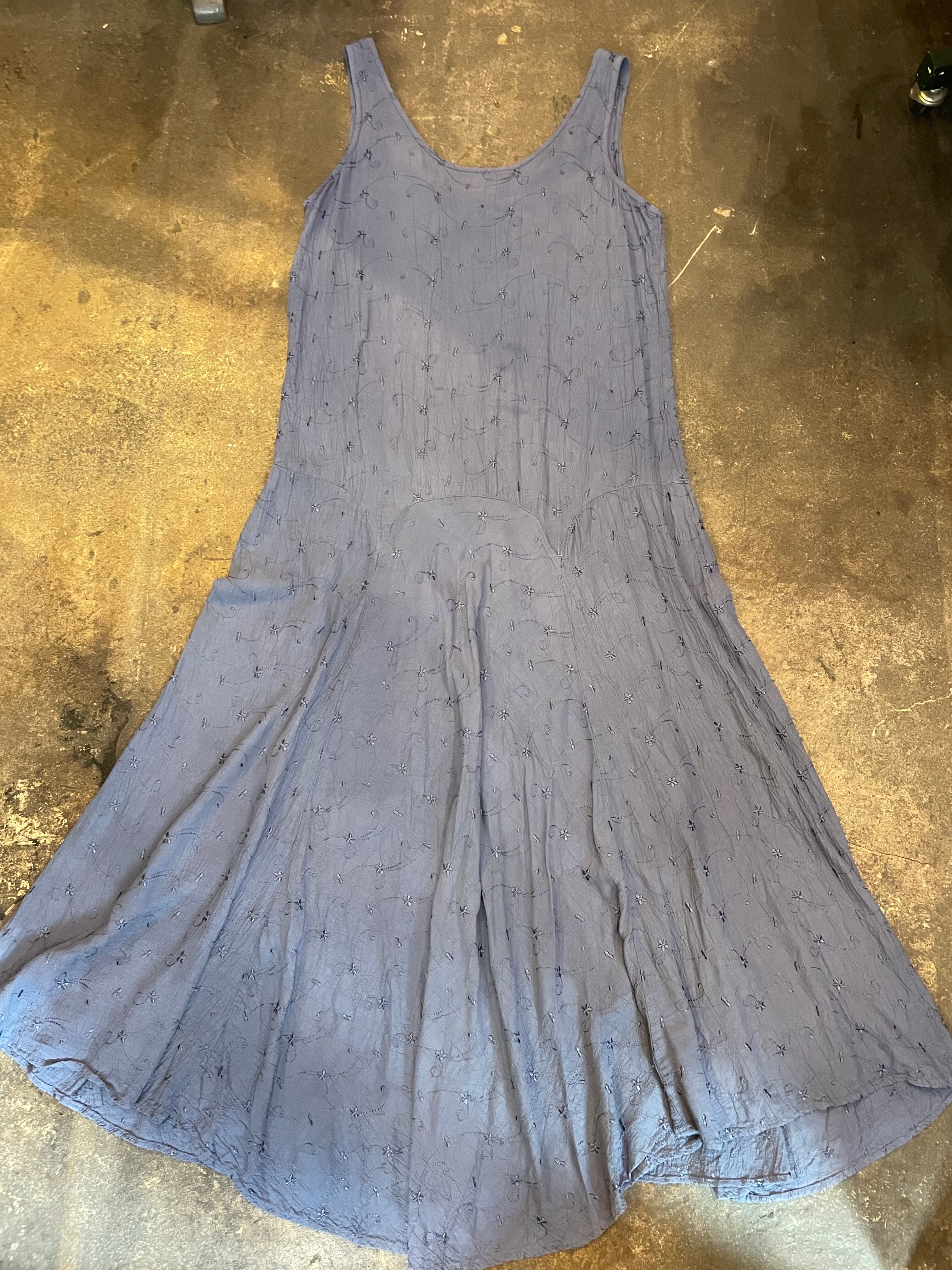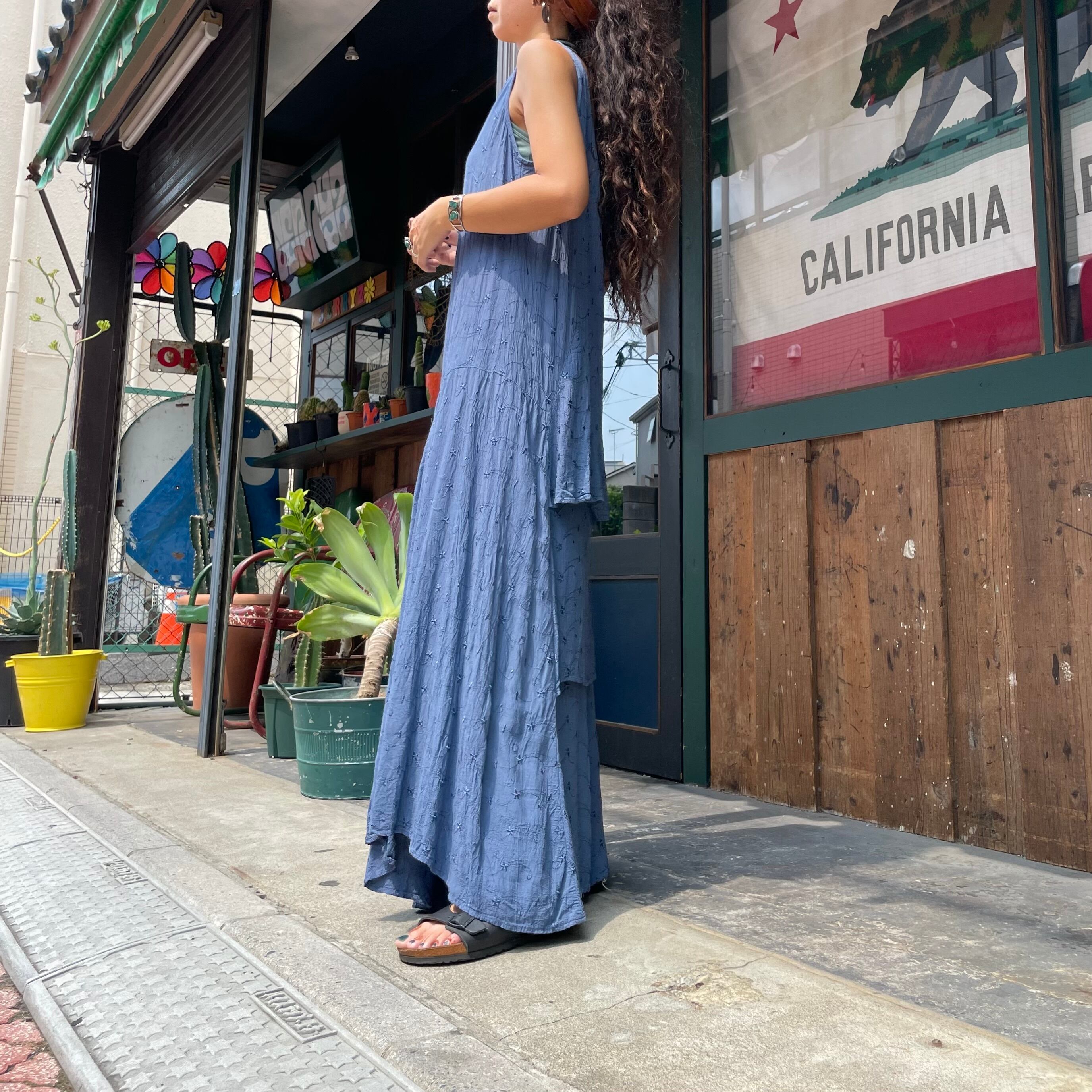 くすんだブルーが落ち着いていてかわいいワンピースです。全体的に刺繍が施されていてキラッとポイントになっていますね。