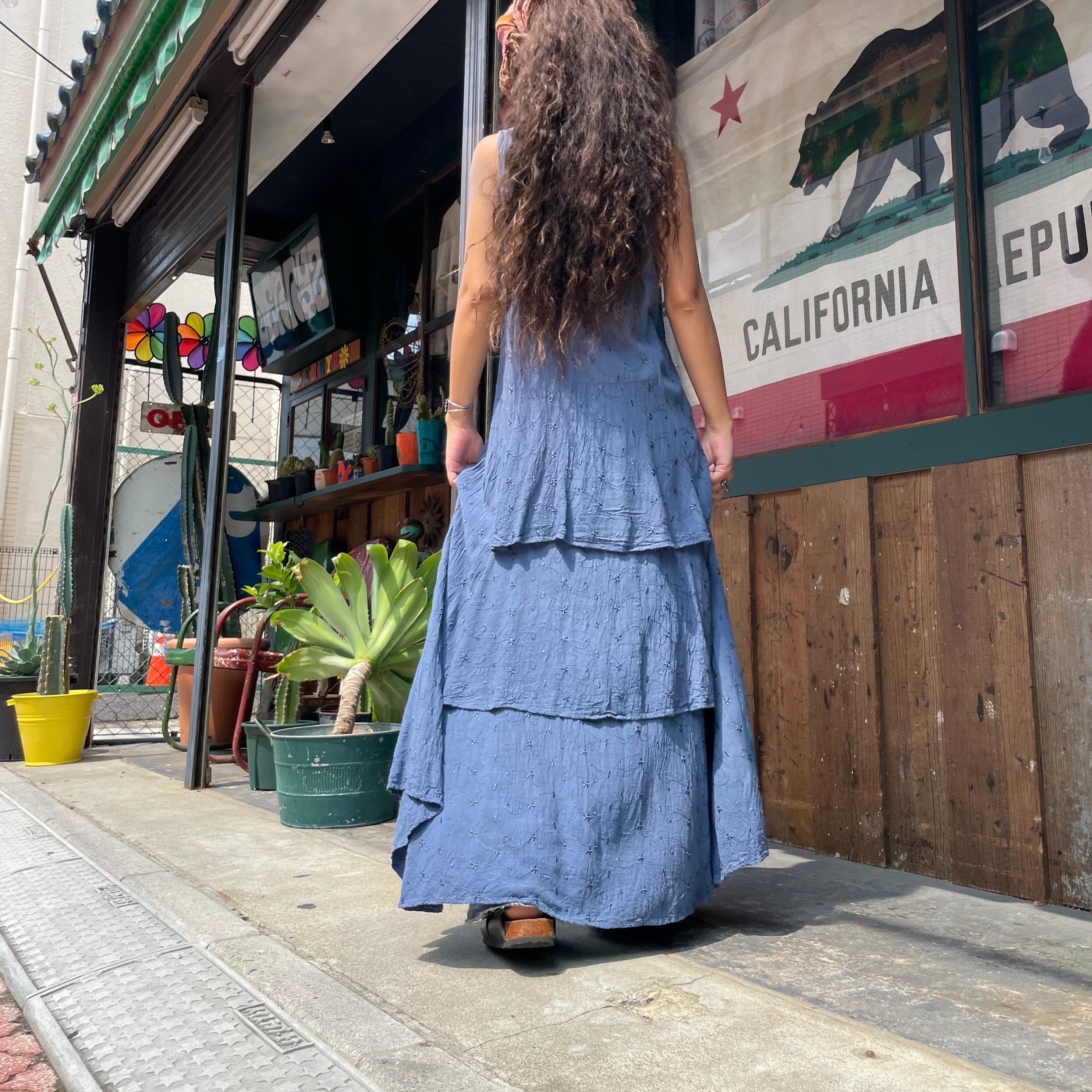 前は切り替えの真ん中の部分が長くなっていて、後ろは3段のティアードになっていてそれぞれシルエットの差があっておもしろい一枚です。