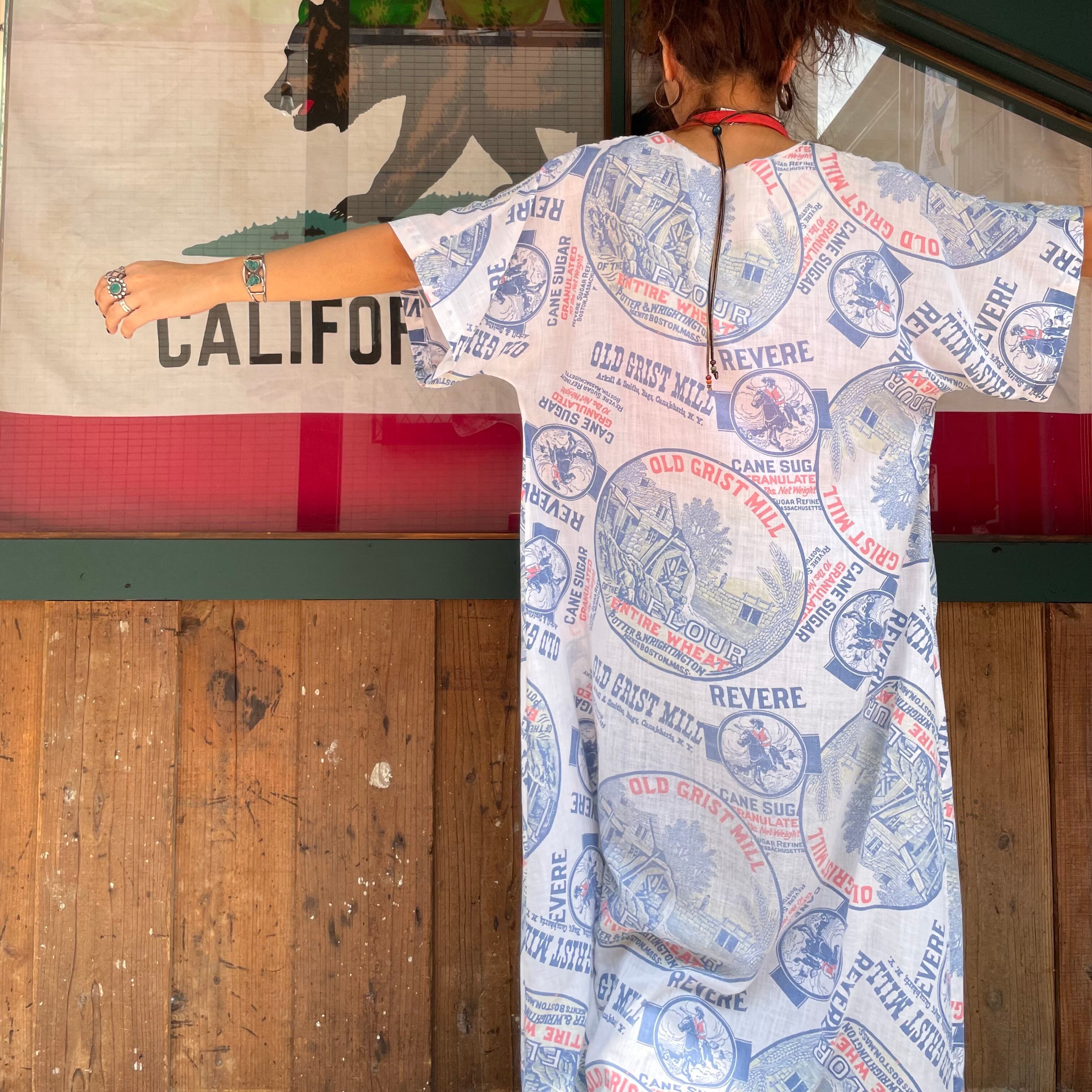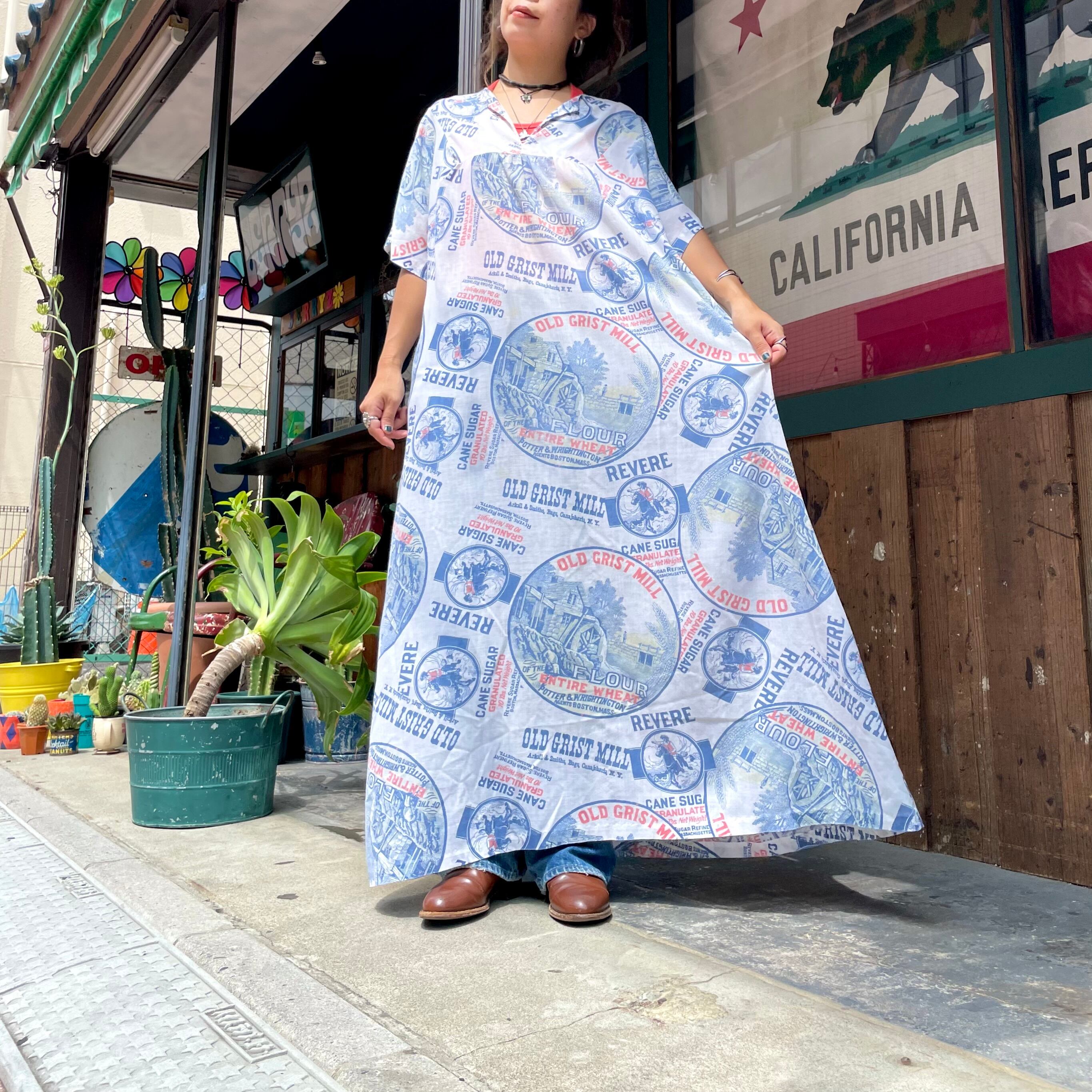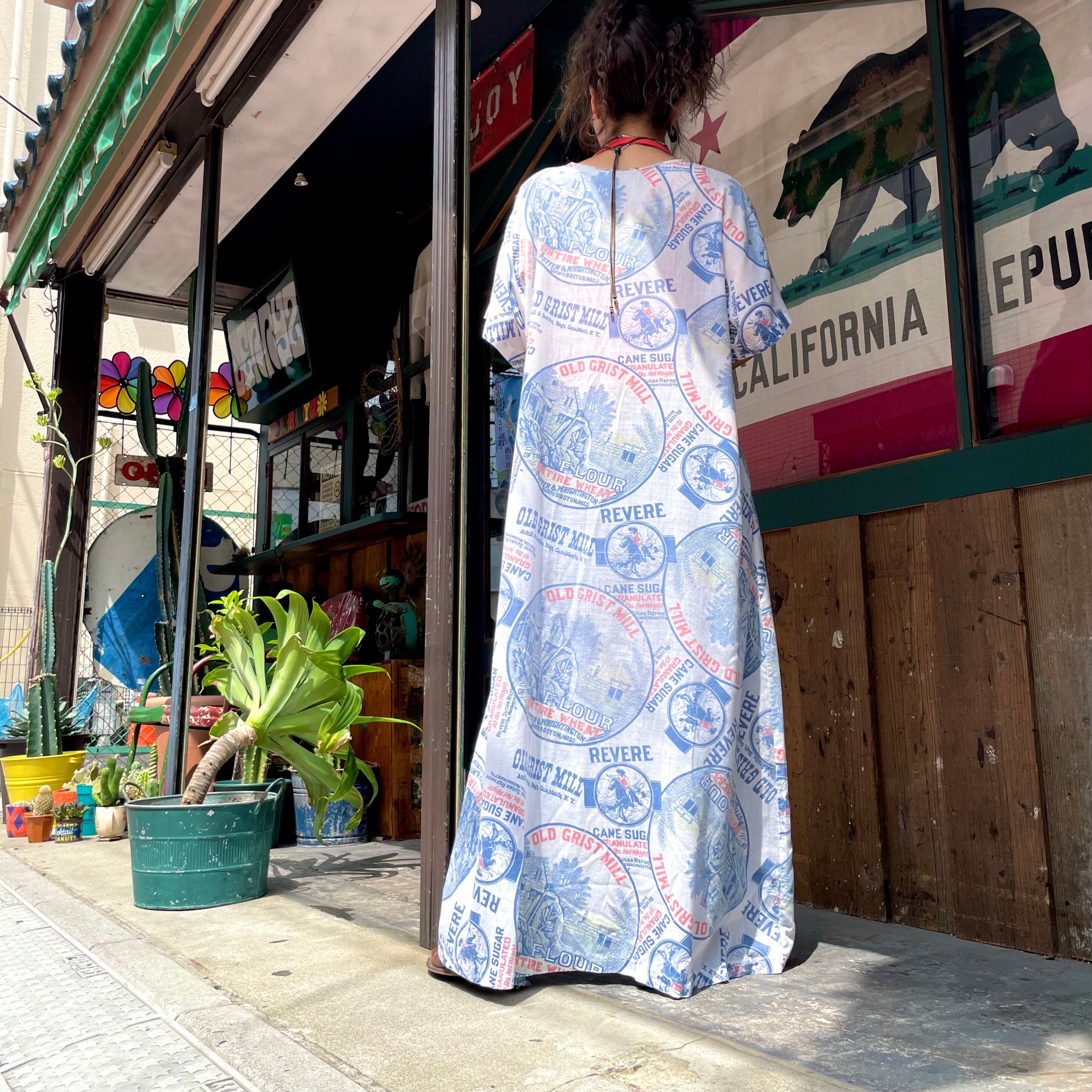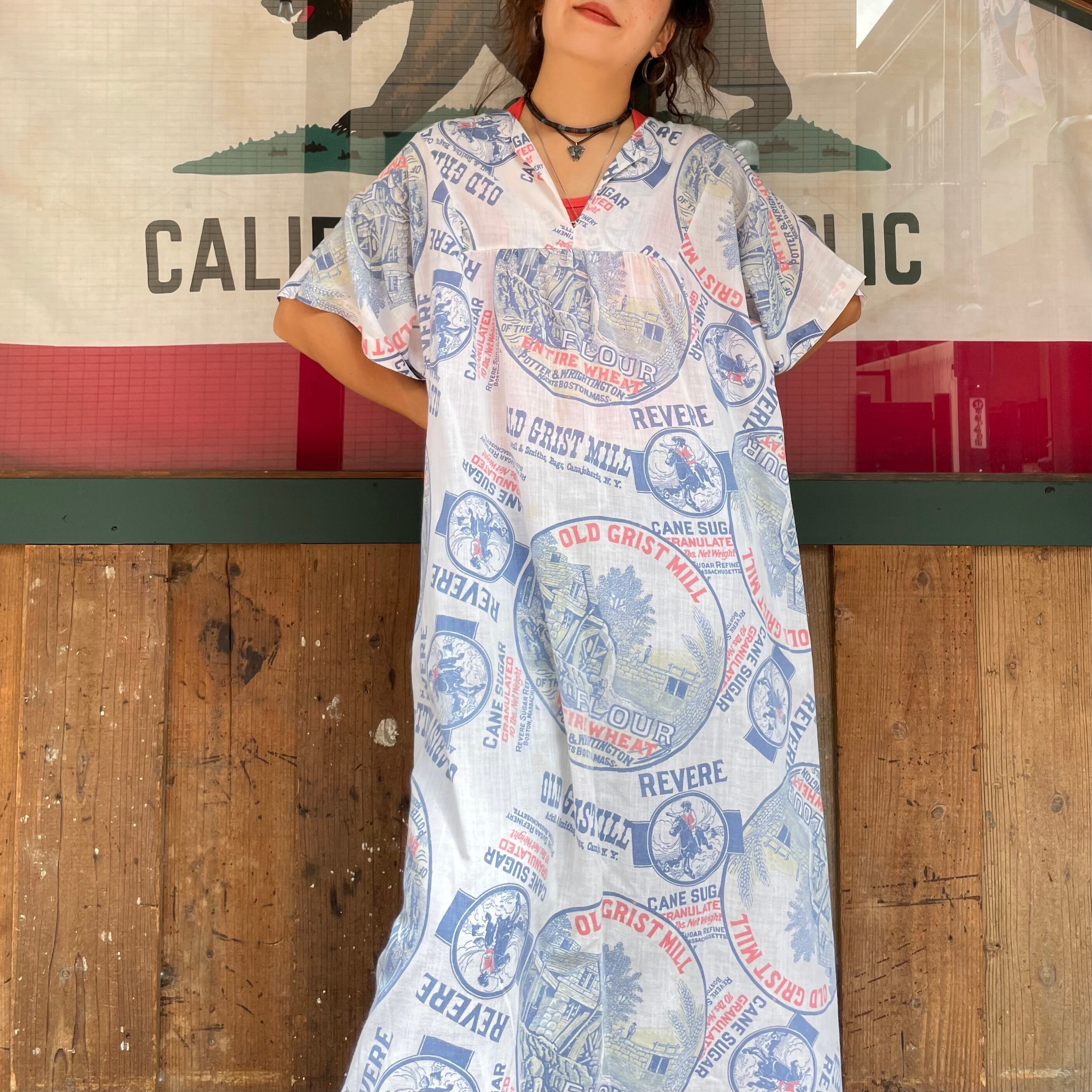 フィードサックの模様をプリントされた生地がかっこいい70年代頃のワンピースです。