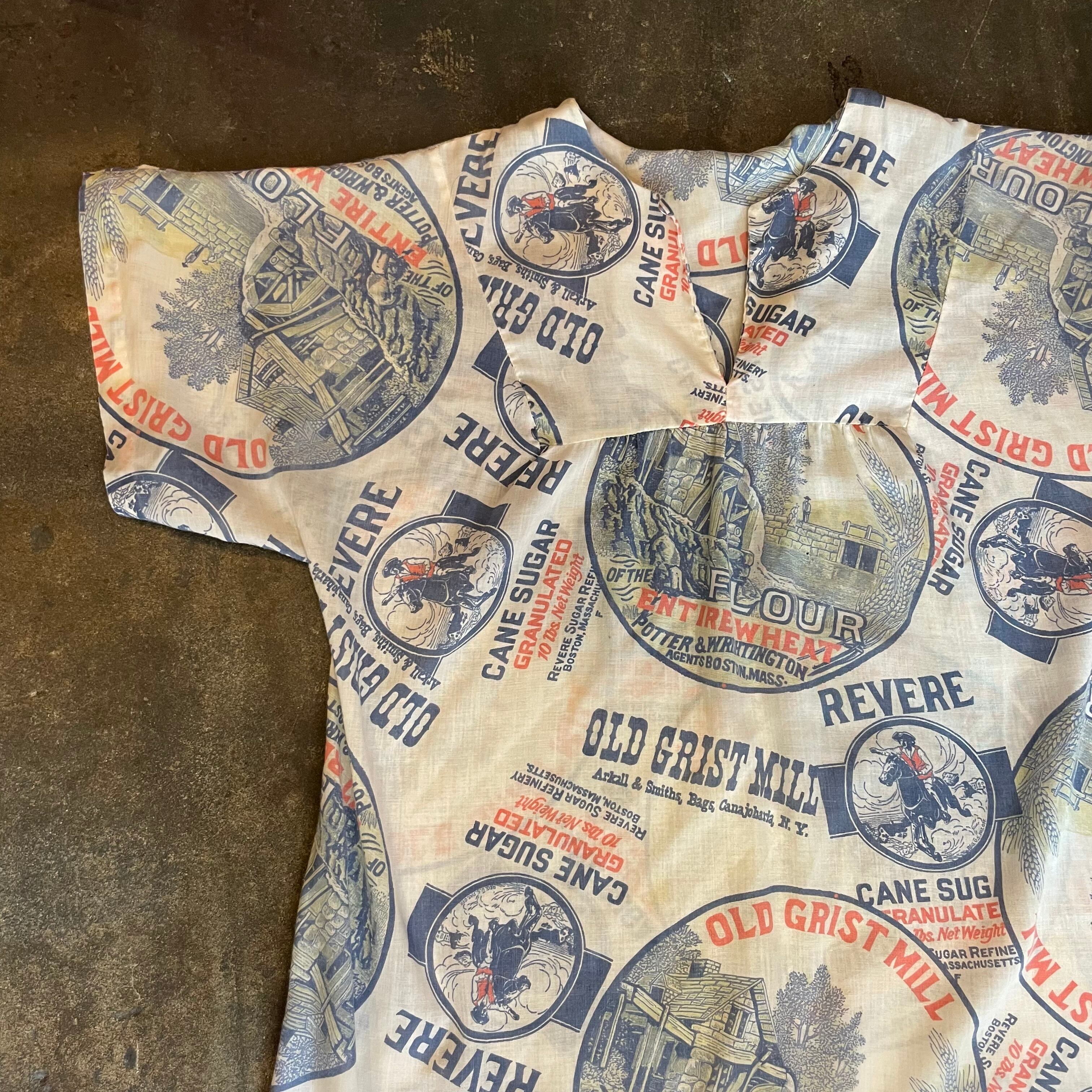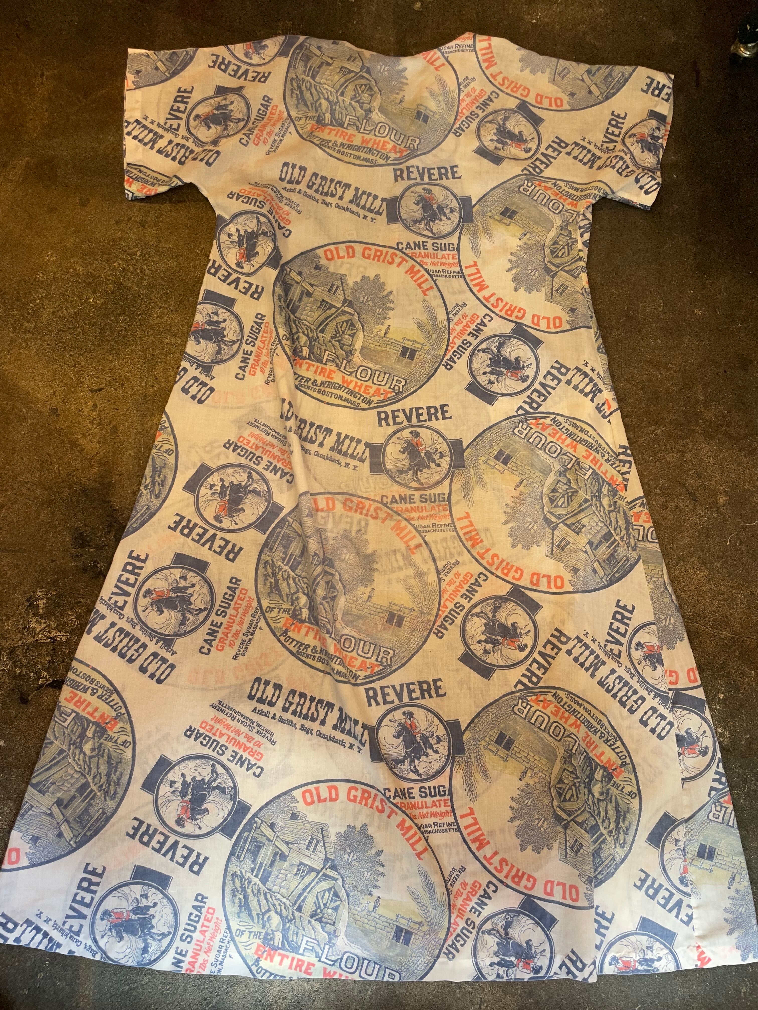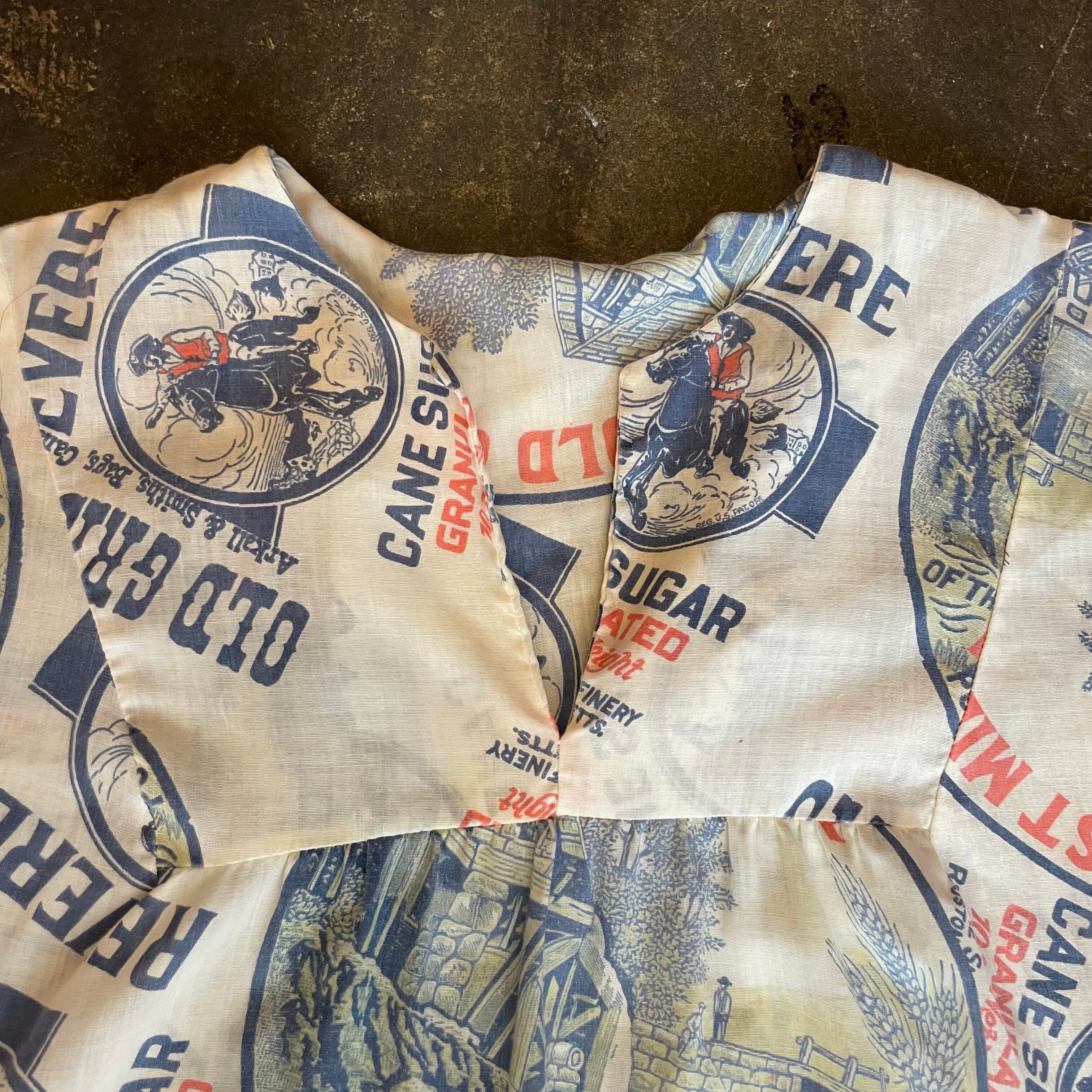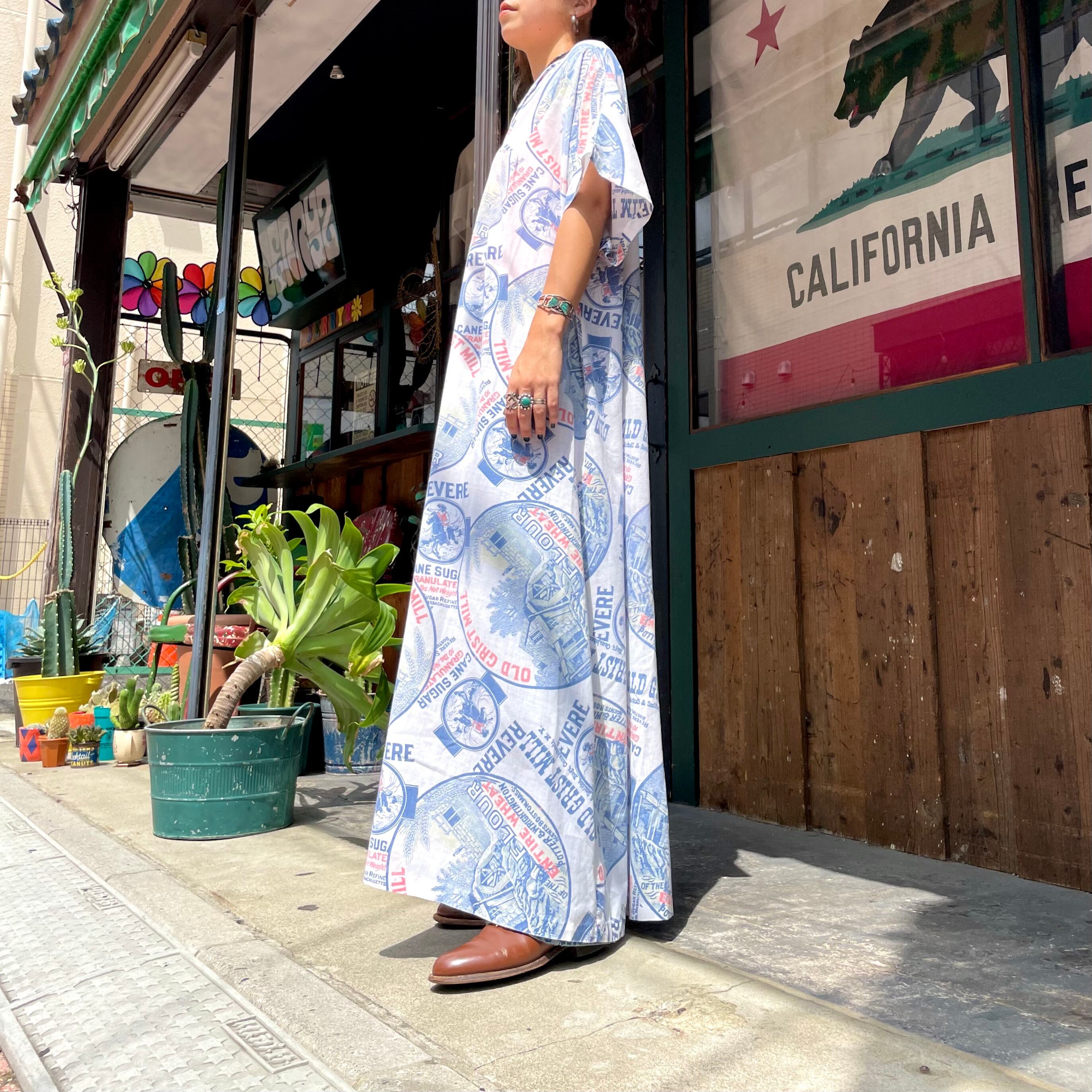 フィードサックの模様をプリントされた生地がかっこいい70年代頃のワンピースです。