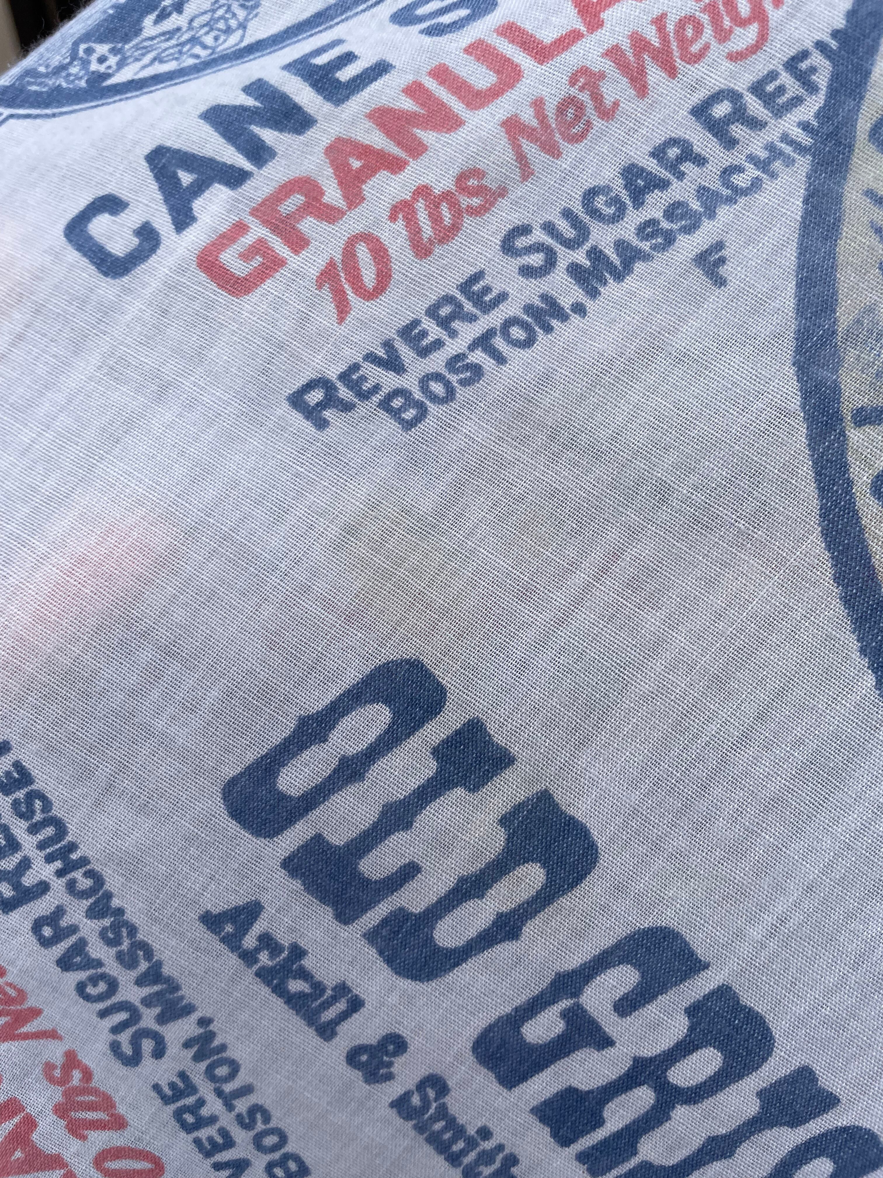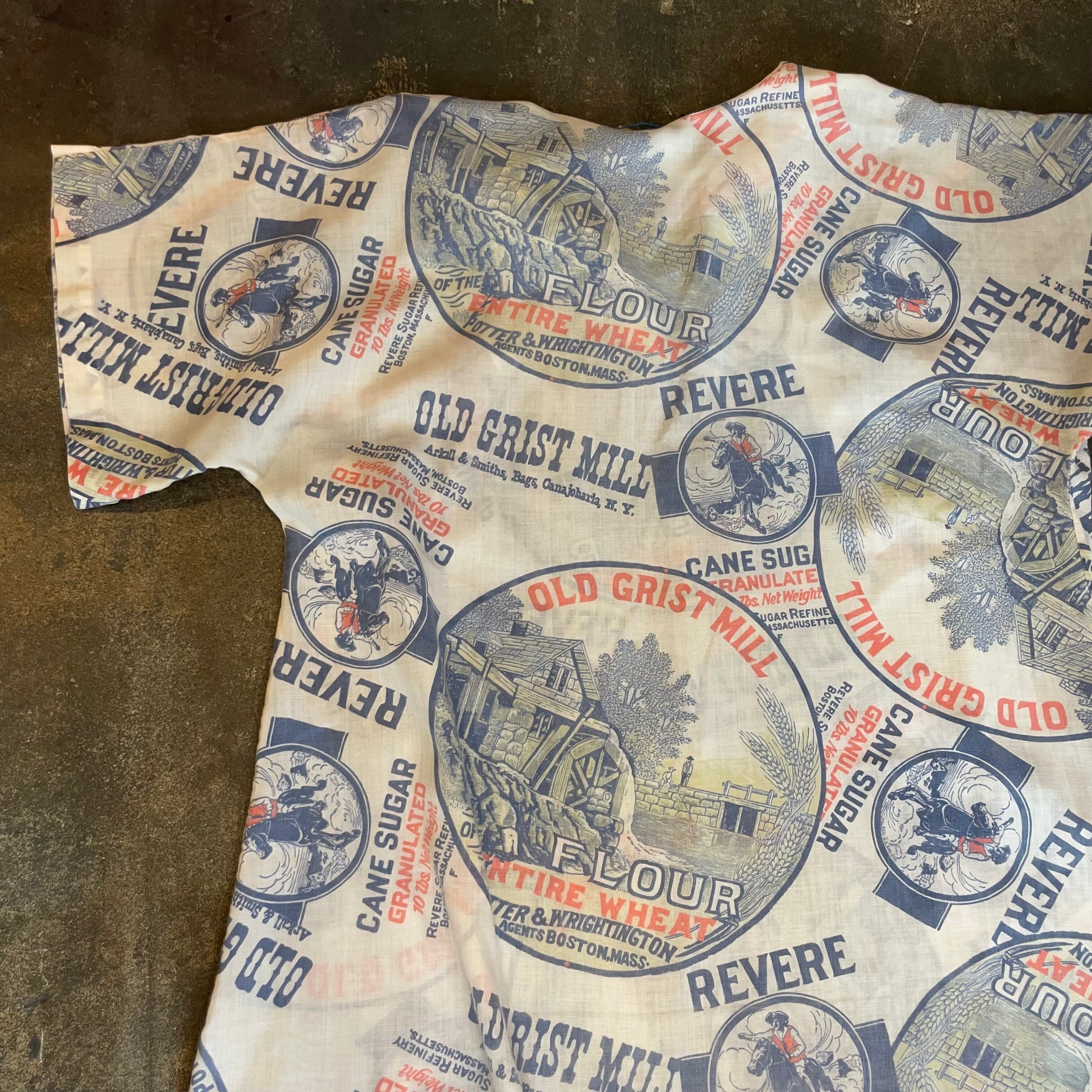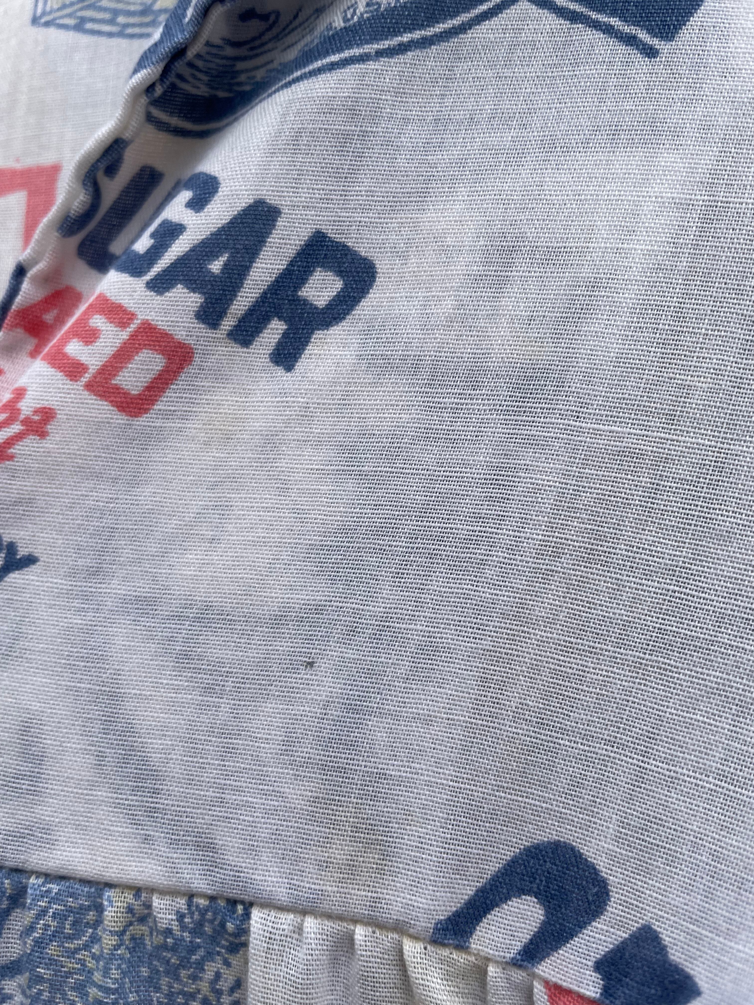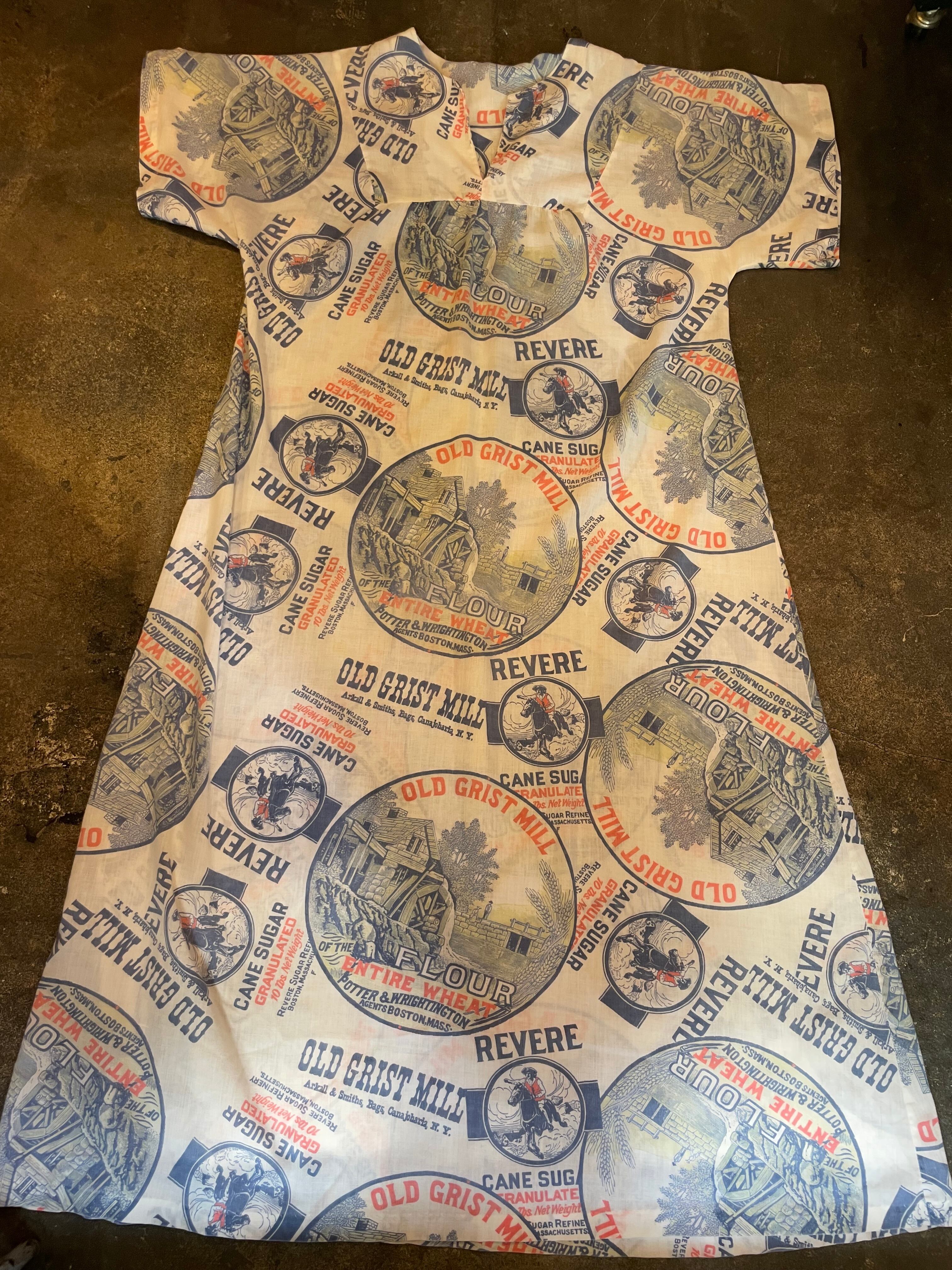 フィードサックの模様をプリントされた生地がかっこいい70年代頃のワンピースです。