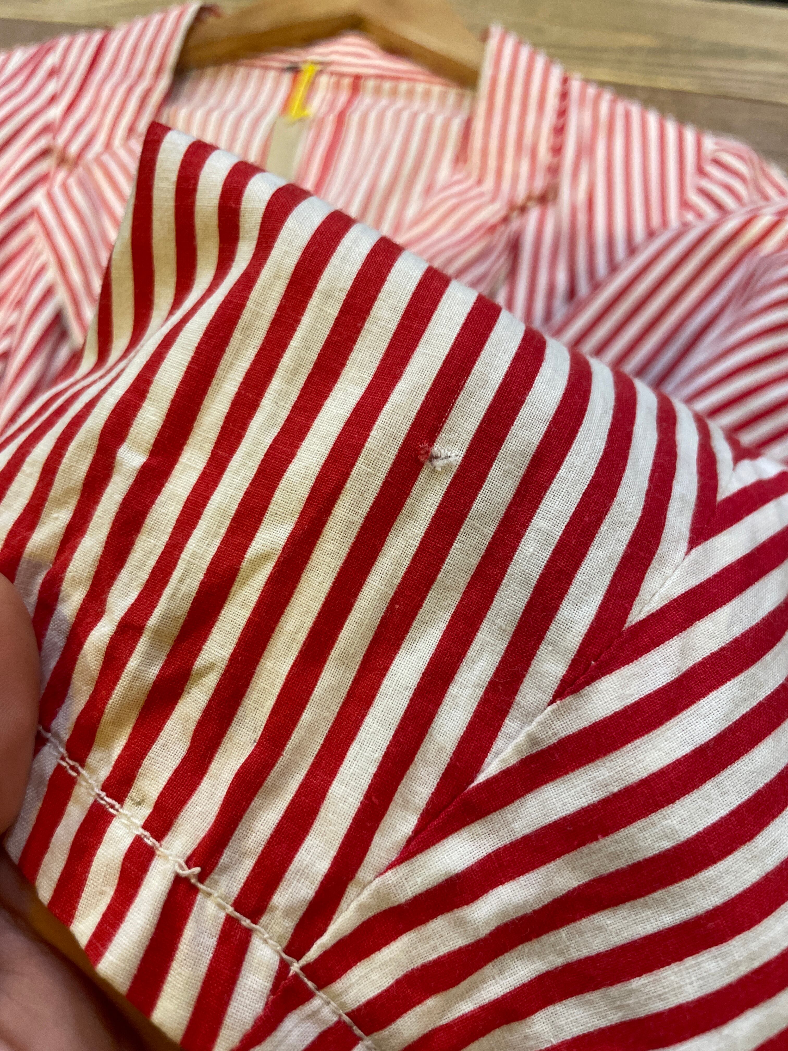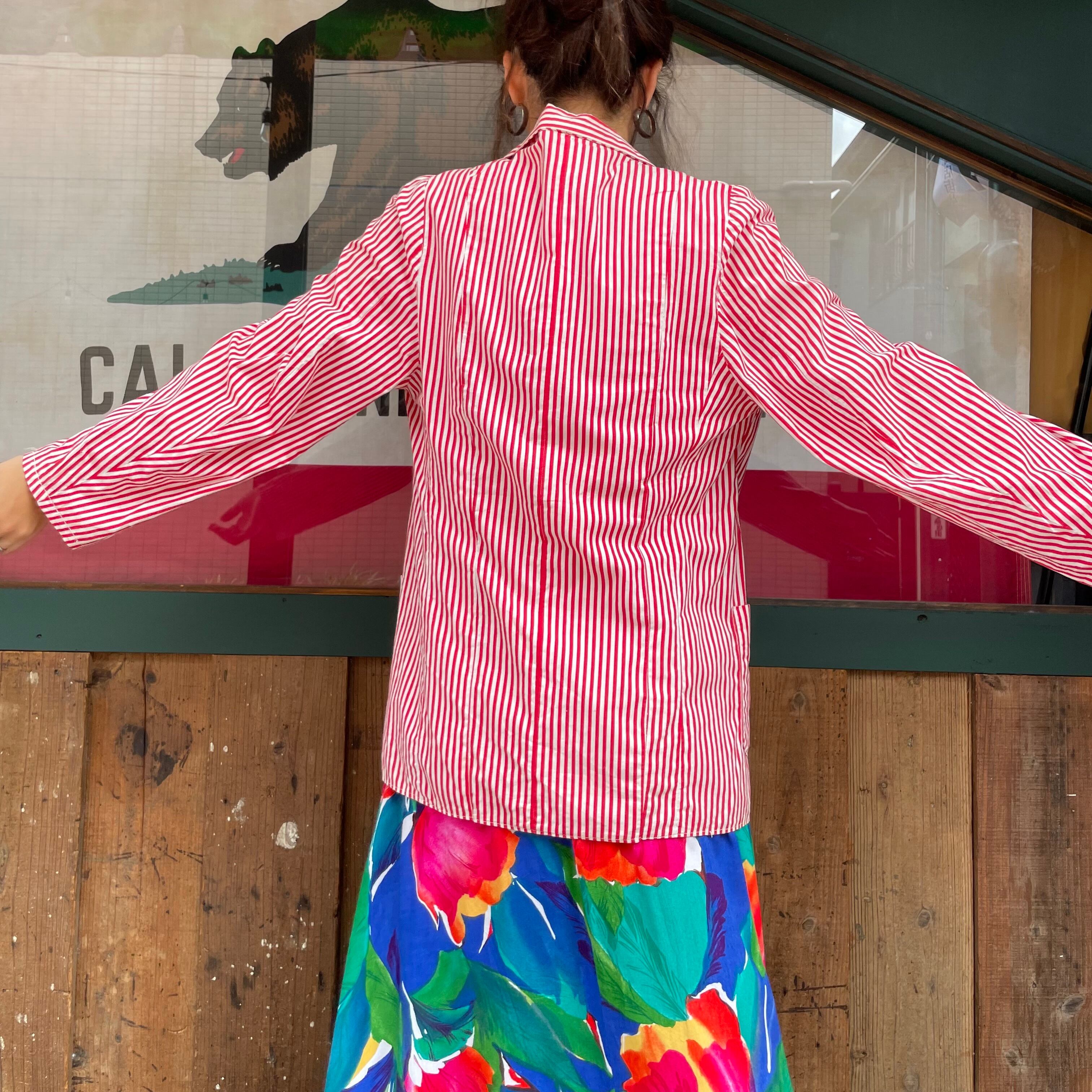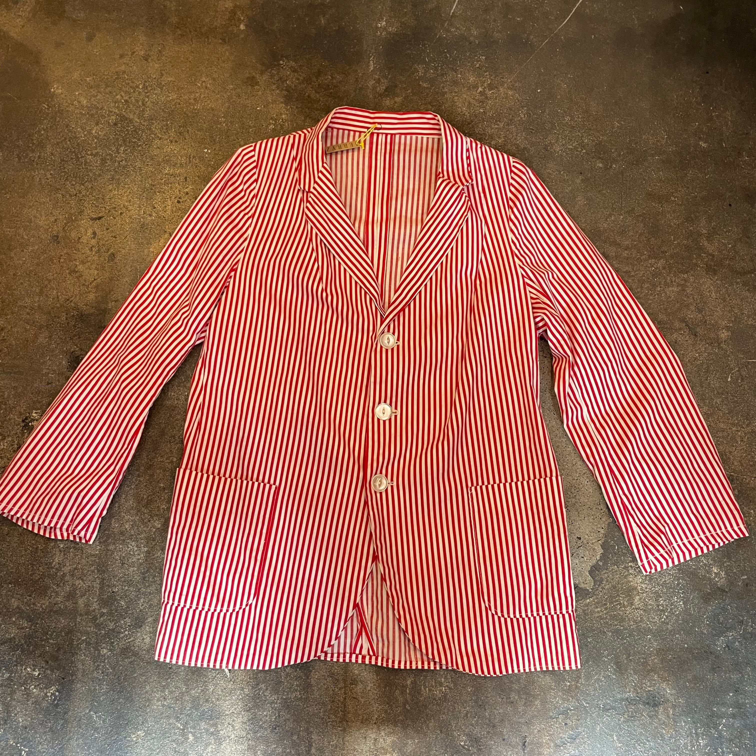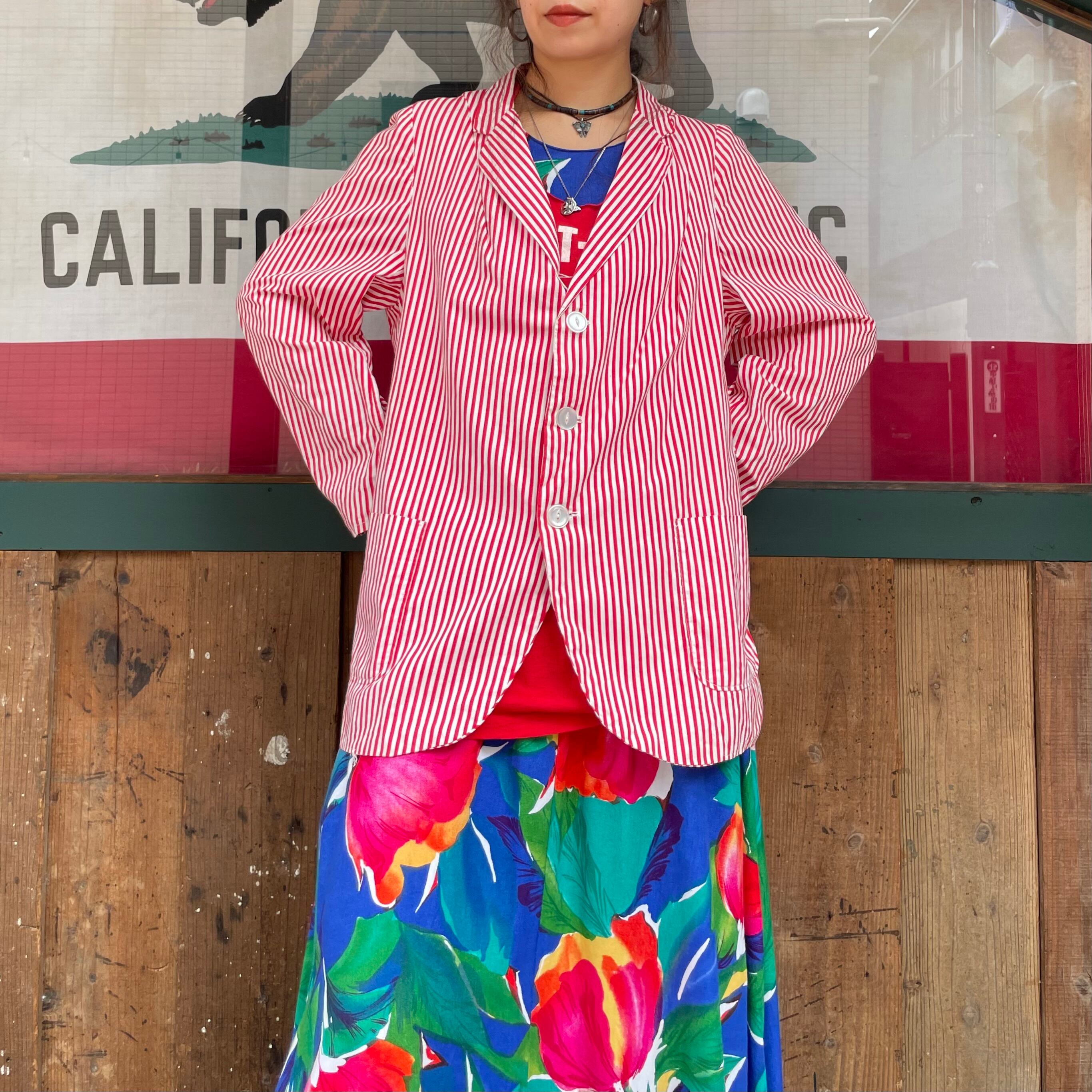 細かめな赤白ストライプの薄手のジャケットです。シルエットはすっきりしていてきれいですし、袖は立体裁断のようで丸みを帯びており着心地も良い感じになっています。