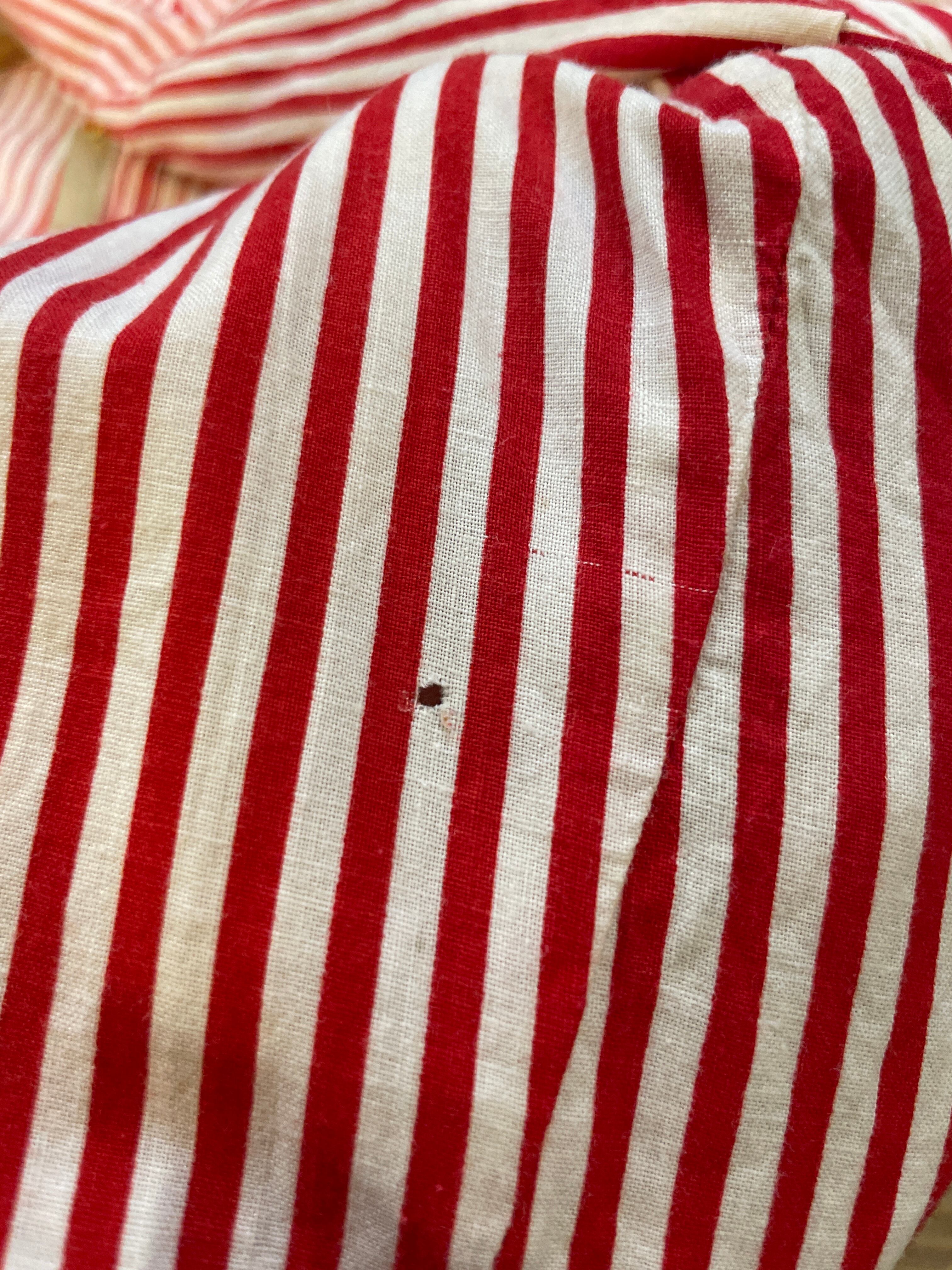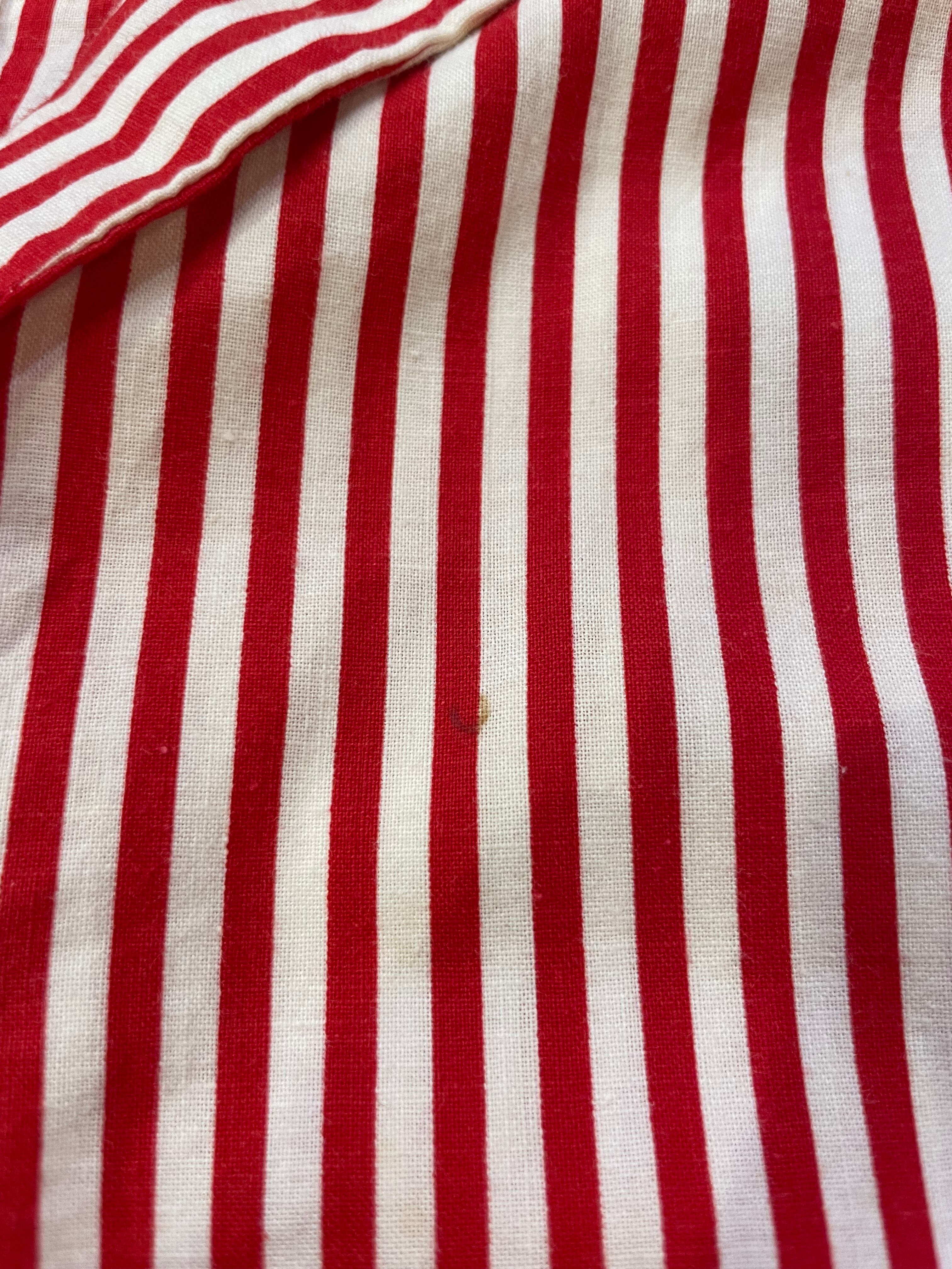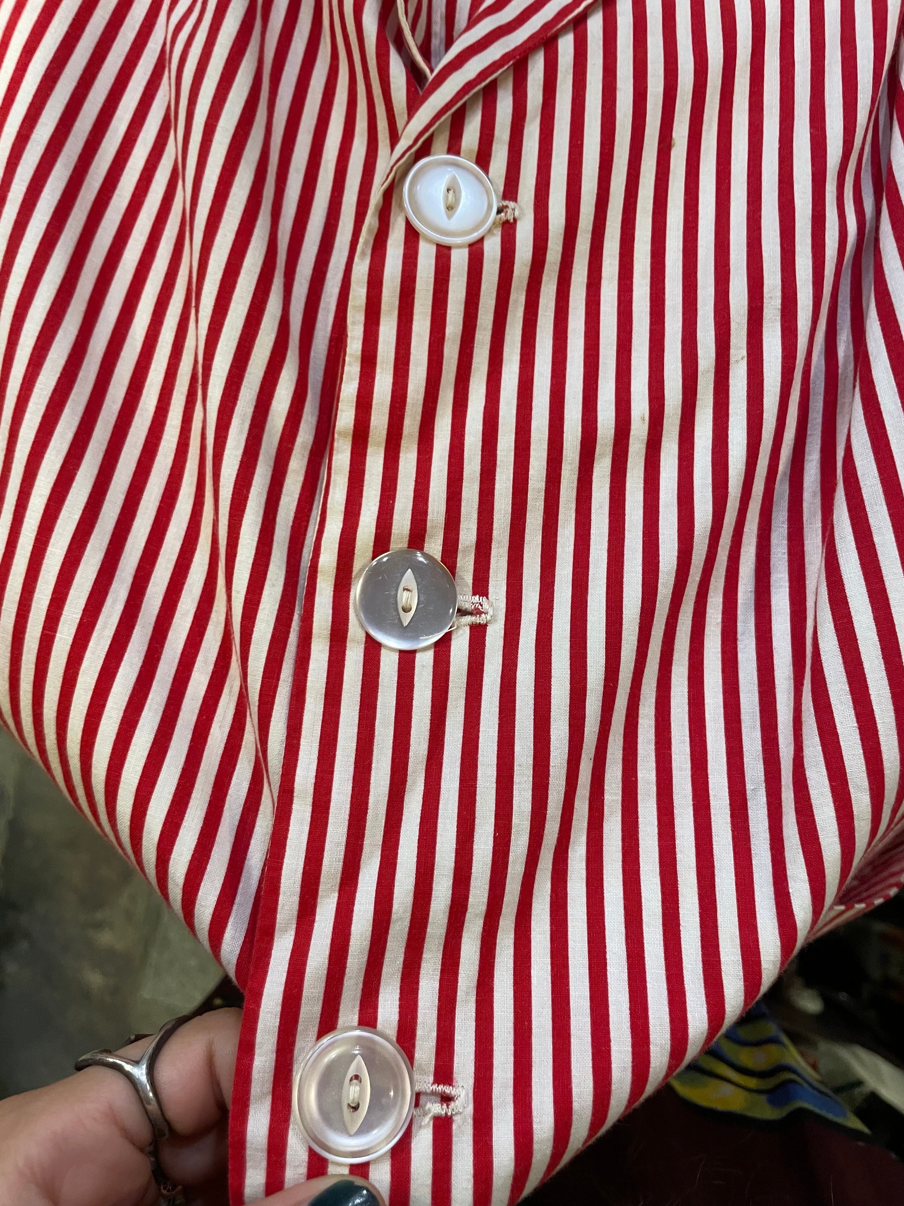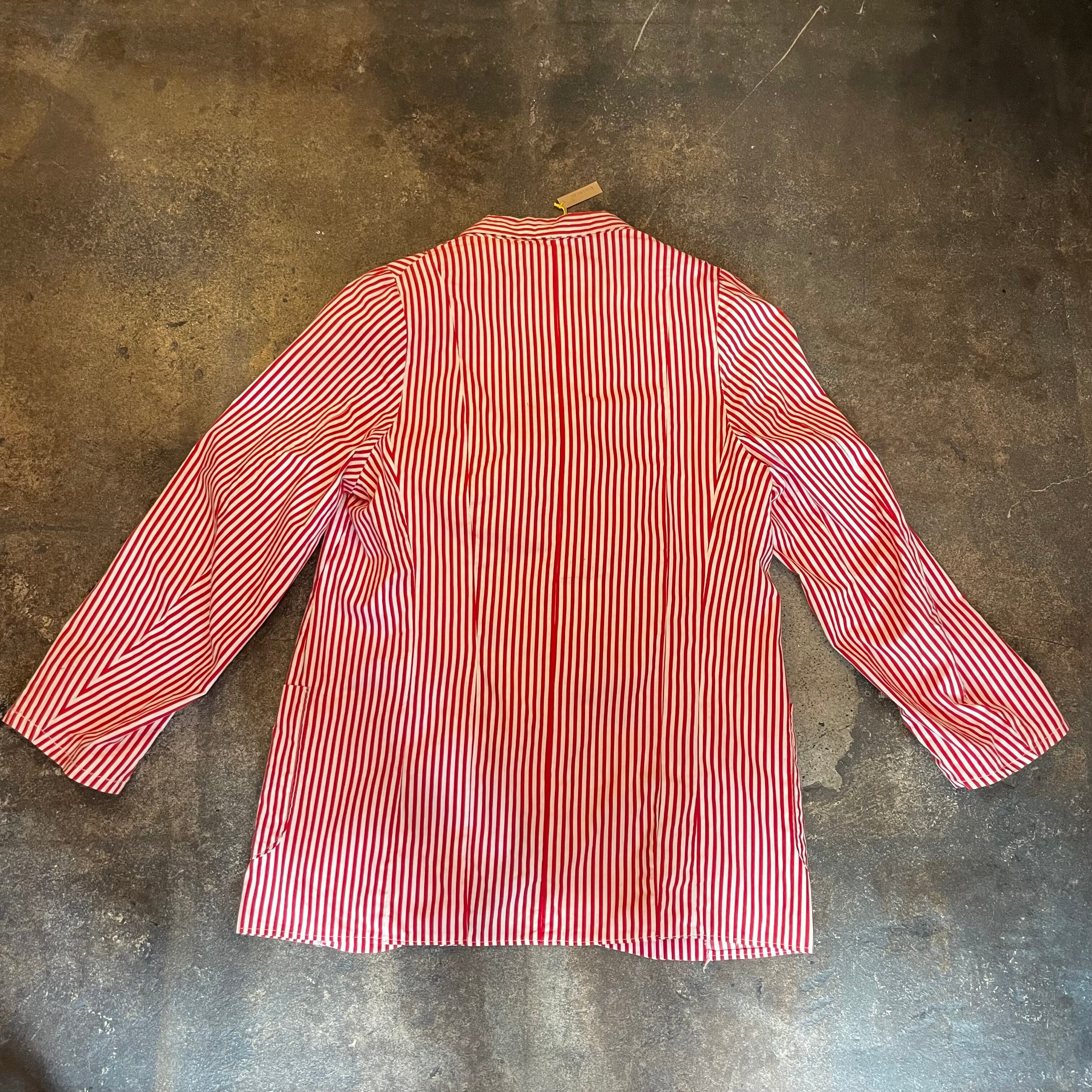 細かめな赤白ストライプの薄手のジャケットです。シルエットはすっきりしていてきれいですし、袖は立体裁断のようで丸みを帯びており着心地も良い感じになっています。