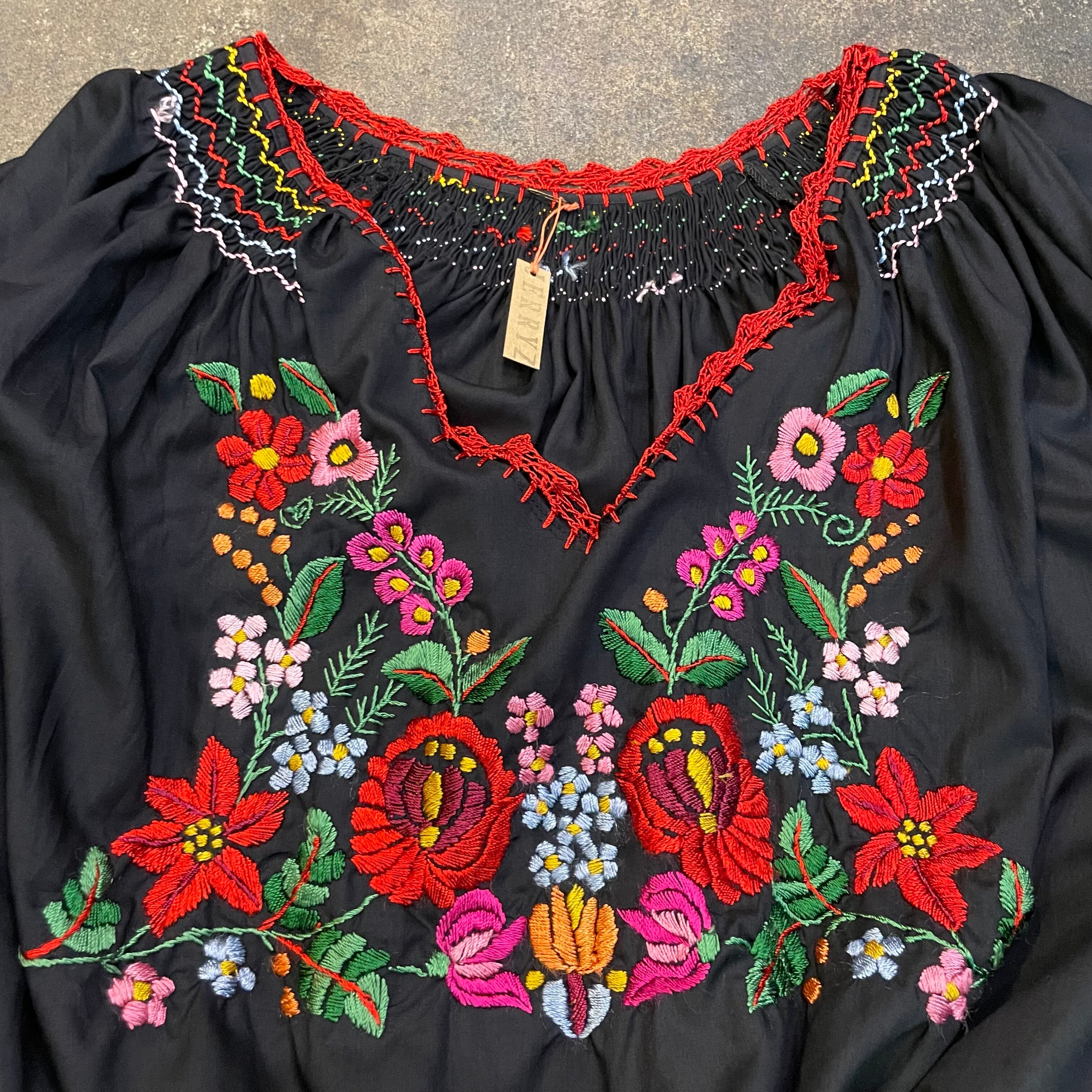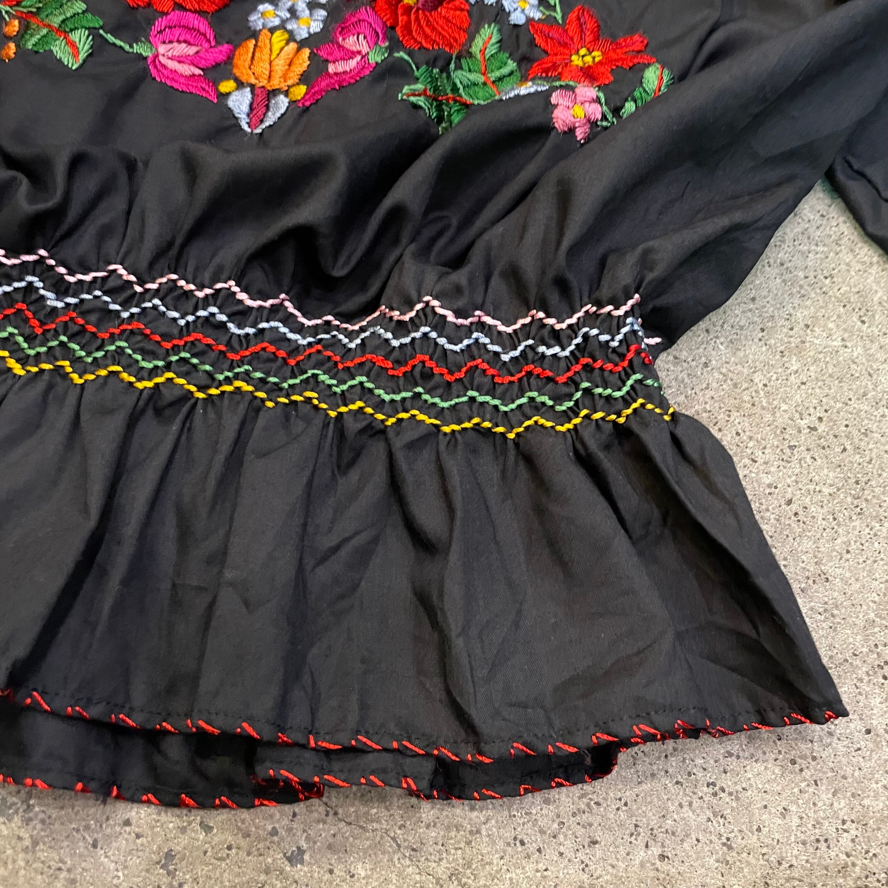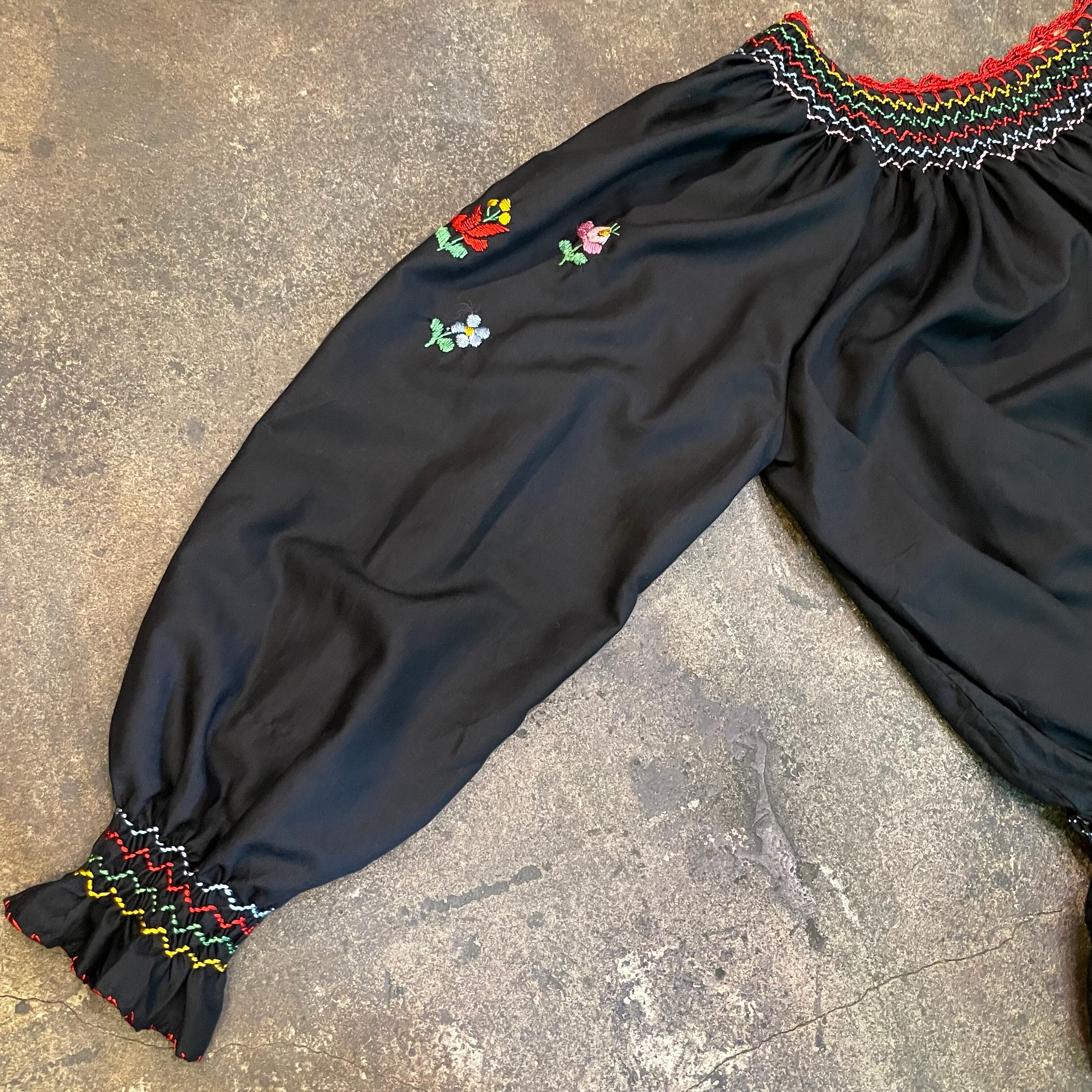 黒ベースにカラフルなお花たちの手刺繍が素敵なおそらくハンガリーのブラウスです。
