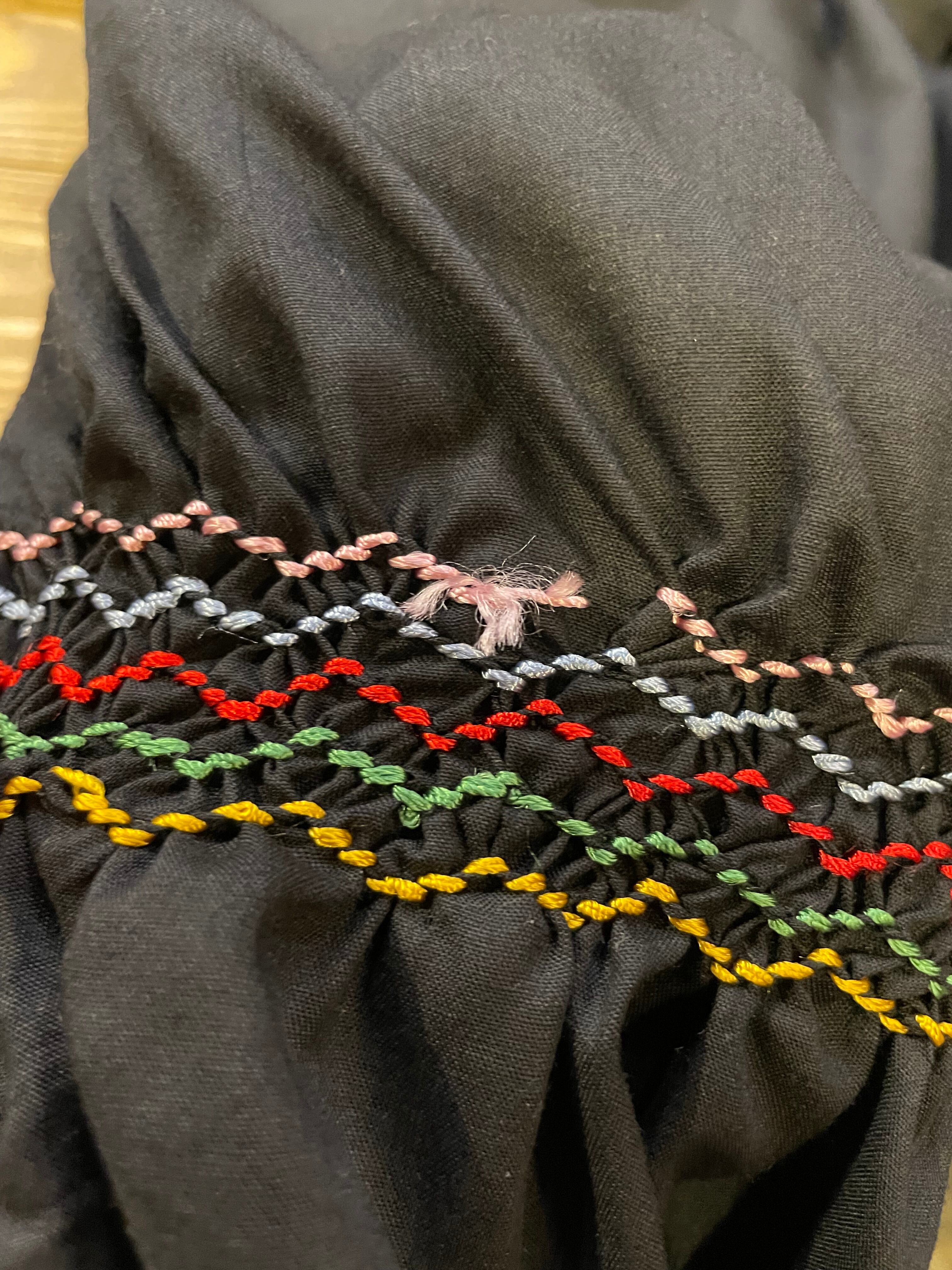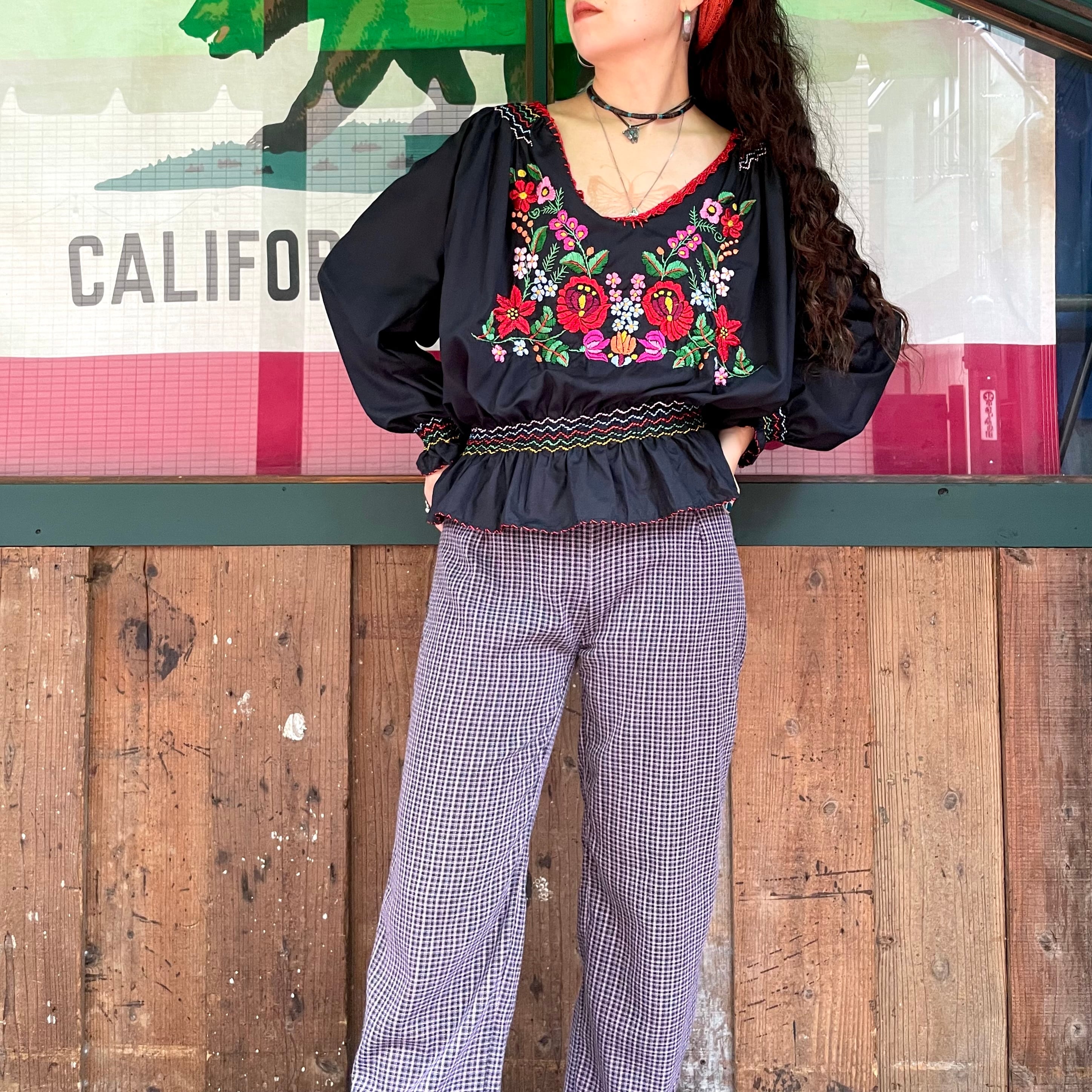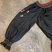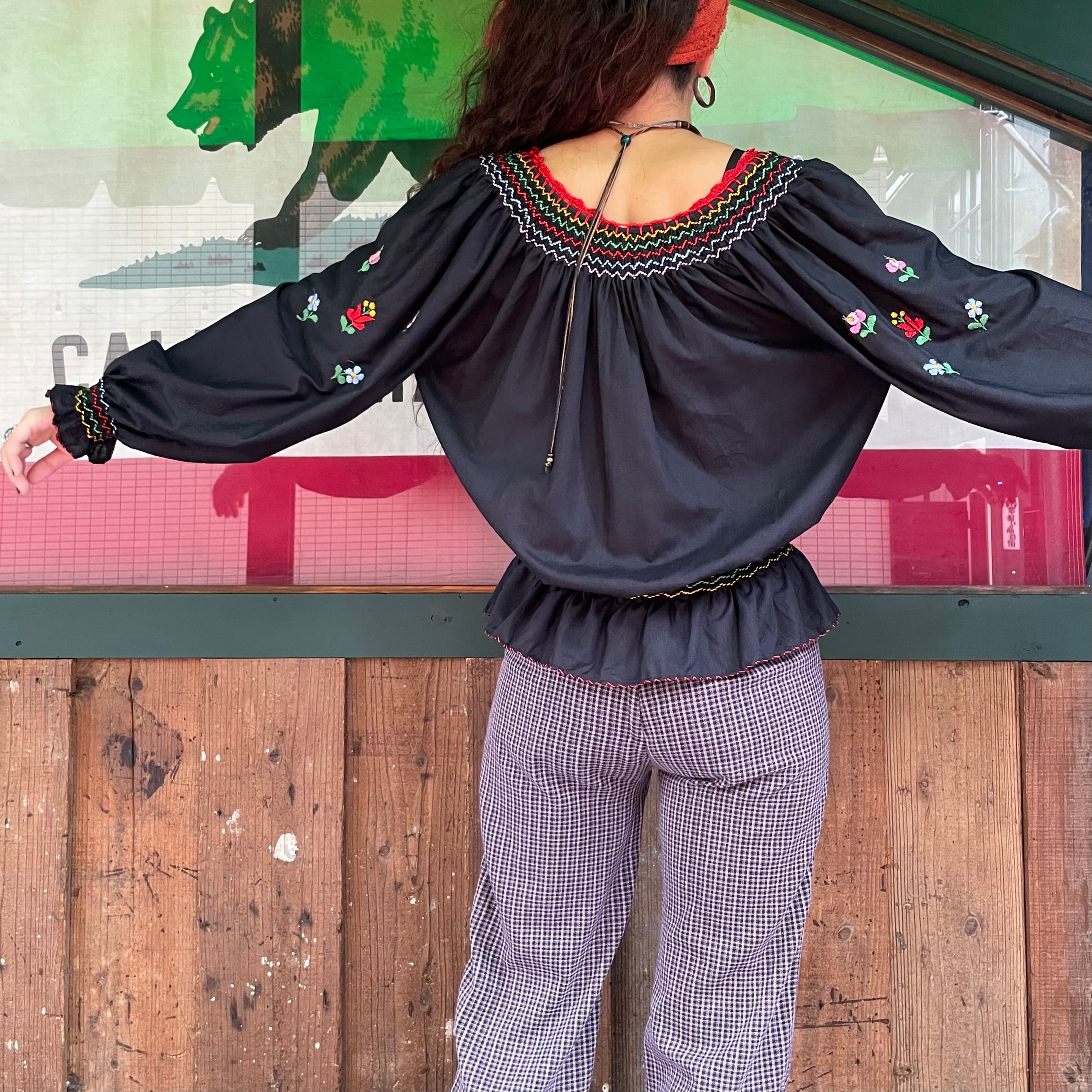 黒ベースにカラフルなお花たちの手刺繍が素敵なおそらくハンガリーのブラウスです。