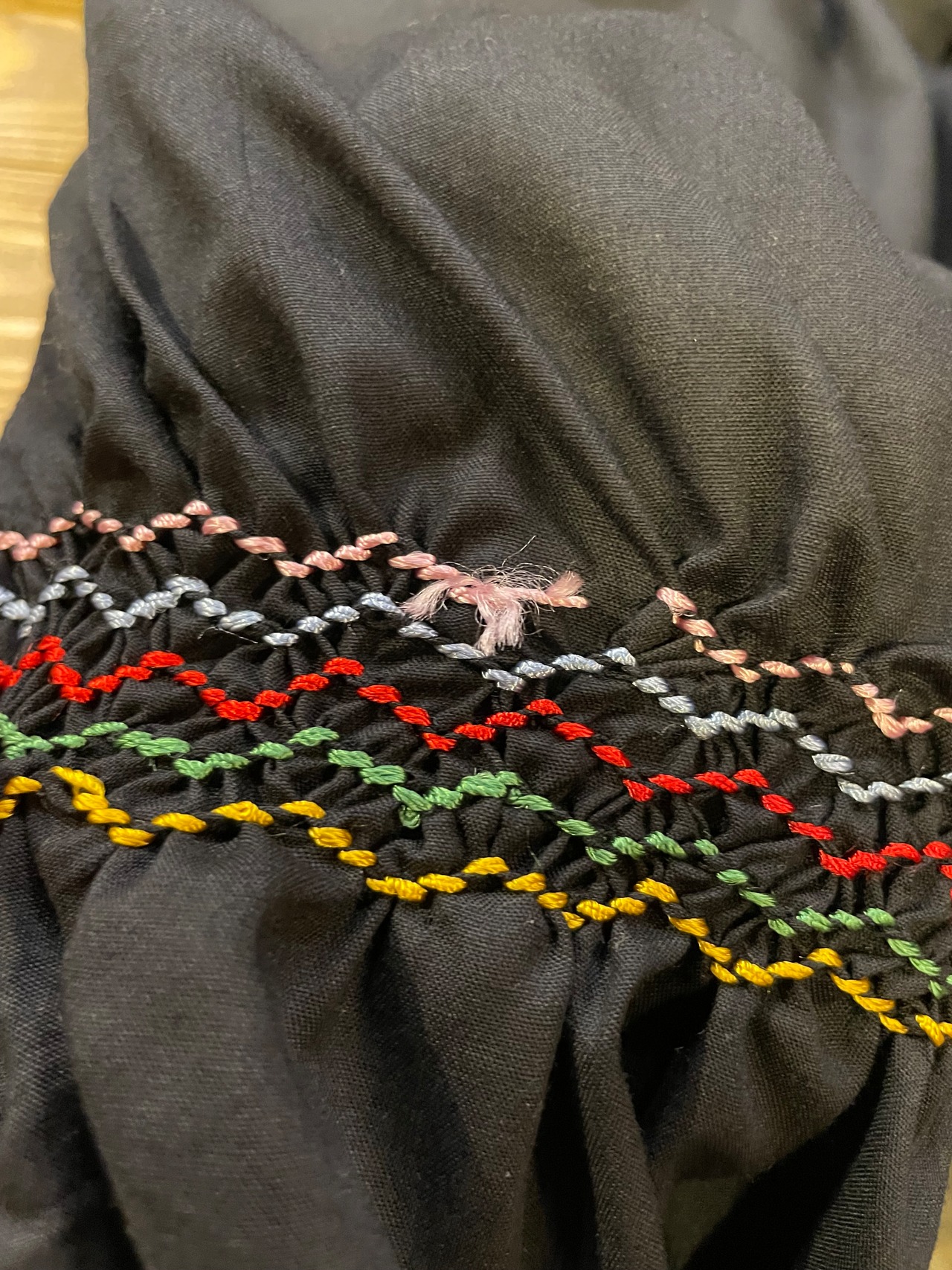 肩から後ろ襟ぐりにかけて、袖口や裾もギザギザにシャーリングがしてあり、きれいにギャザーでふわっとしたシルエットになるのがかわいいですね。