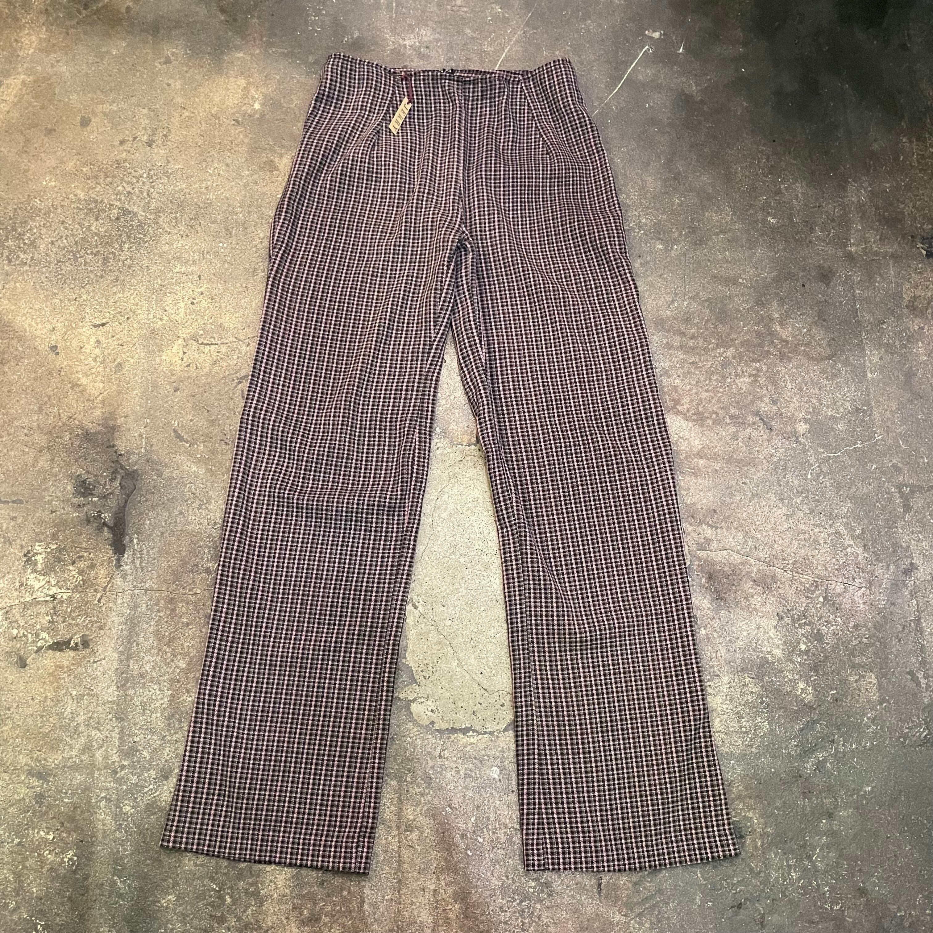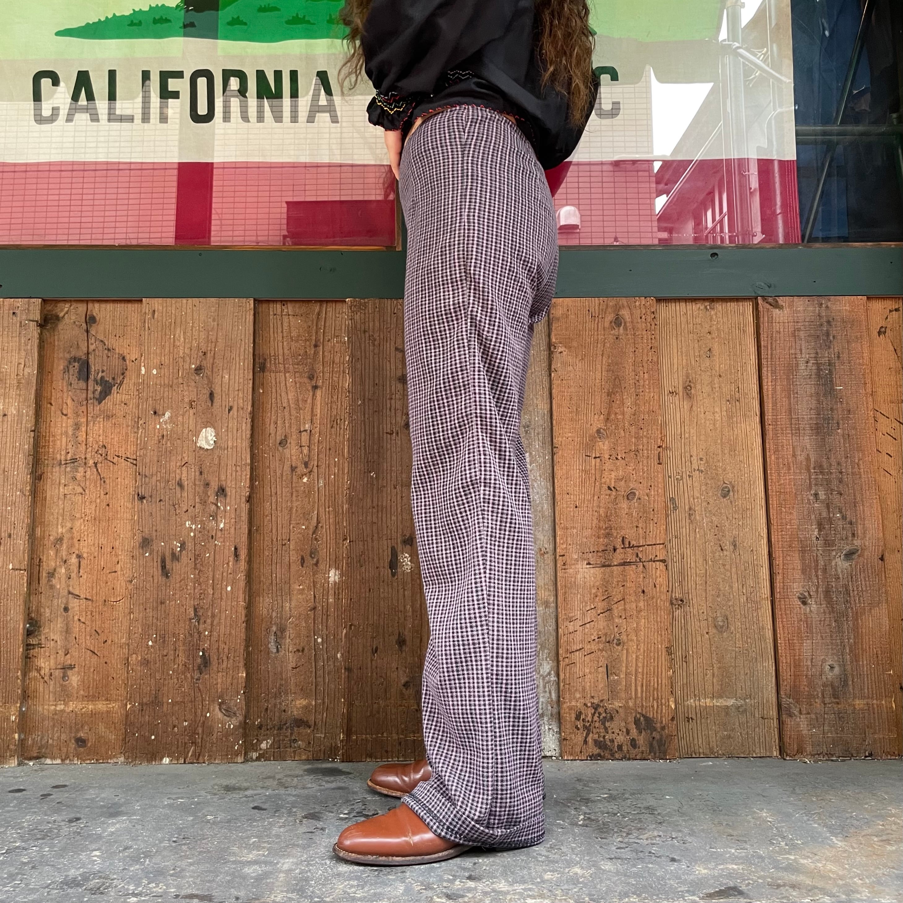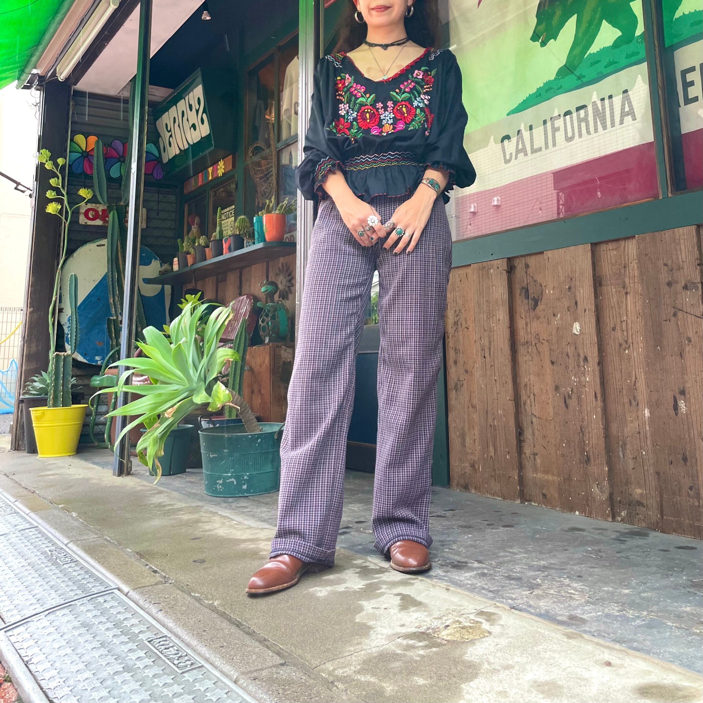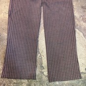細かくて柔らかい色味のチェック柄がかわいいパンツです。スッキリしたストレートなシルエットでポケットやベルトループもないあっさりしたデザインなところと、若干伸縮性があるのも楽ちんで良い雰囲気です。