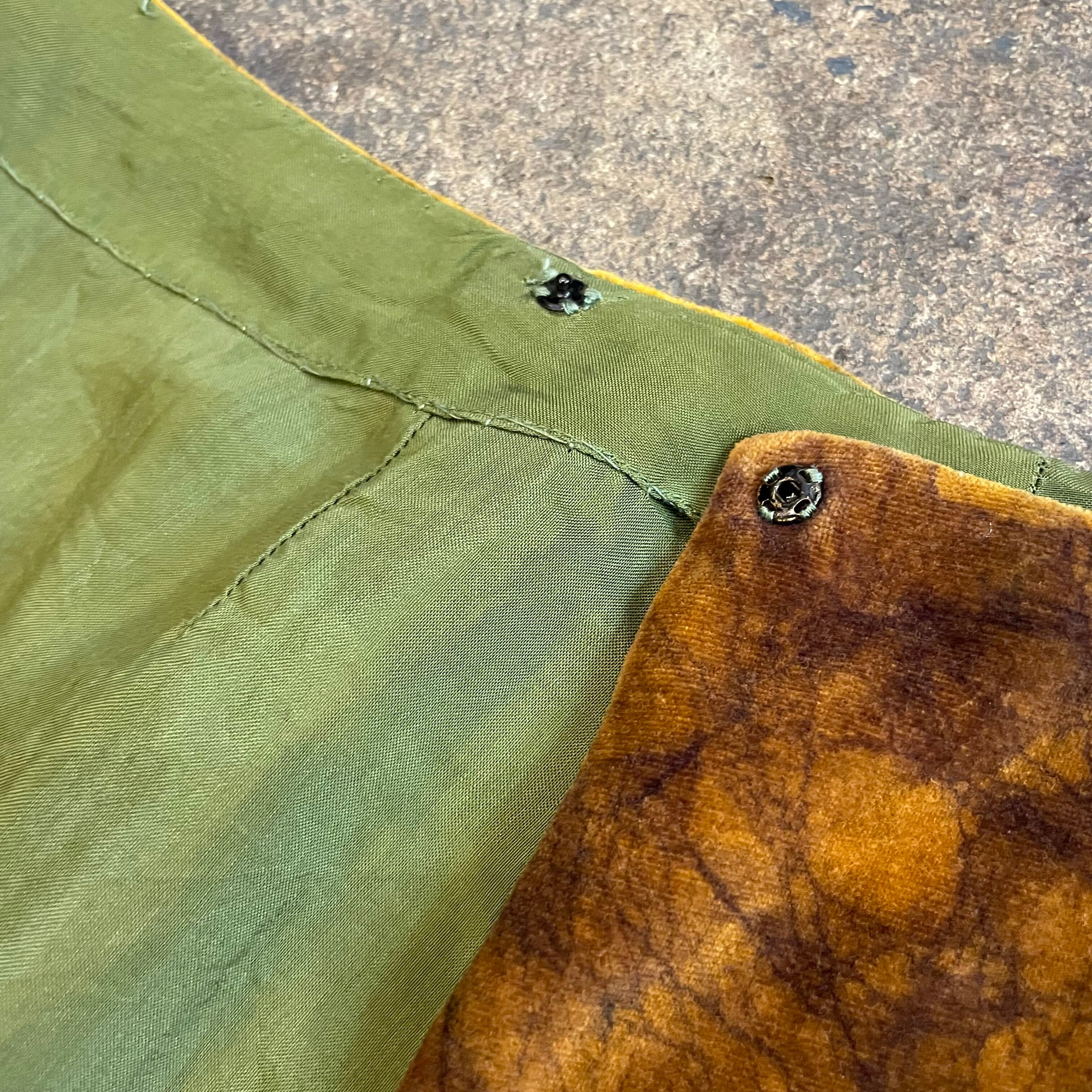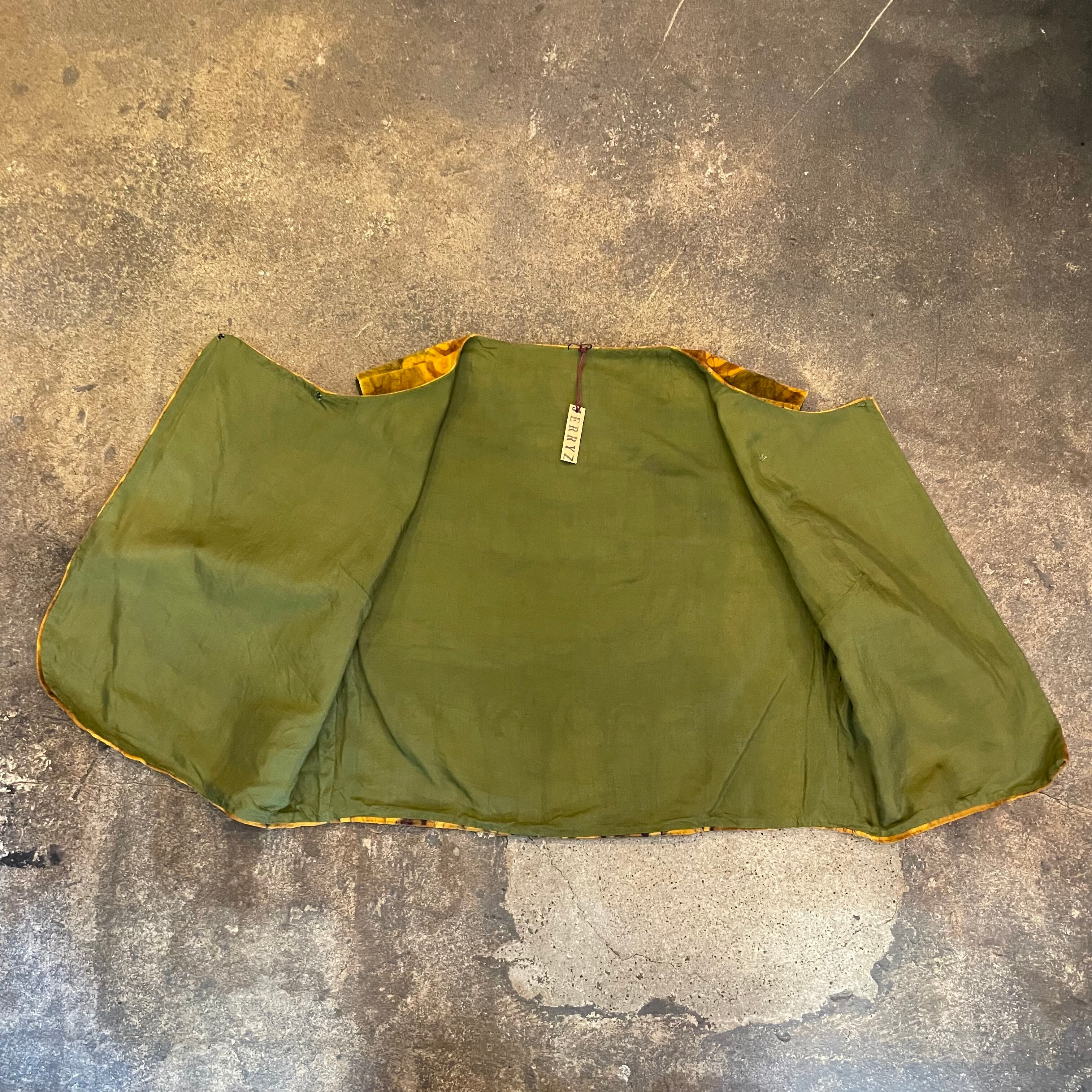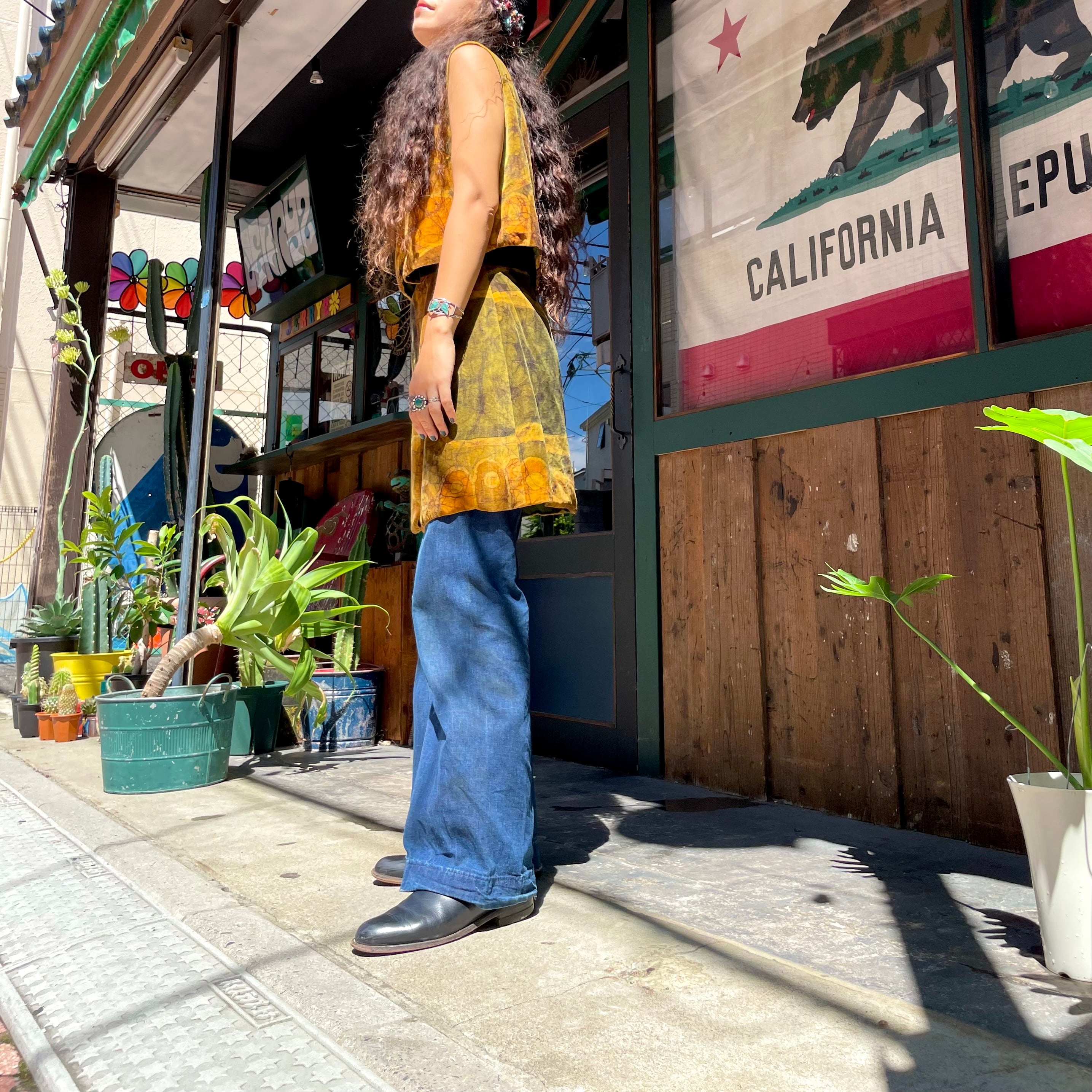 色味も模様も生地感もとても個性的で独特のムードを持っています。トップスは前で2箇所スナップでぱちっと留めるベストのようなアイテムで、スカートも前のスナップとホックで留める巻きスカートになっています。