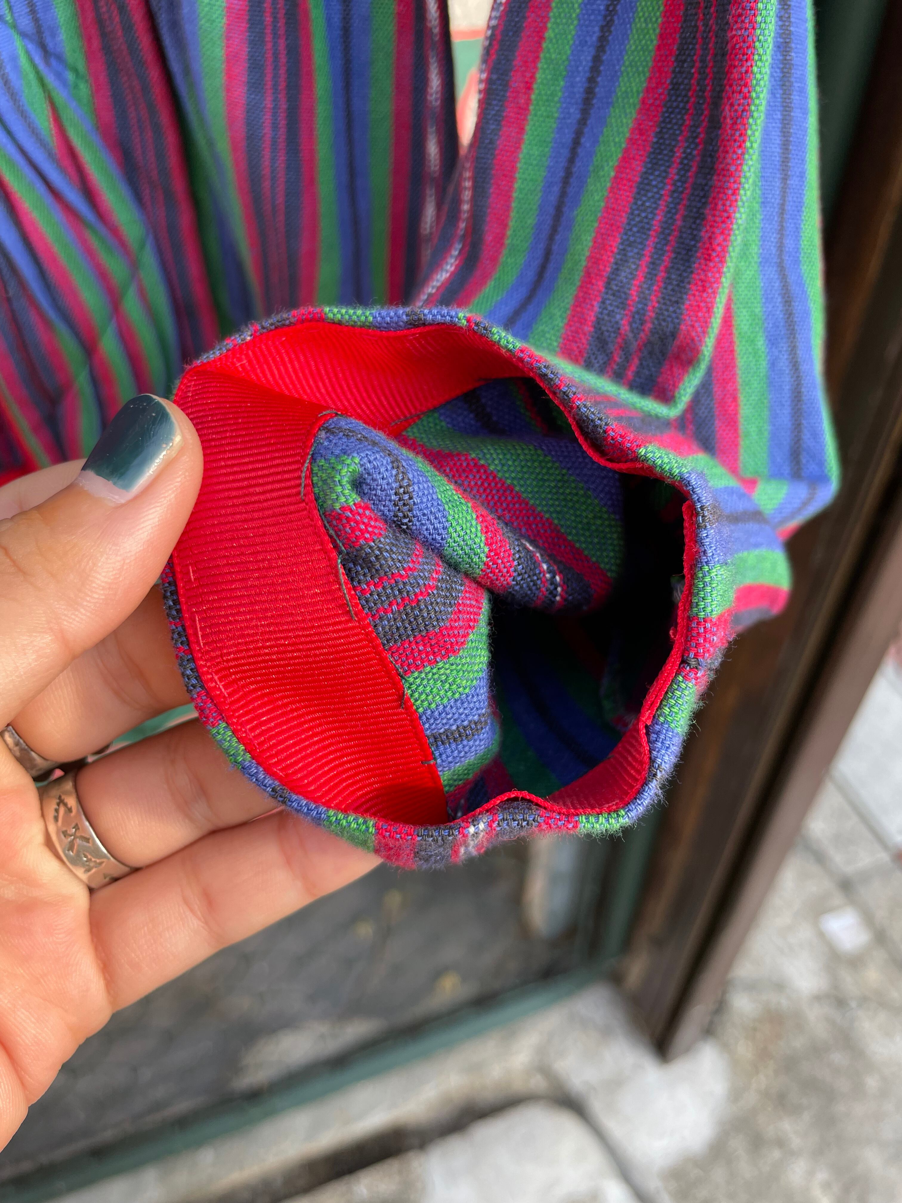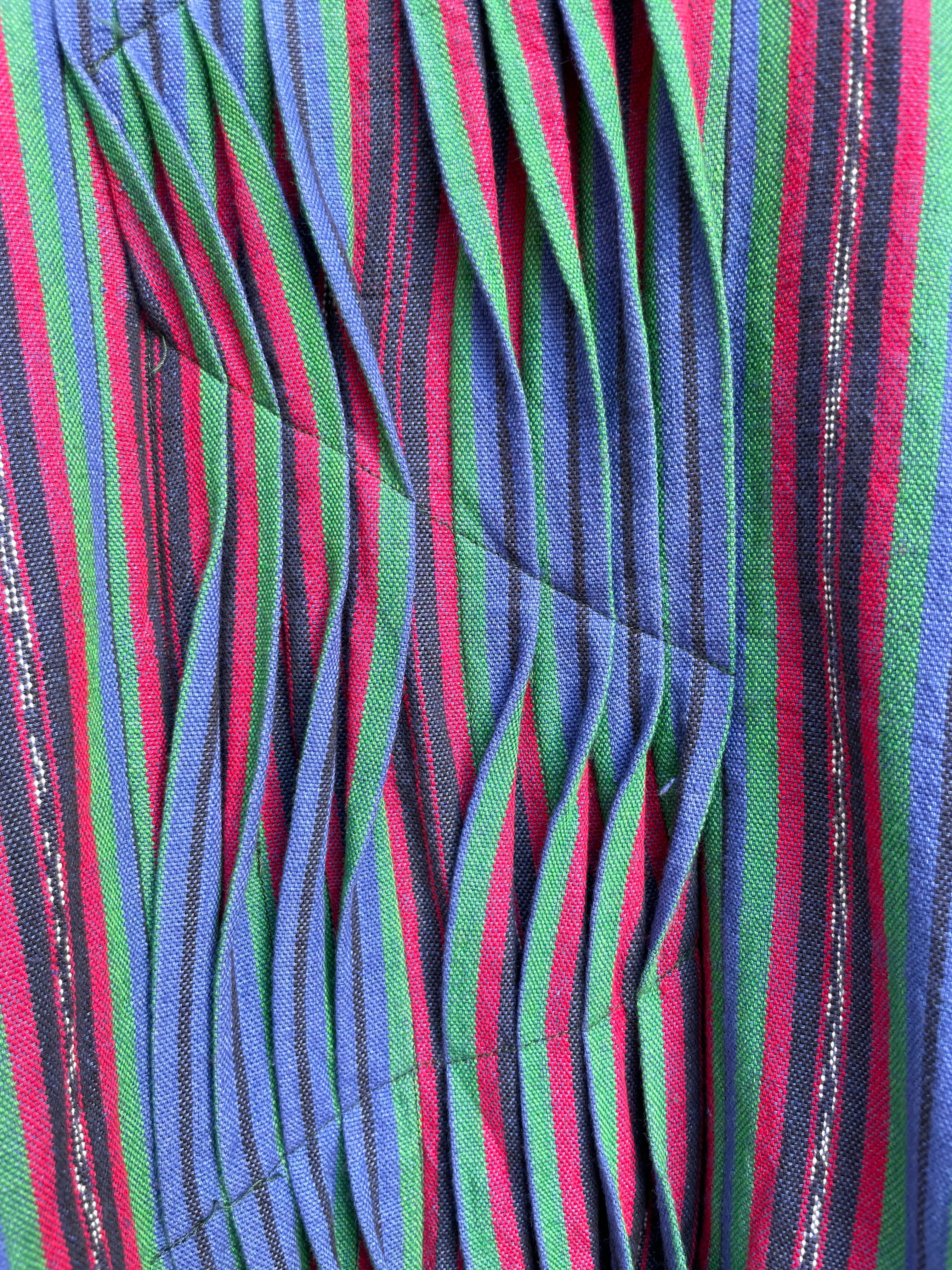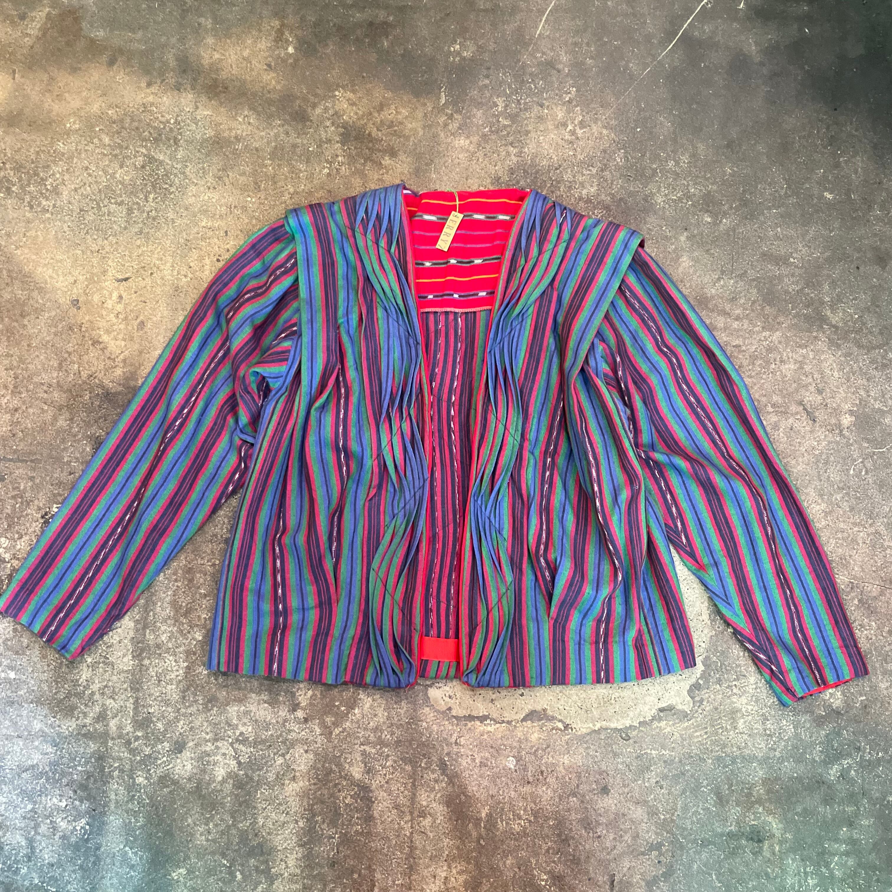 ストライプの生地を活かした立体的なディテールが不思議でユニークなジャケットです。