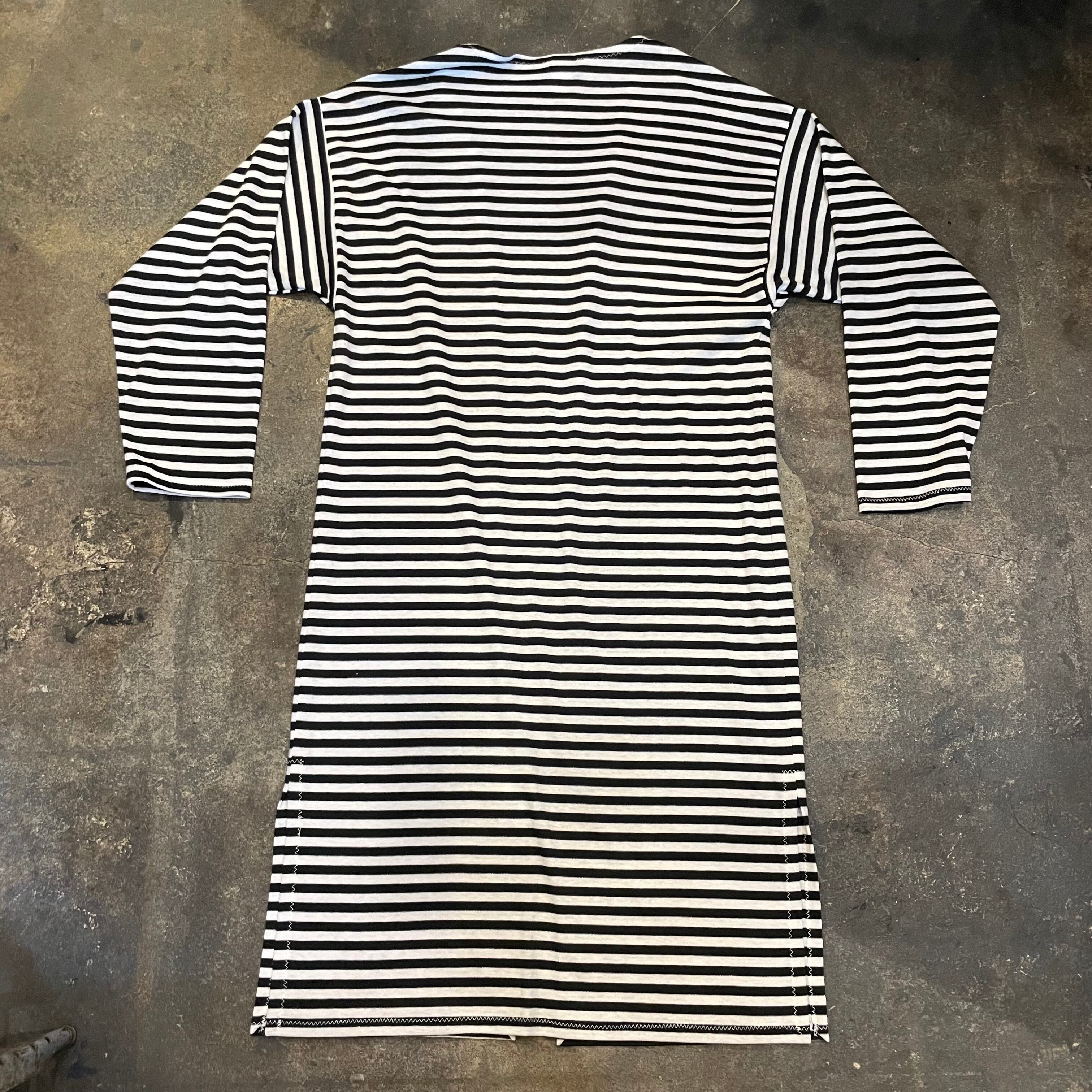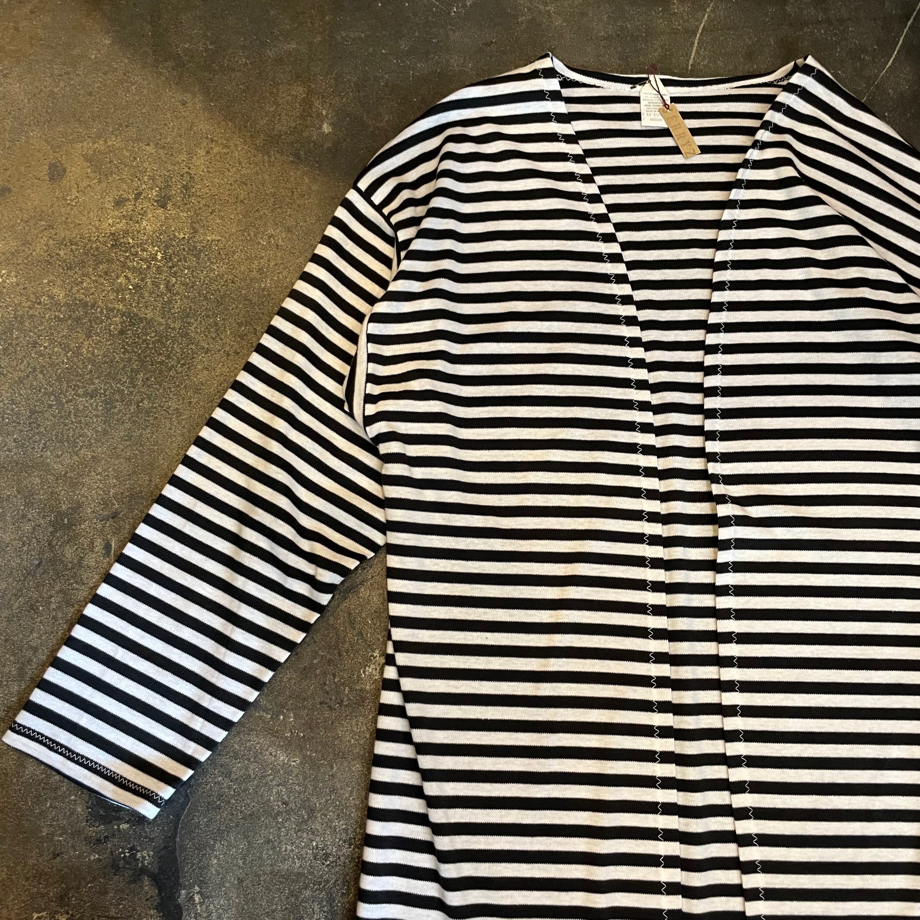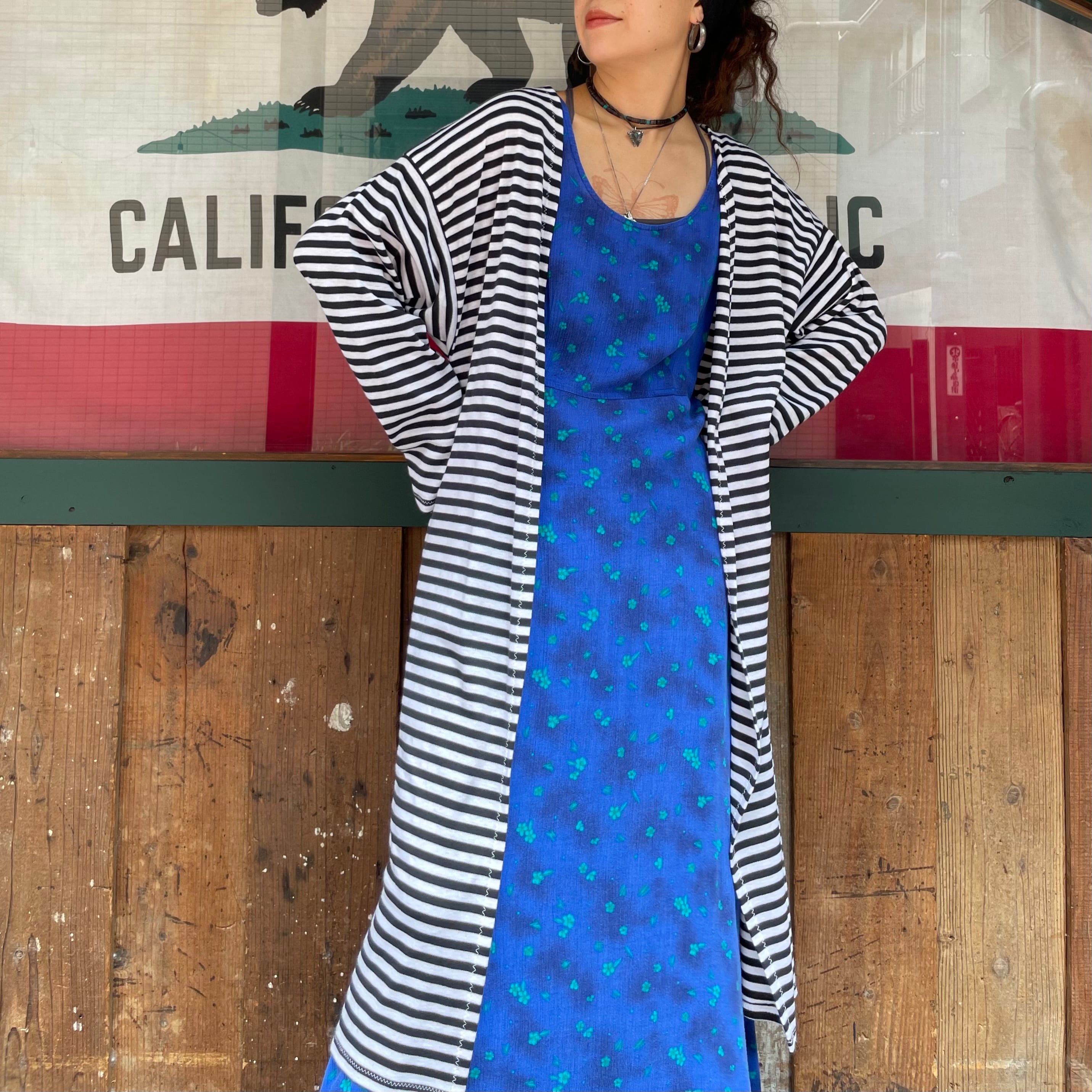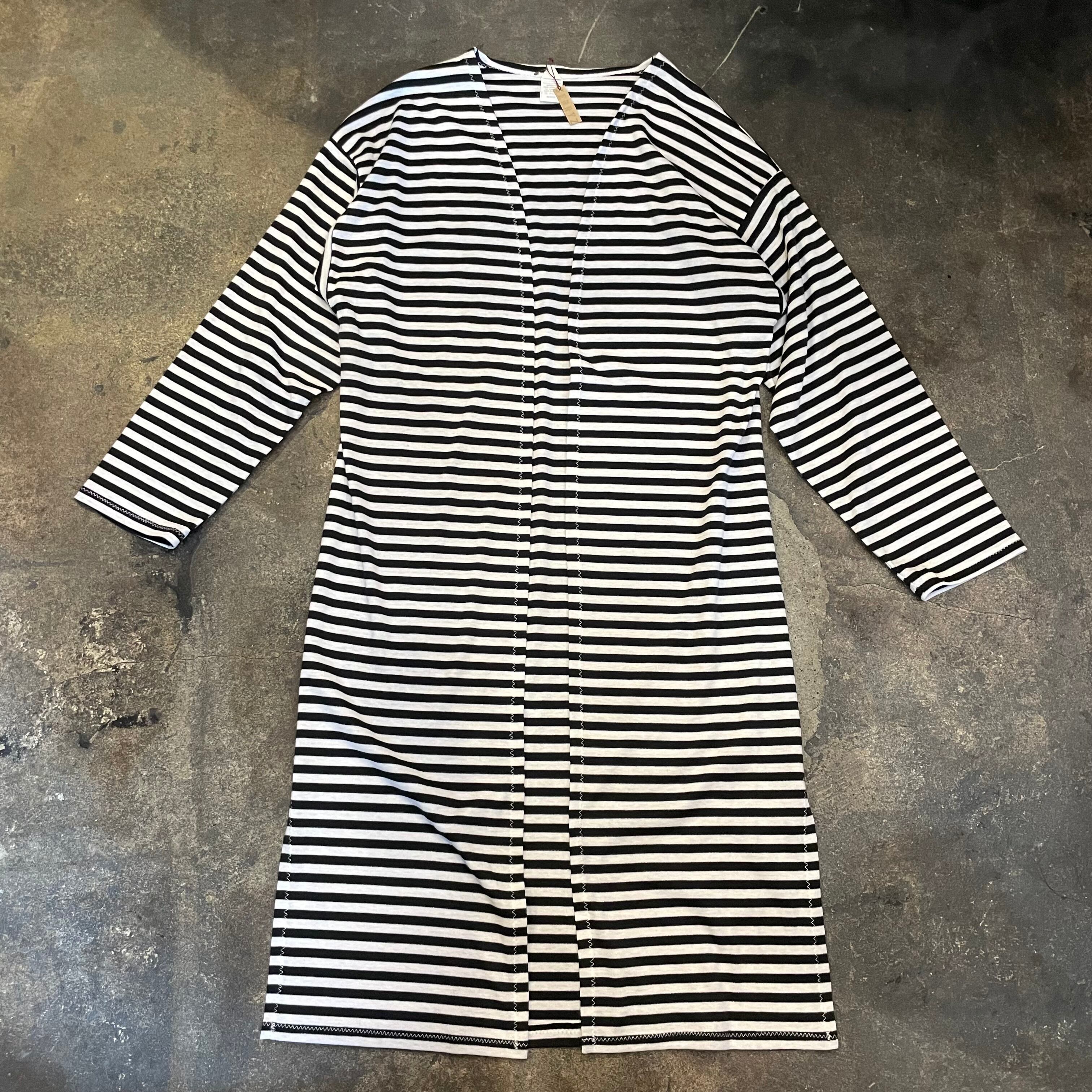 細めのボーダーがかわいいニット素材のガウンです。前は閉じない仕様で裾にスリット、ゆるっとずるっとした袖など全体的にリラクシングな緩い雰囲気がかわいい一枚です。