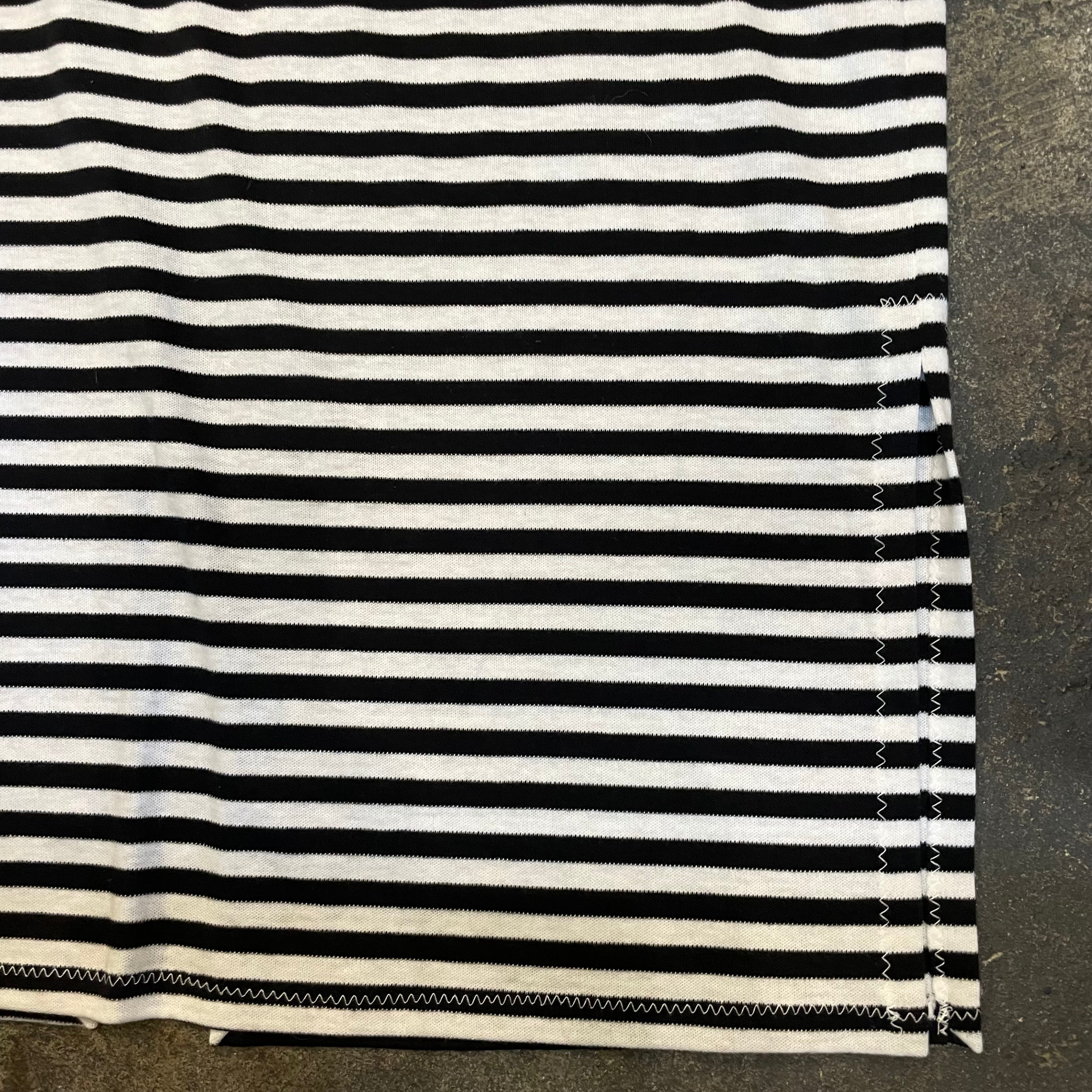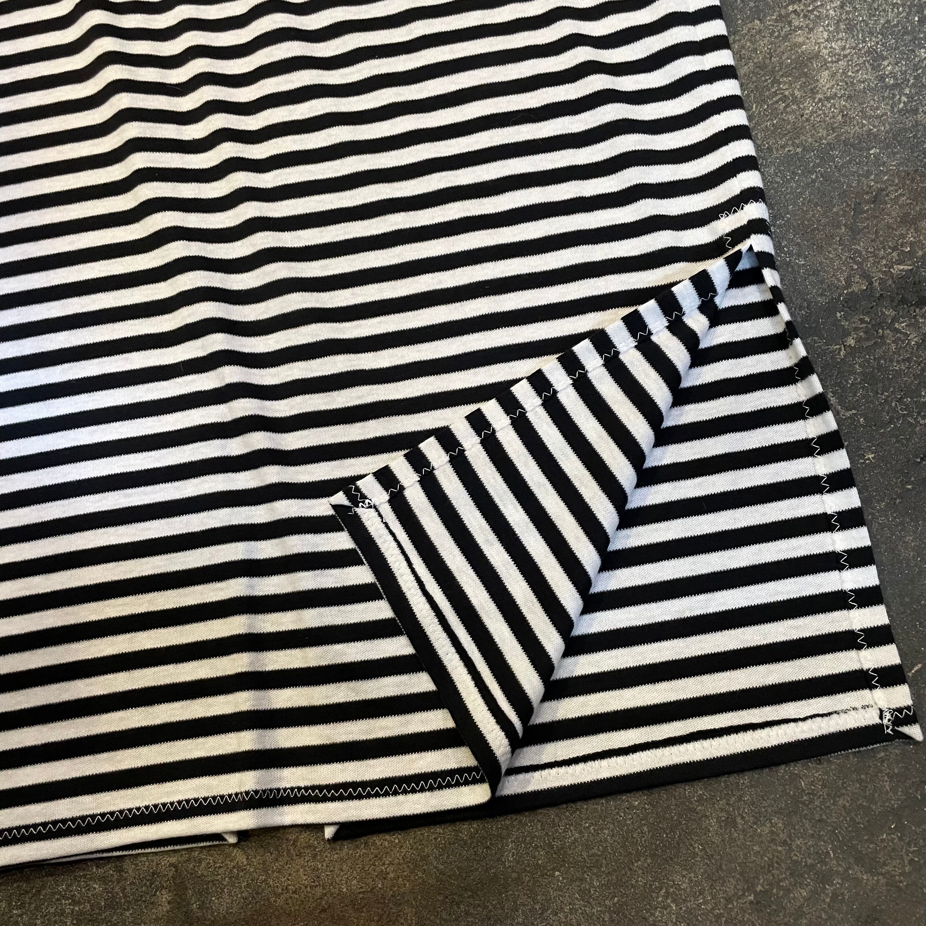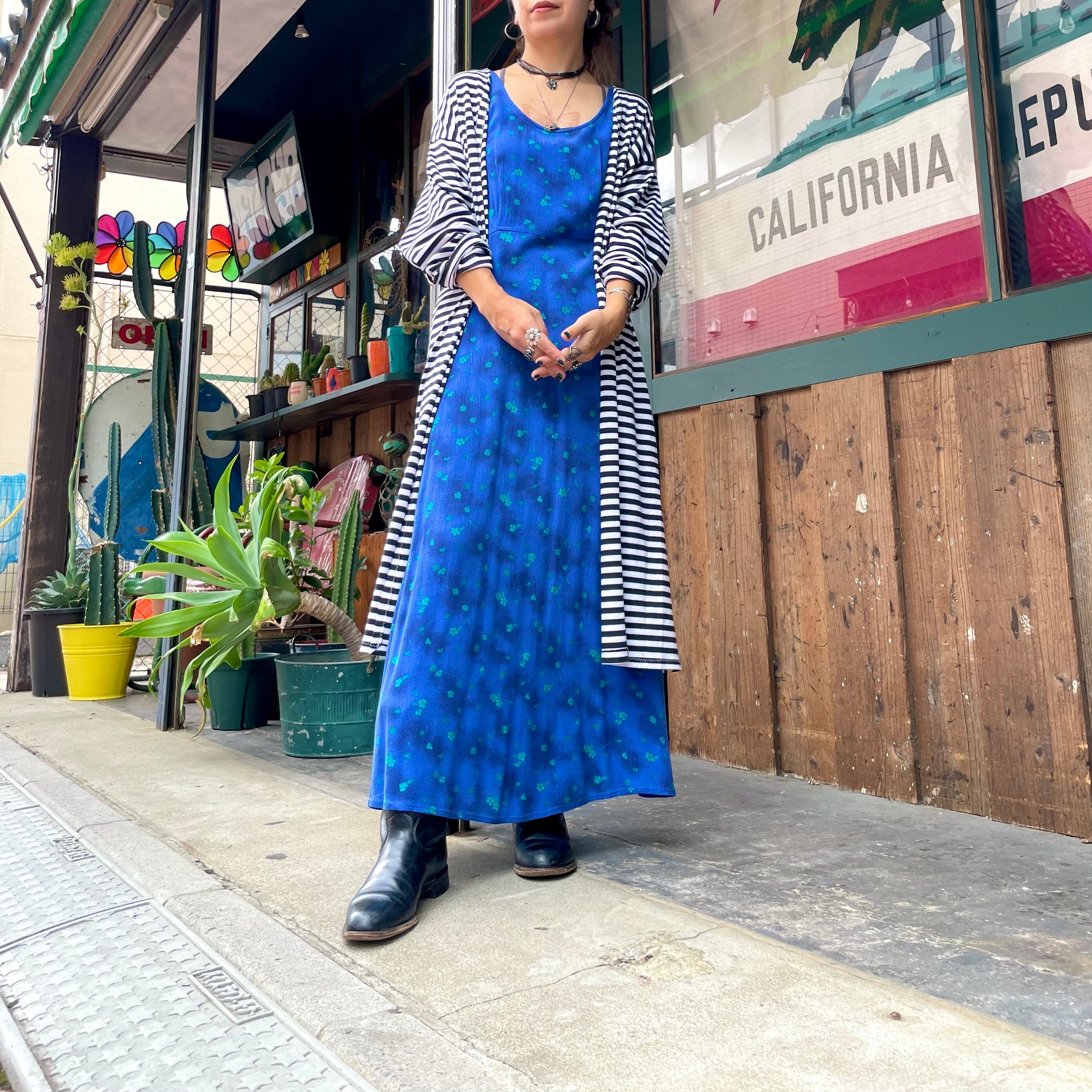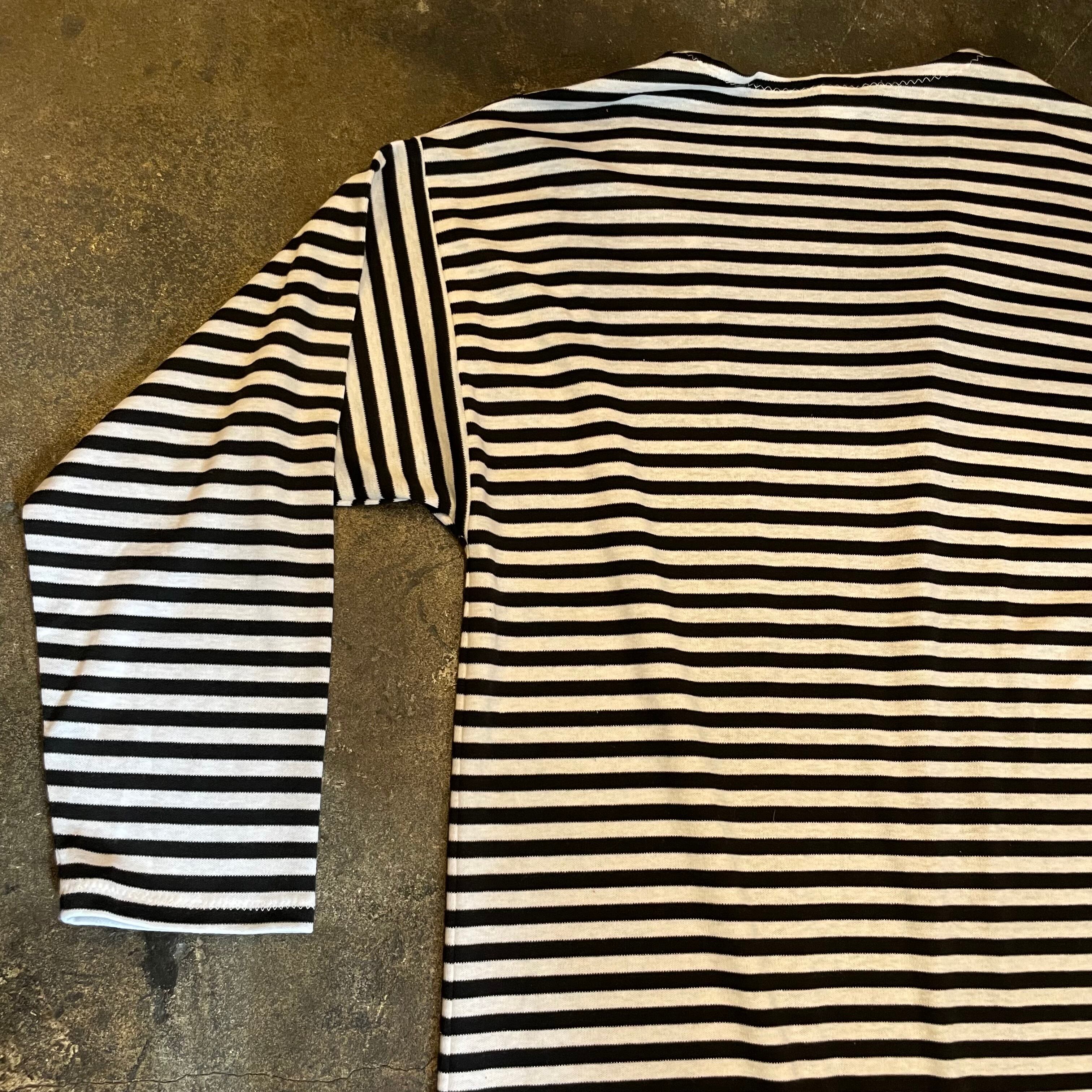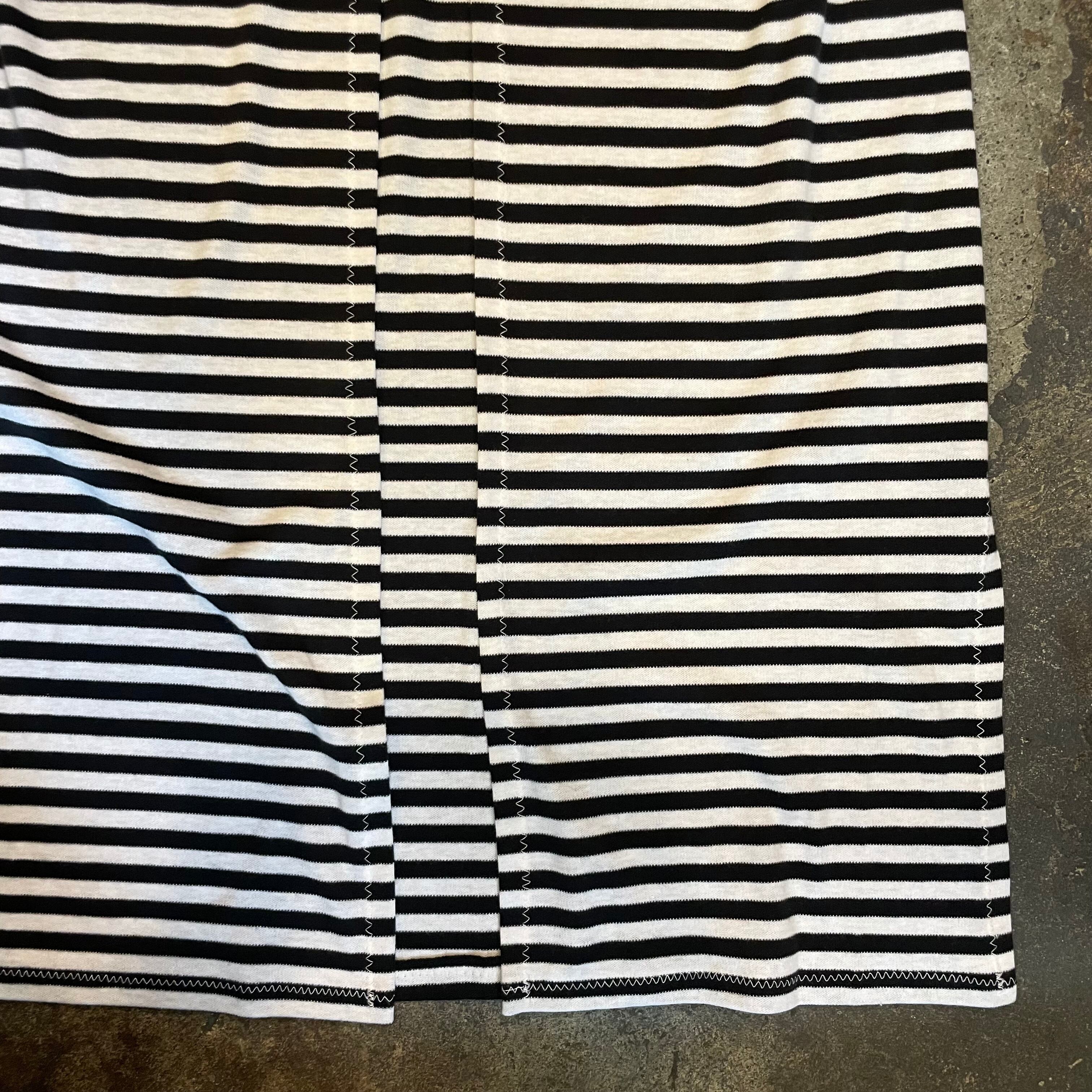 細めのボーダーがかわいいニット素材のガウンです。前は閉じない仕様で裾にスリット、ゆるっとずるっとした袖など全体的にリラクシングな緩い雰囲気がかわいい一枚です。