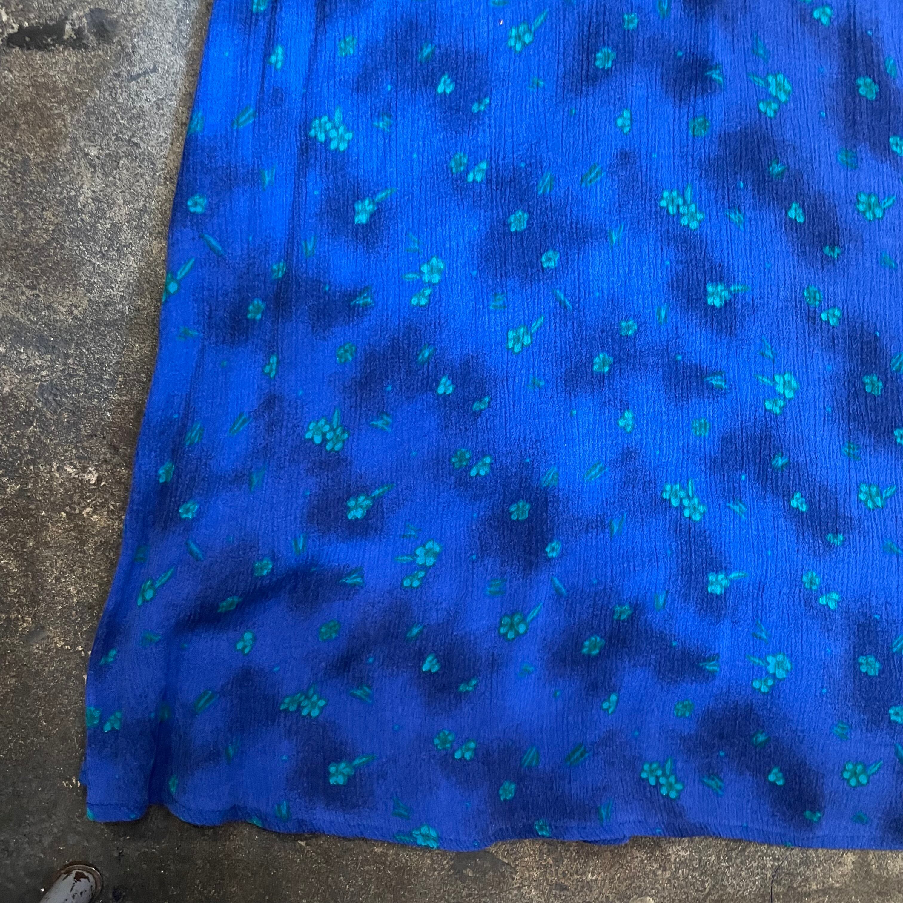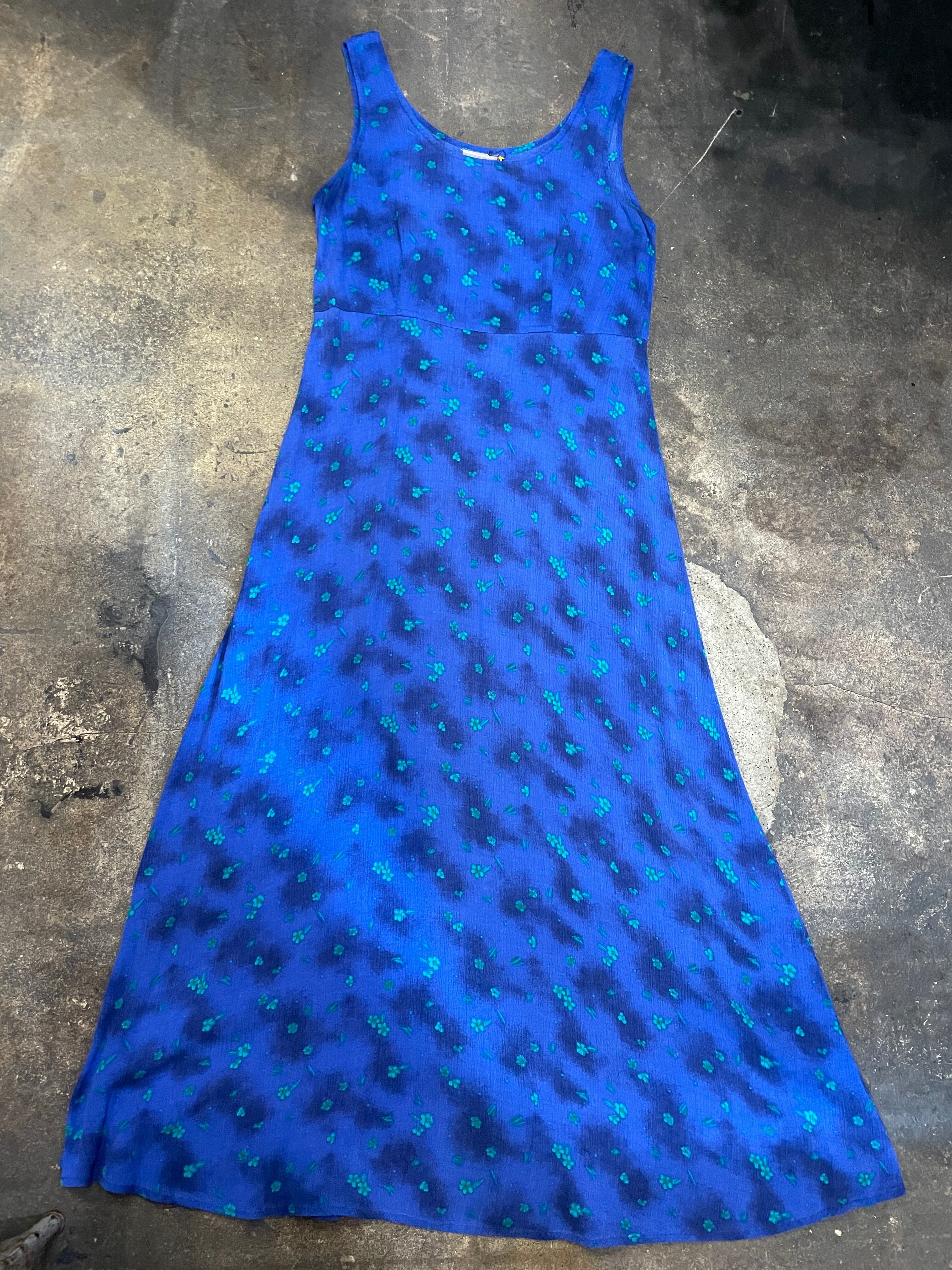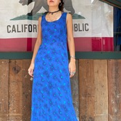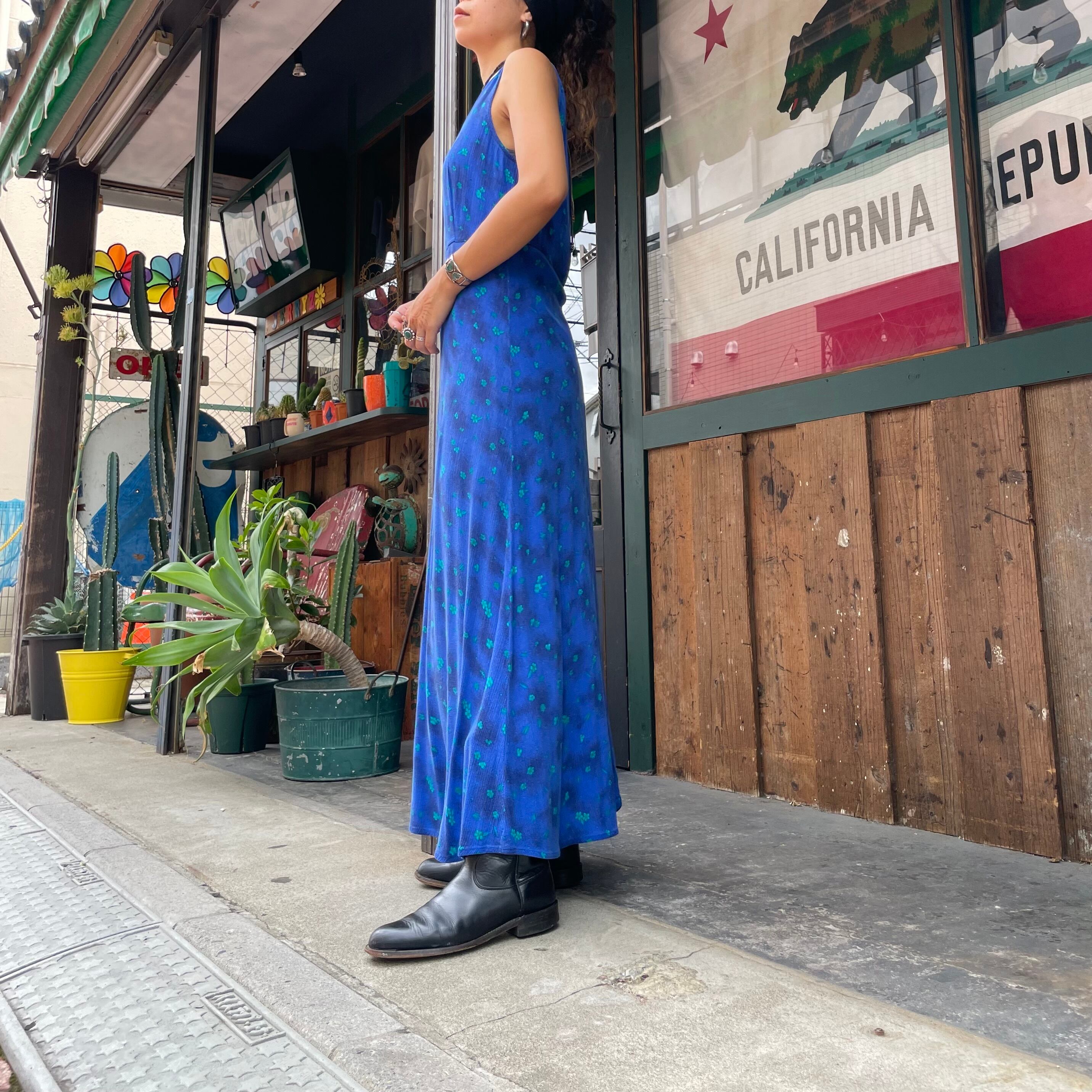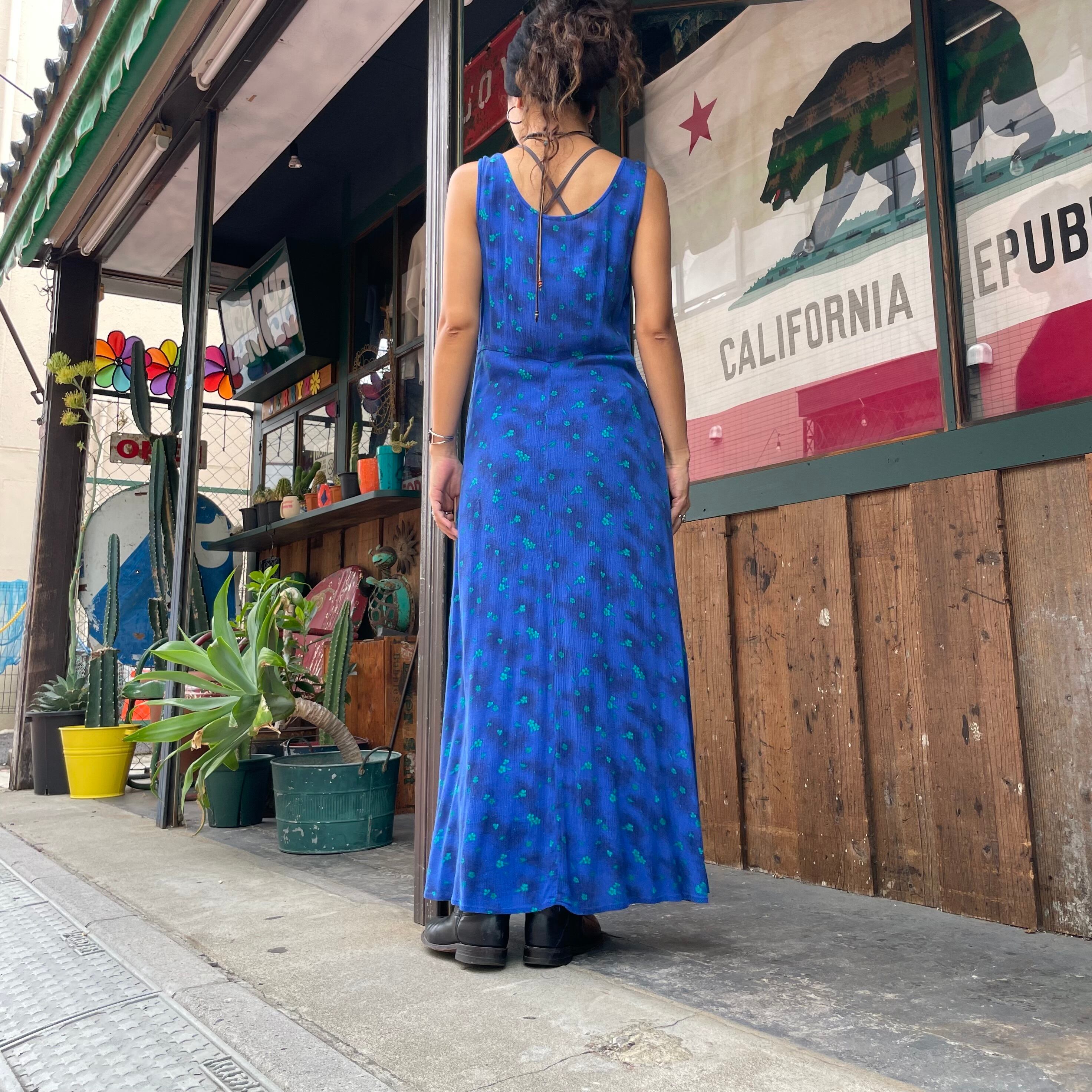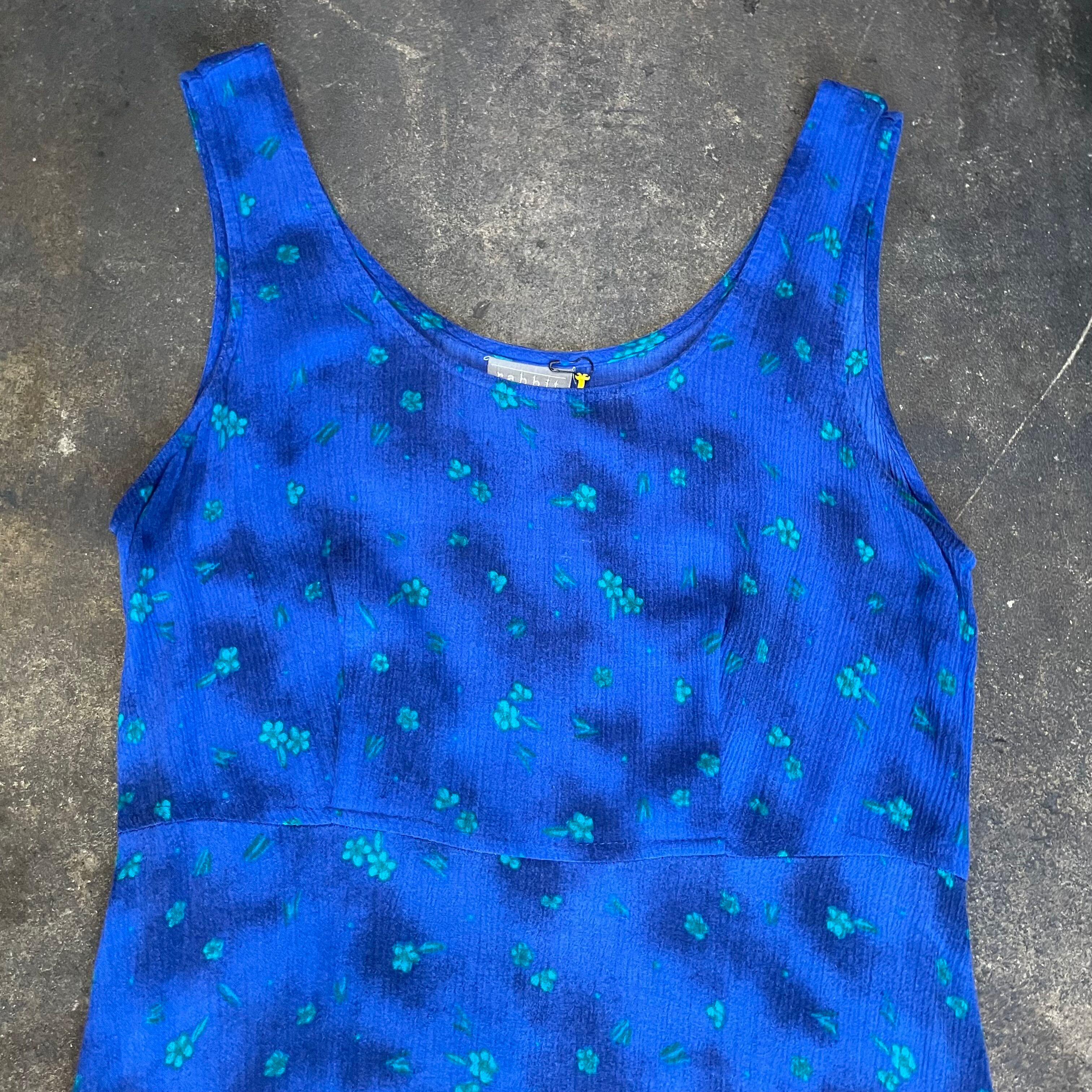 青ベースに緑の花がかわいいノースリーブのレーヨンワンピースです。