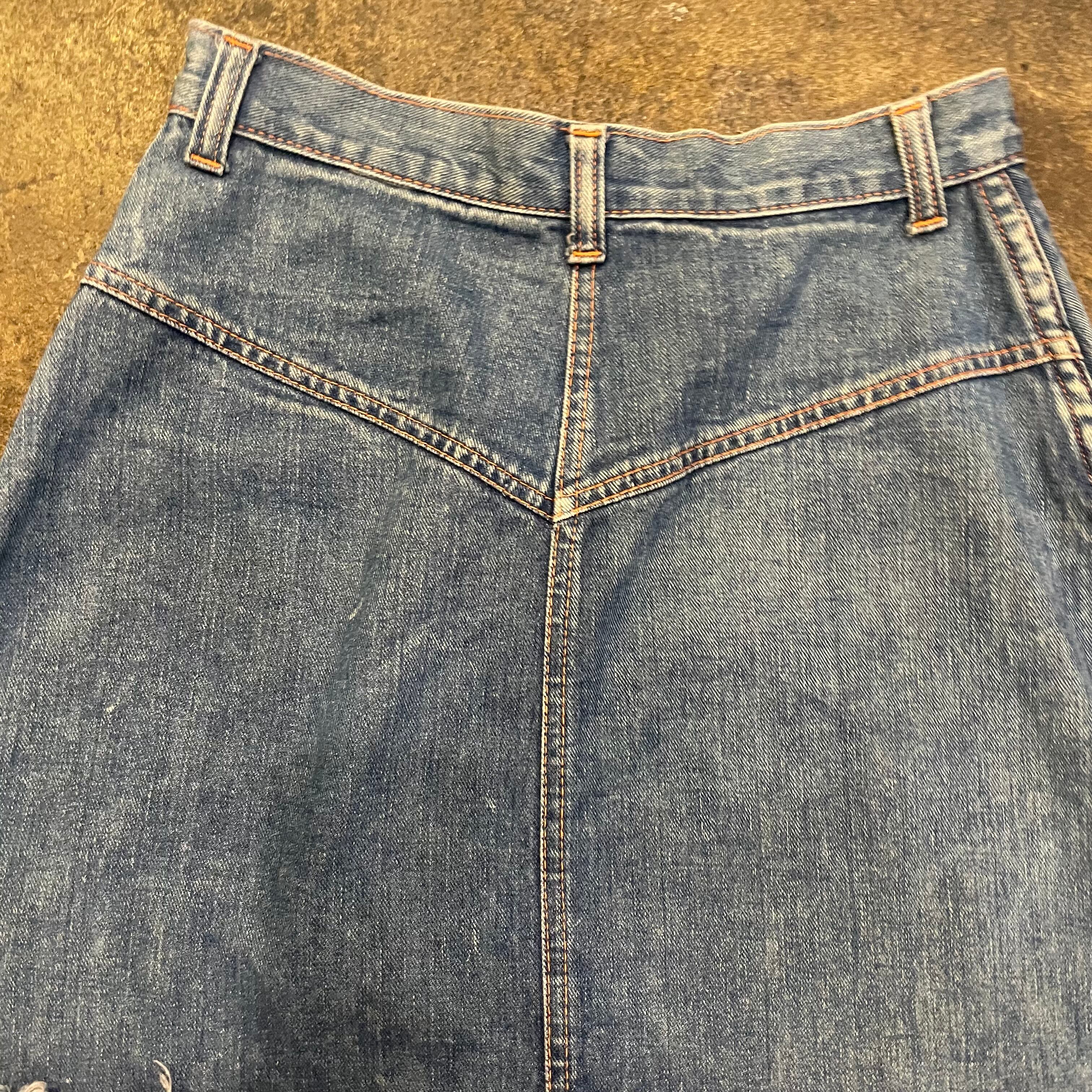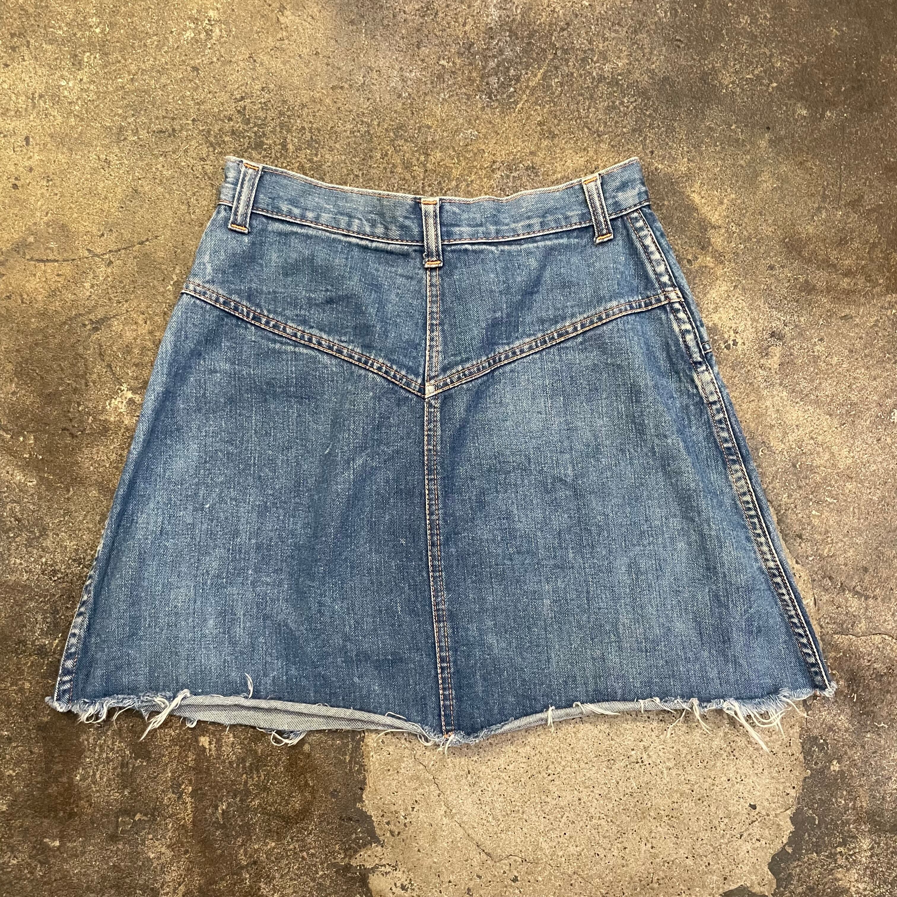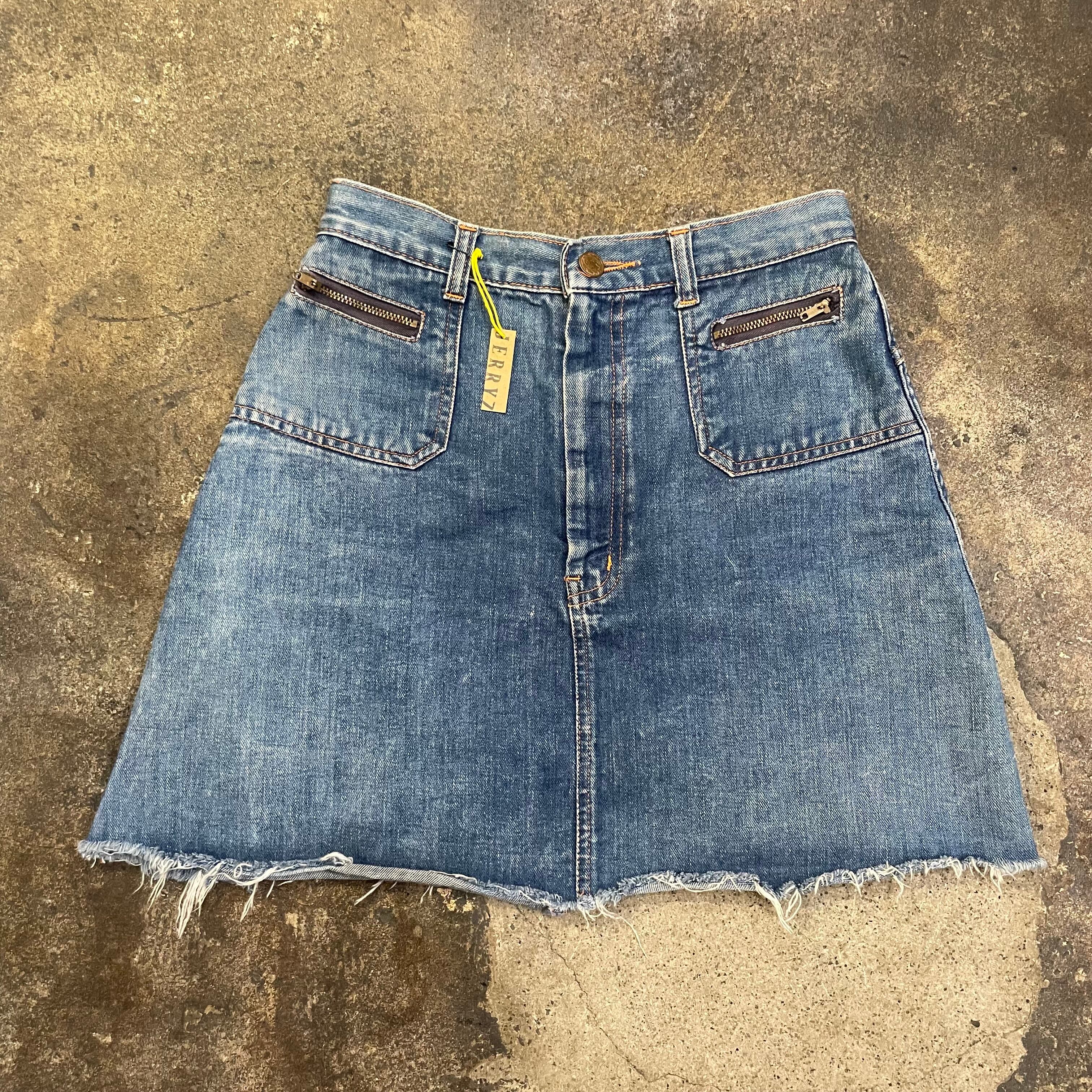 小さいポケットがかわいい70年代頃のカットオフデニムスカートです。色落ち具合も生地の柔らかさも良い感じで雰囲気のある一枚だと思います。