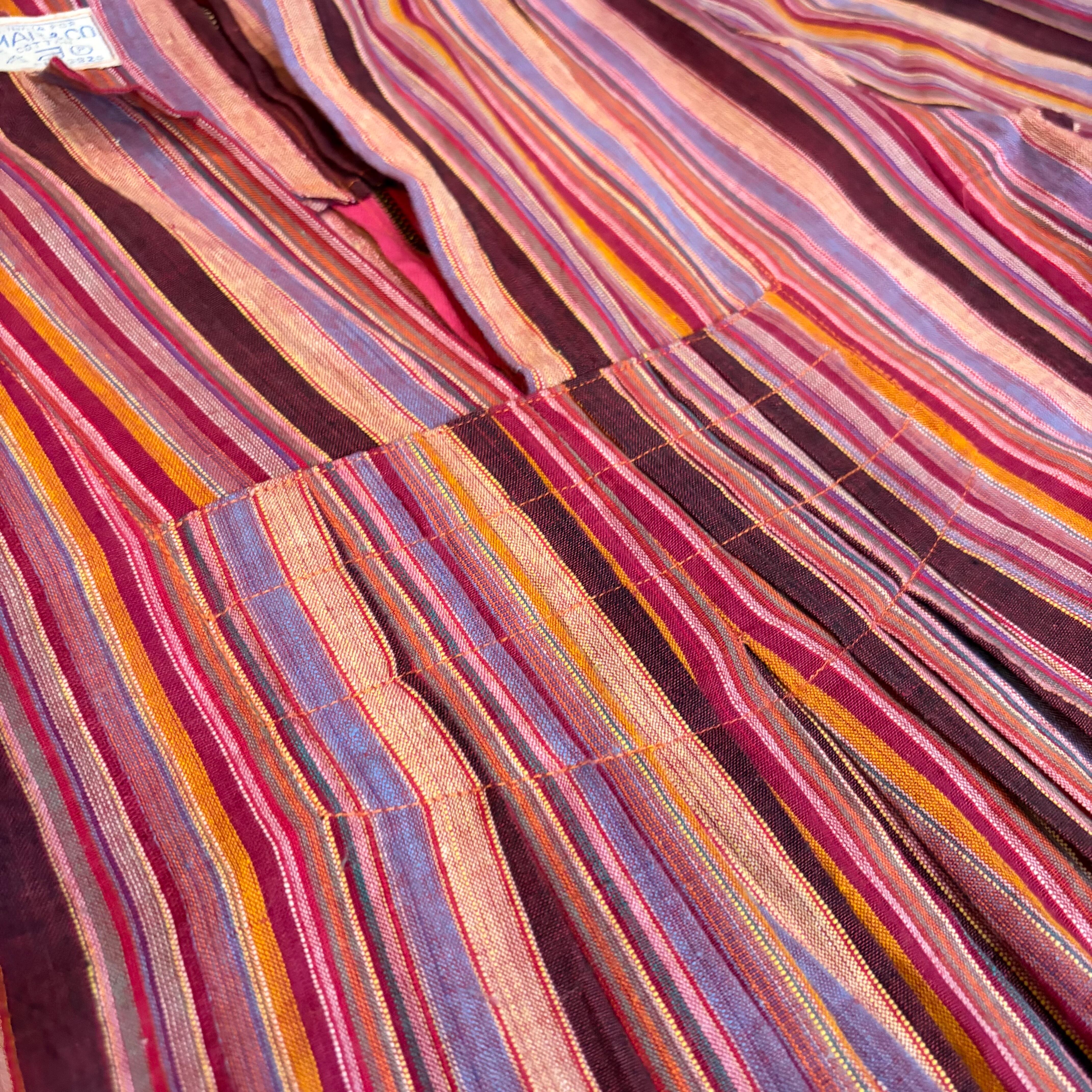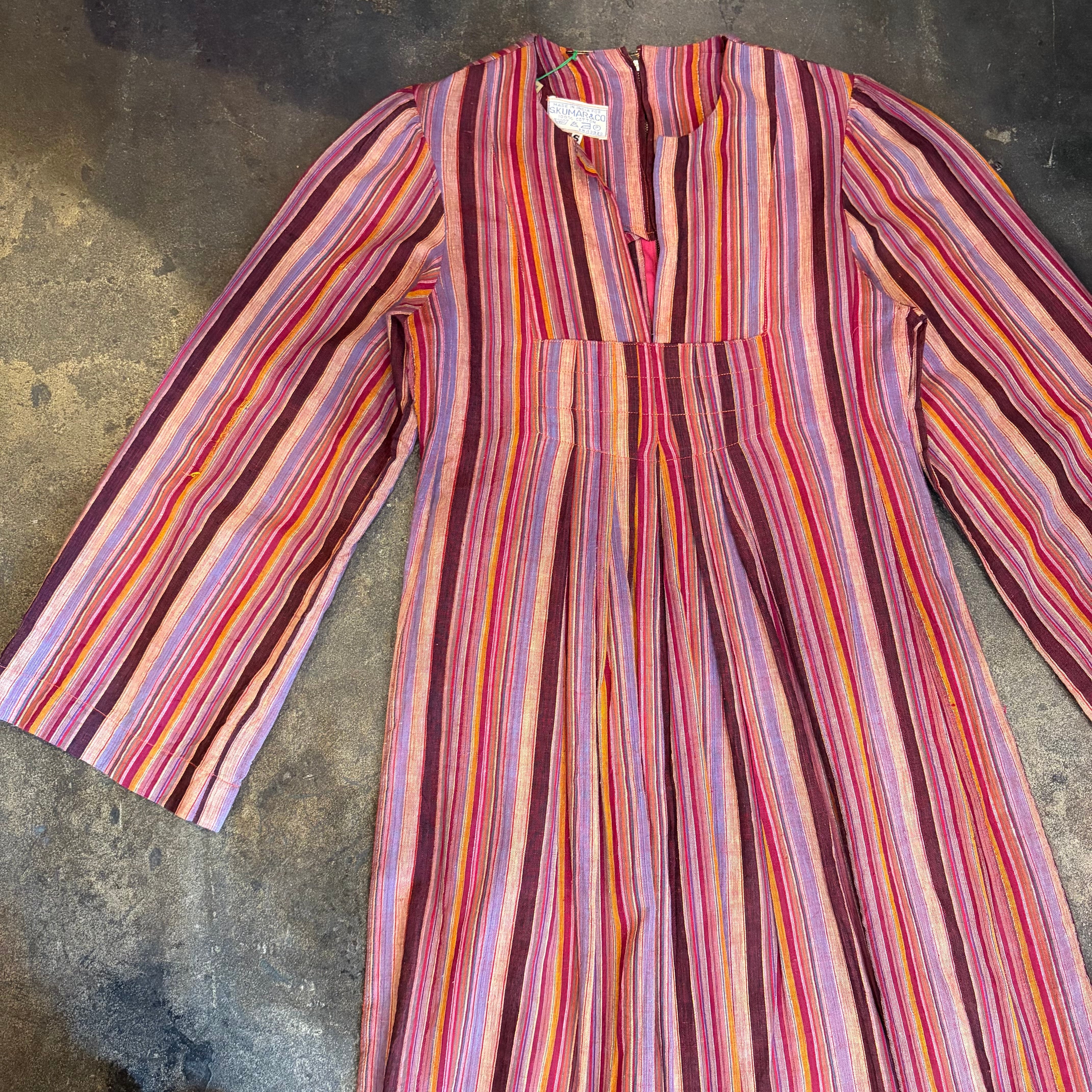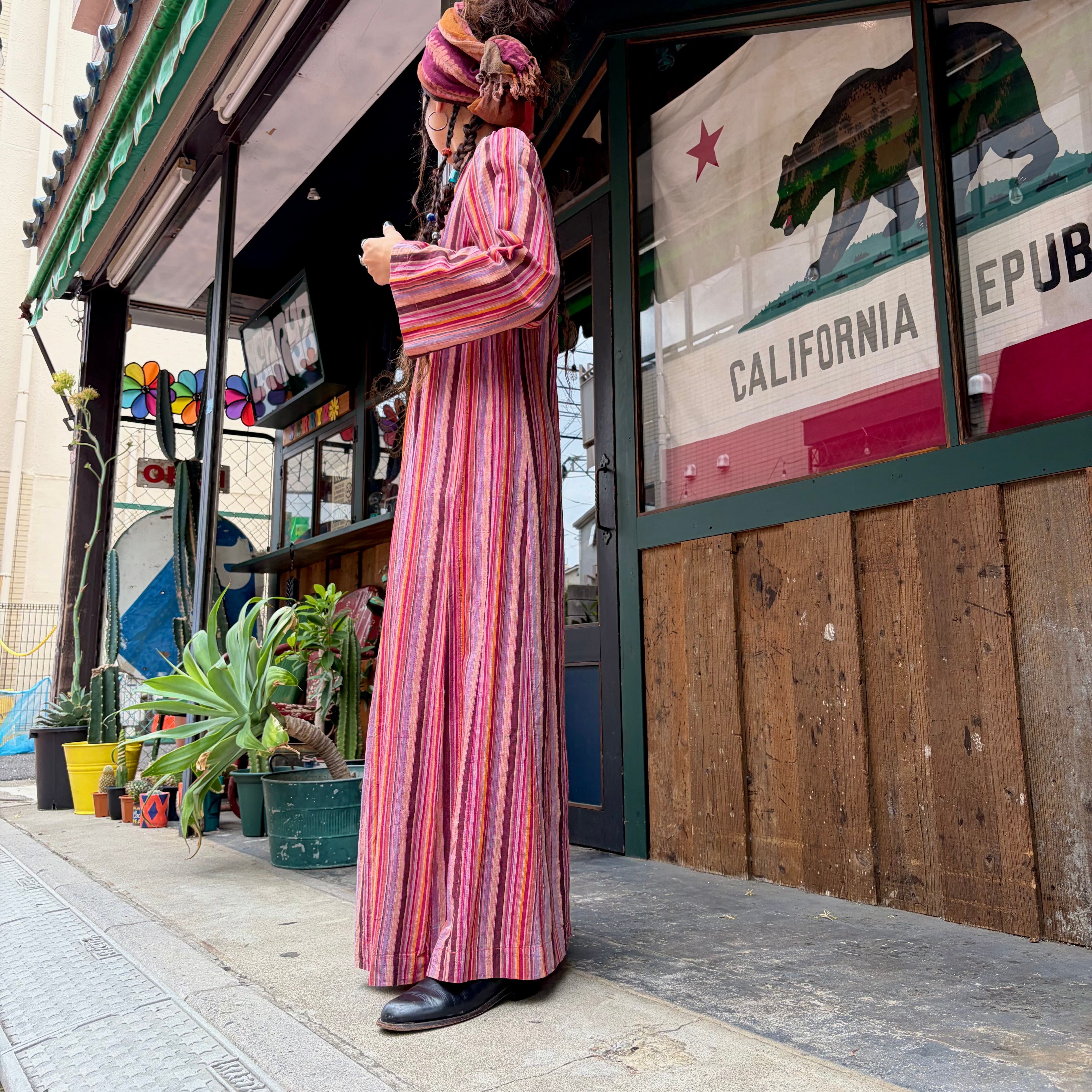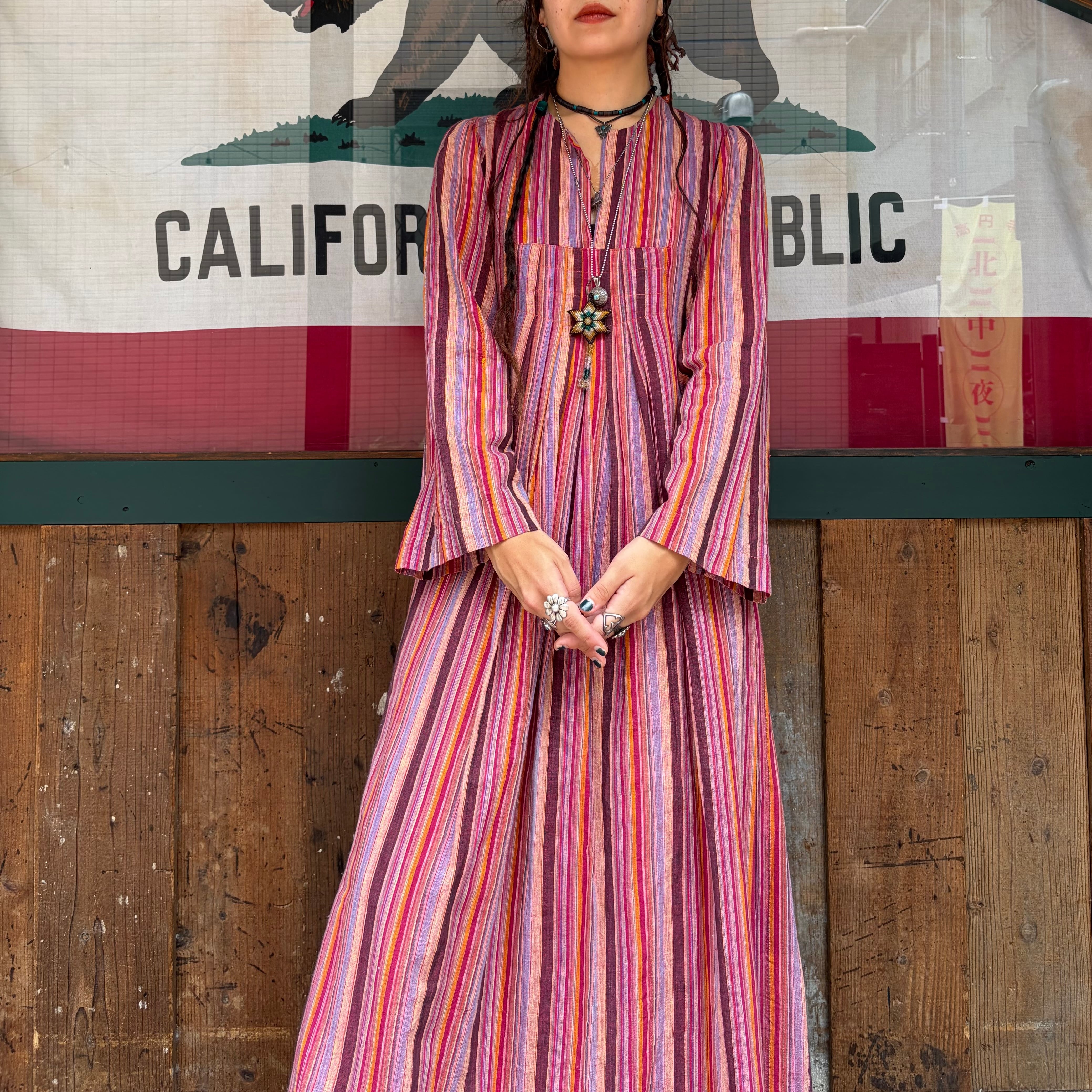 暖色系の中にターコイズカラーがちらっと入っているランダムなストライプがとても素敵なワンピースです。