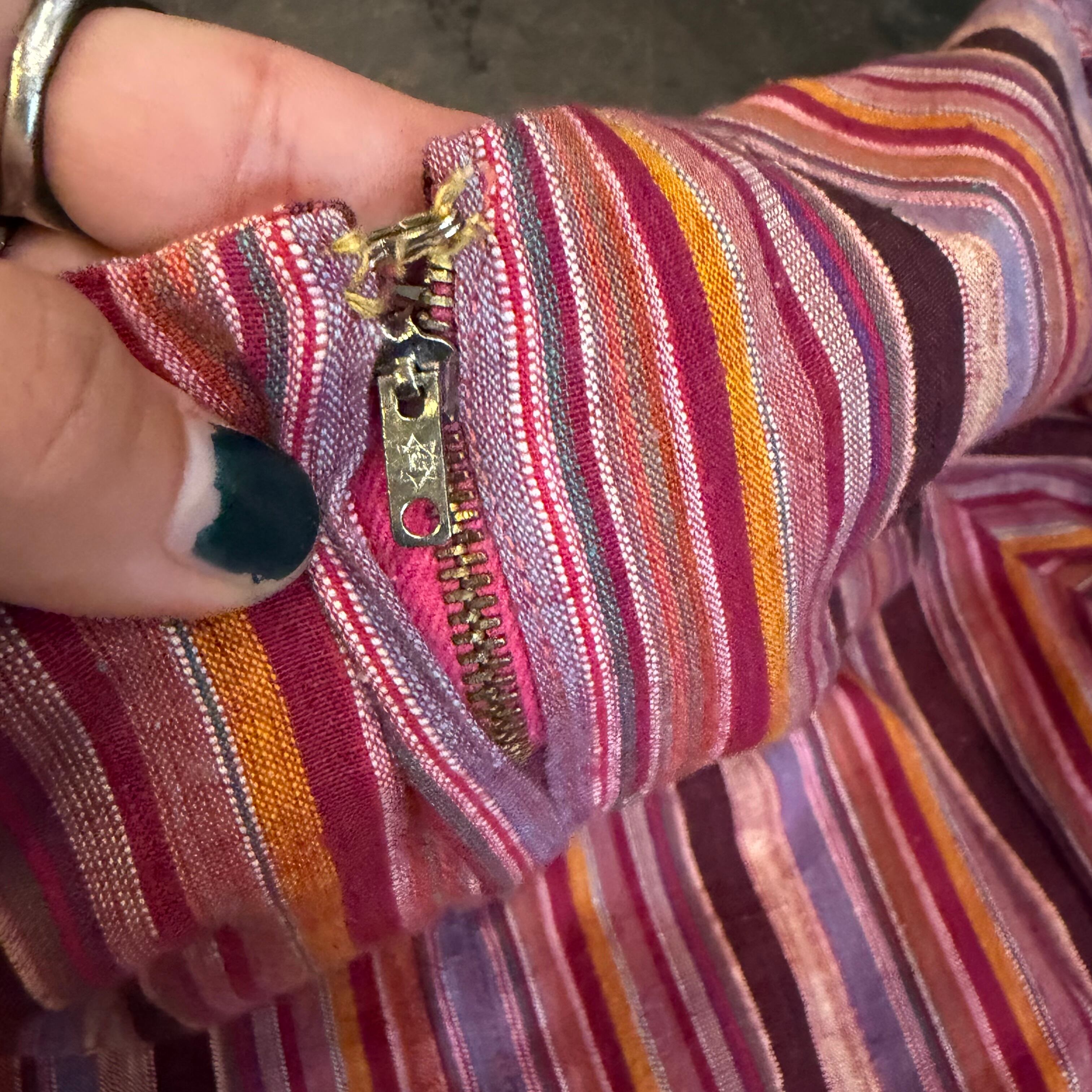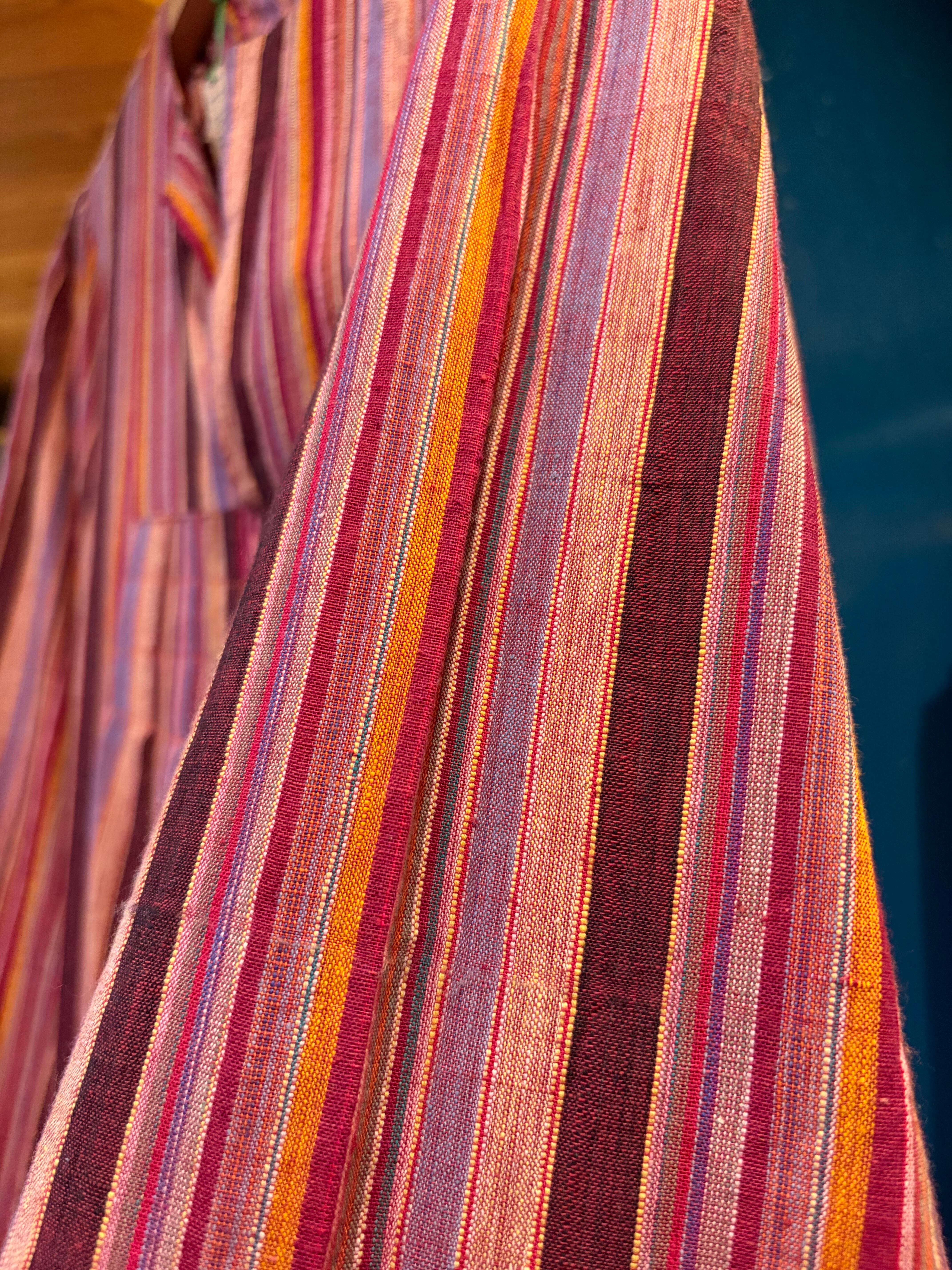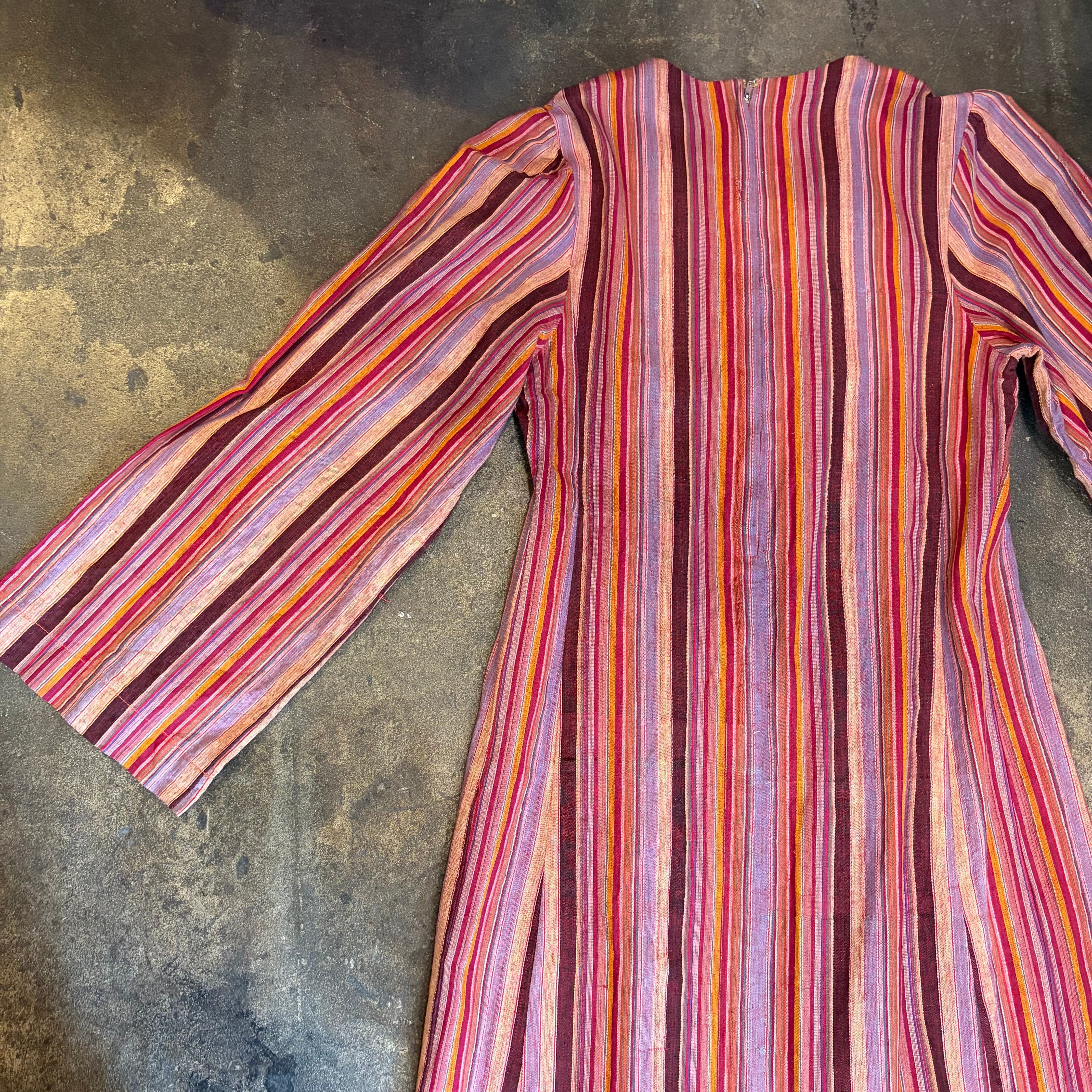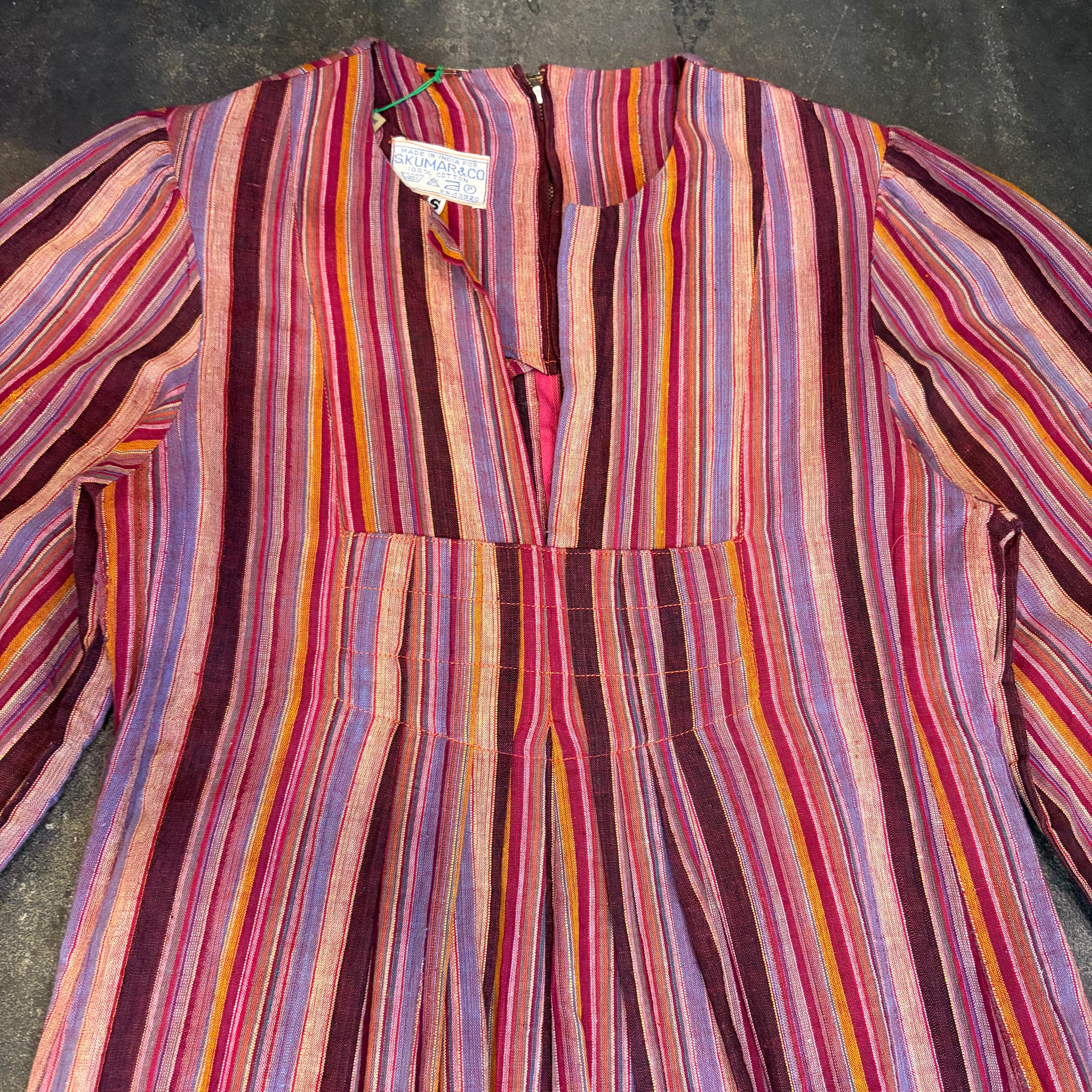 暖色系の中にターコイズカラーがちらっと入っているランダムなストライプがとても素敵なワンピースです。