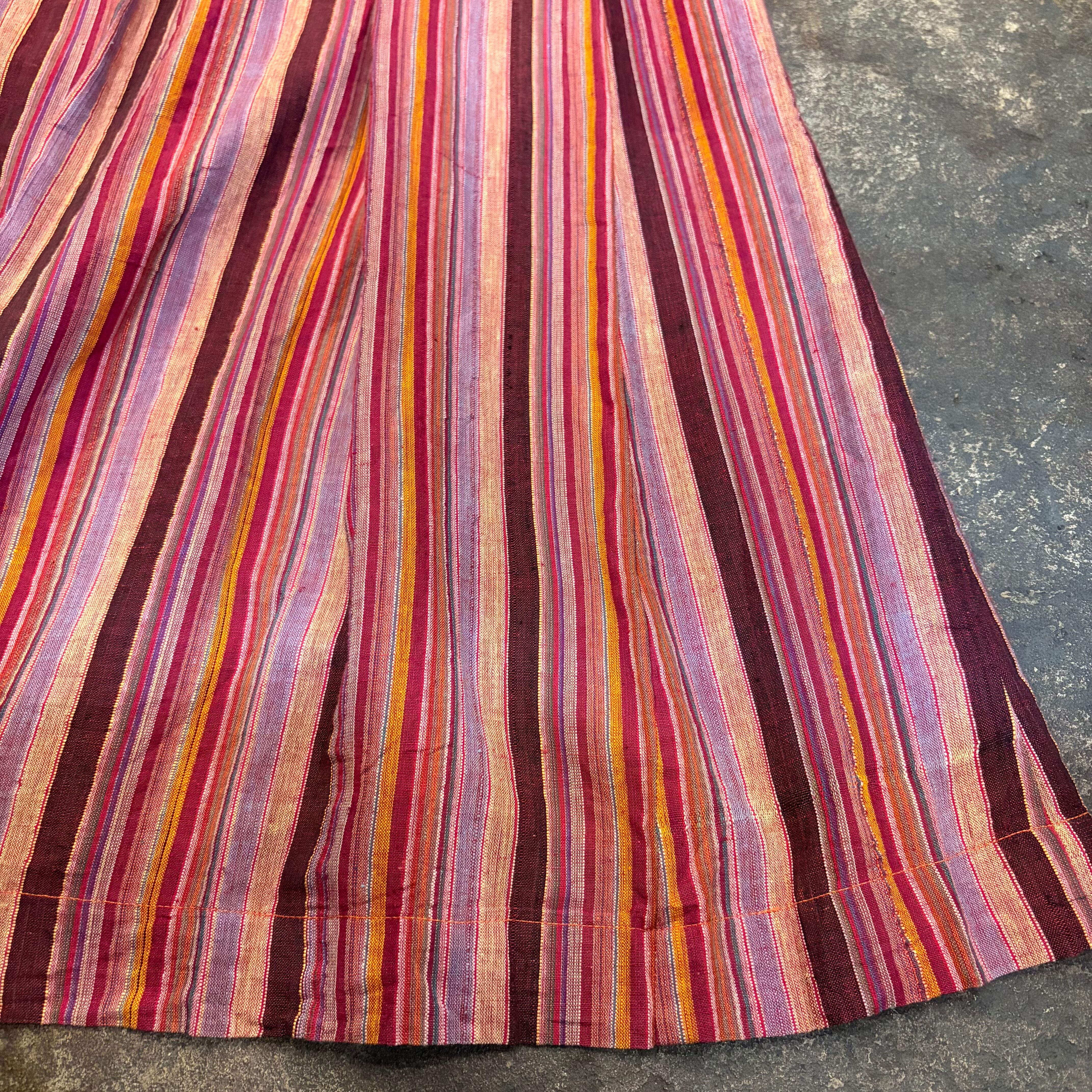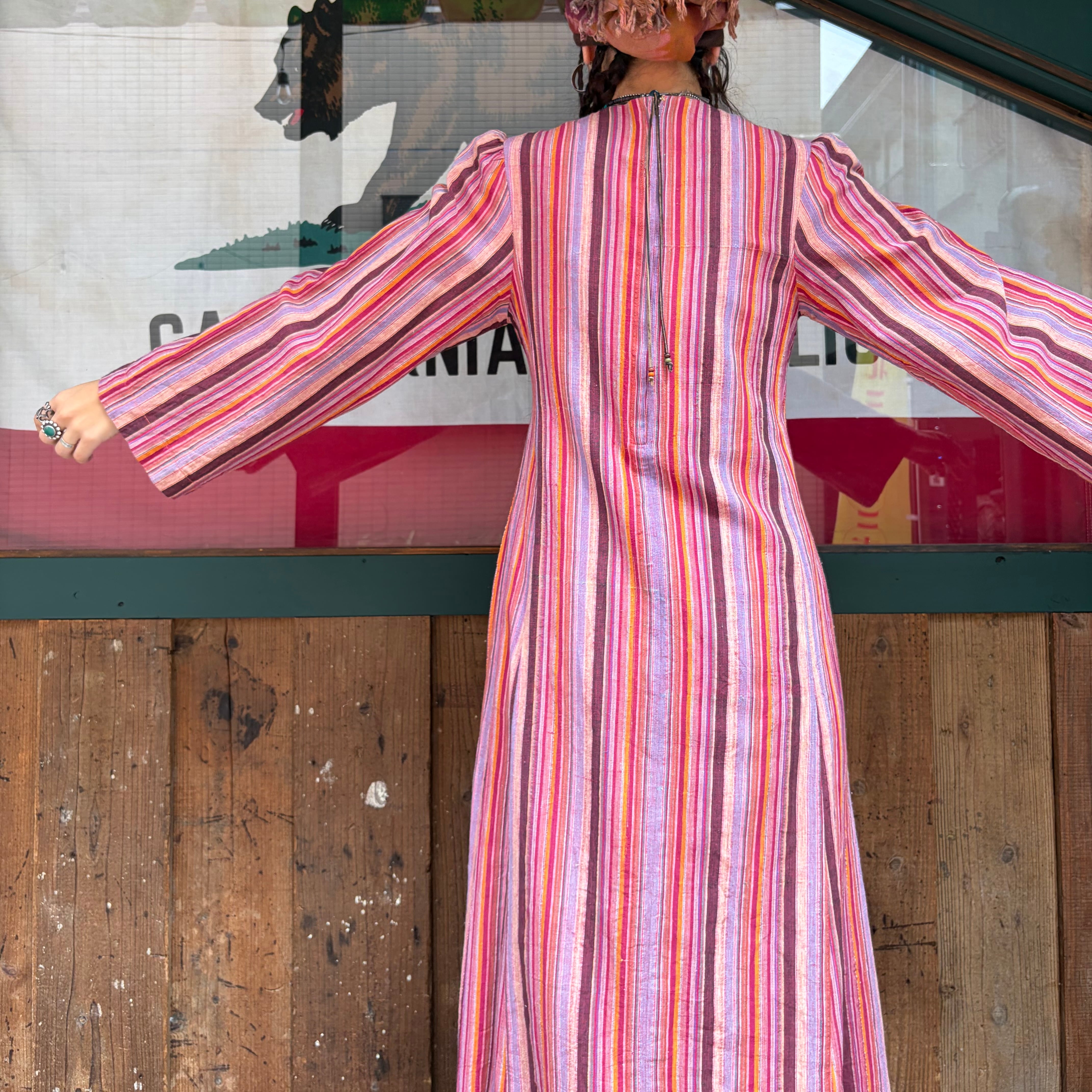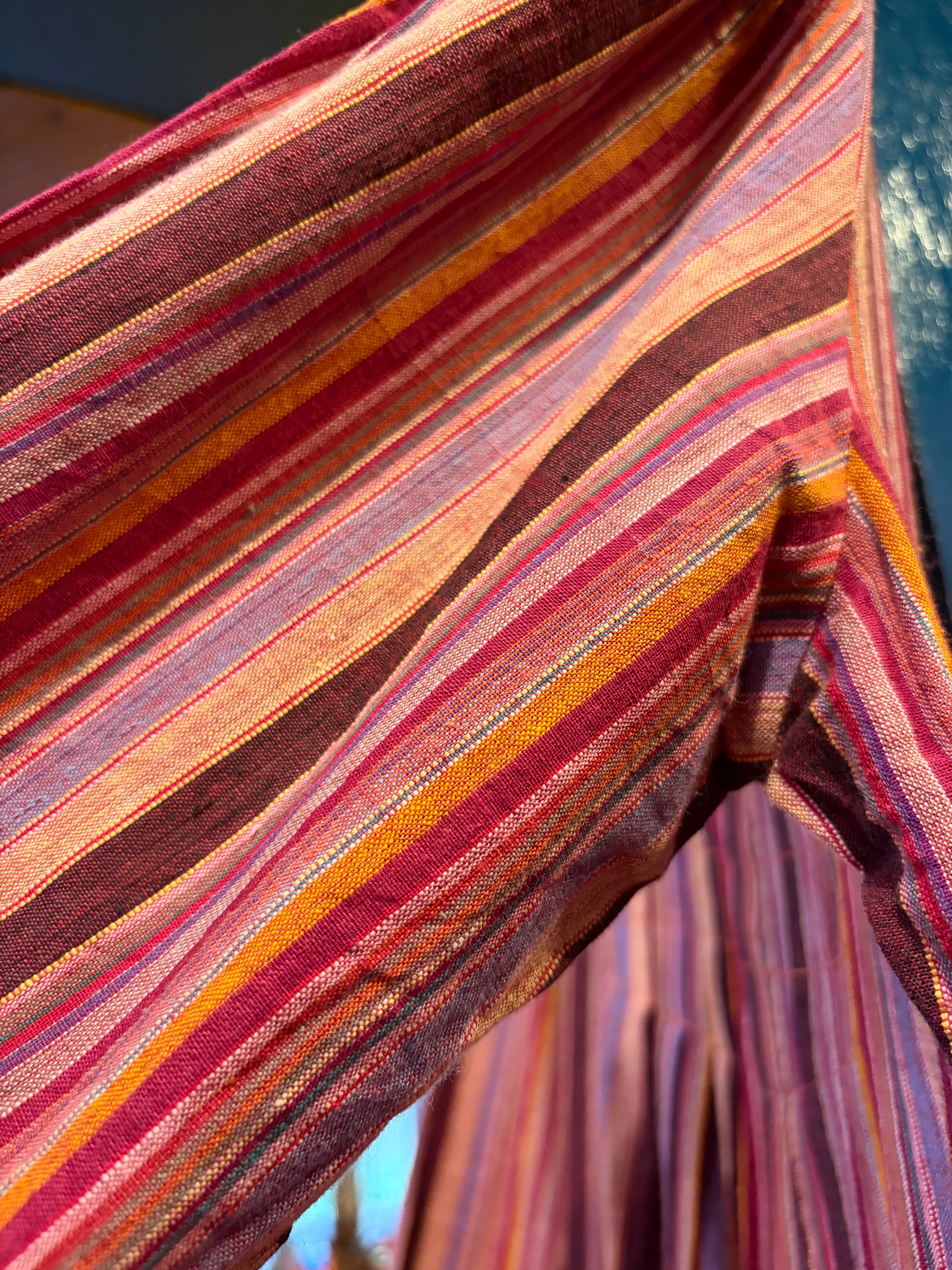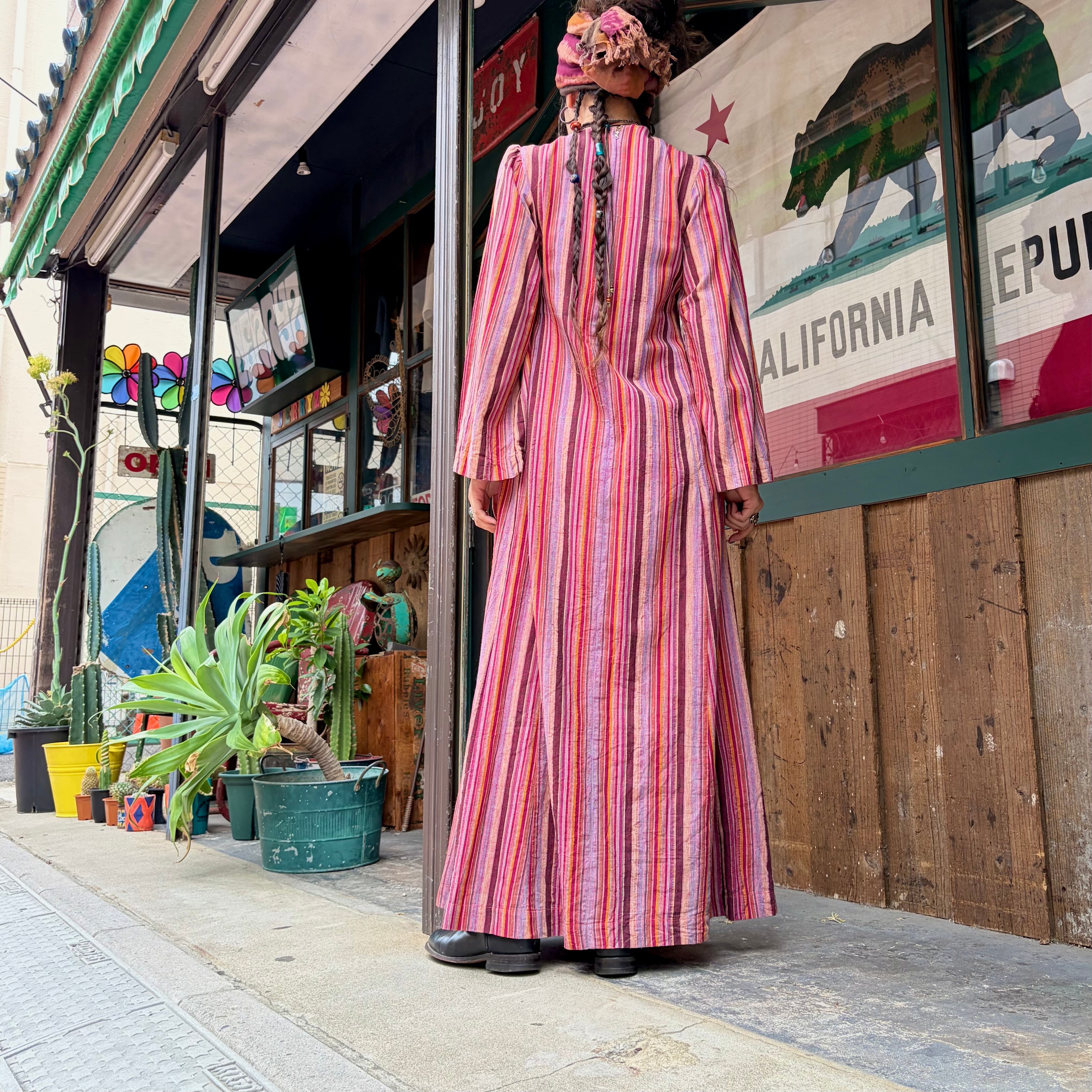 暖色系の中にターコイズカラーがちらっと入っているランダムなストライプがとても素敵なワンピースです。