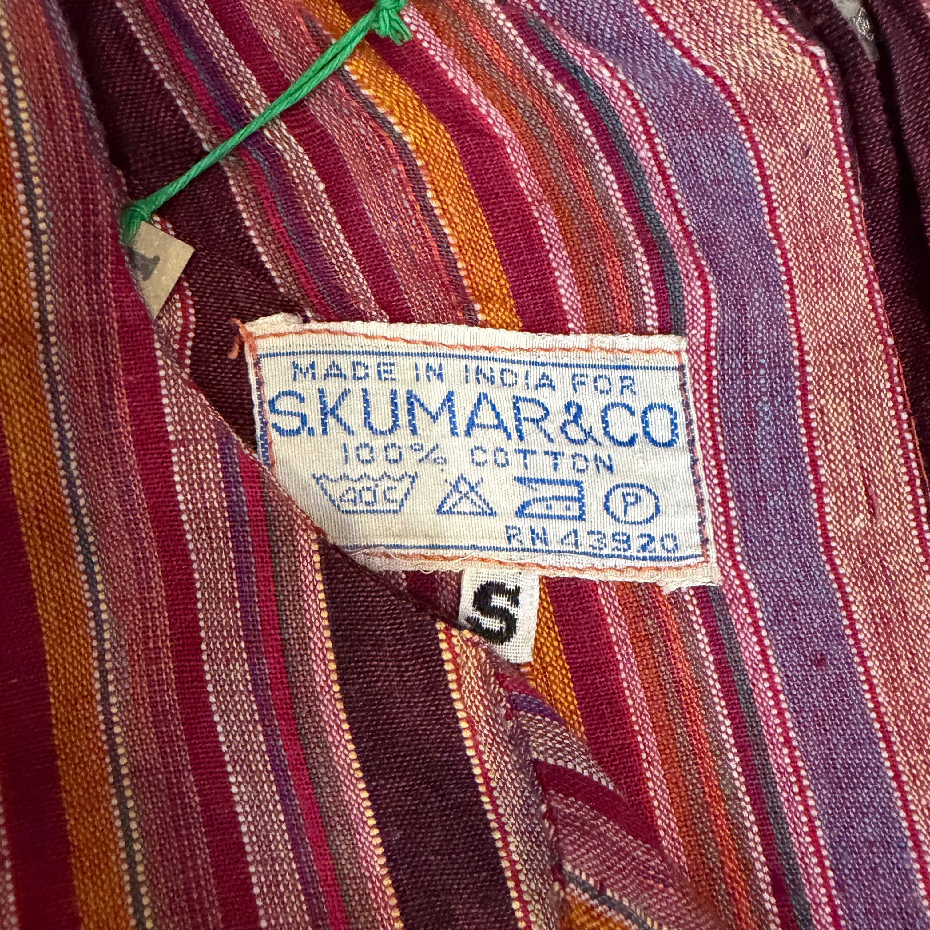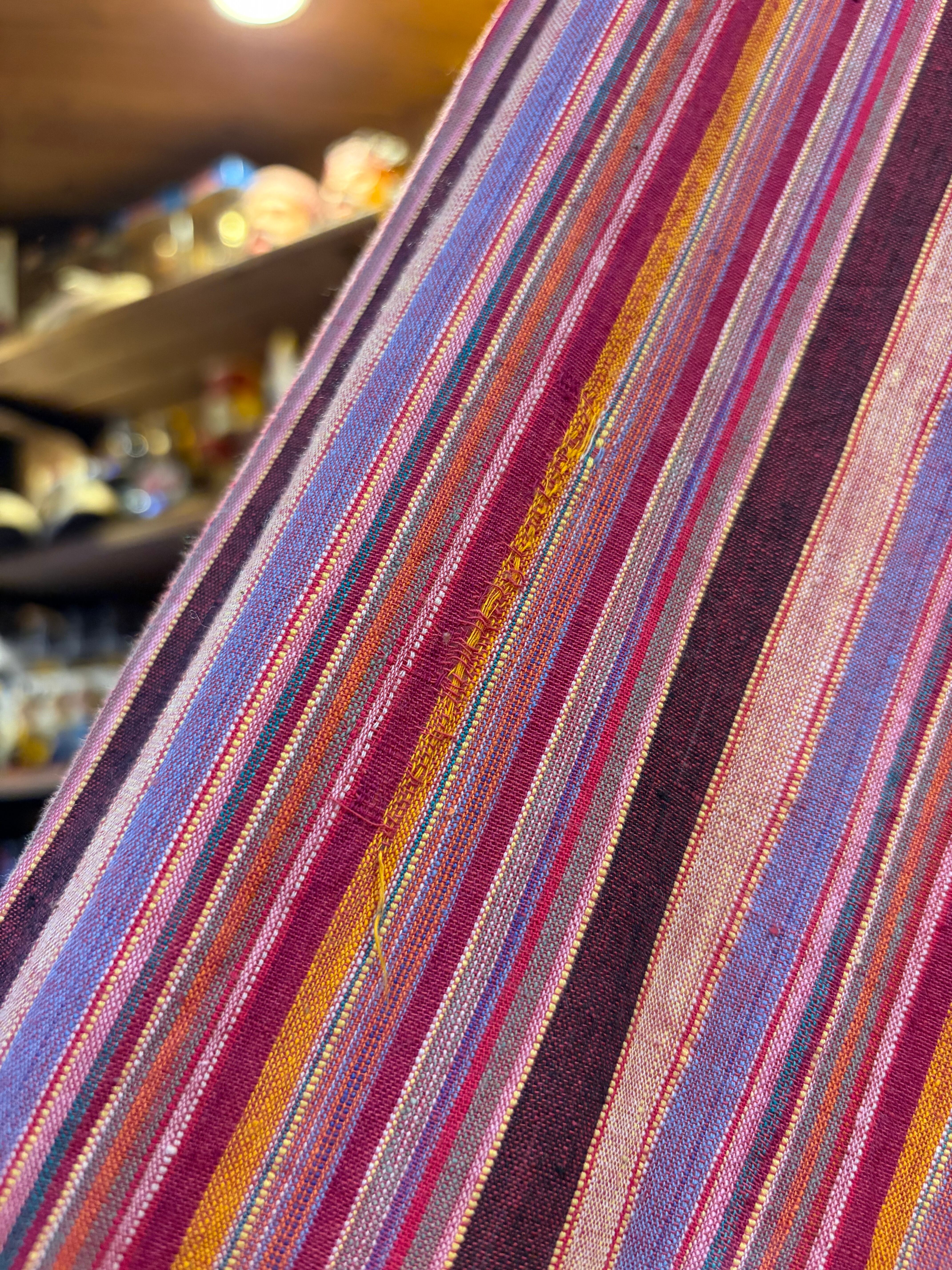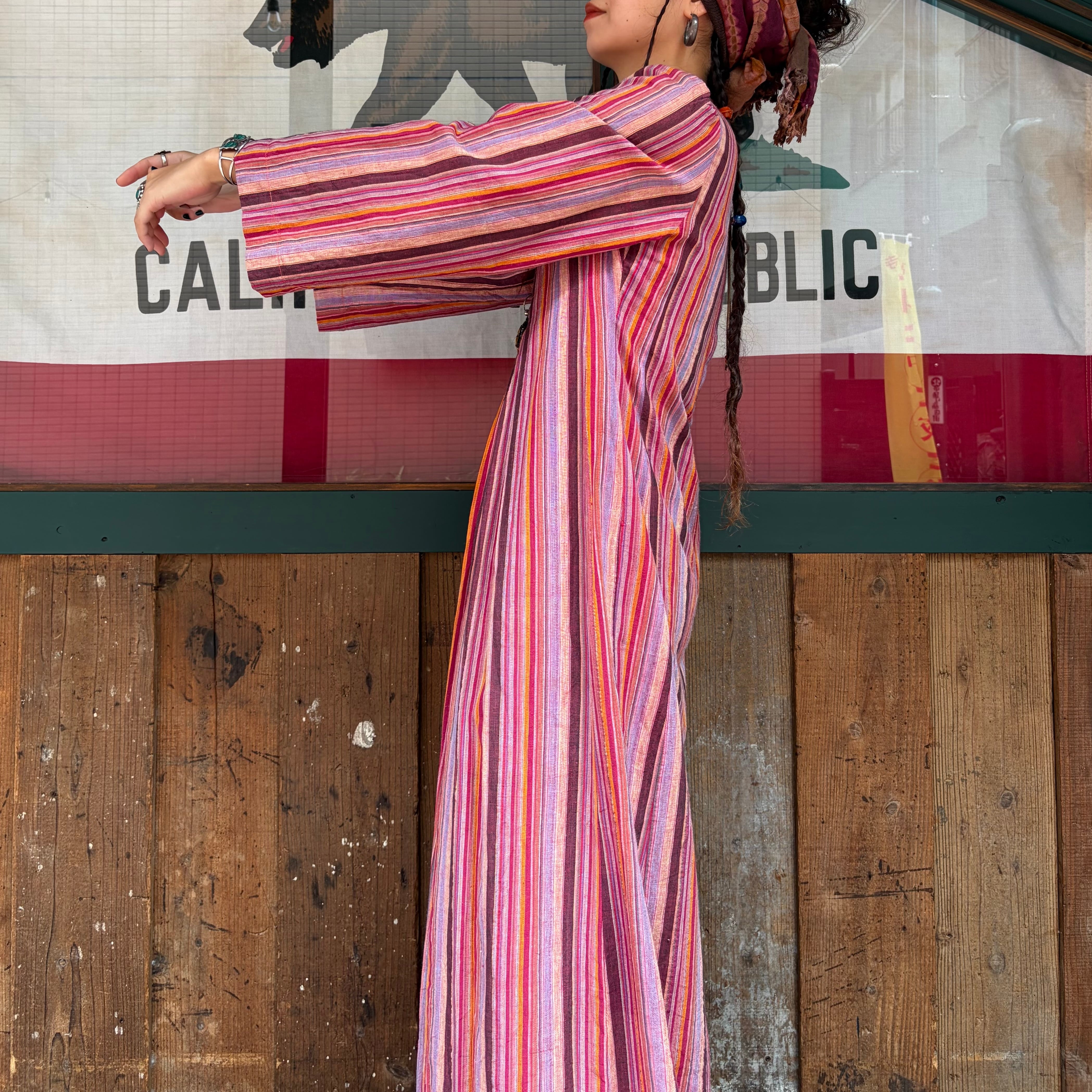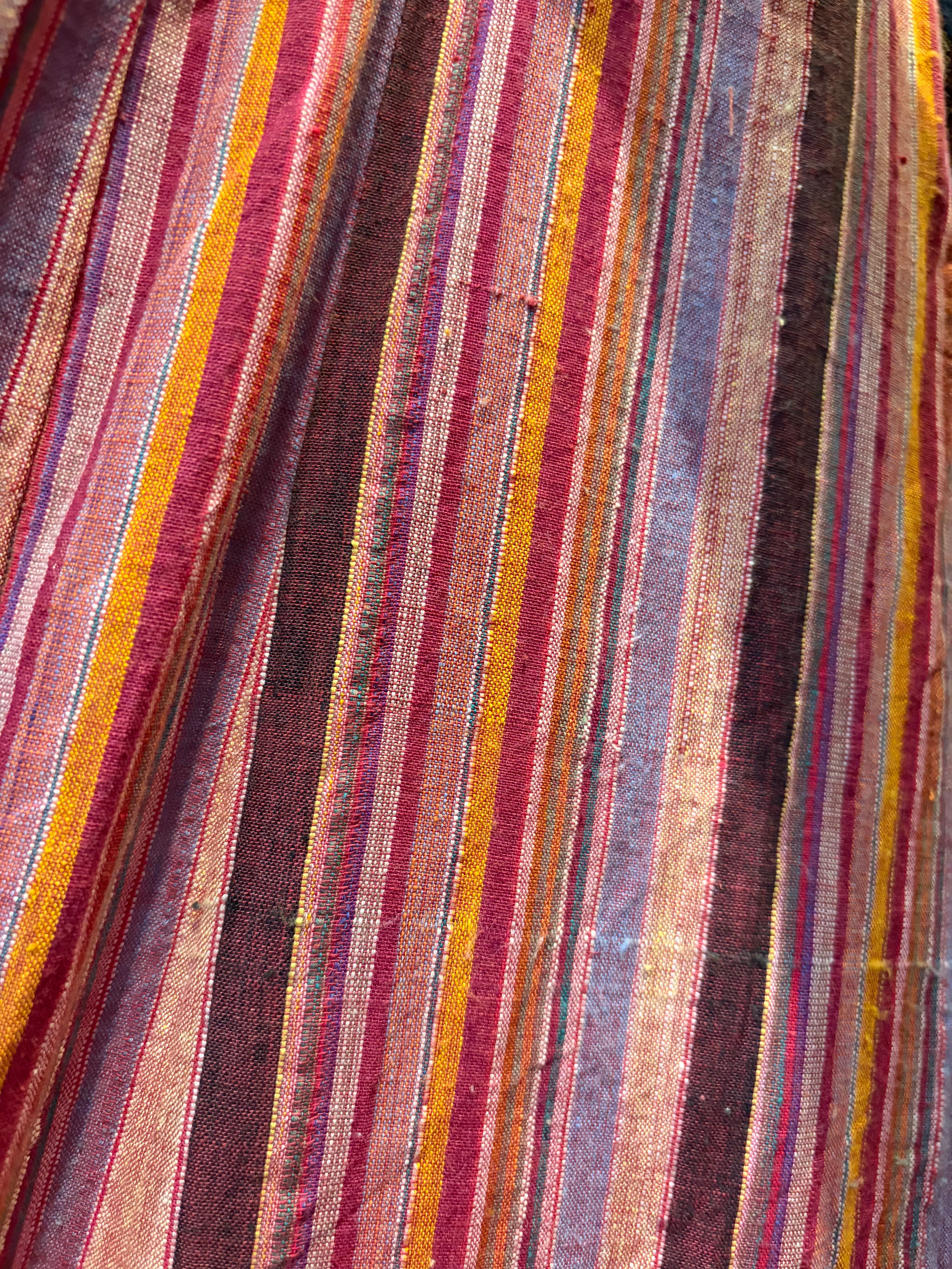 暖色系の中にターコイズカラーがちらっと入っているランダムなストライプがとても素敵なワンピースです。