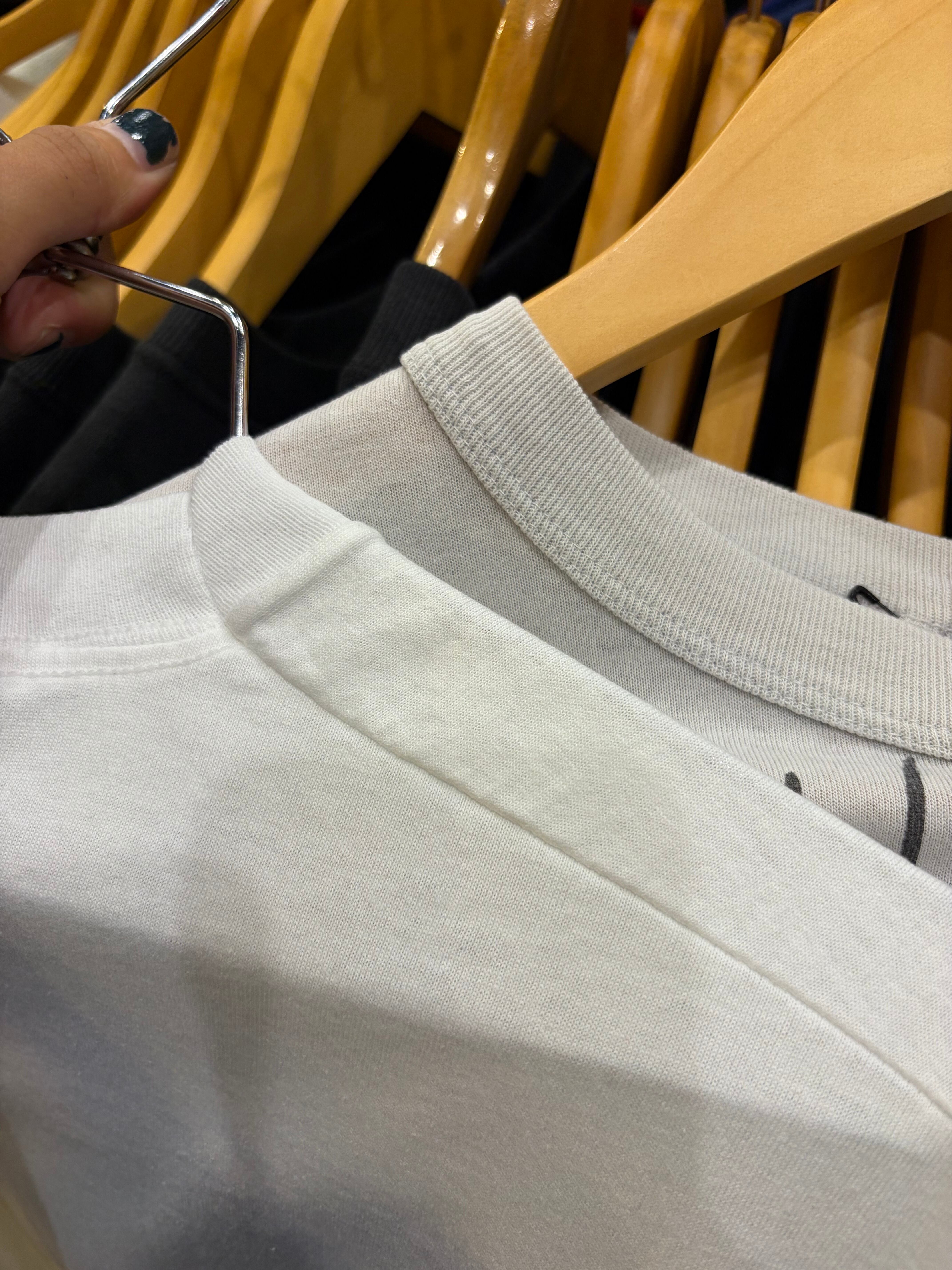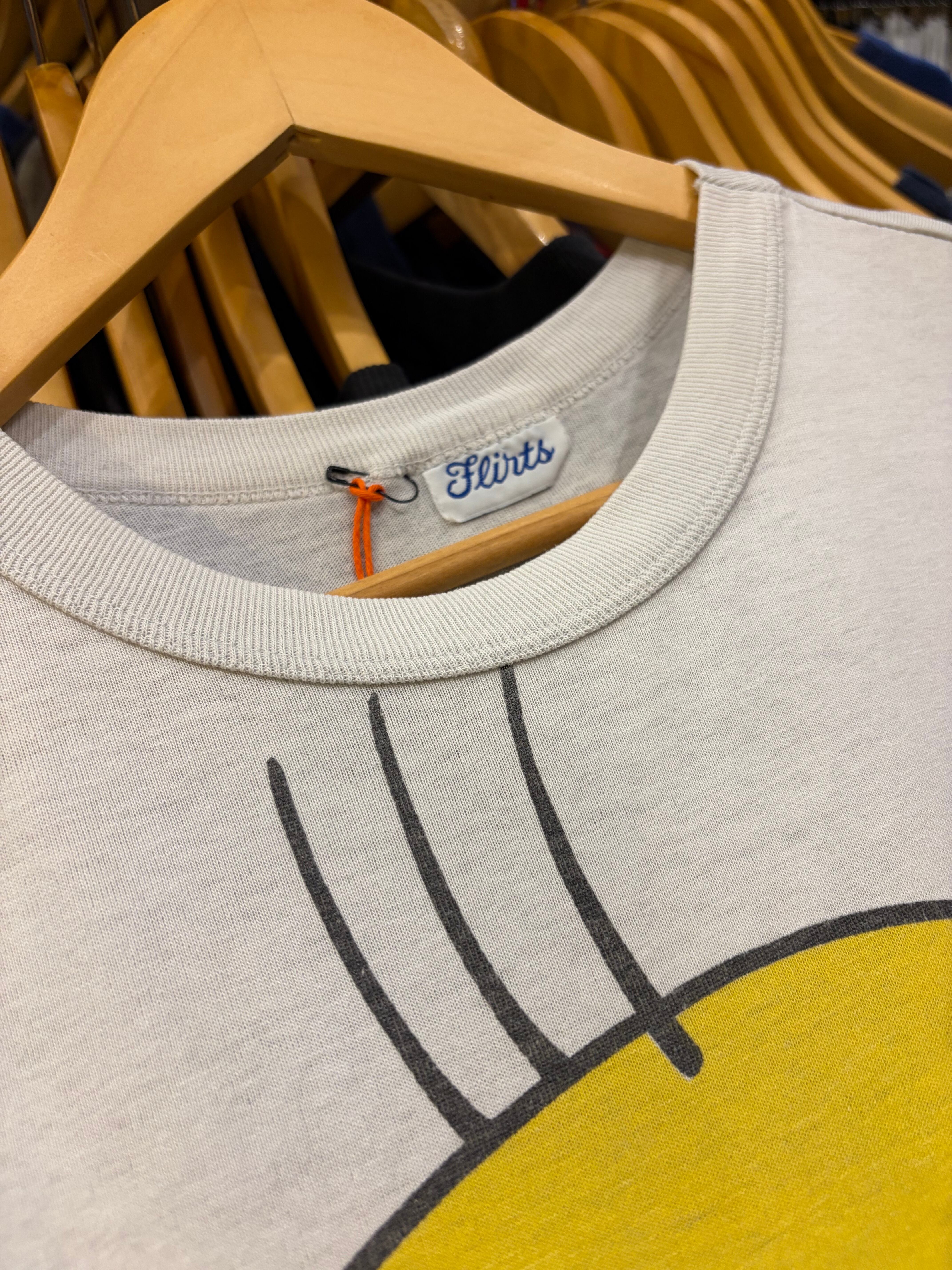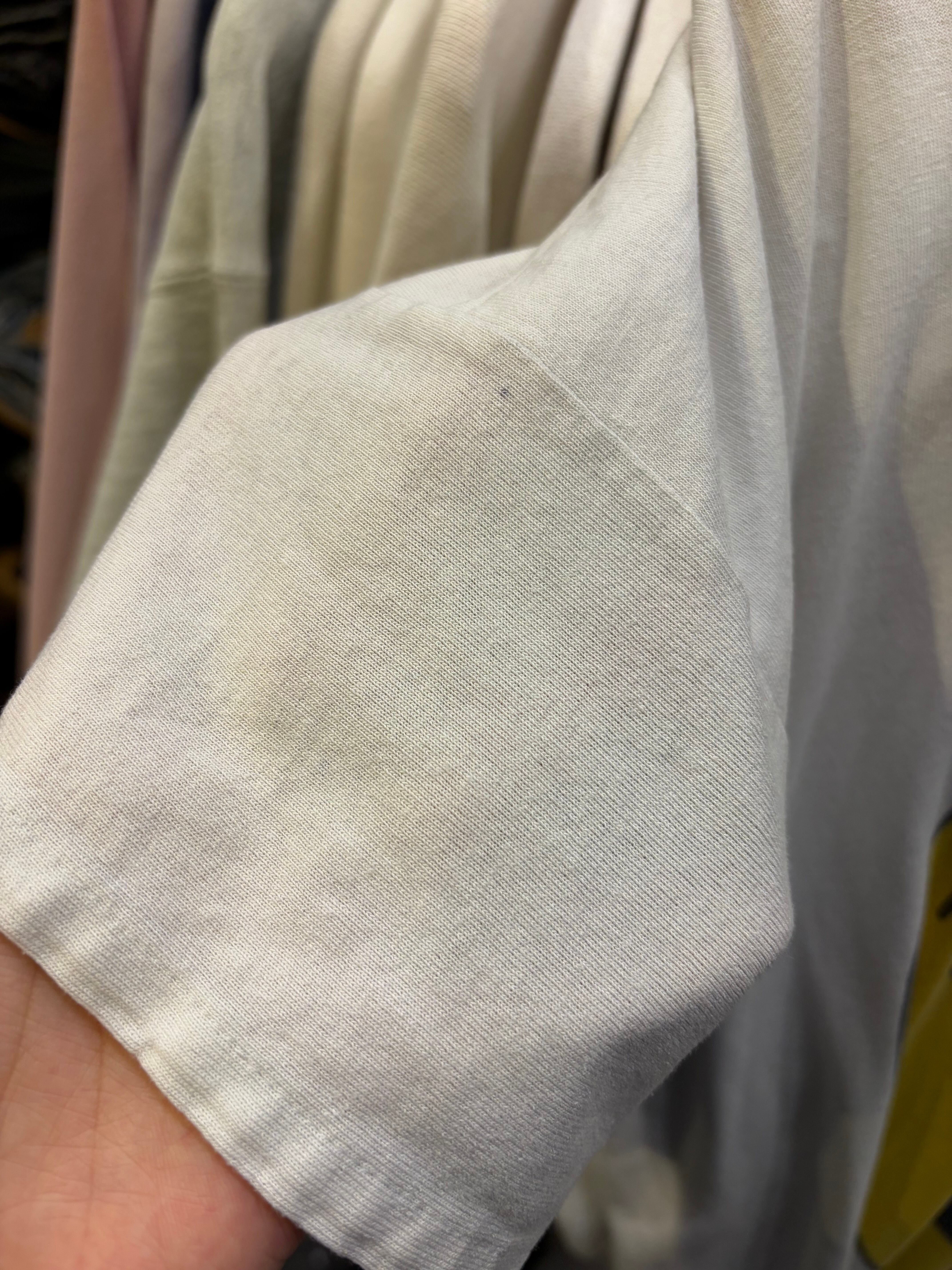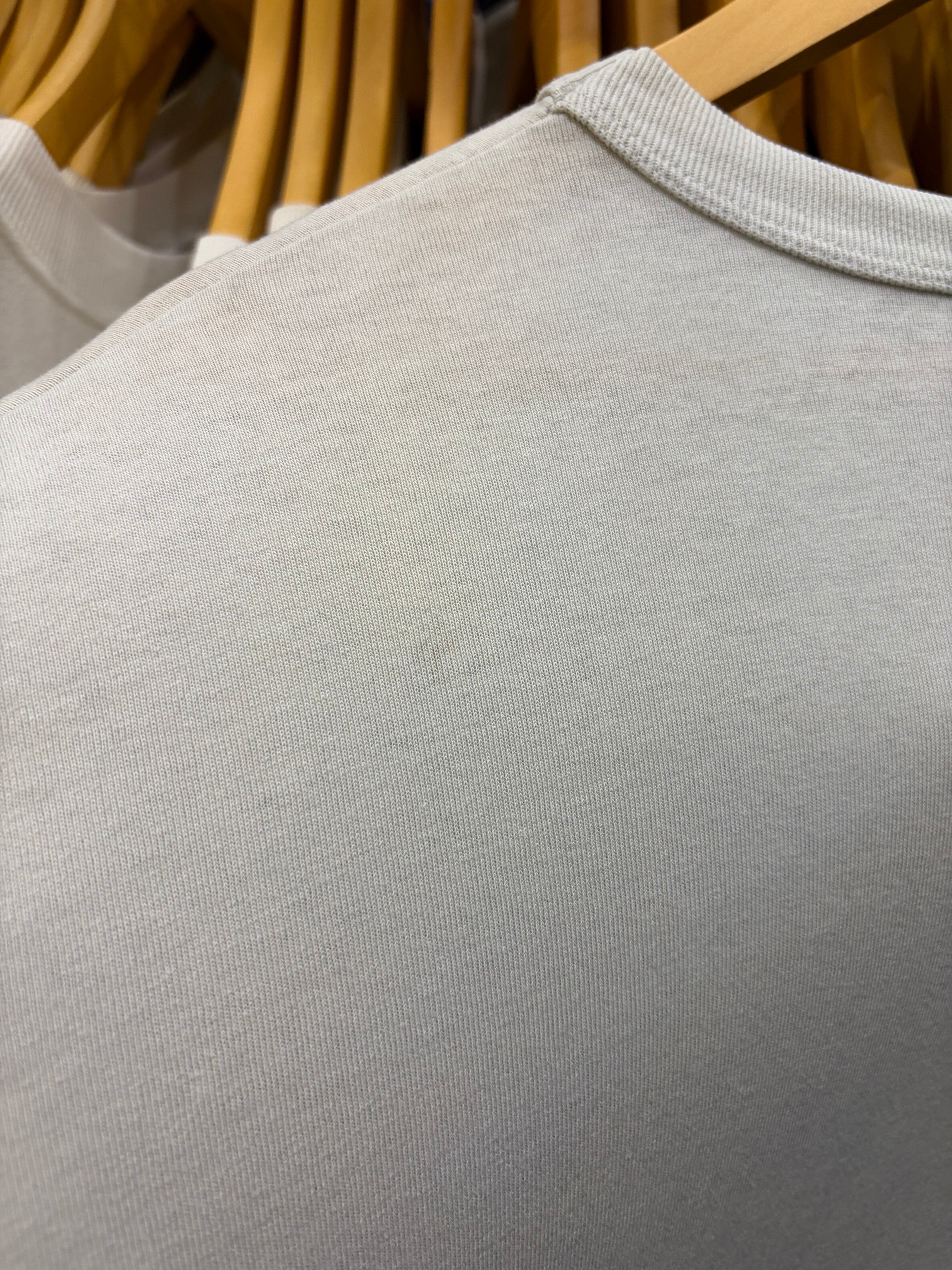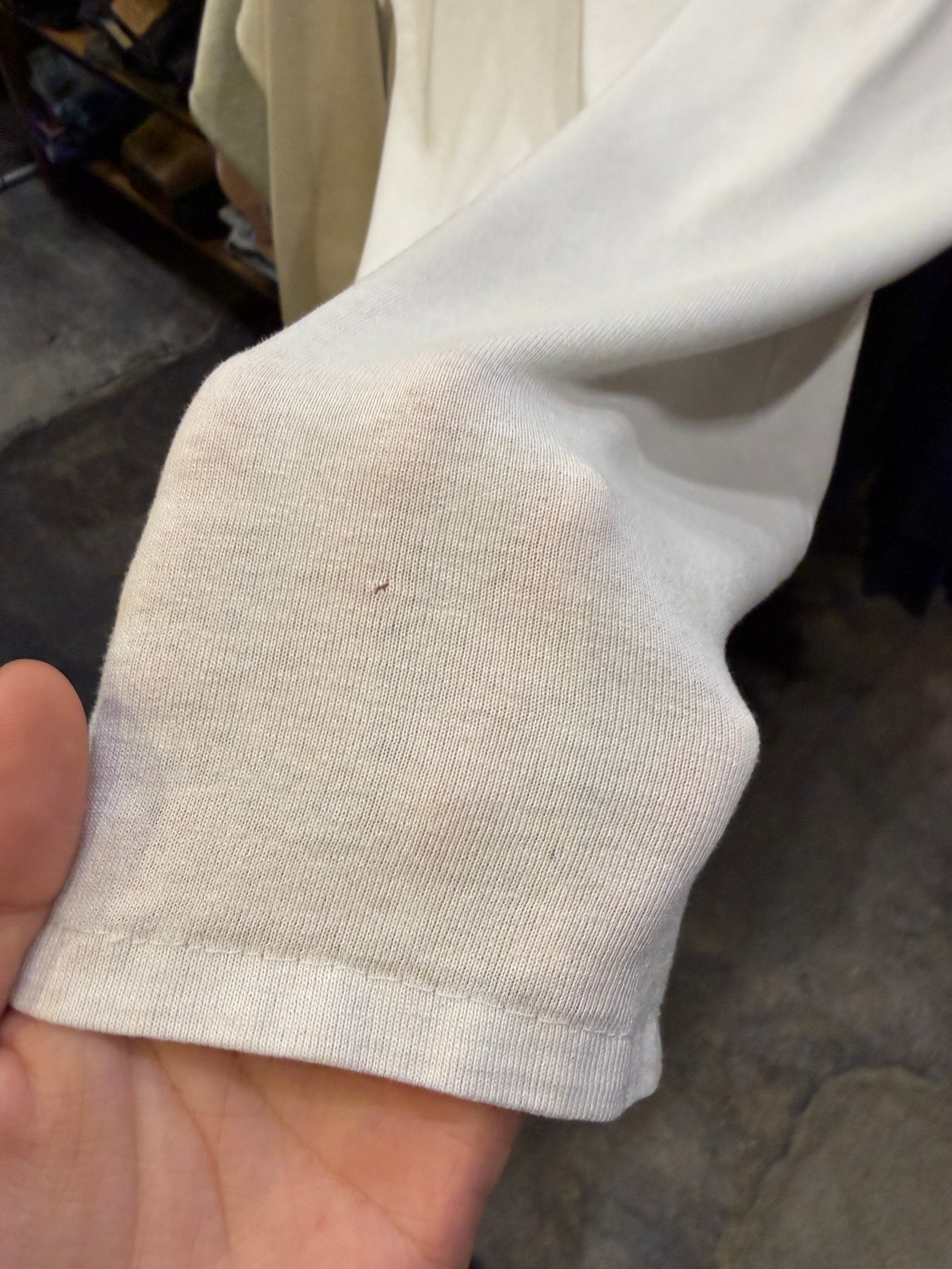 白いTシャツと比べると色移りなのか、うっすらグレーっぽくなっています。シミやキズ、生地の薄れ等ダメージのある商品です。古着にご理解のある方のご購入をお願い致します。