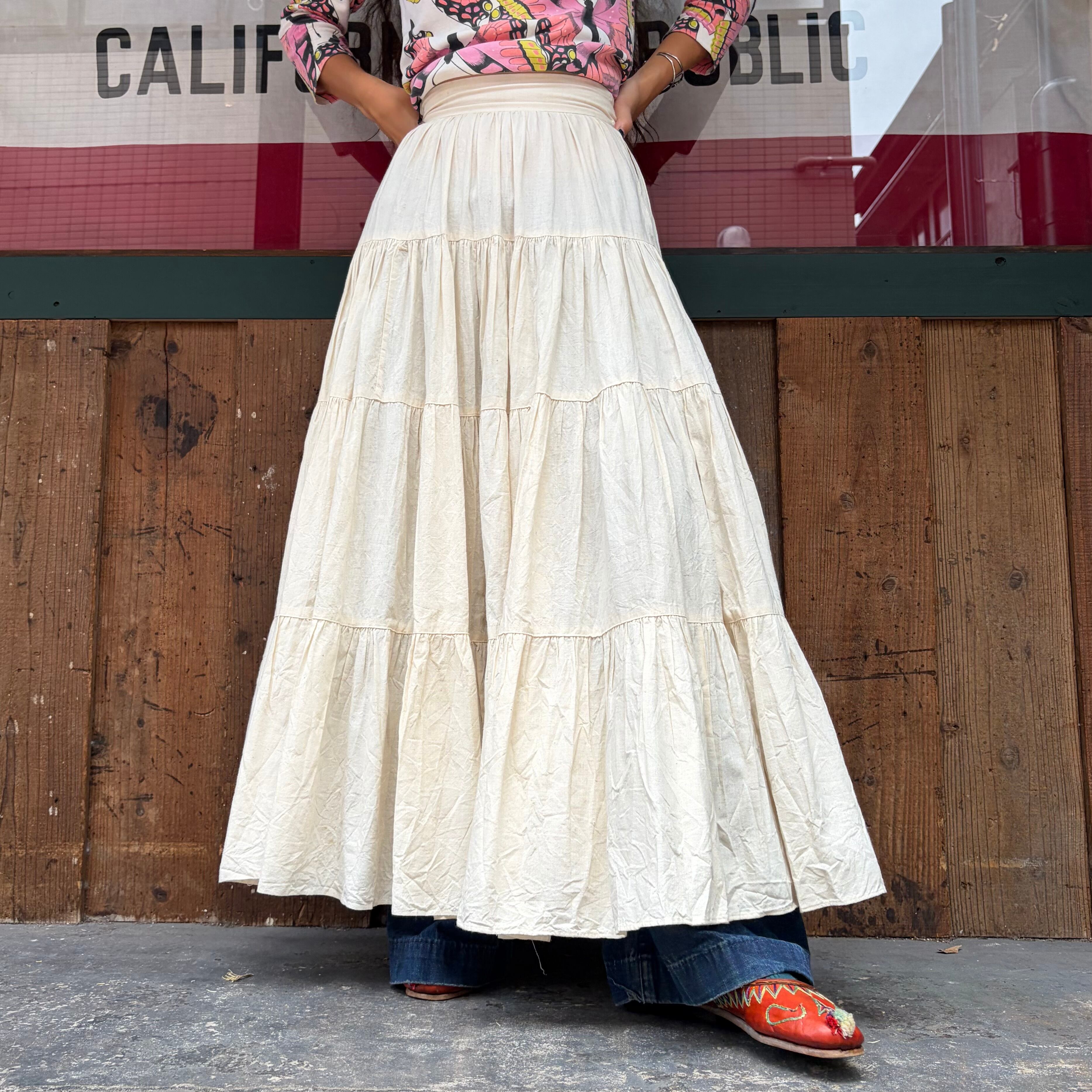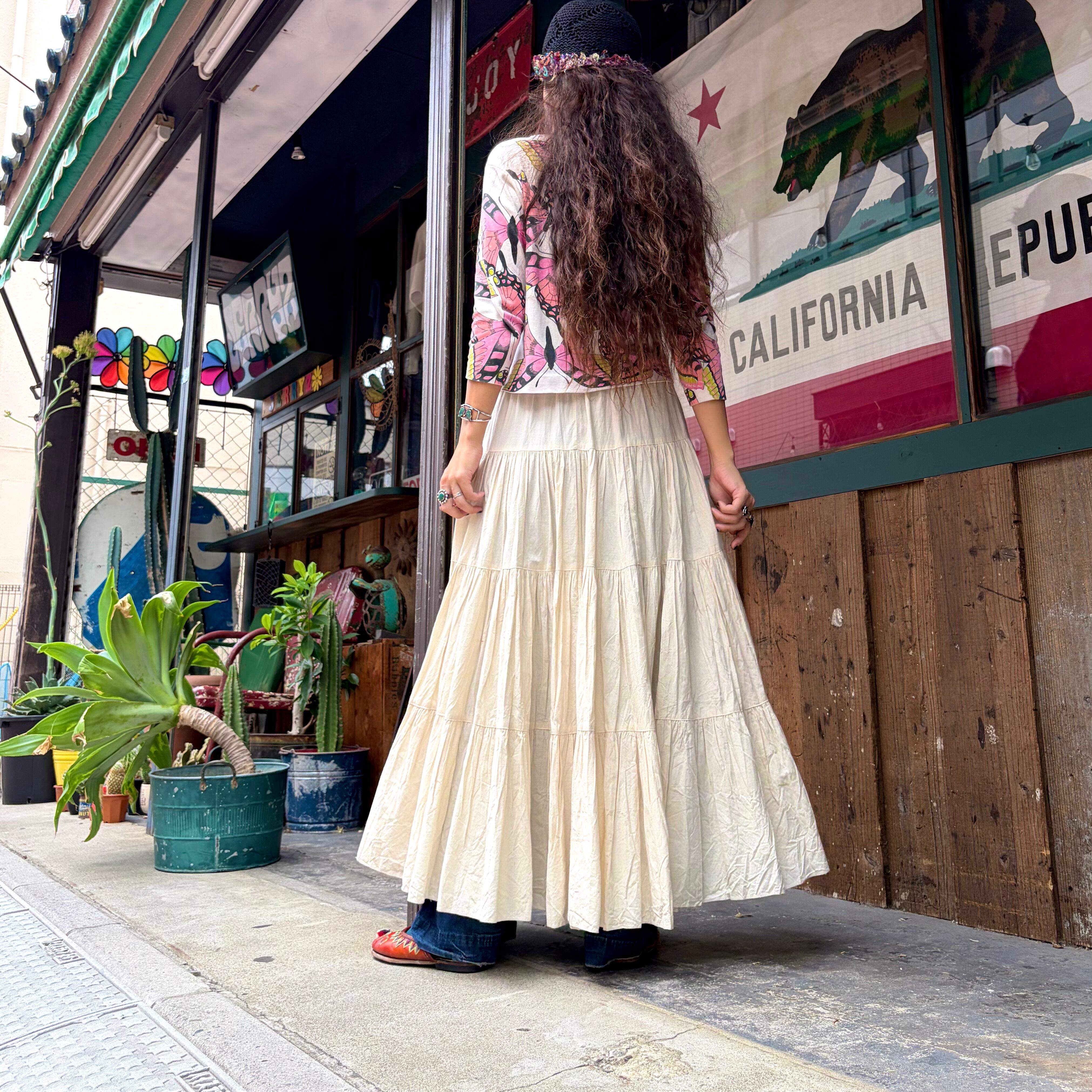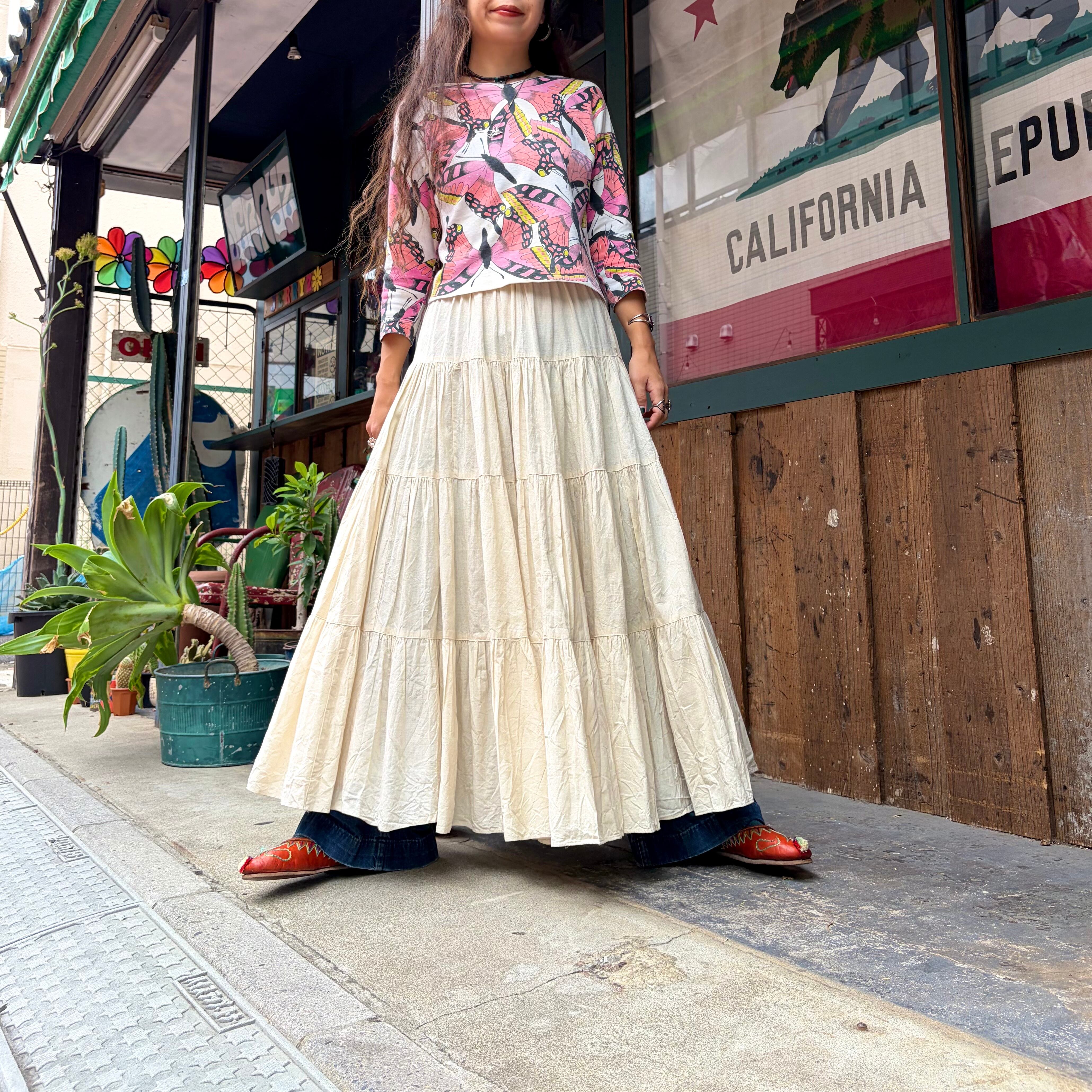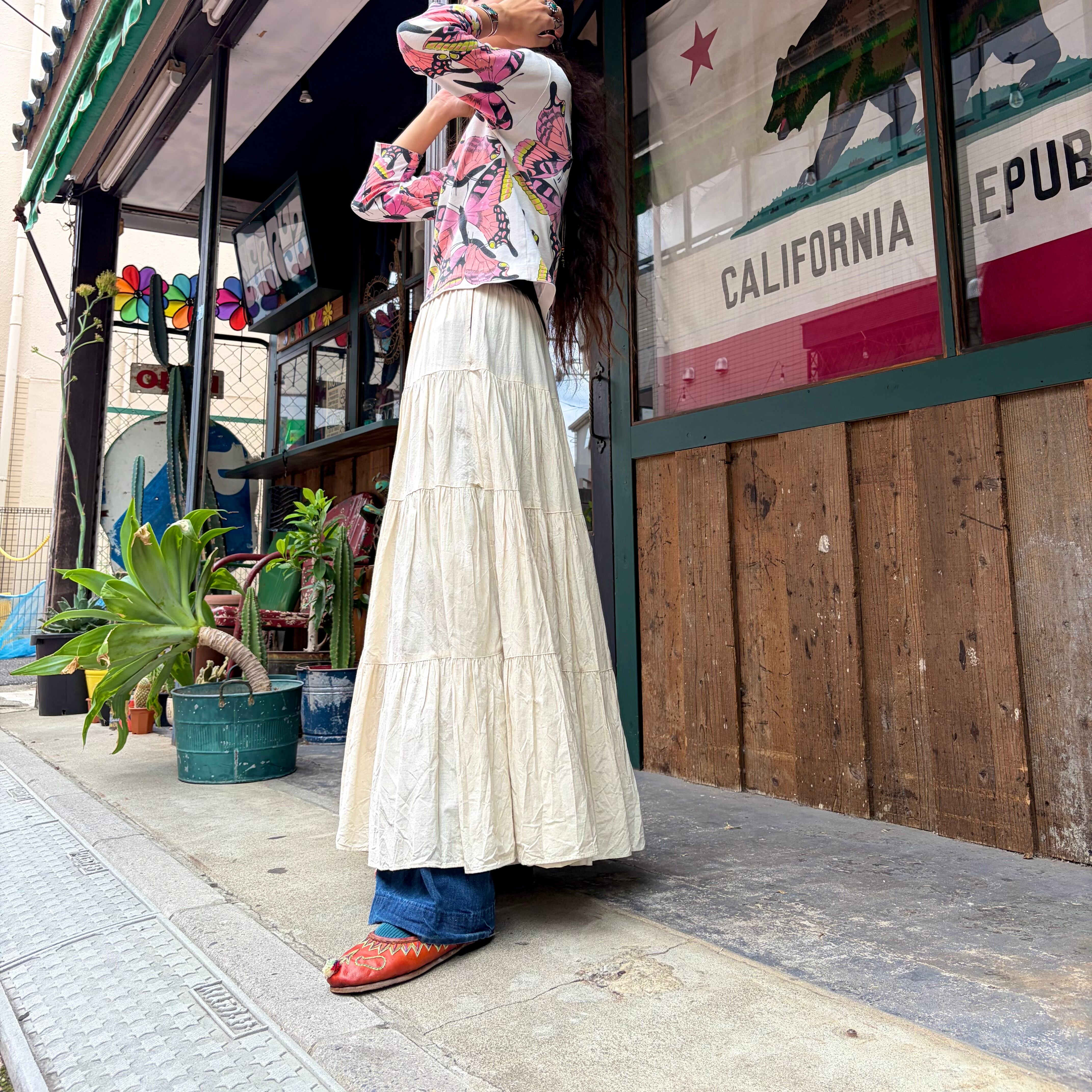 生成り色の生地がたっぷり惜しみなく使われて、ボリューム感がとても素敵なティアードロングスカートです。ただ生地は薄手な方ですのでそこまで重みはありません。