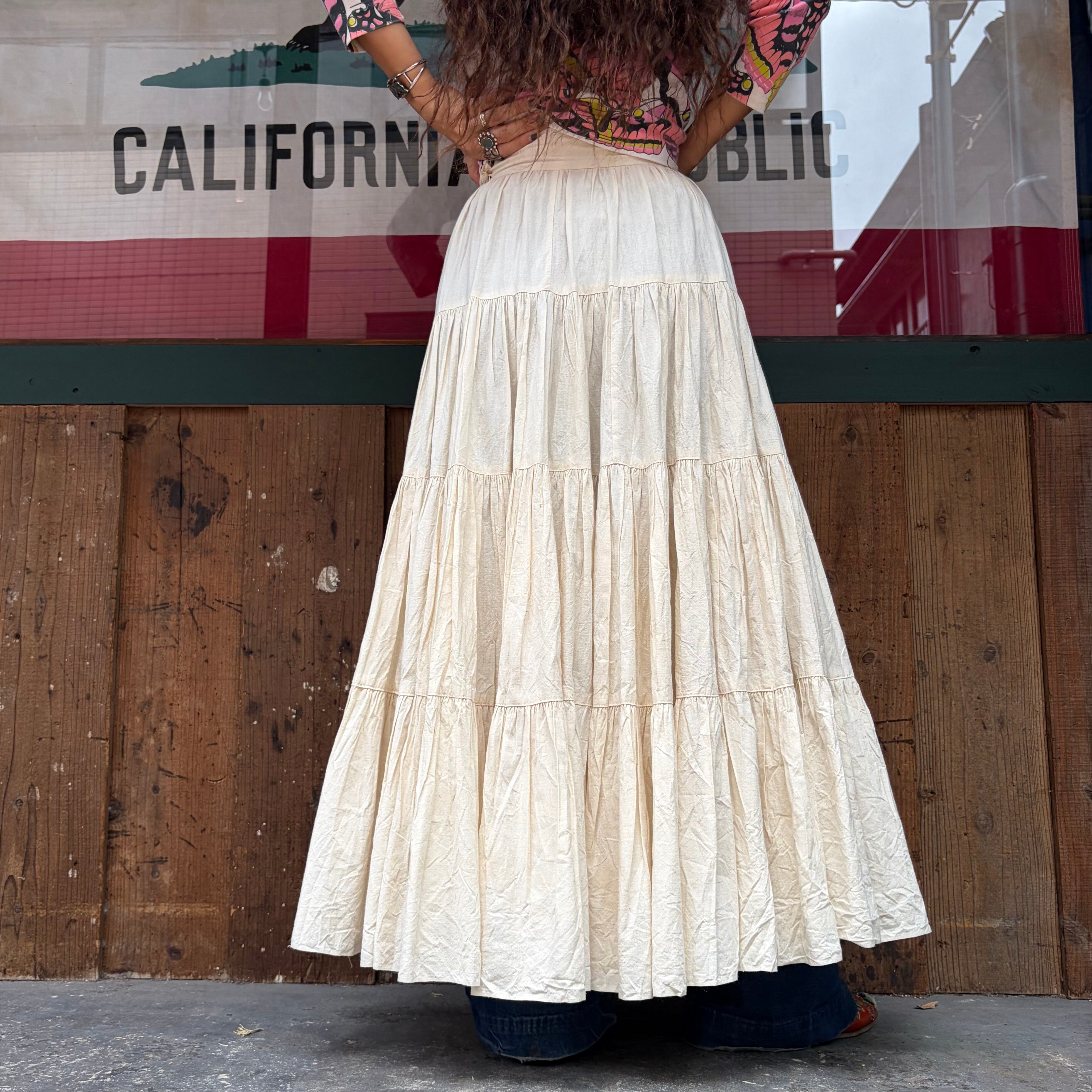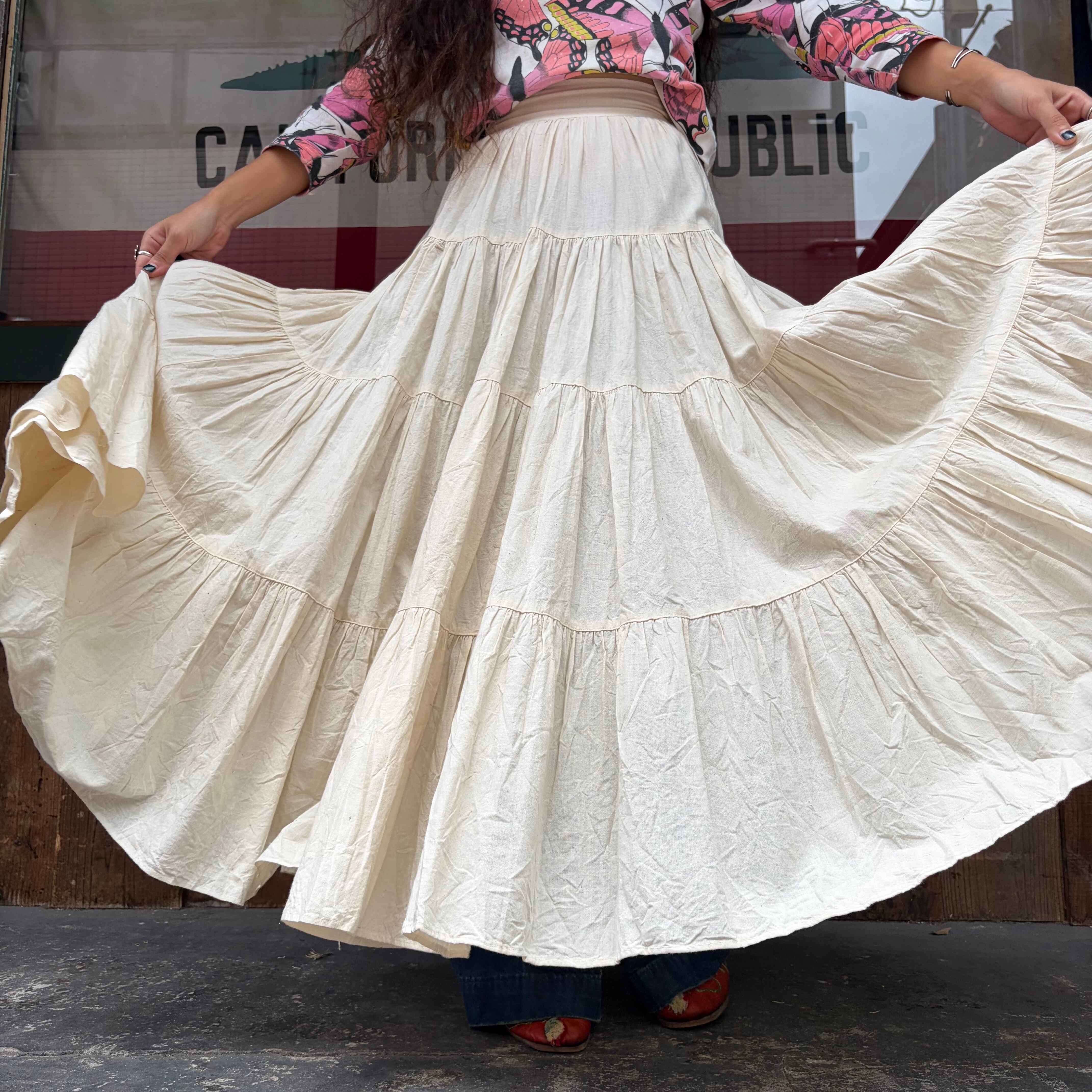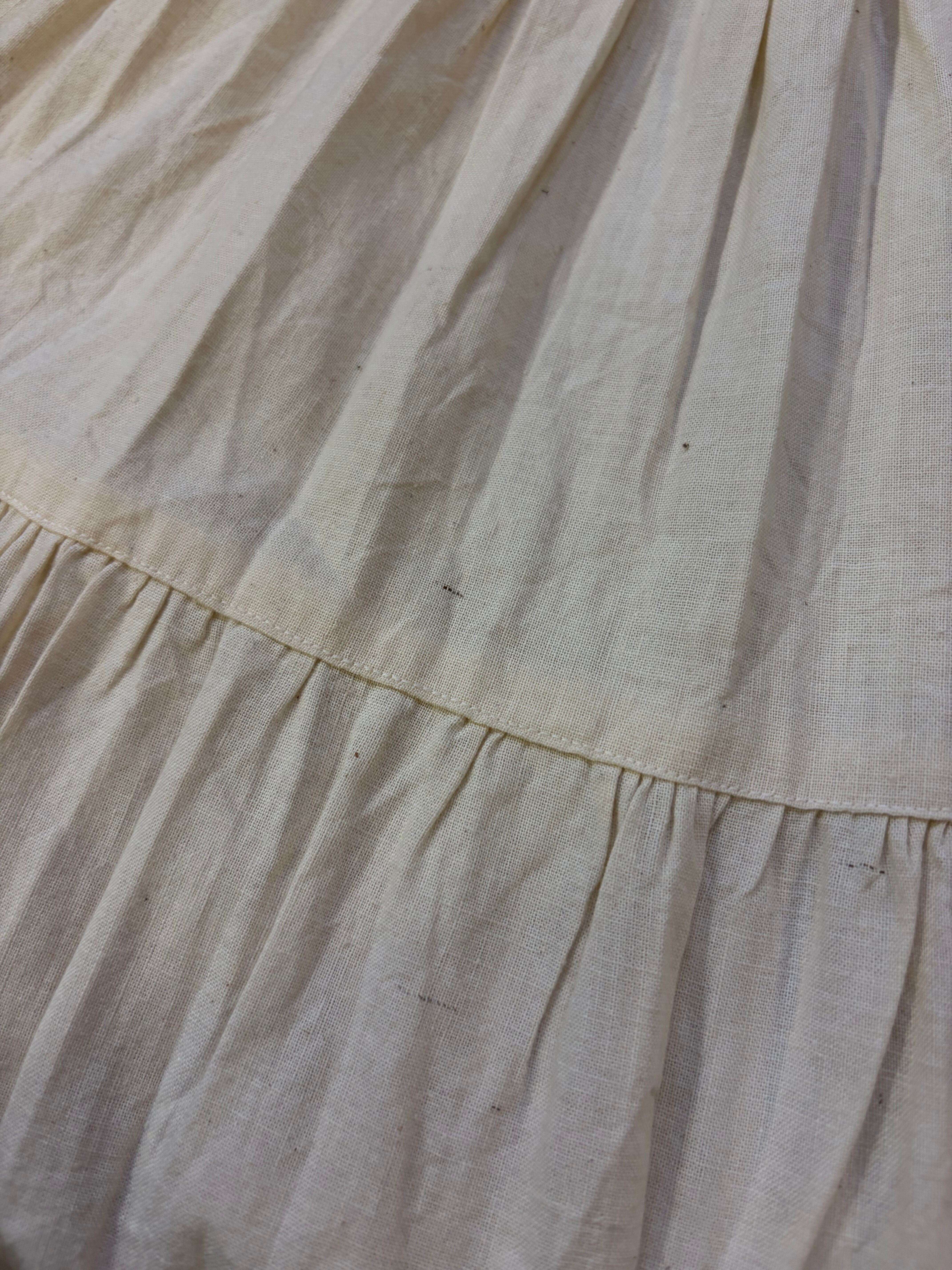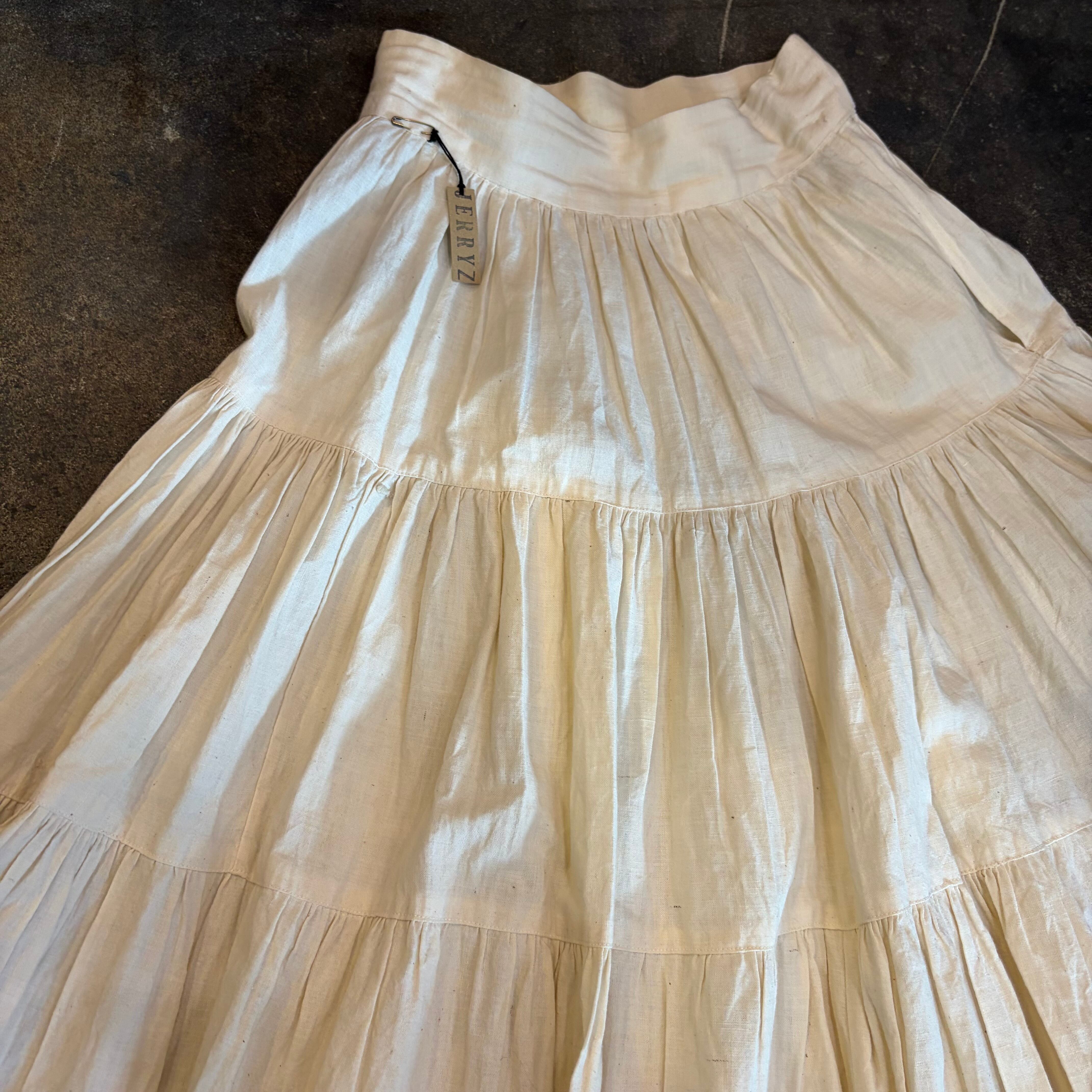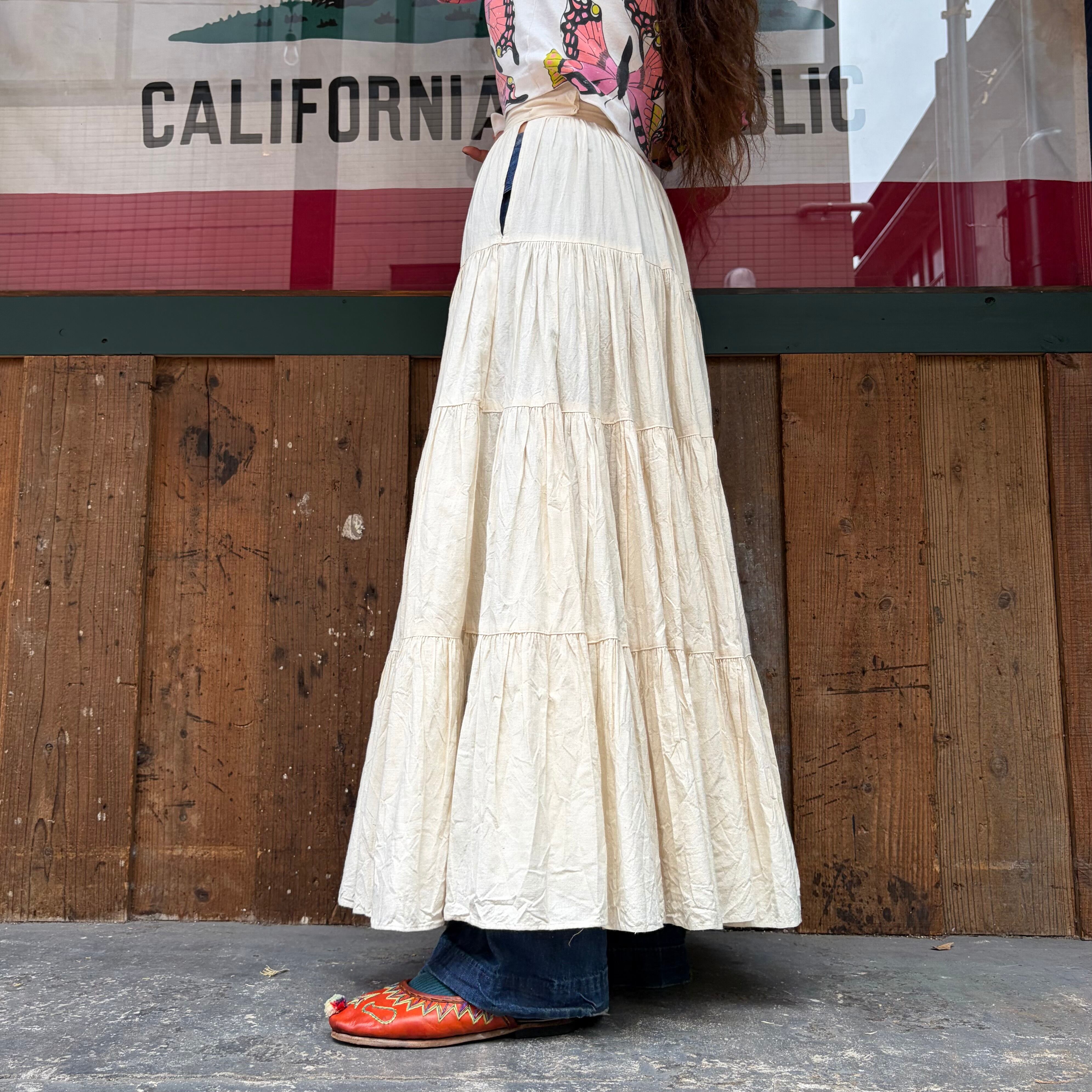 生成り色の生地がたっぷり惜しみなく使われて、ボリューム感がとても素敵なティアードロングスカートです。ただ生地は薄手な方ですのでそこまで重みはありません。