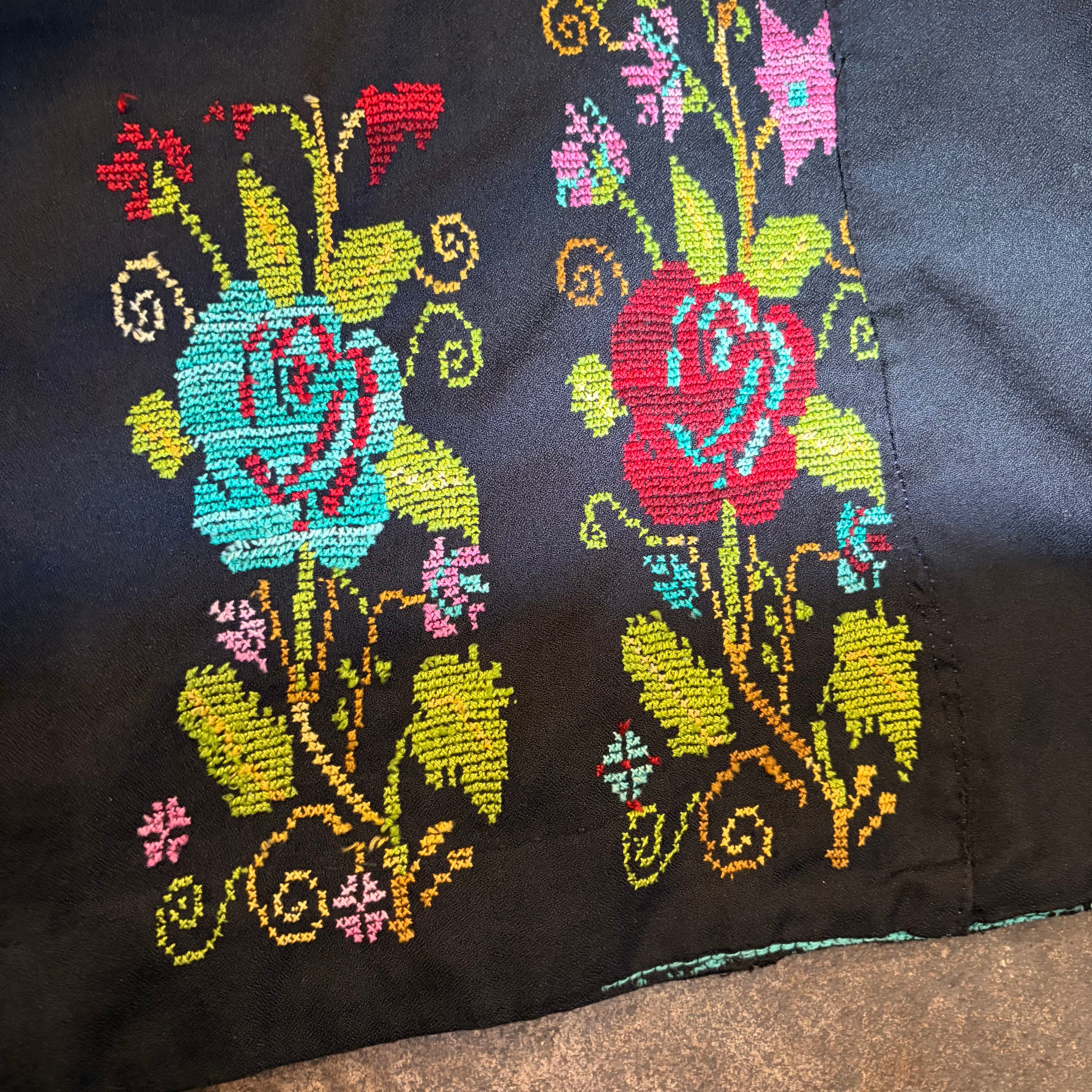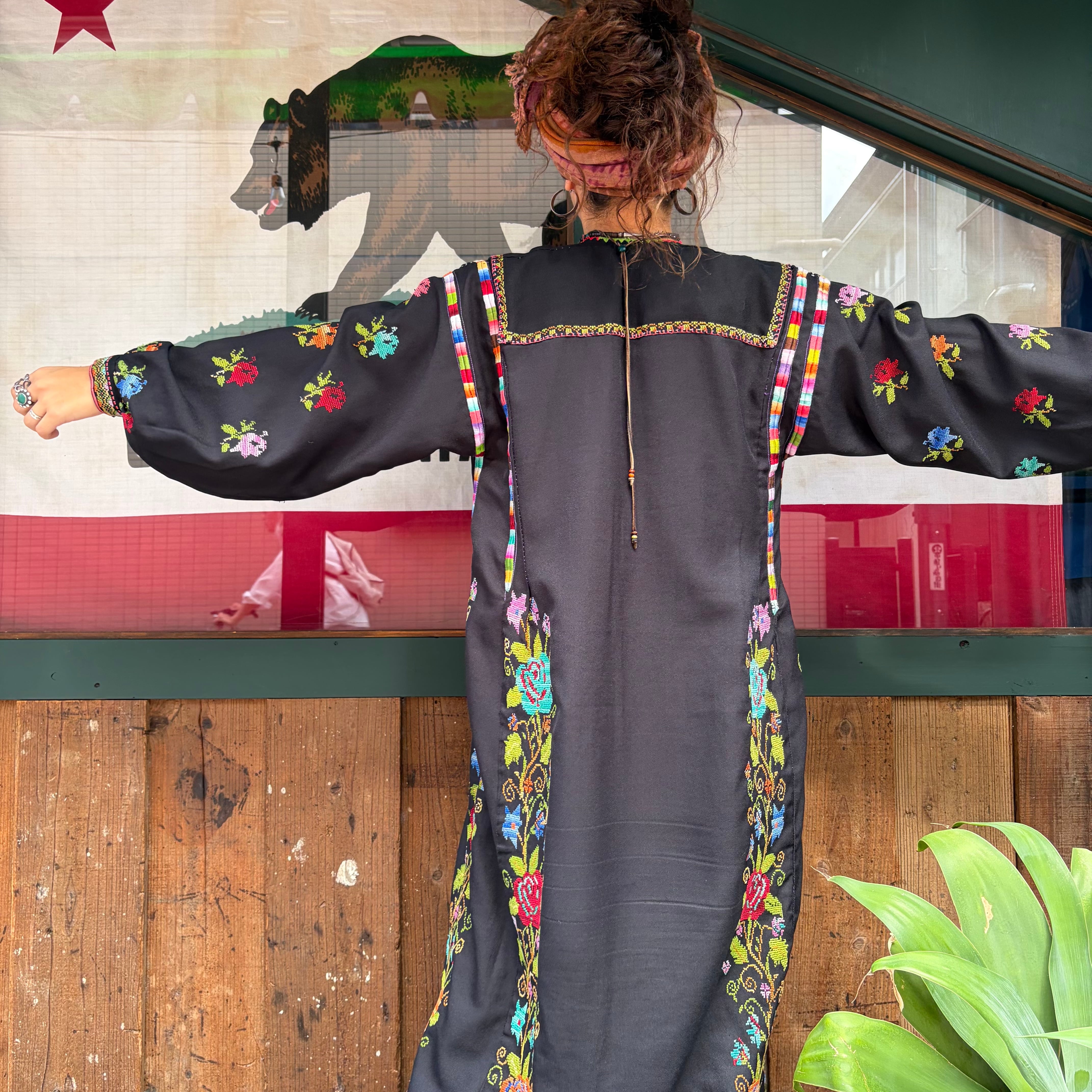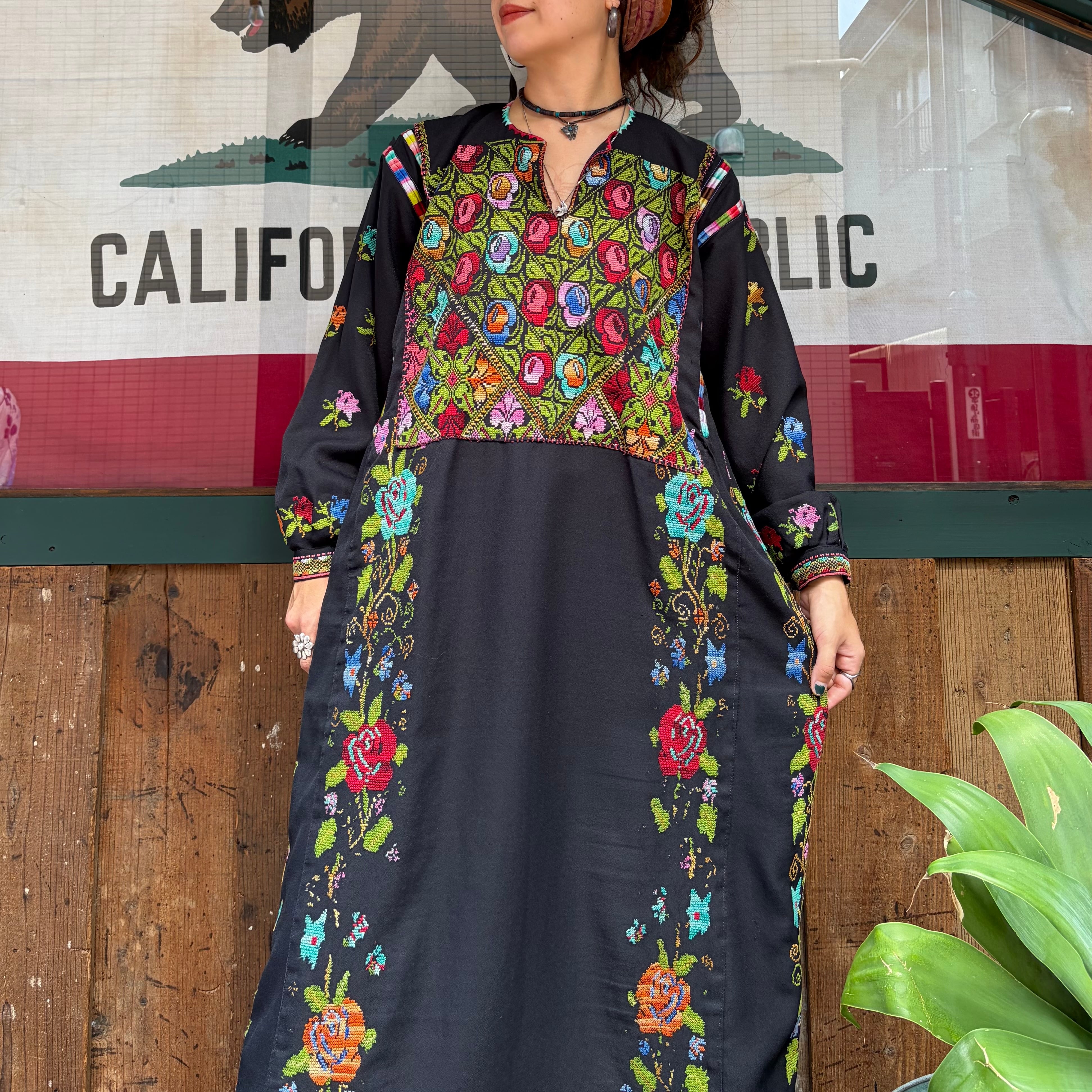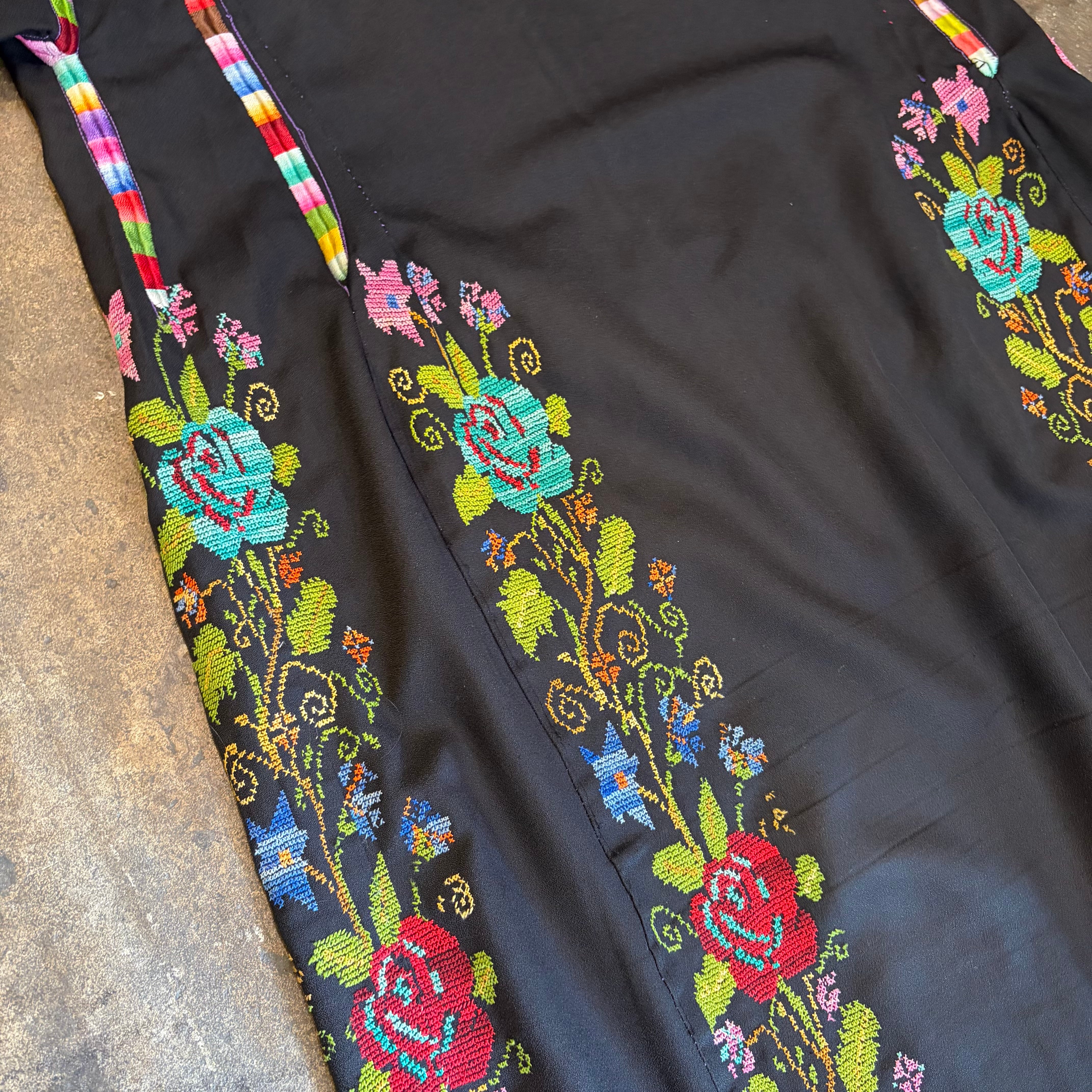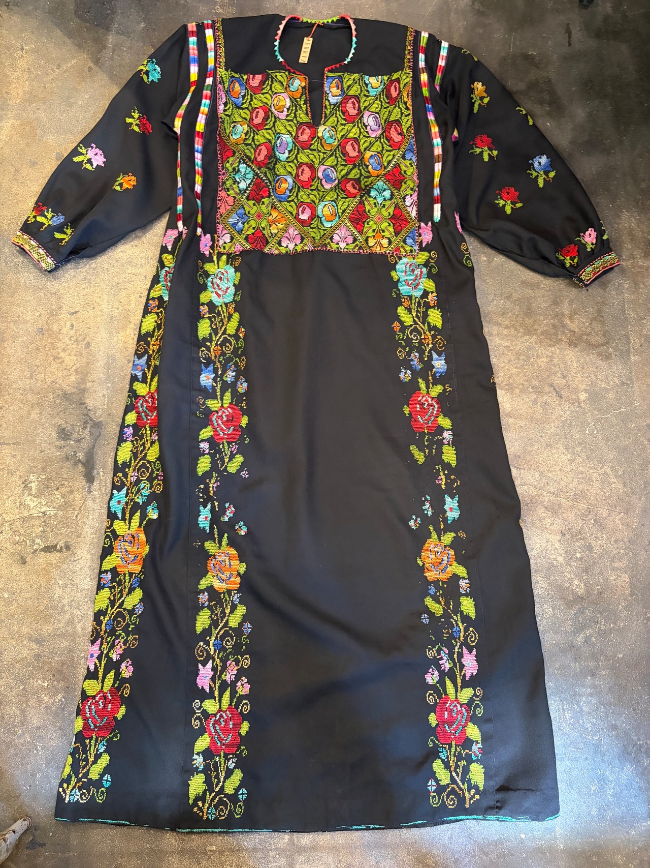 黒ベースにとても細かいクロスステッチの手刺繍が美しい、おそらくパレスチナのワンピースです。