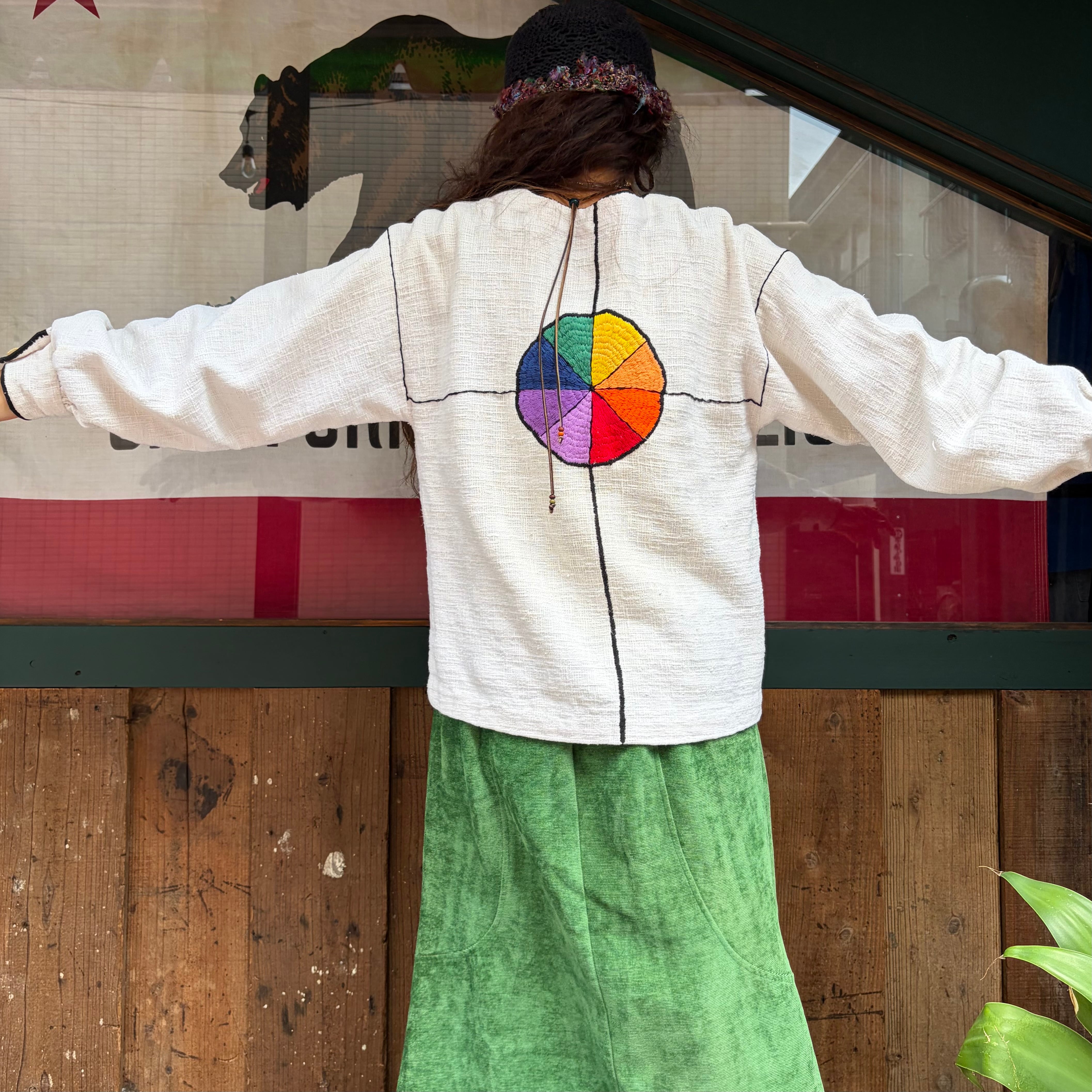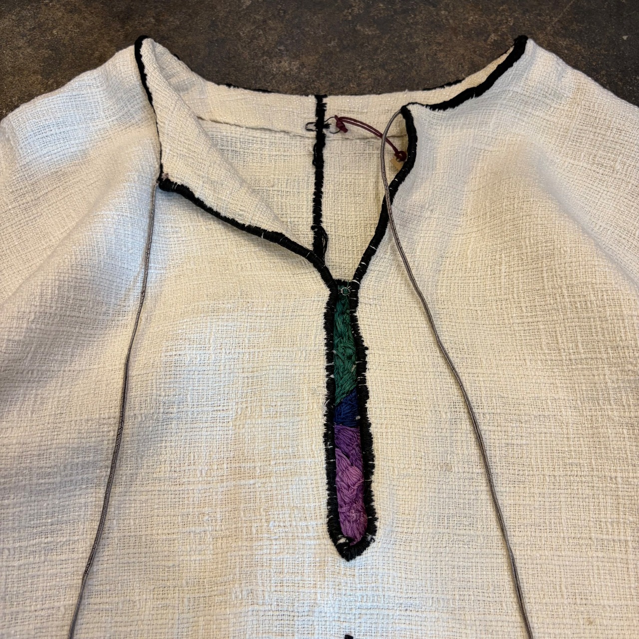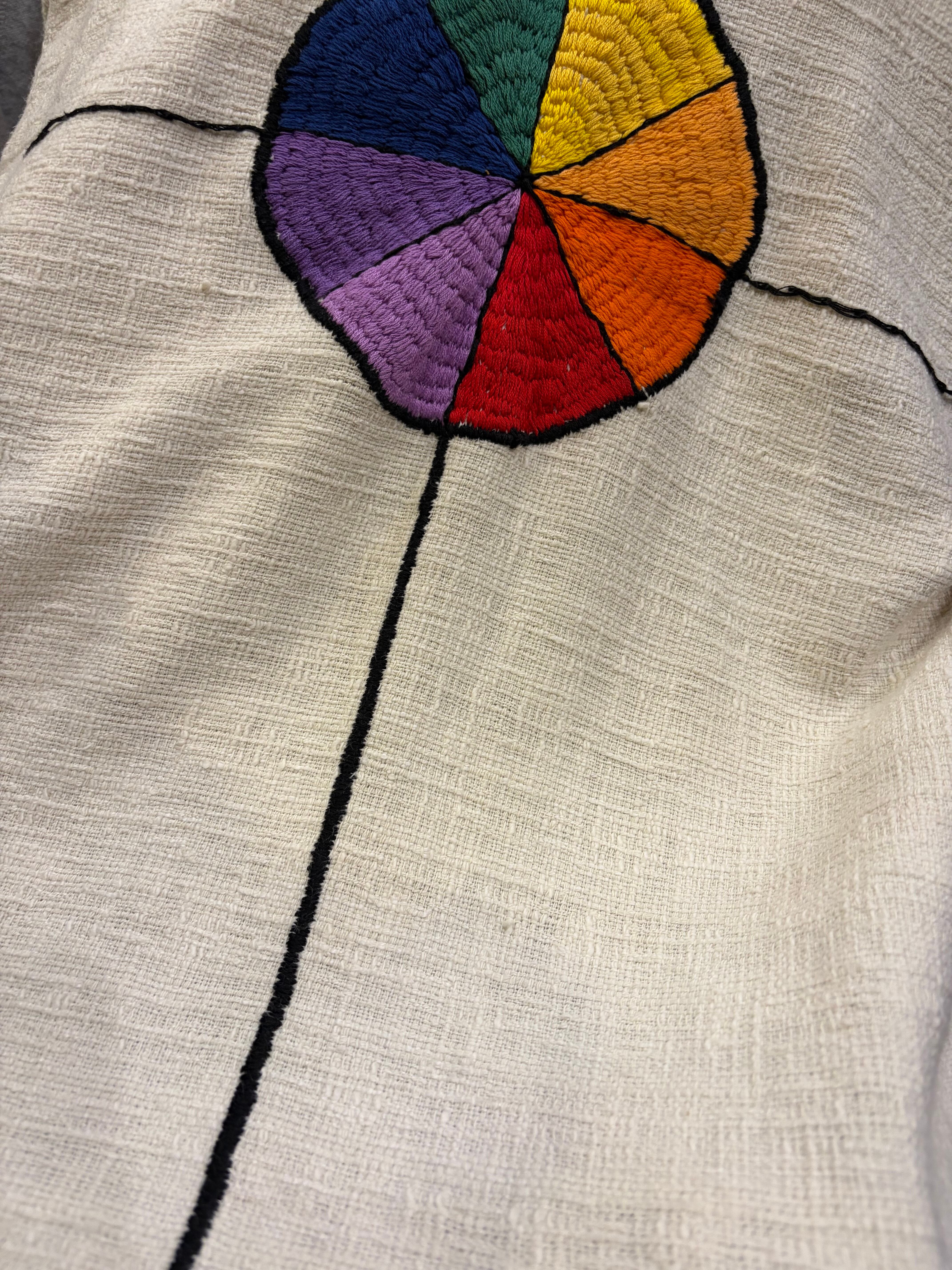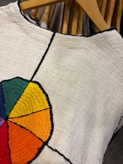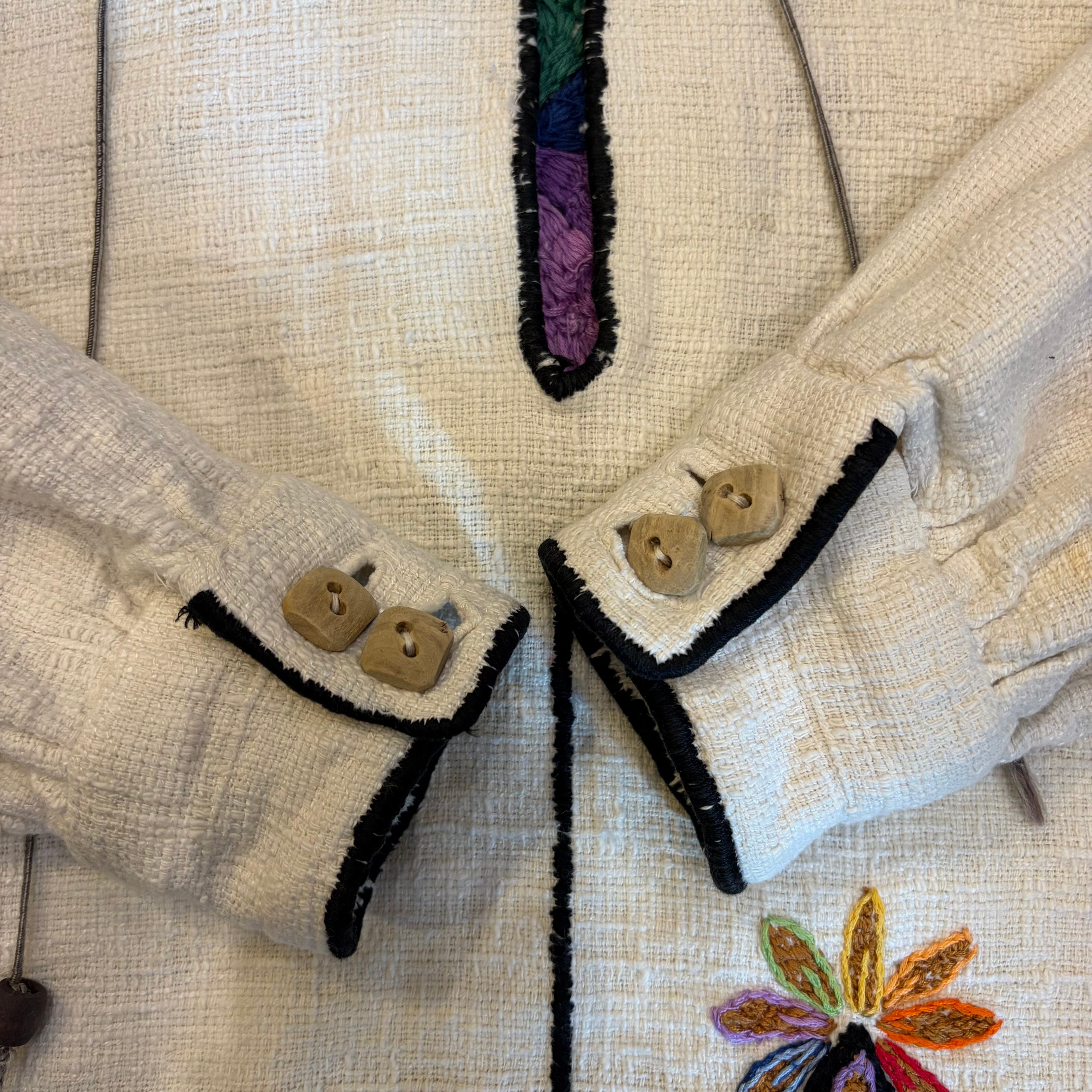まず生地自体も太い糸を手織りで織ったであろう温かみのある厚手の生地感です。そしてお花と背中の虹色が手刺繍なのはもちろん、襟ぐりや袖ぐり、袖口などの黒いラインも全て手でステッチされています。