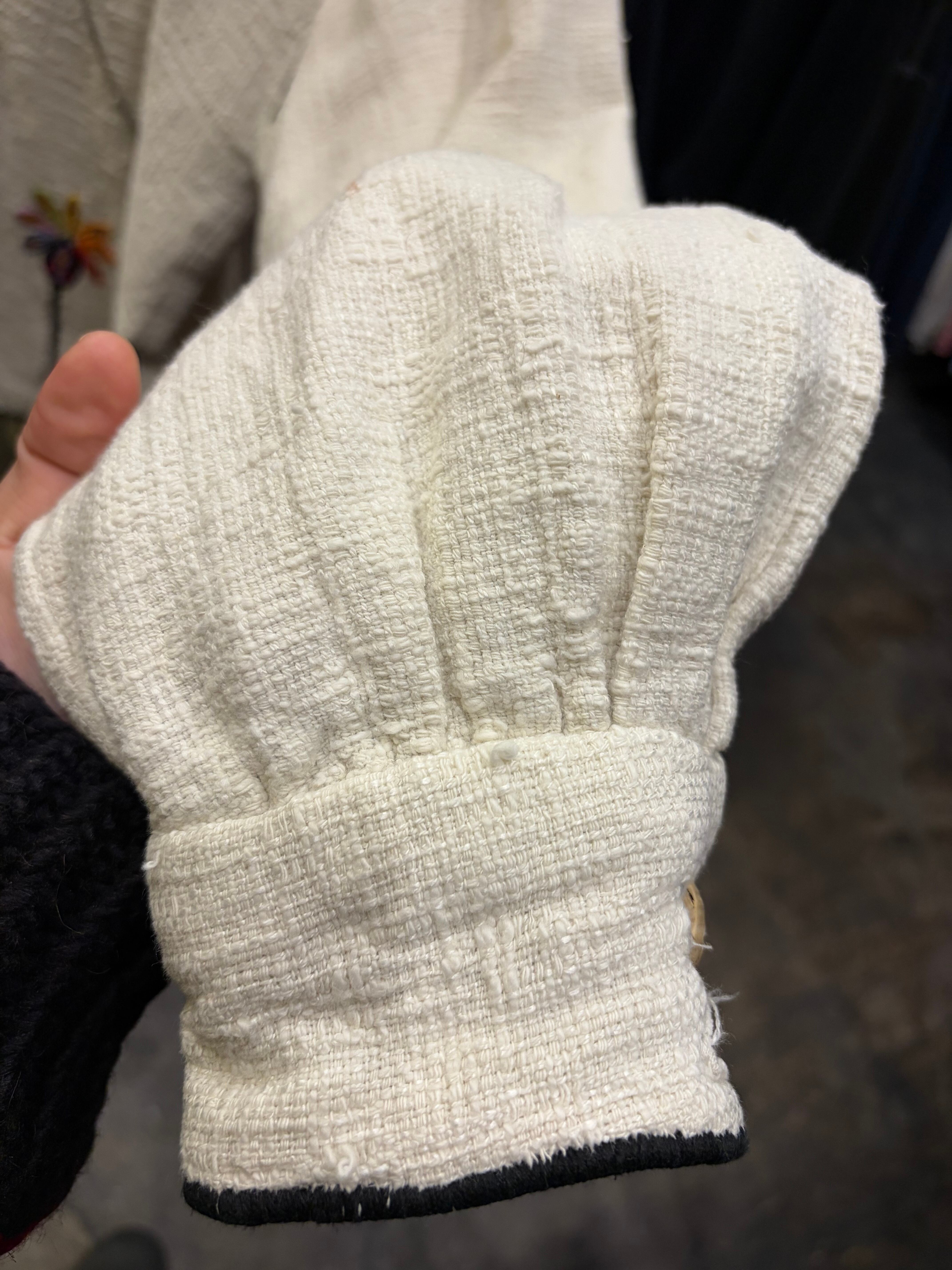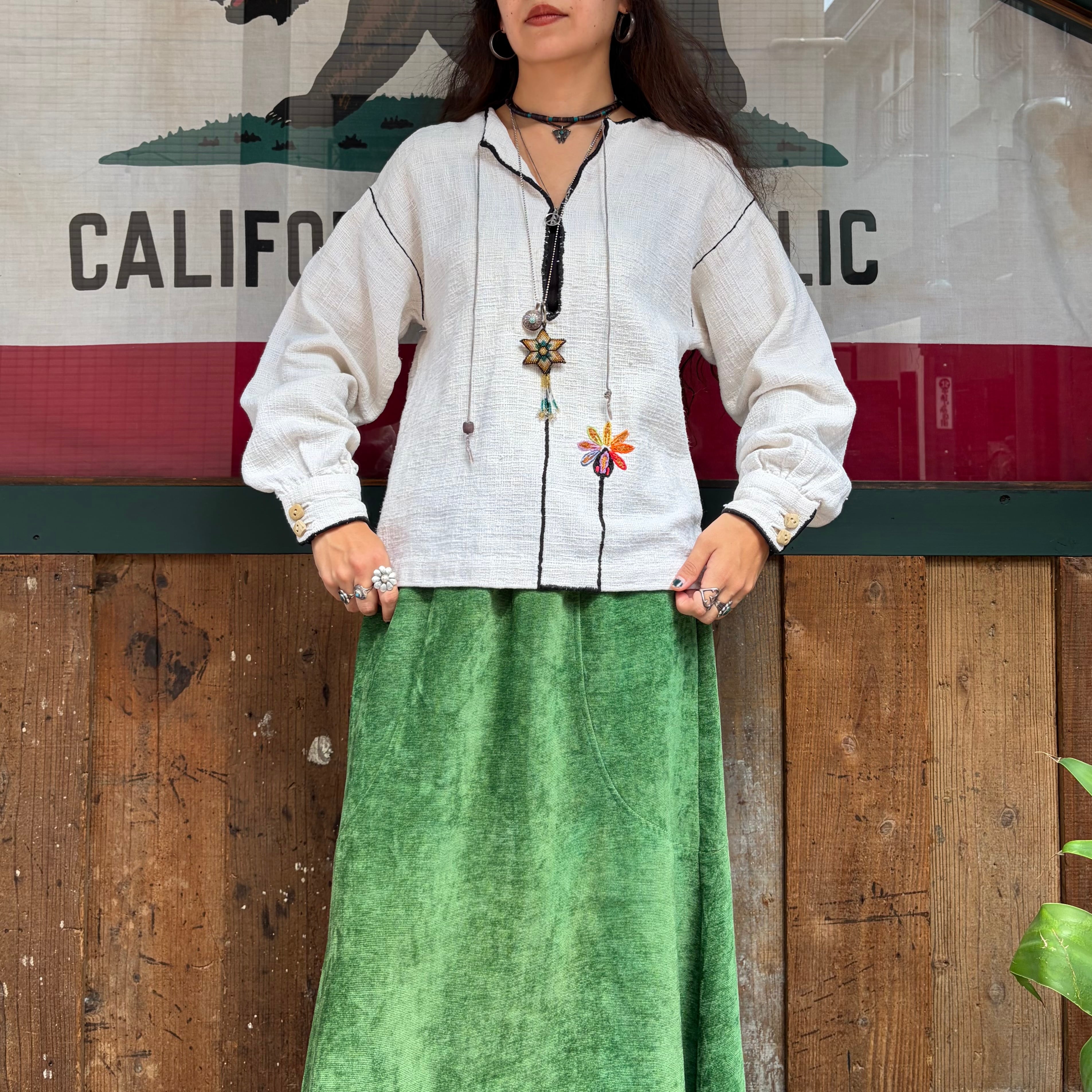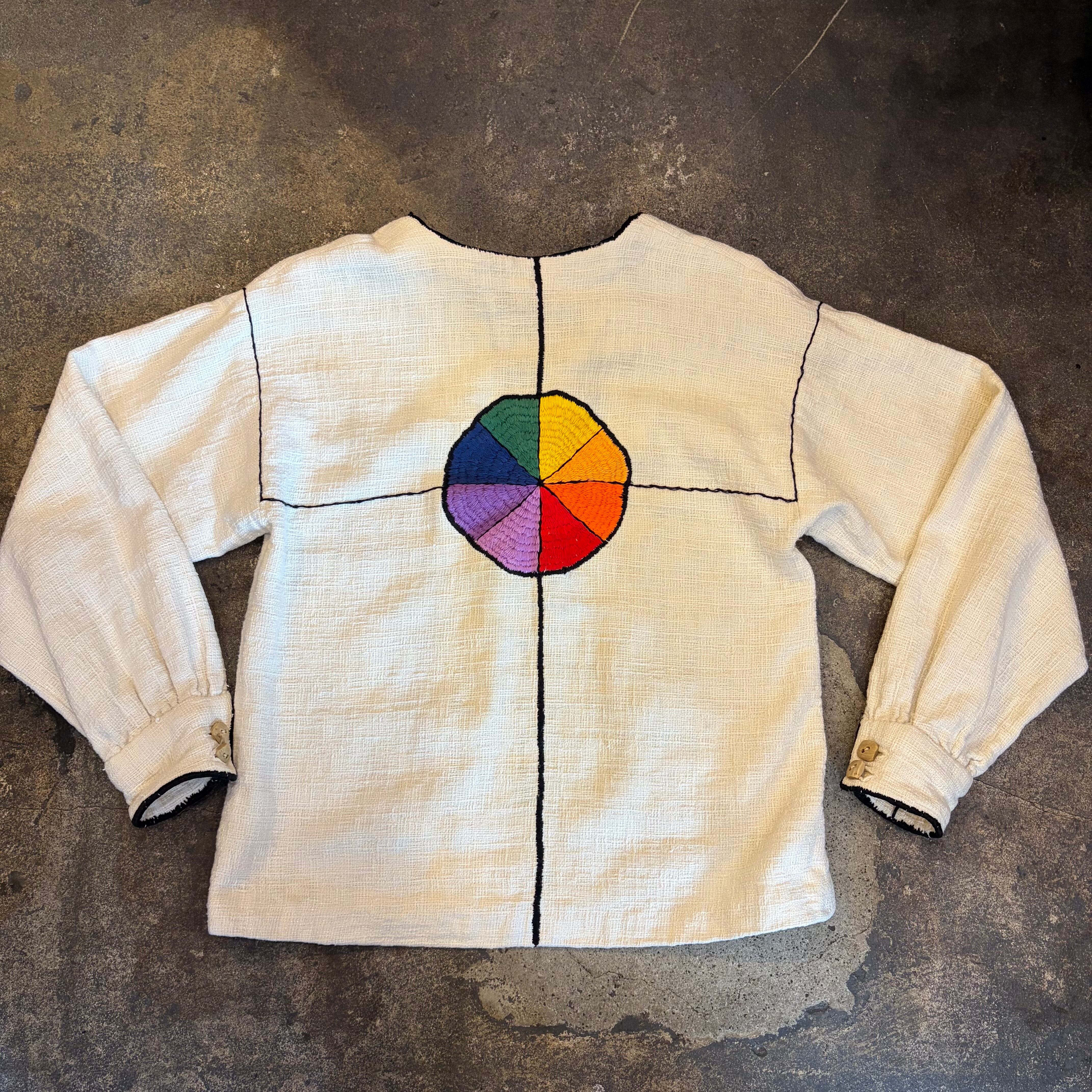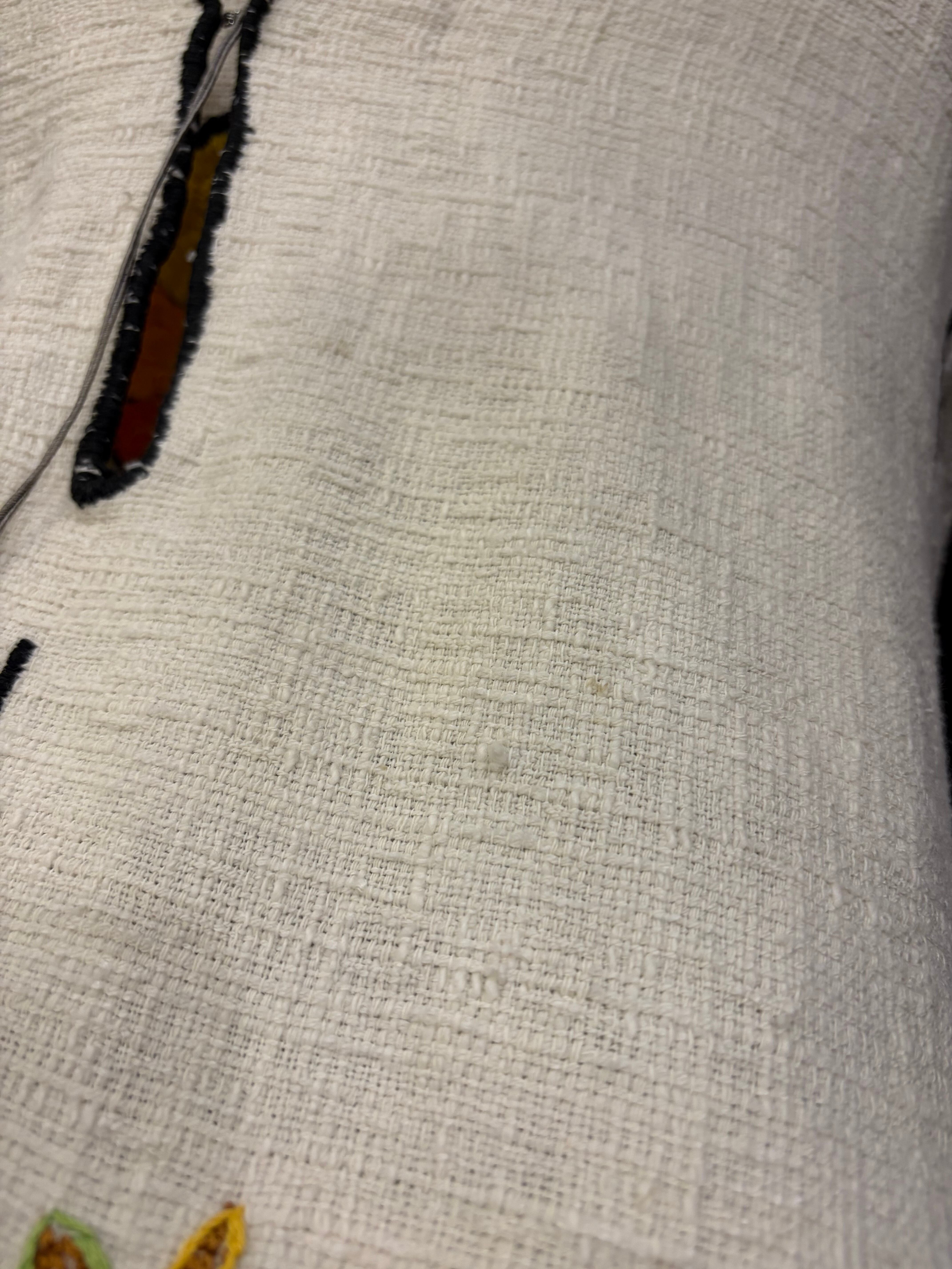 まず生地自体も太い糸を手織りで織ったであろう温かみのある厚手の生地感です。そしてお花と背中の虹色が手刺繍なのはもちろん、襟ぐりや袖ぐり、袖口などの黒いラインも全て手でステッチされています。