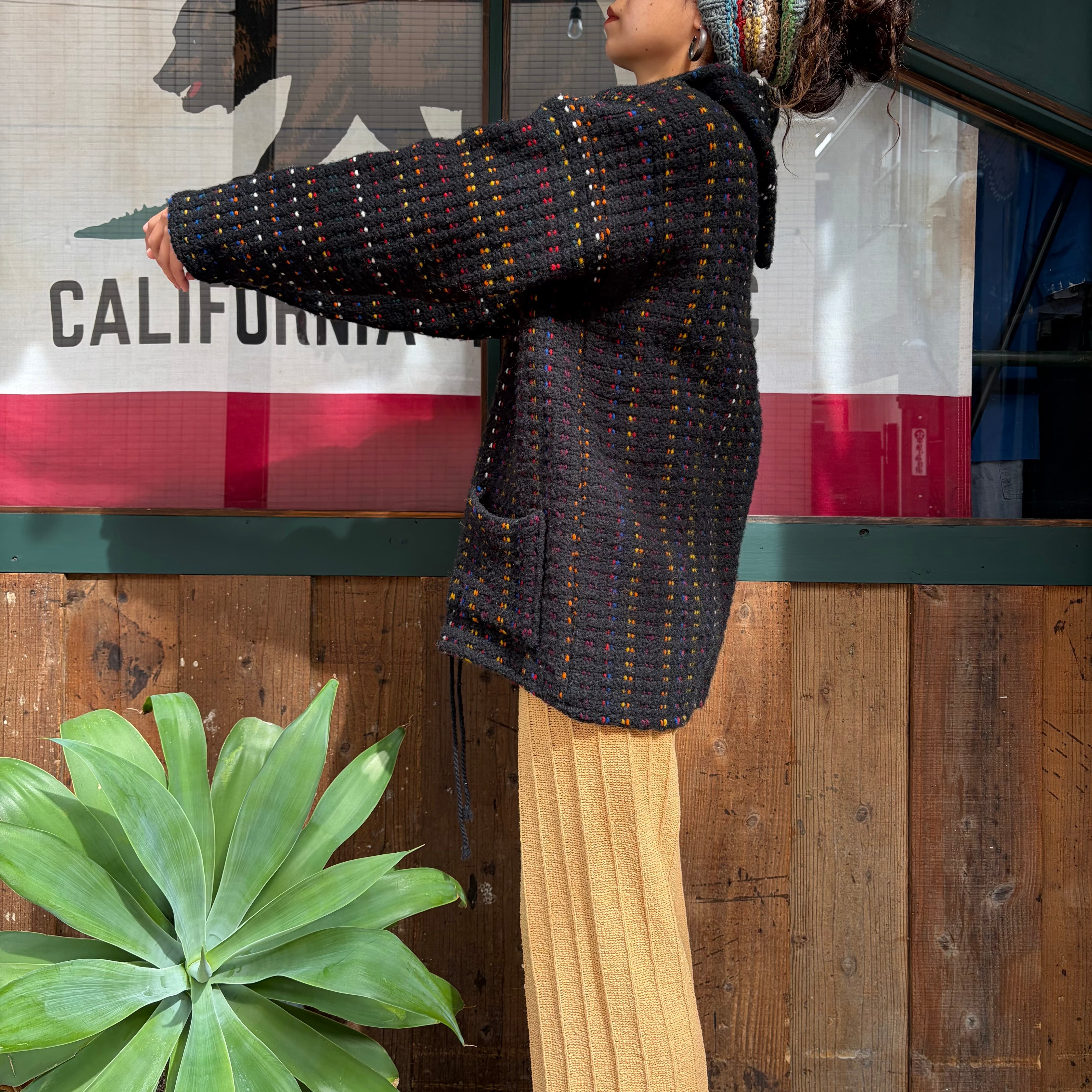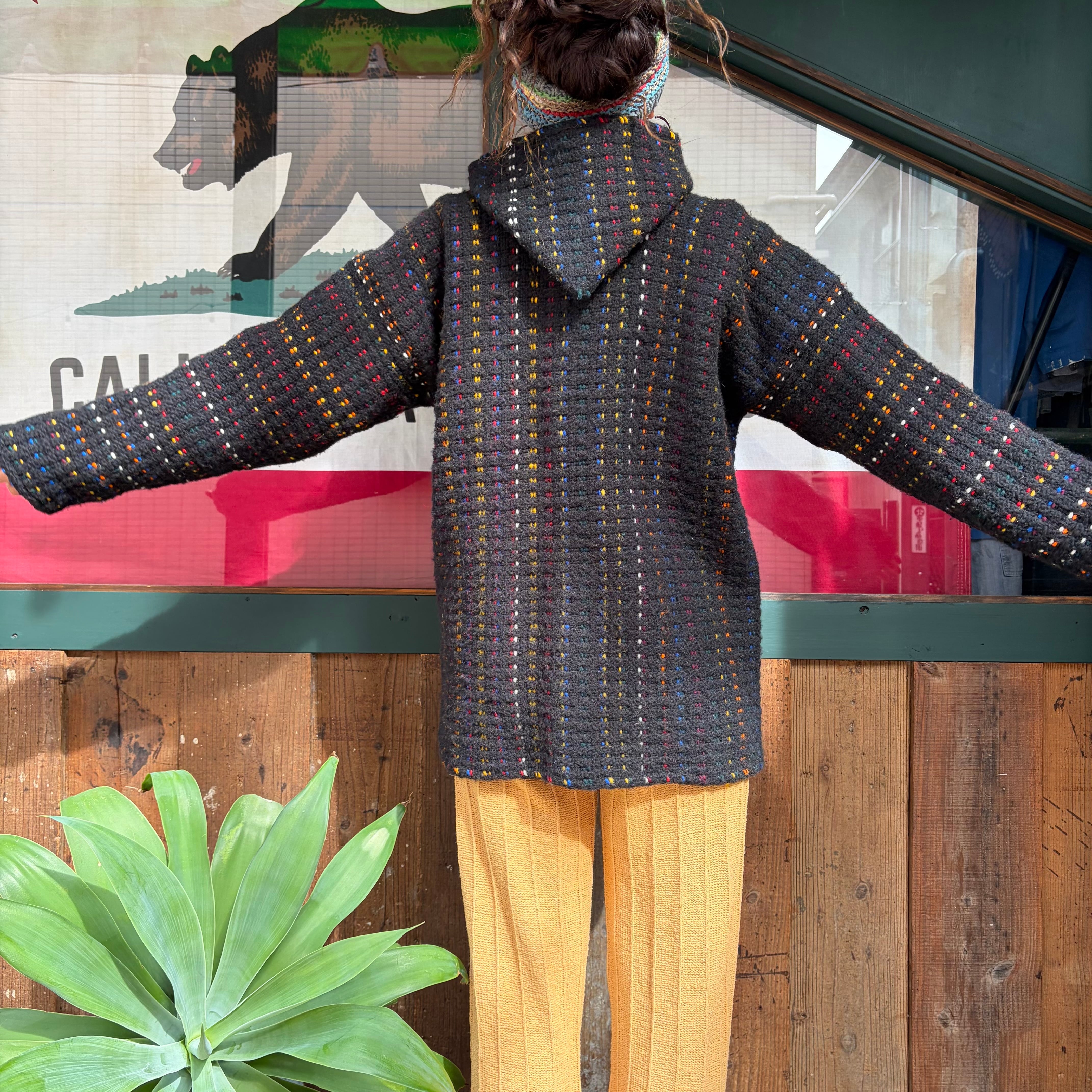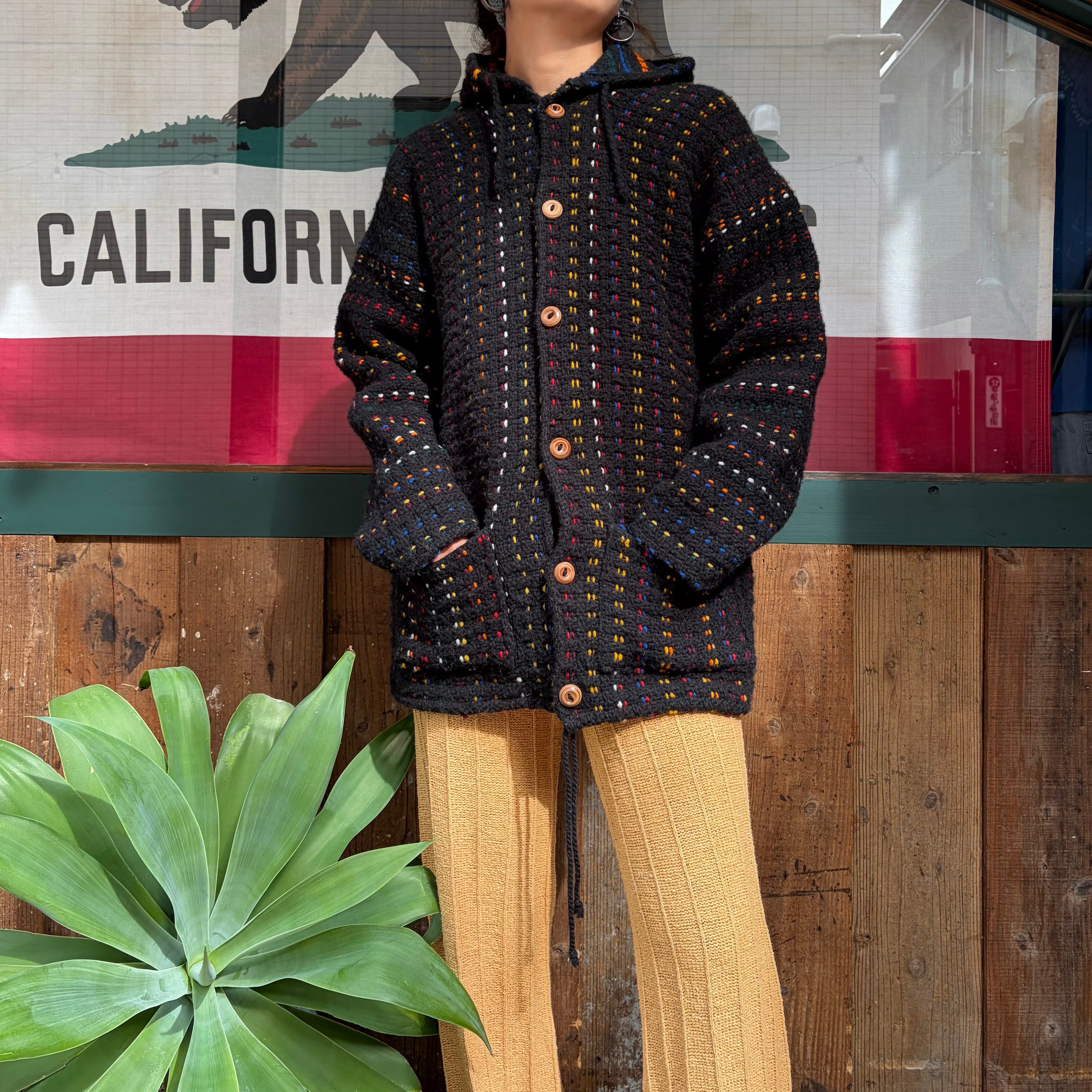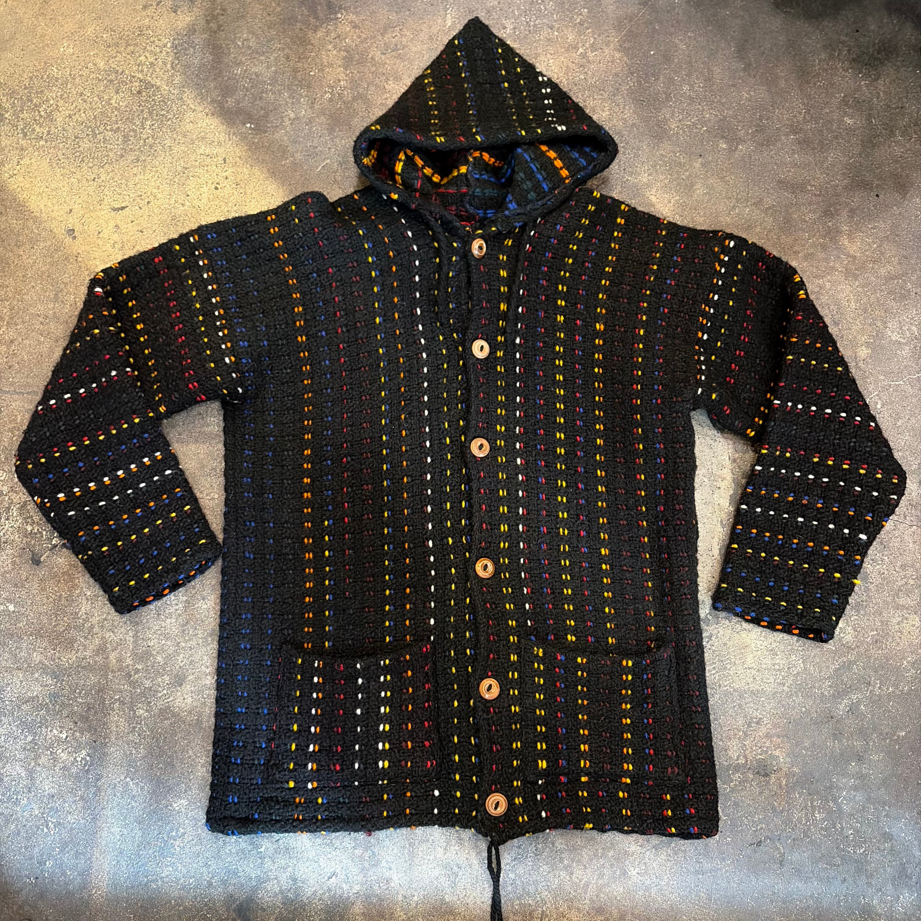 黒ベースにカラフルな毛糸のステッチがかわいいエクアドルのフード付きニットジャケットです。