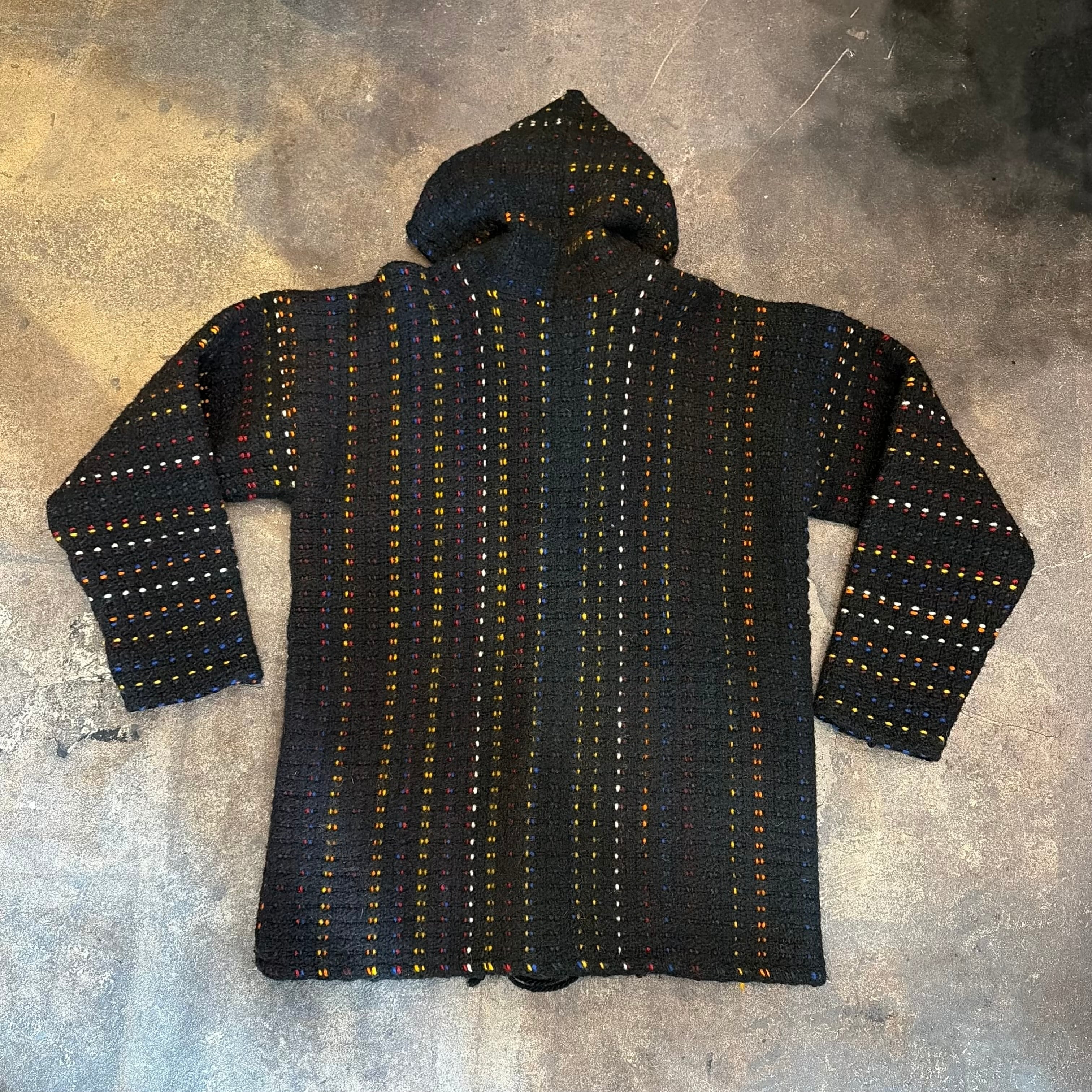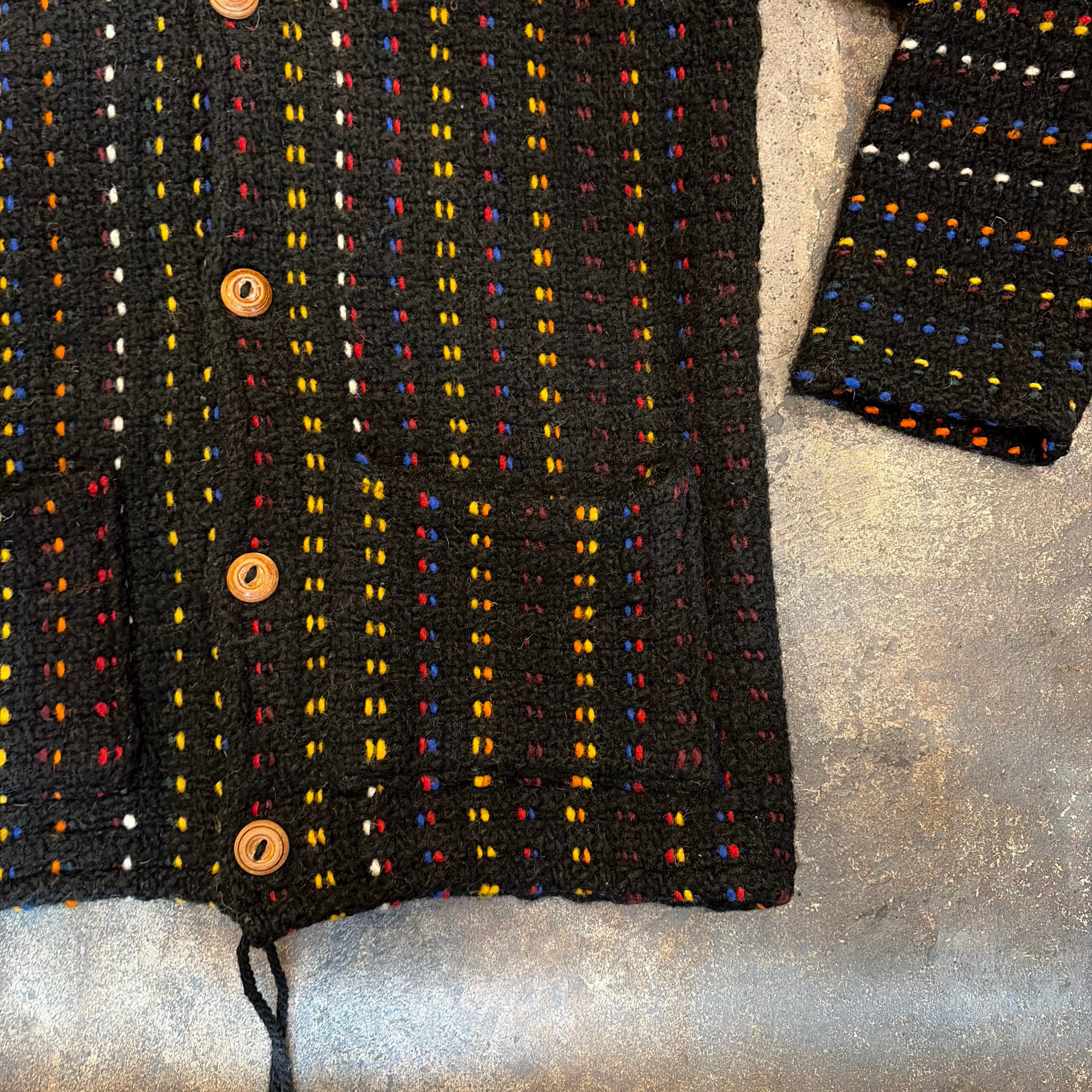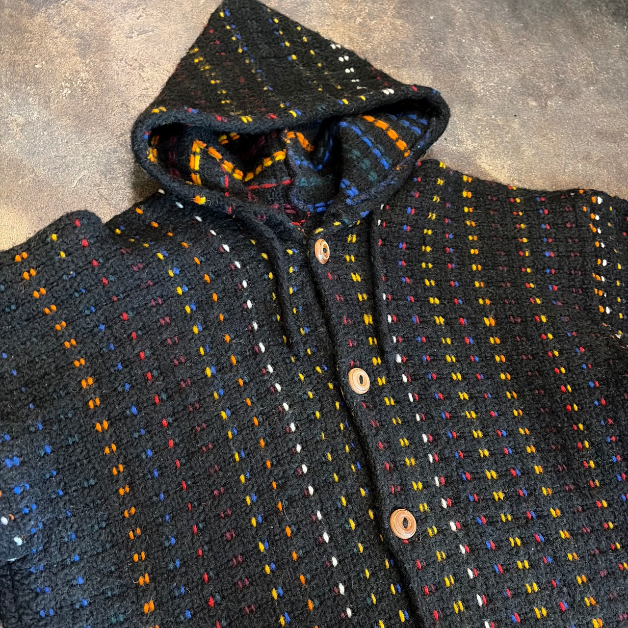 黒ベースにカラフルな毛糸のステッチがかわいいエクアドルのフード付きニットジャケットです。