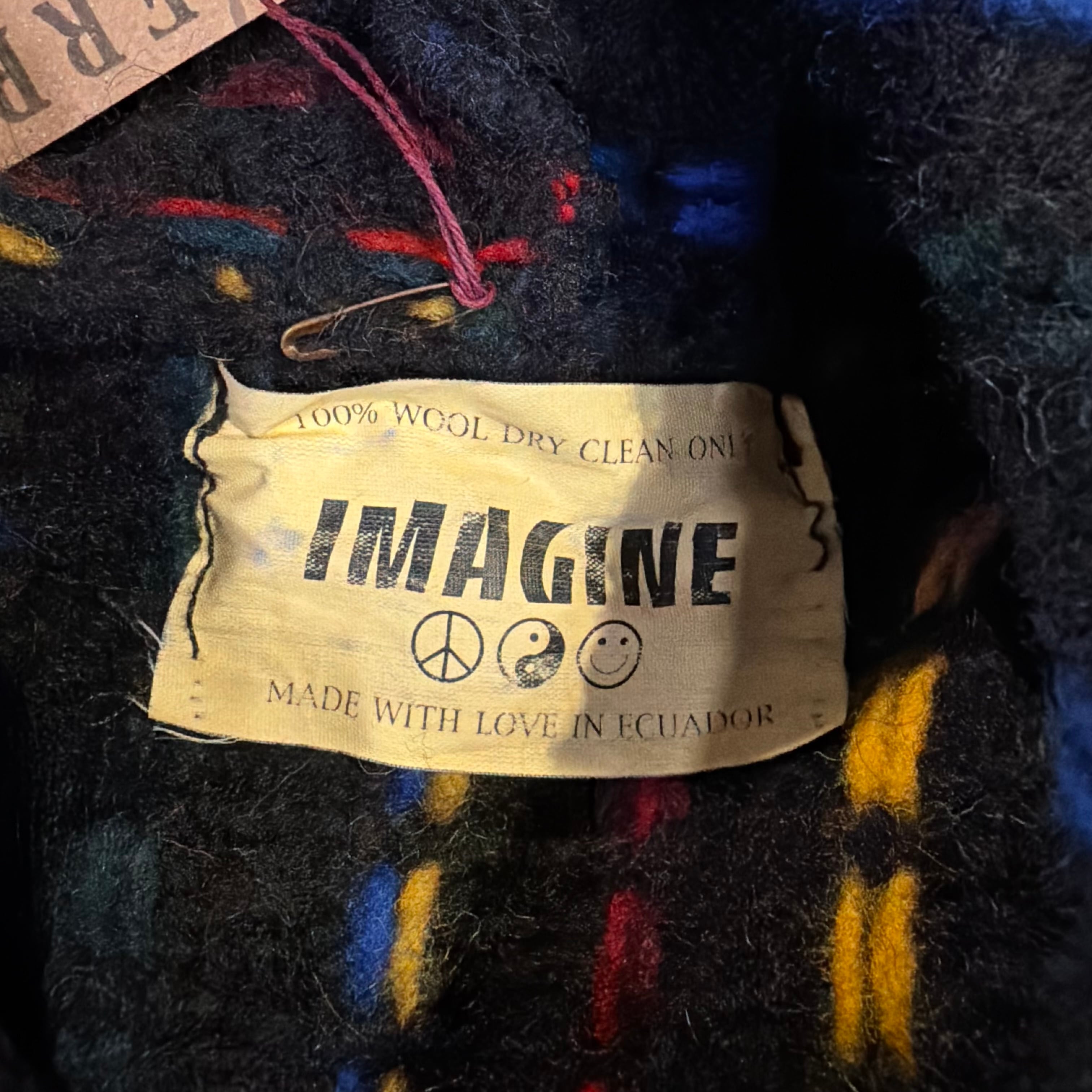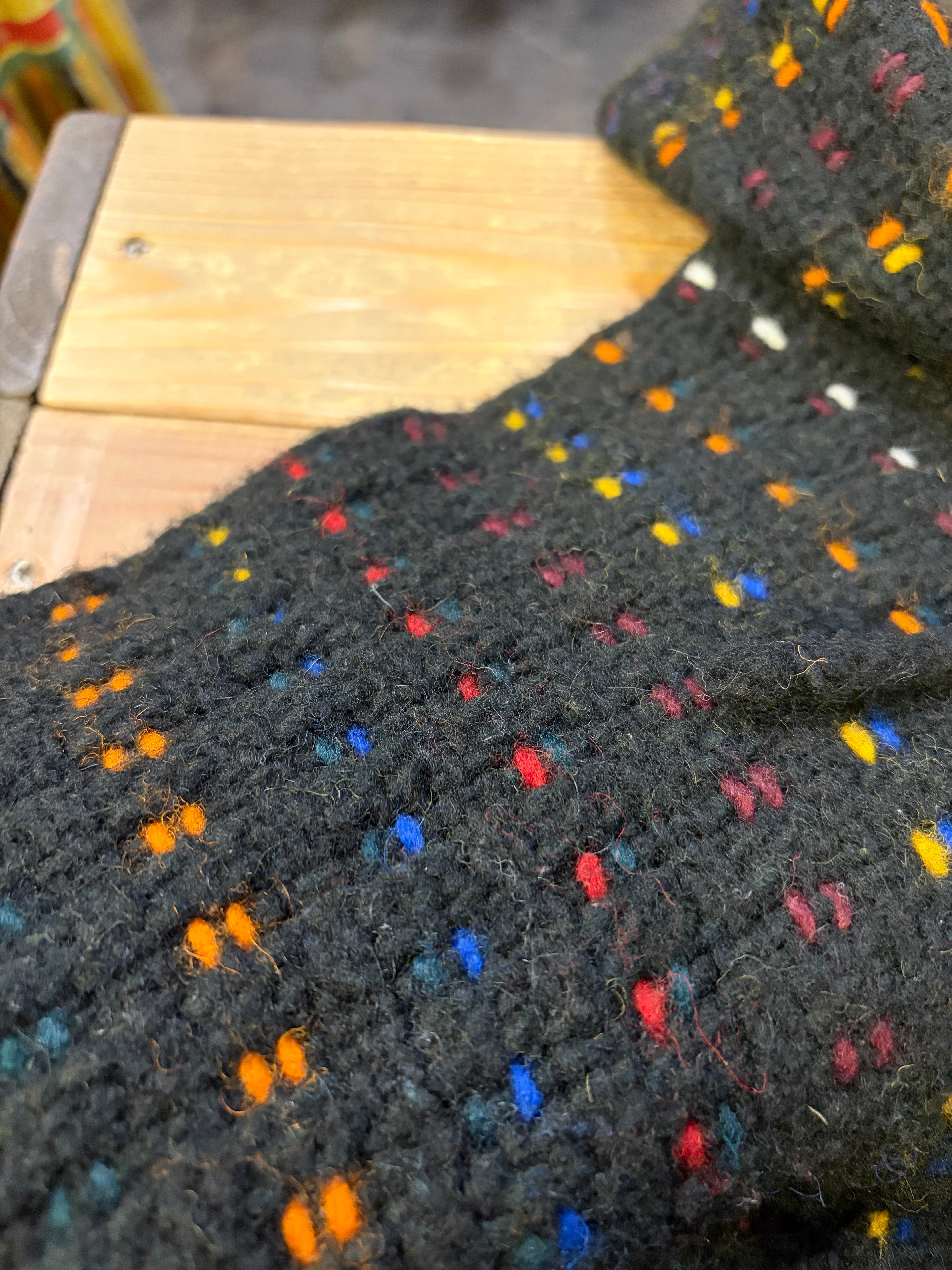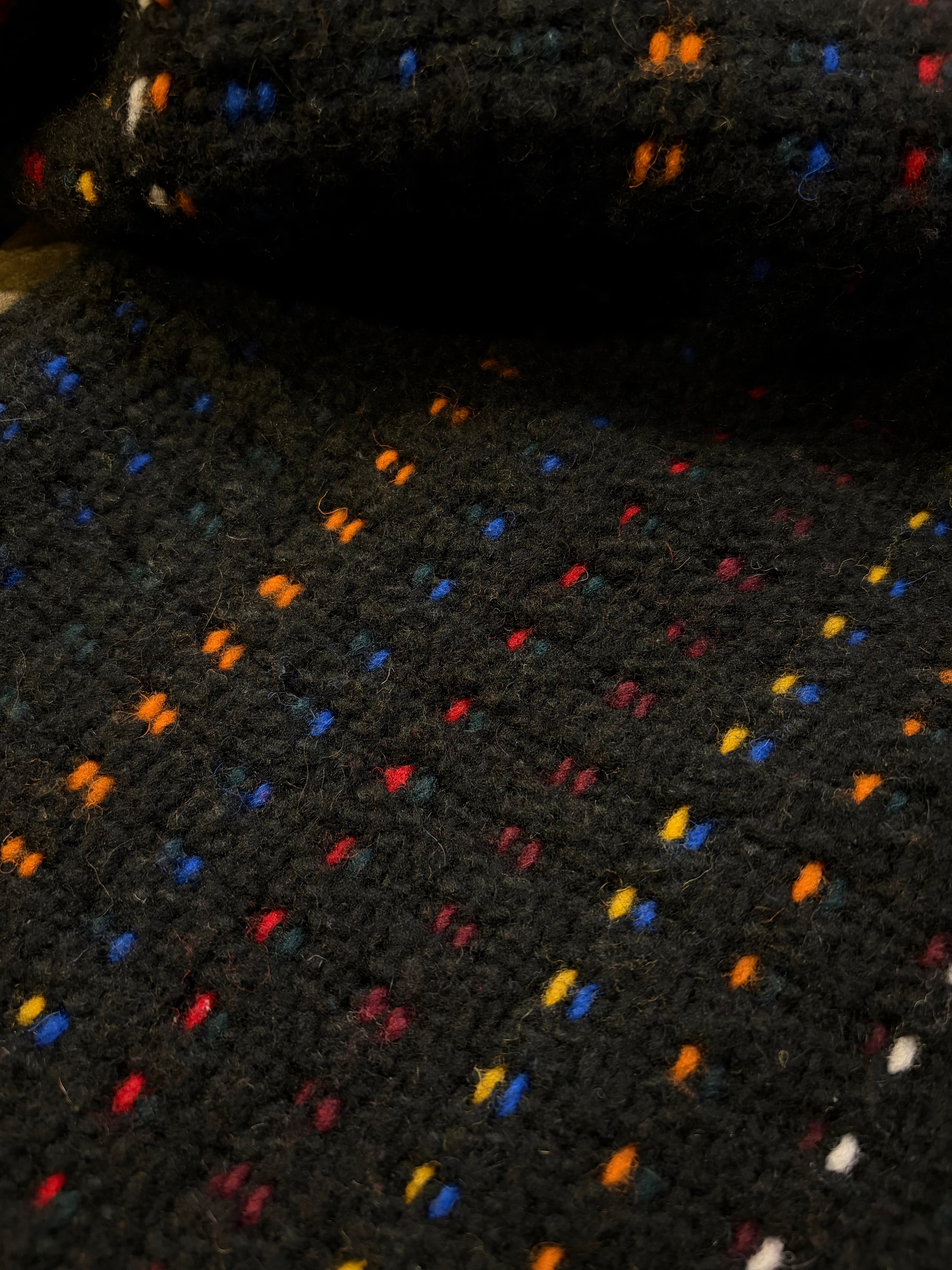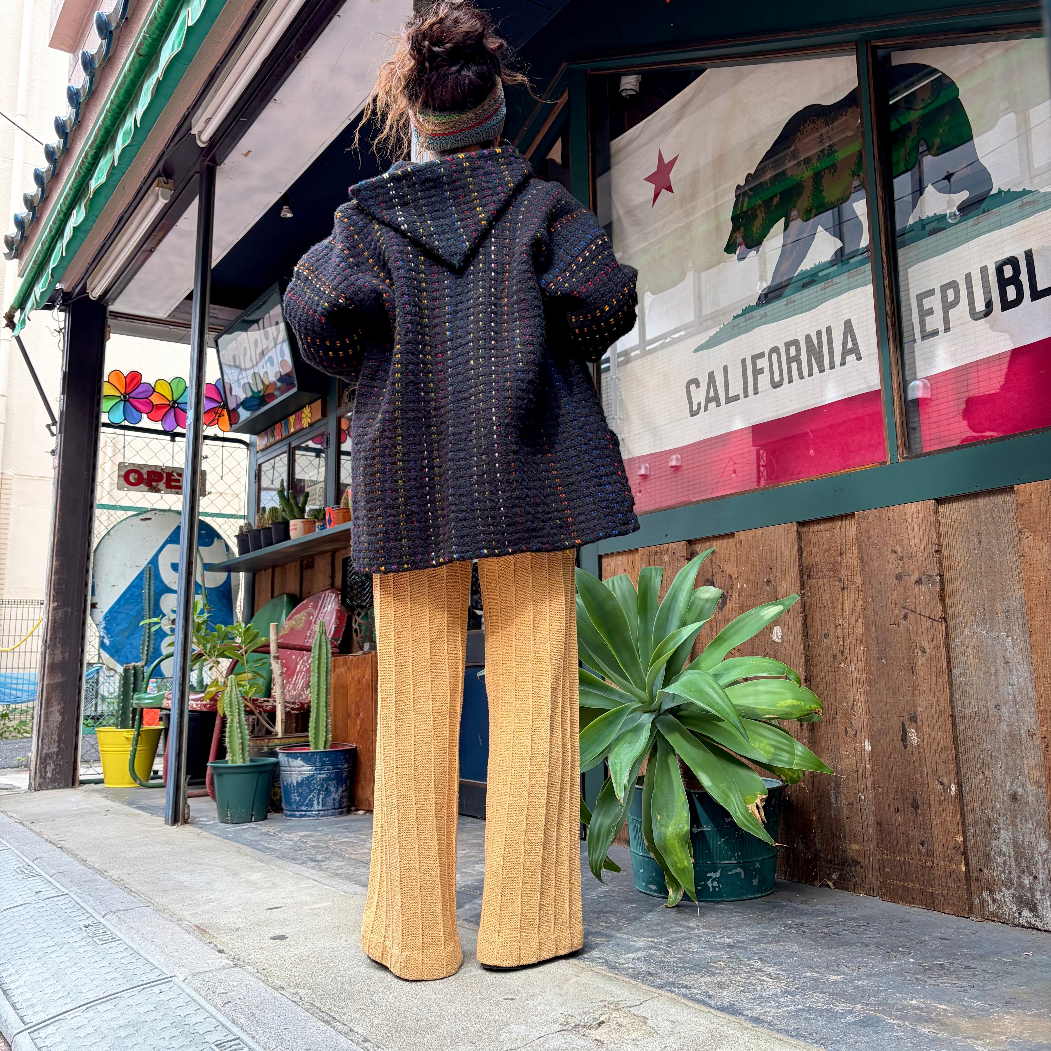 黒ベースにカラフルな毛糸のステッチがかわいいエクアドルのフード付きニットジャケットです。
