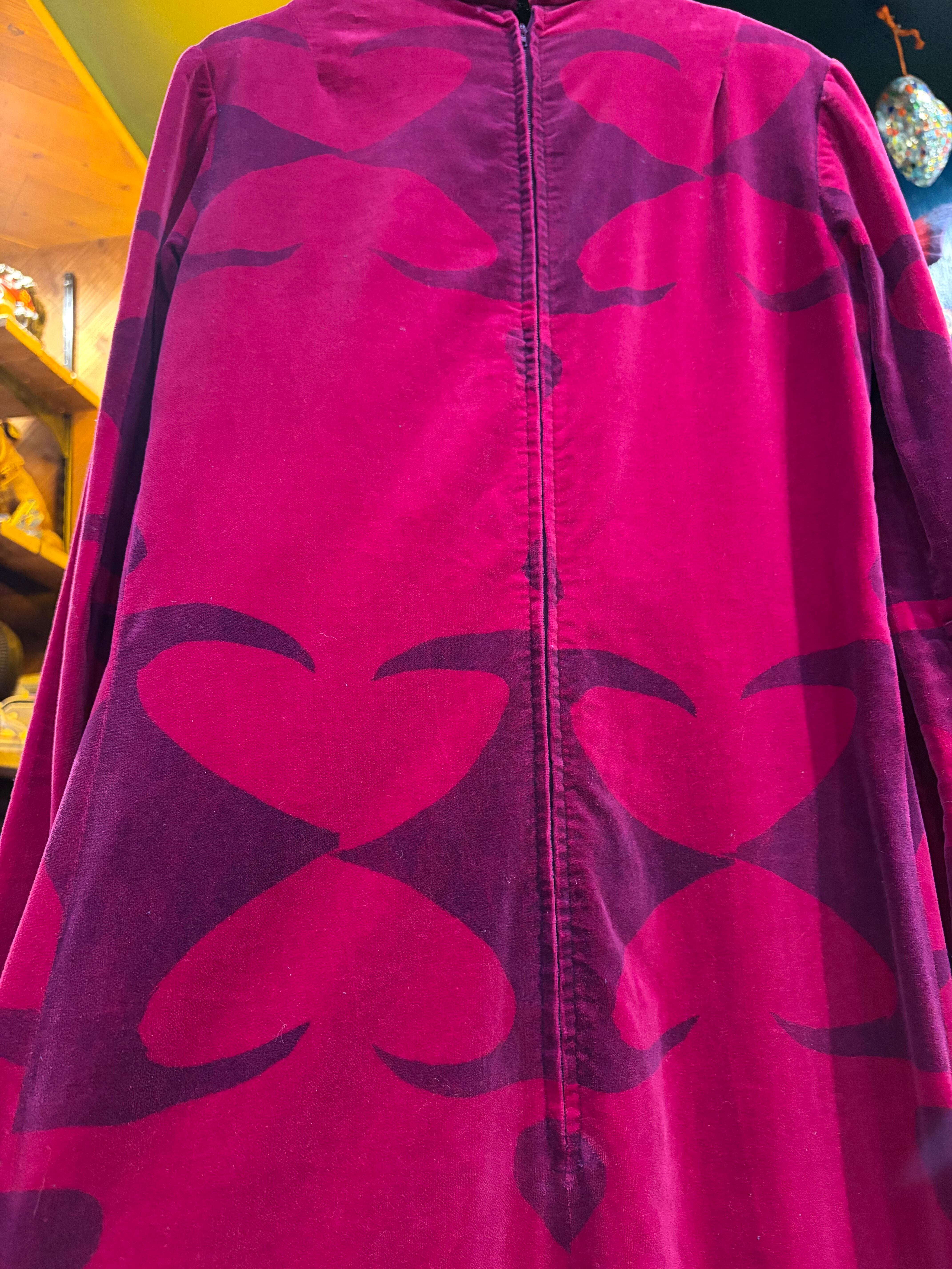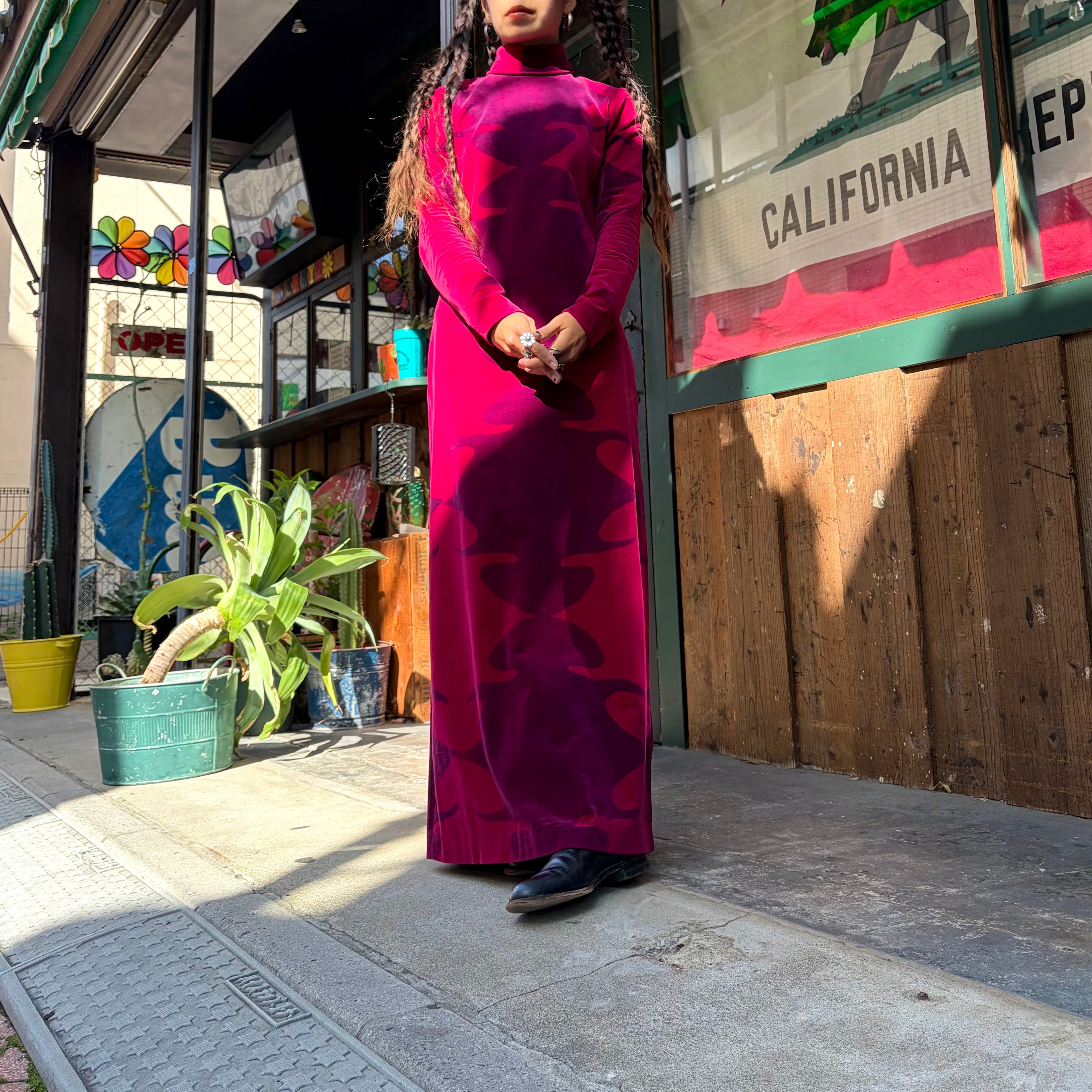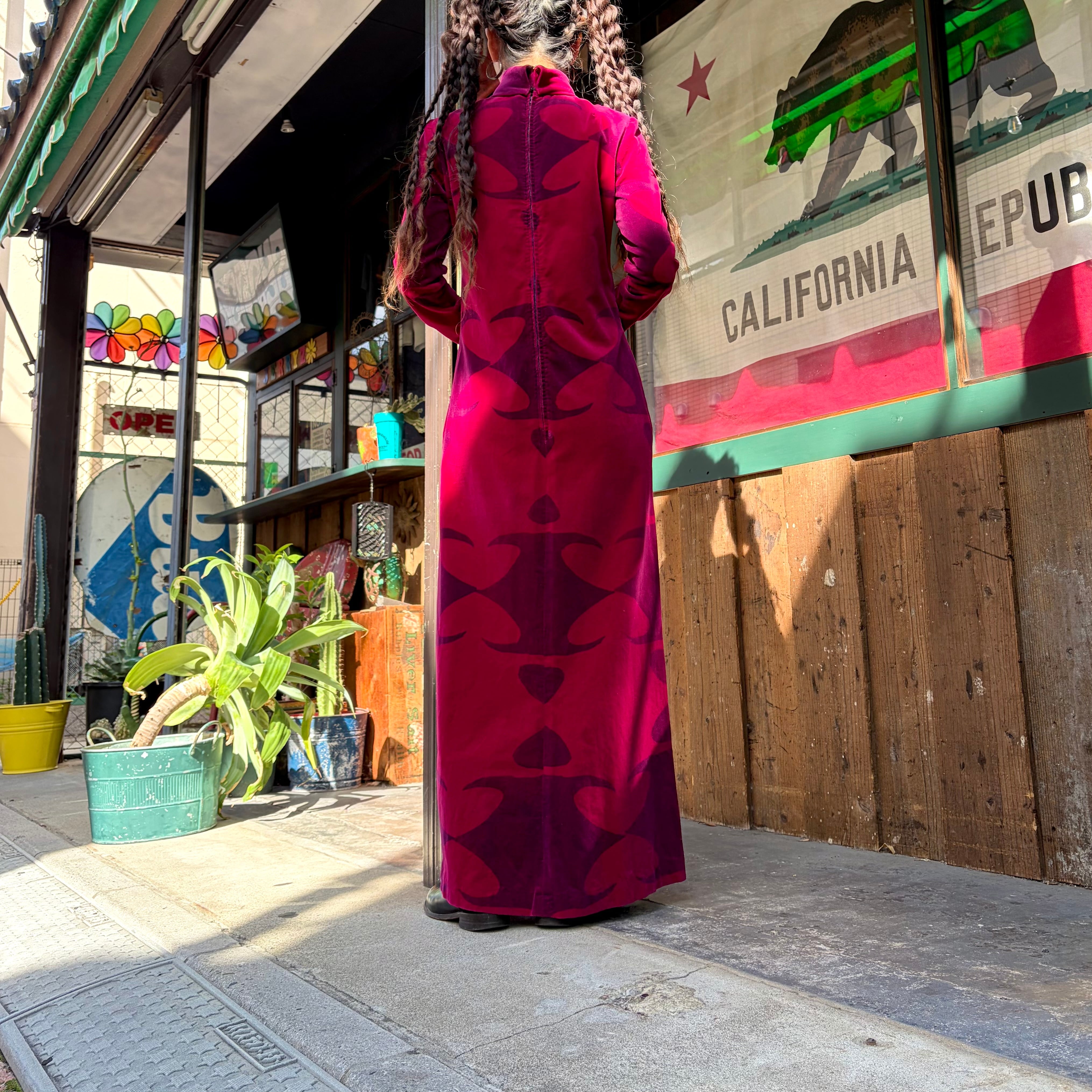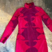 ミッドセンチュリーの家具にありそうなサイケデリックだけど上品でおしゃれな、とても雰囲気のある60〜70年代頃のワンピースです。