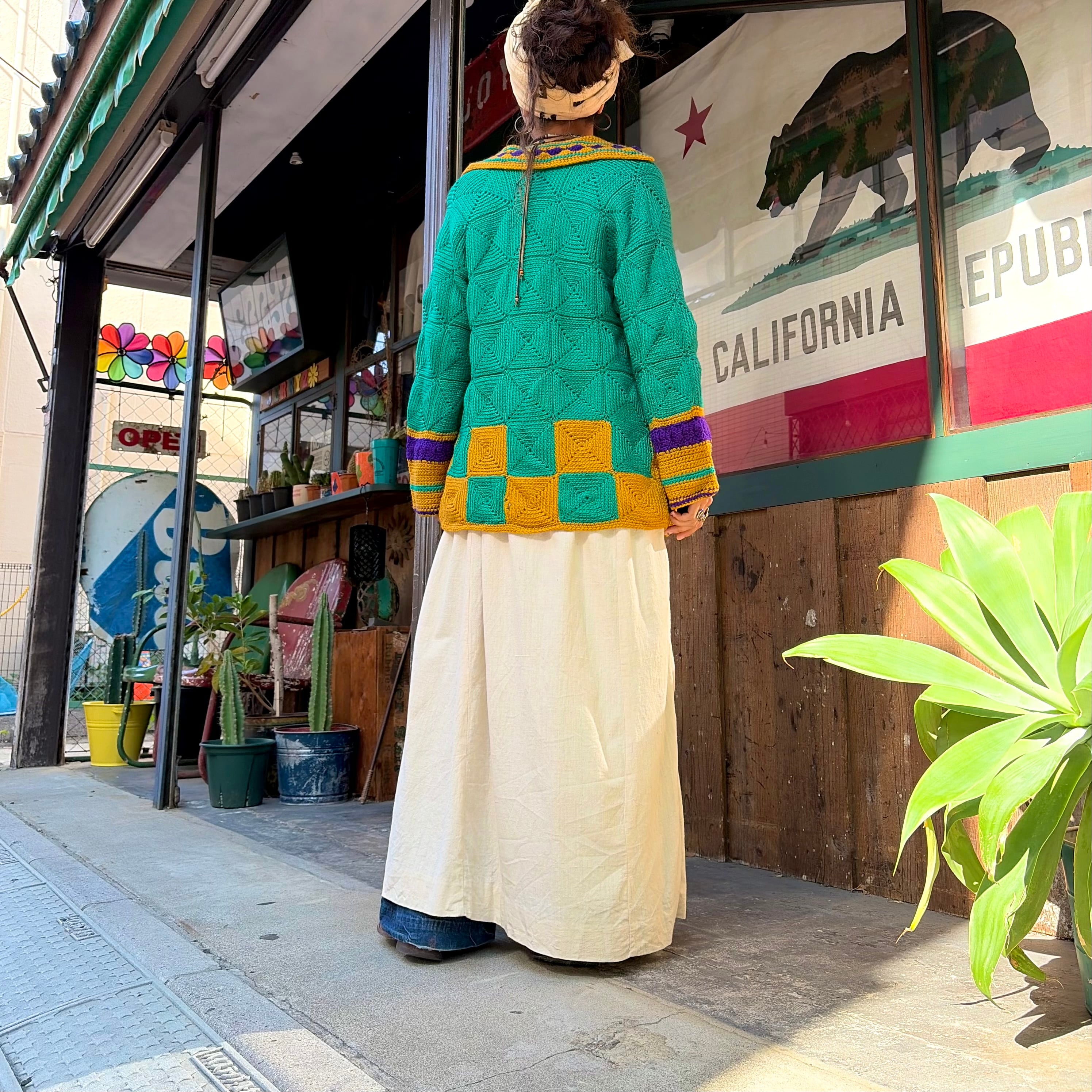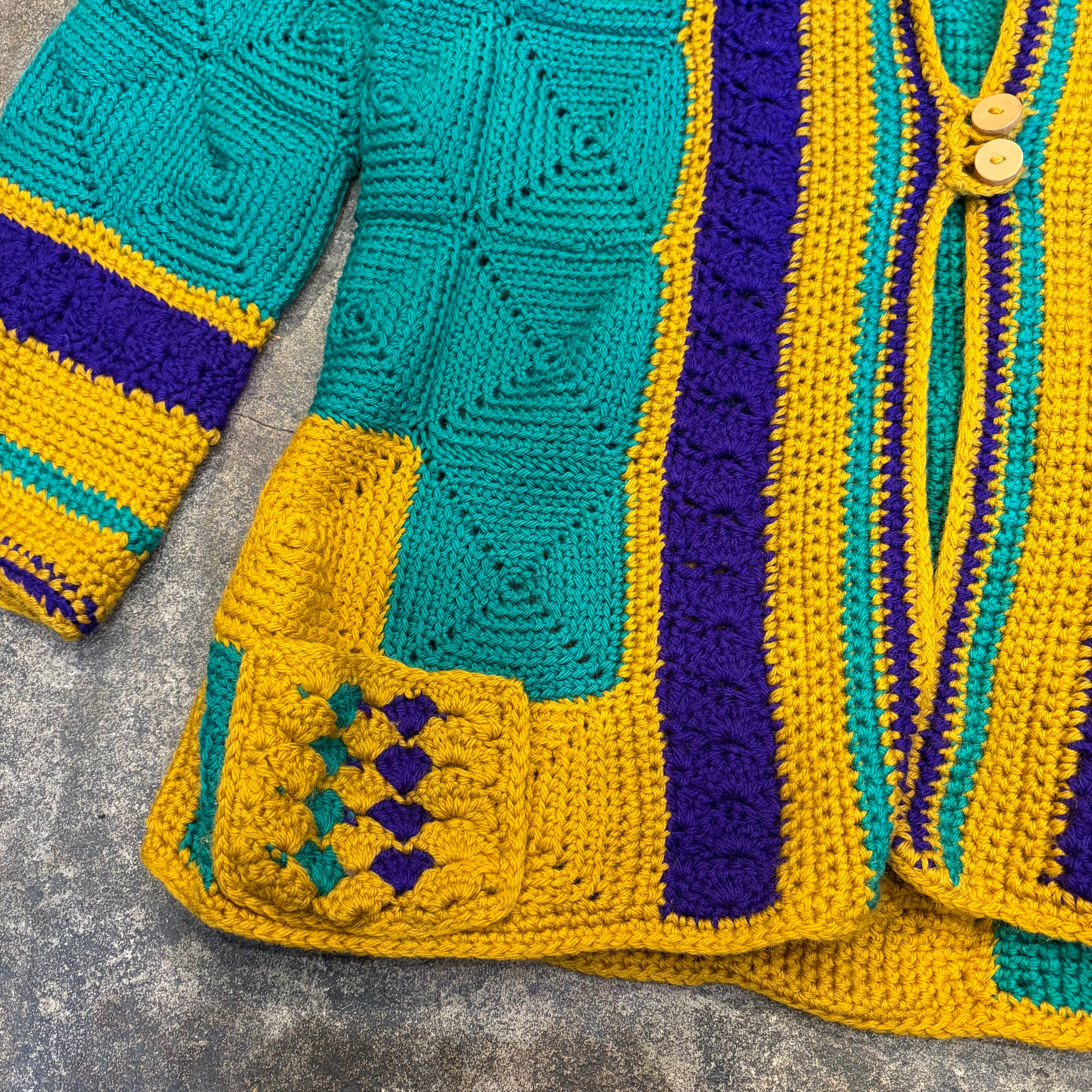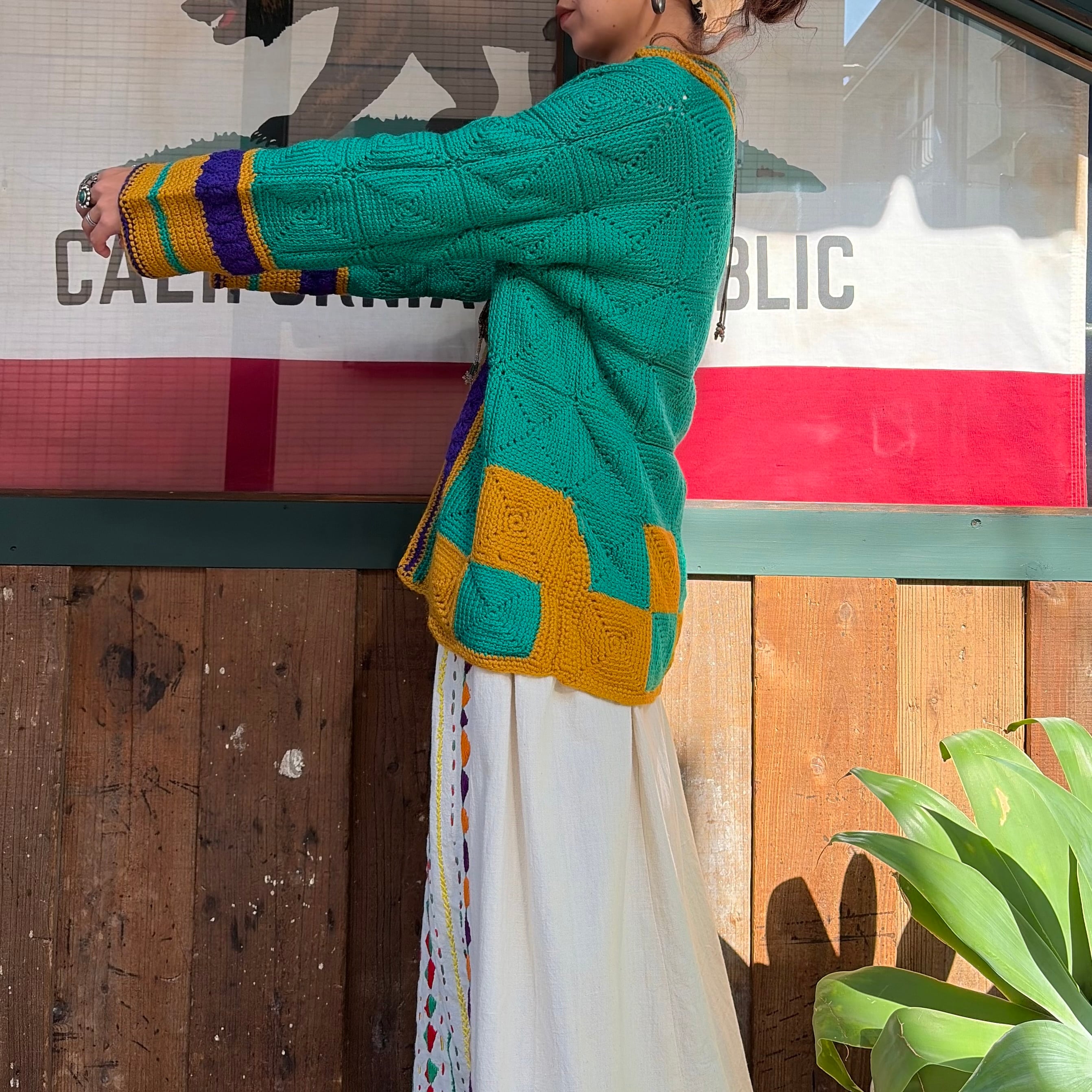 きれいなグリーンとカラシ色とポイントのパープルがとてもかわいい手編みのカーディガンです。