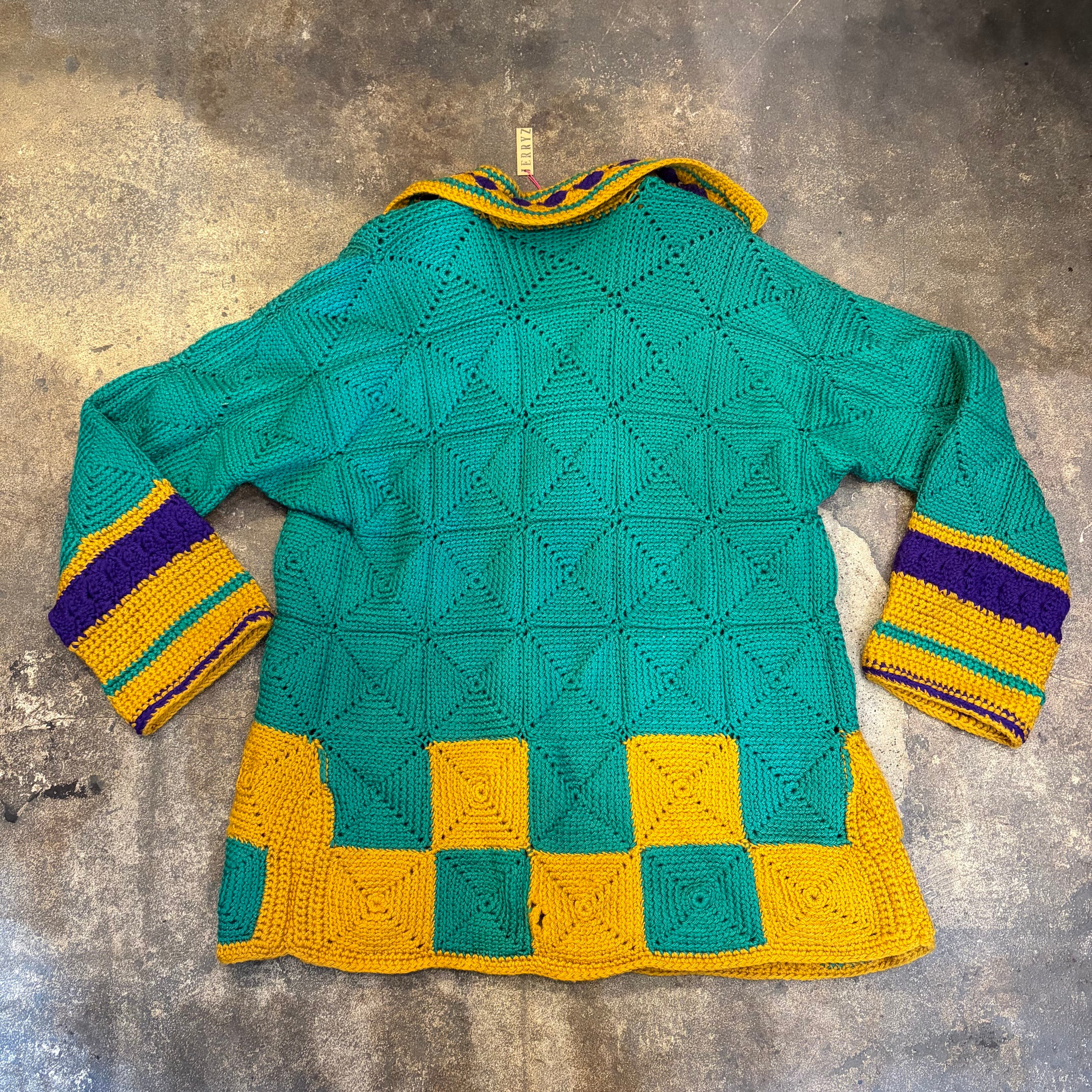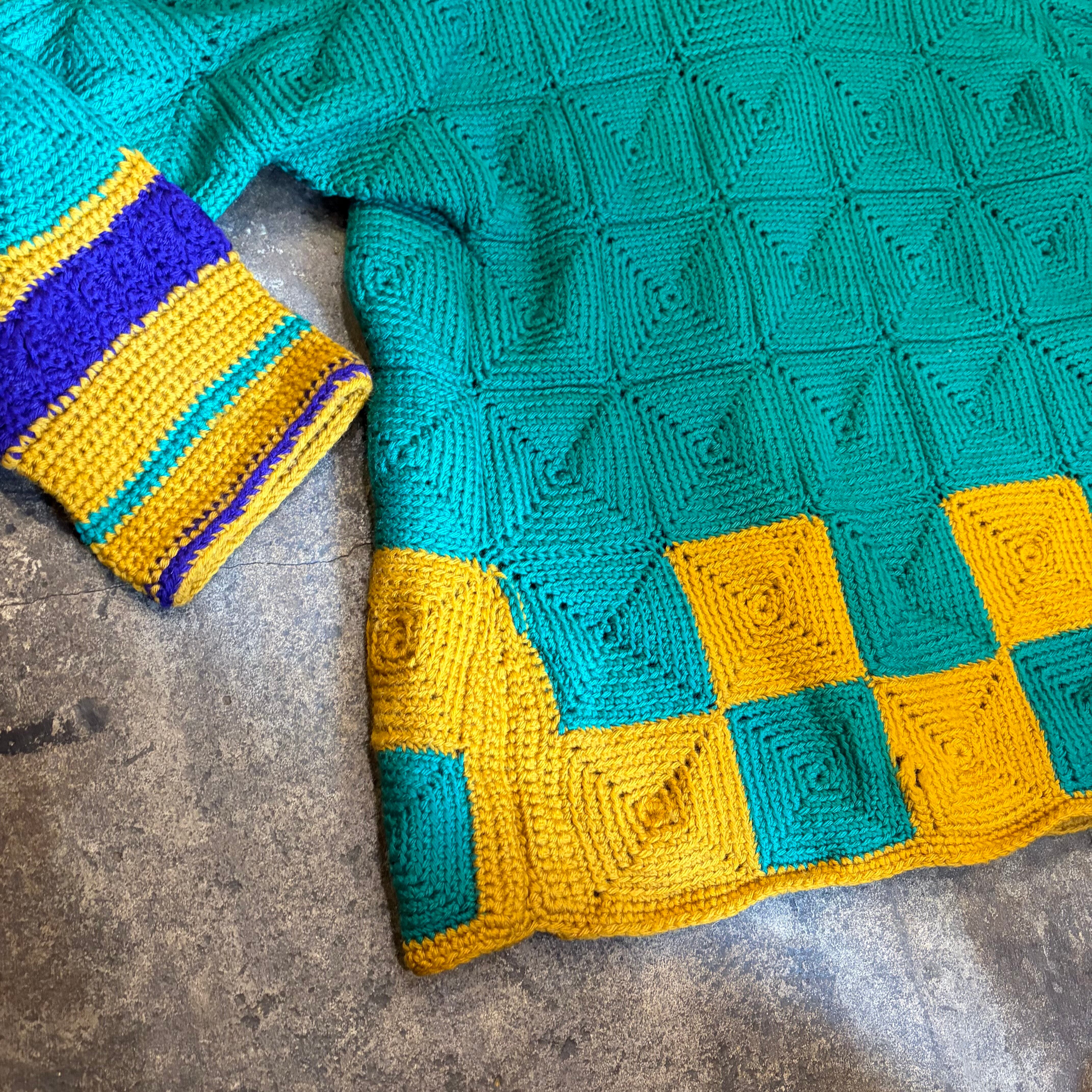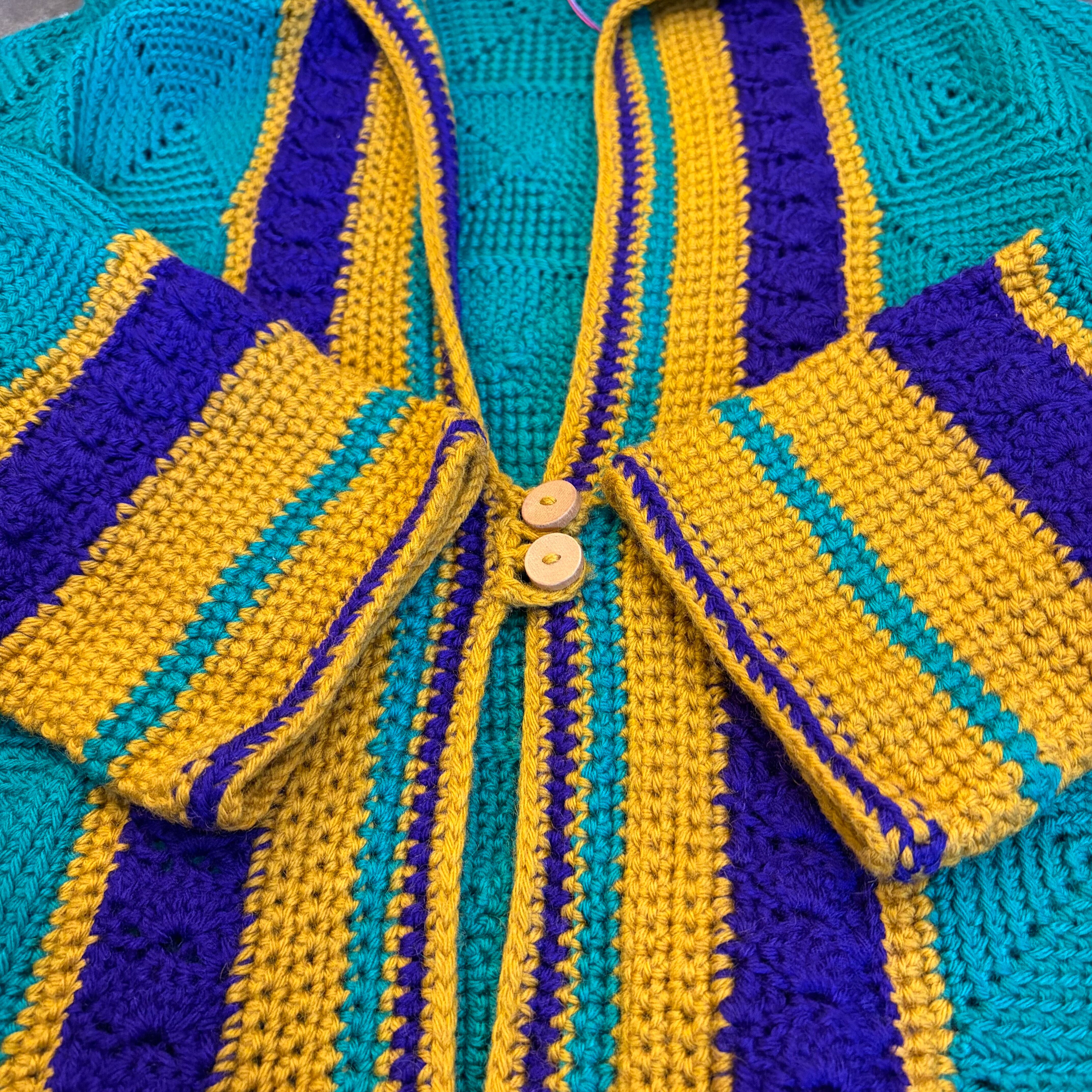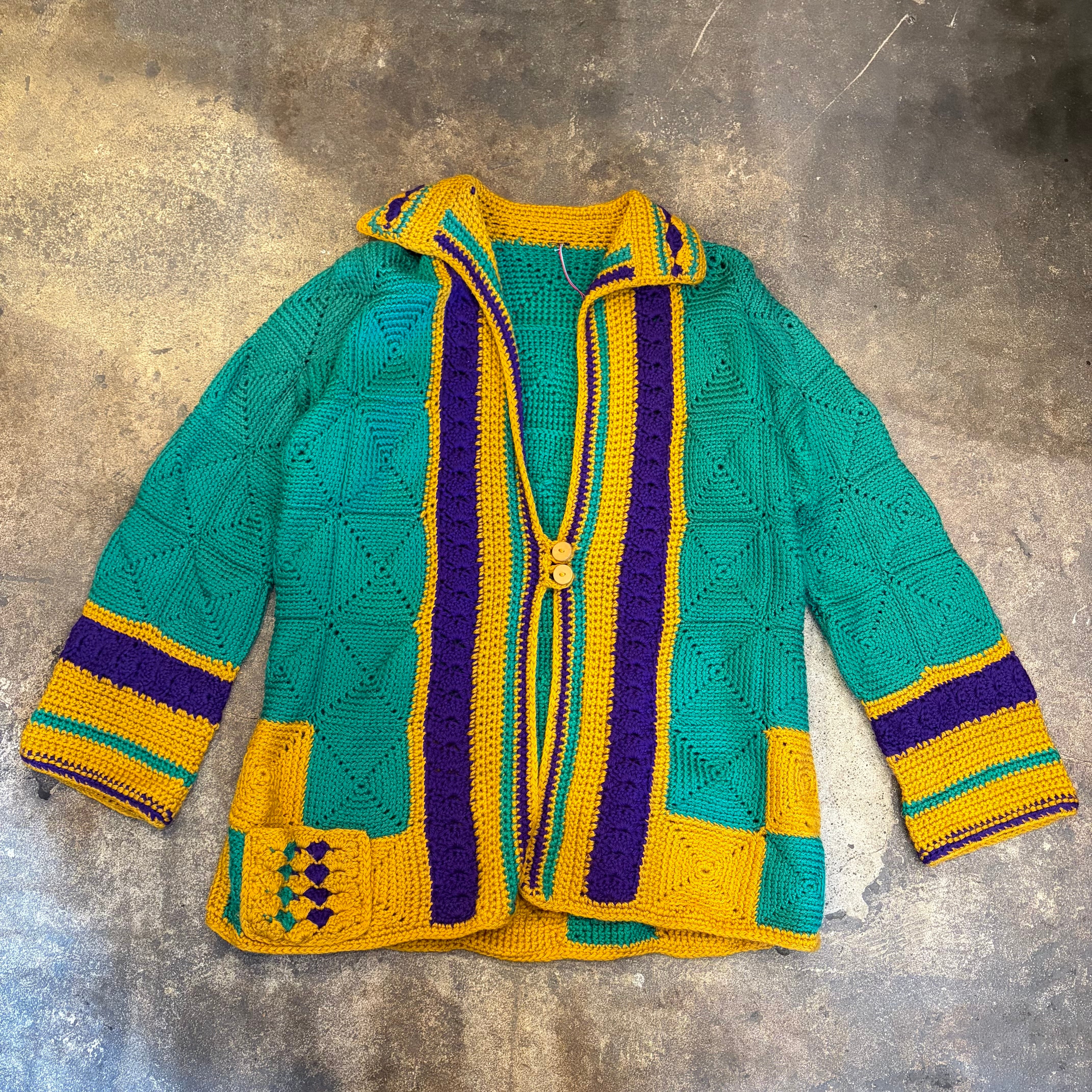 きれいなグリーンとカラシ色とポイントのパープルがとてもかわいい手編みのカーディガンです。