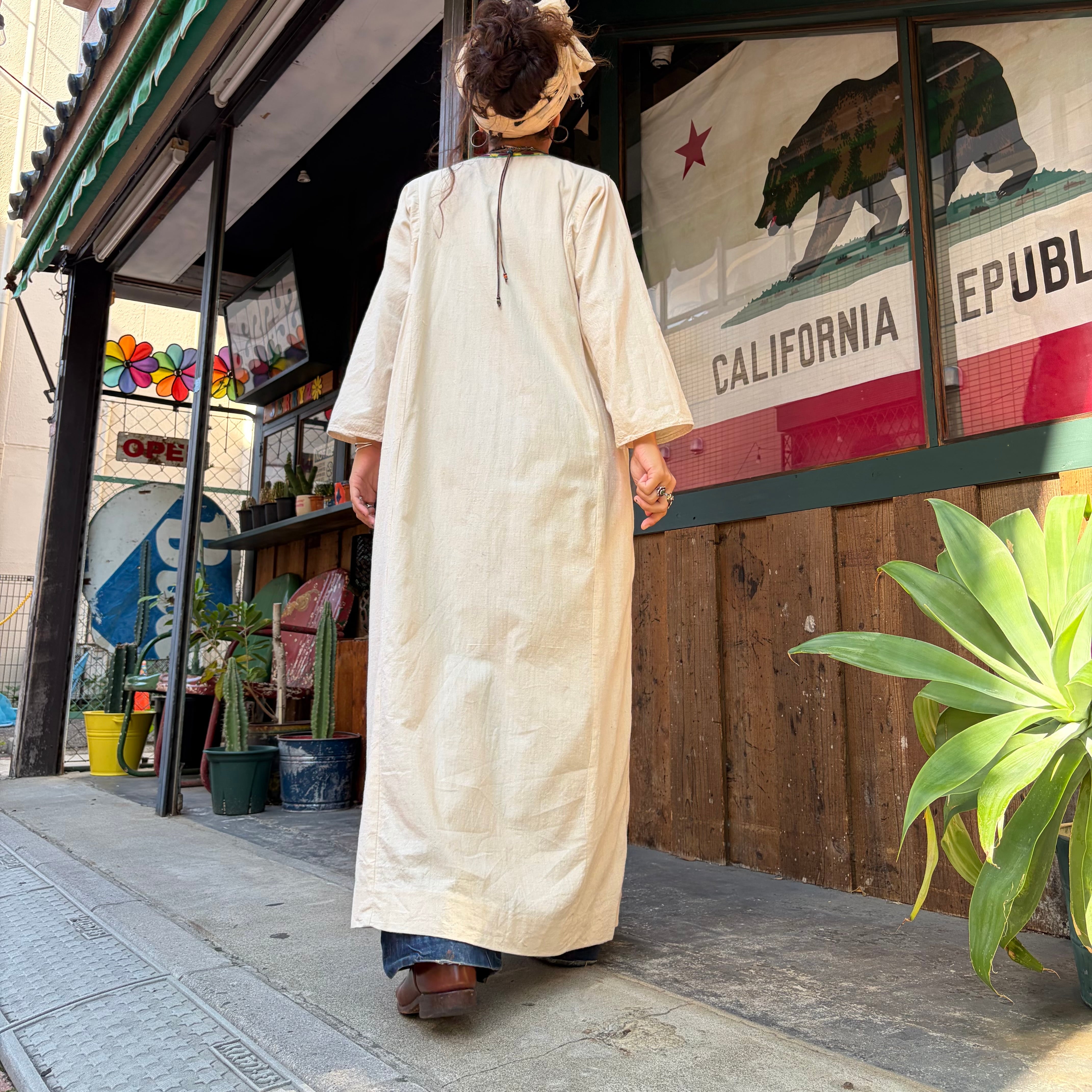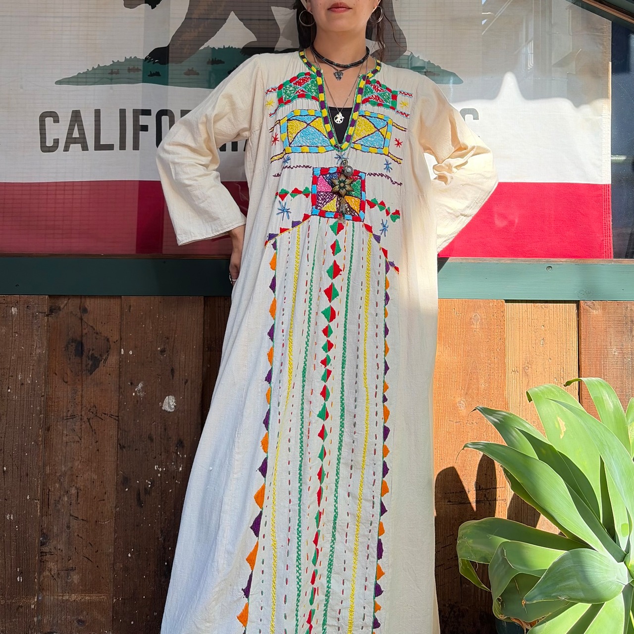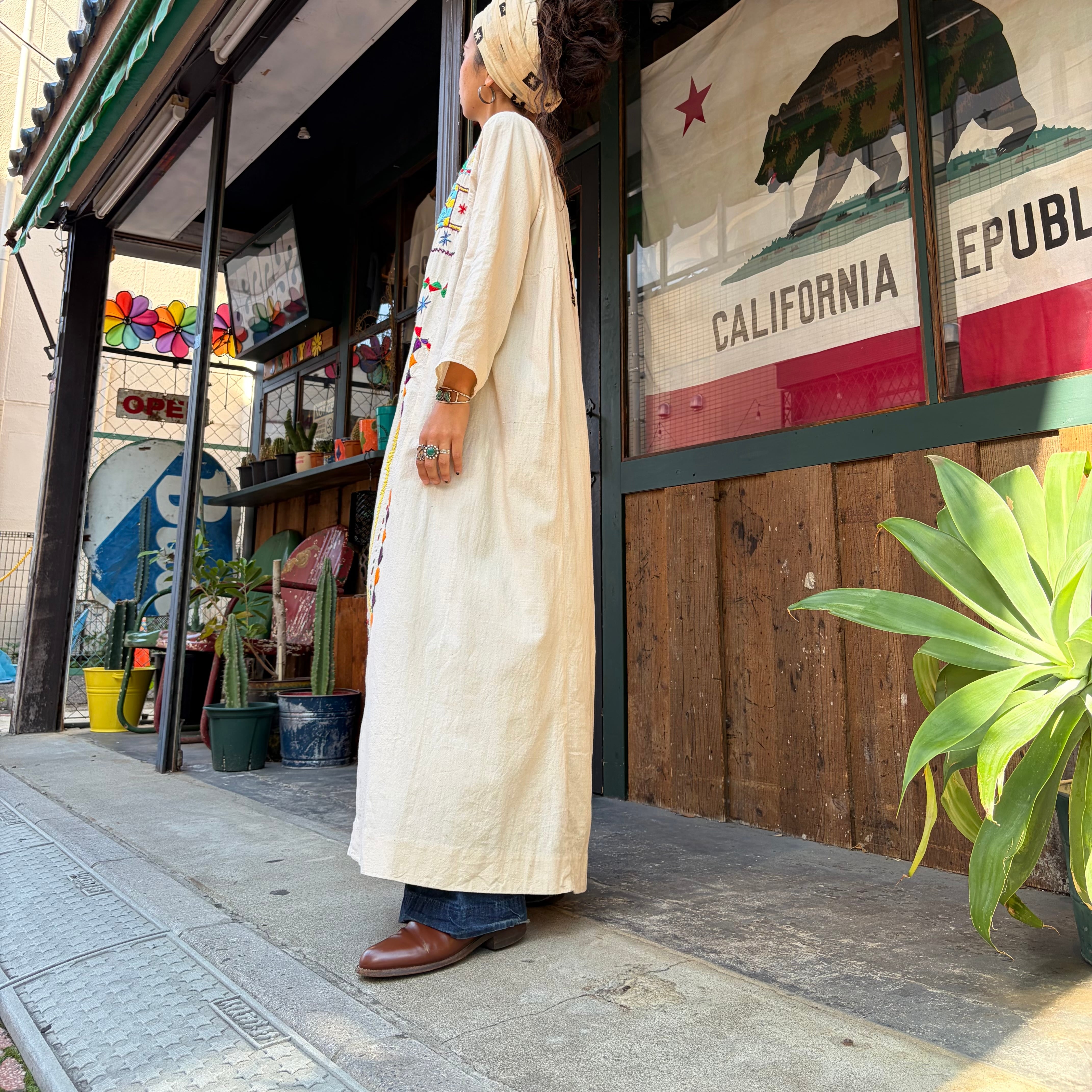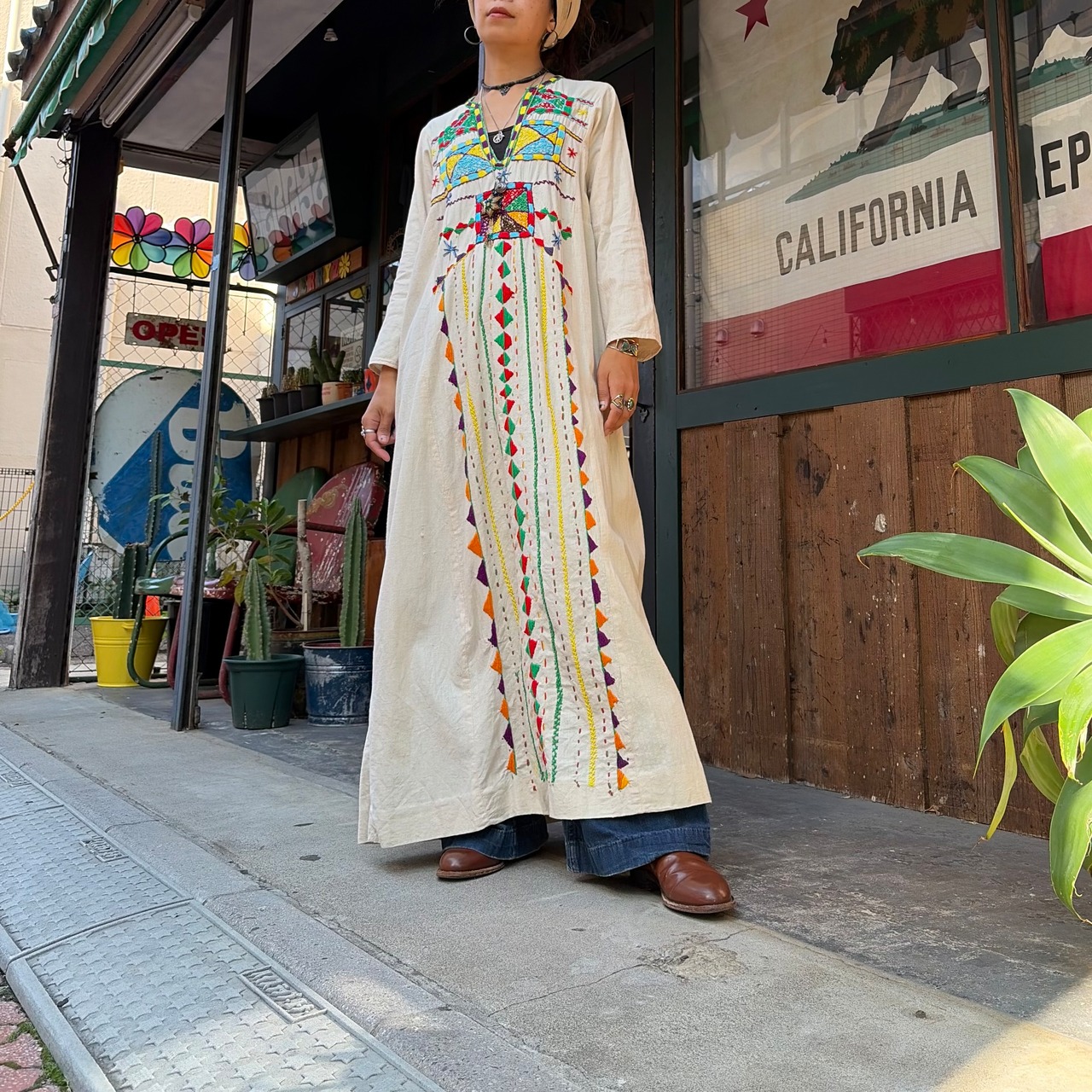 生成り色の柔らかい生地感の温かい雰囲気にカラフルでインパクトのある刺繍がとてもかわいいワンピースです。