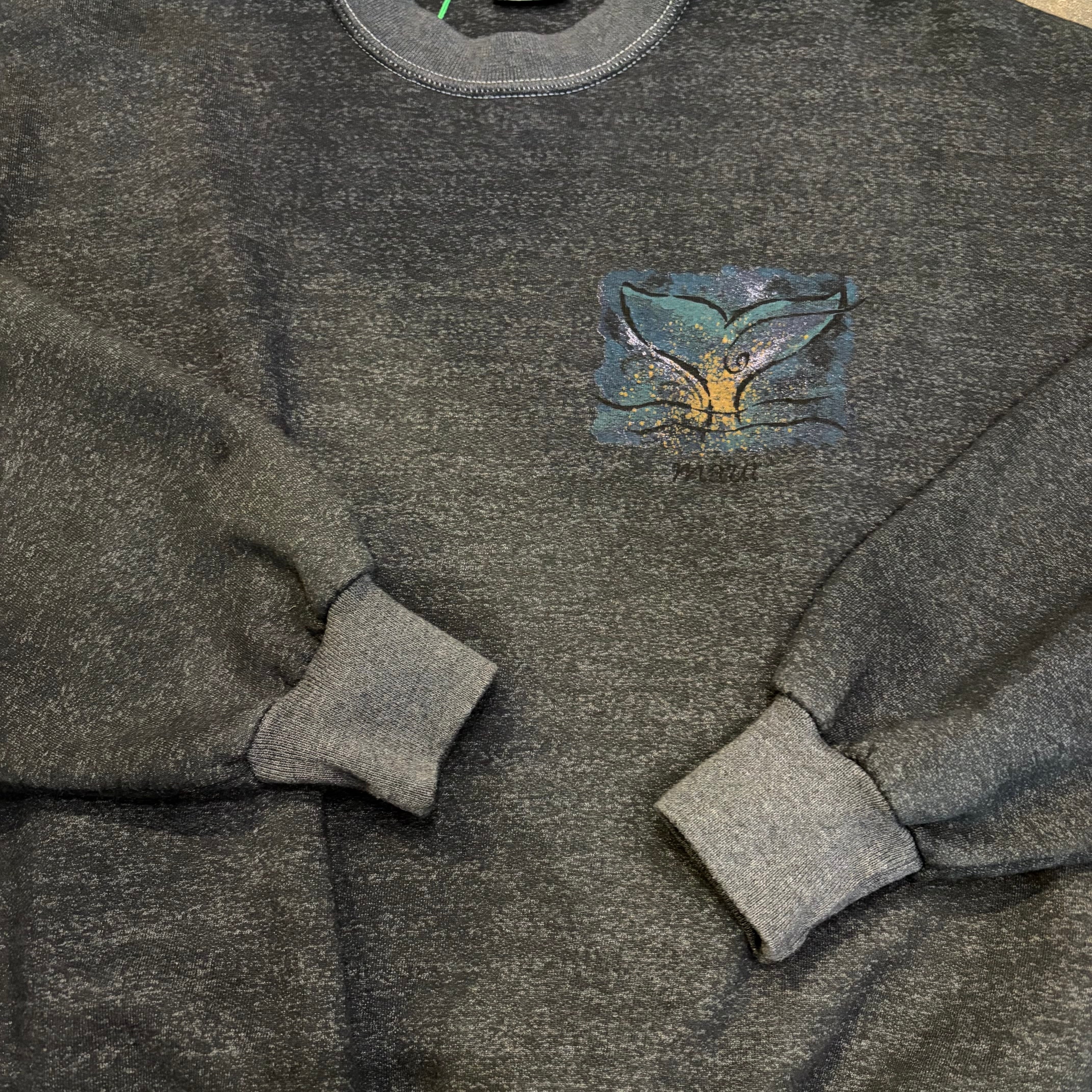 海にクジラと太陽のイラストがさりげなく見えて良い雰囲気です。肩幅も身幅もゆったり広めで裾のリブもしっかりしているので、良いシルエットで着ていただけると思います。