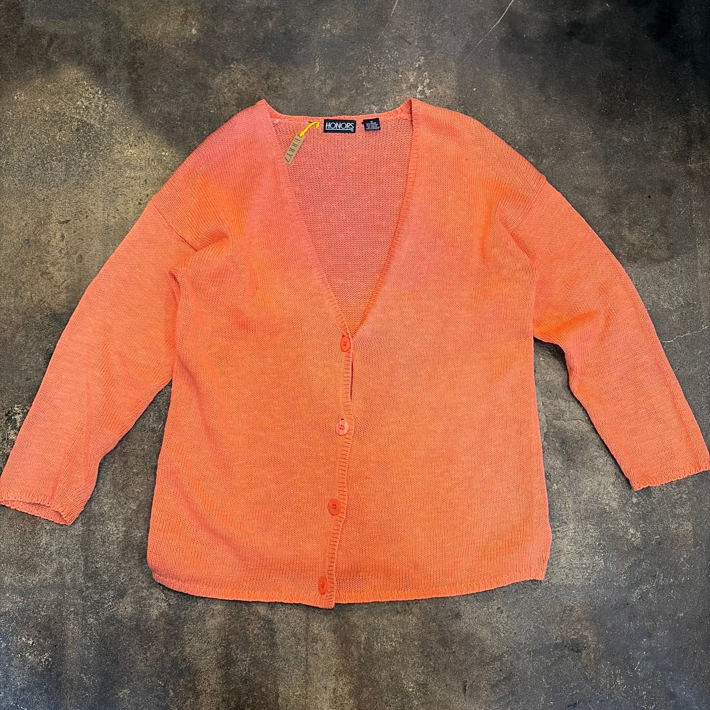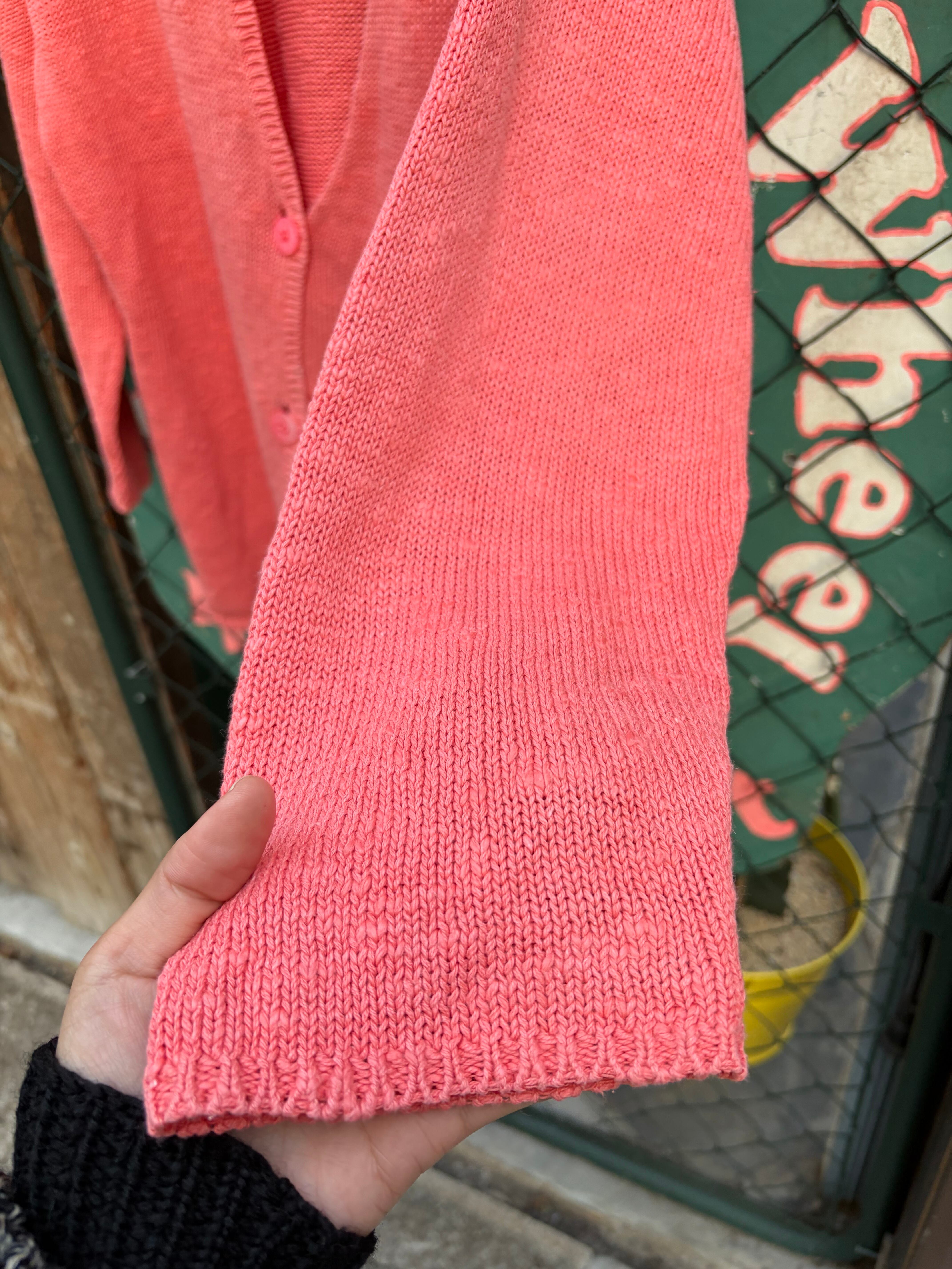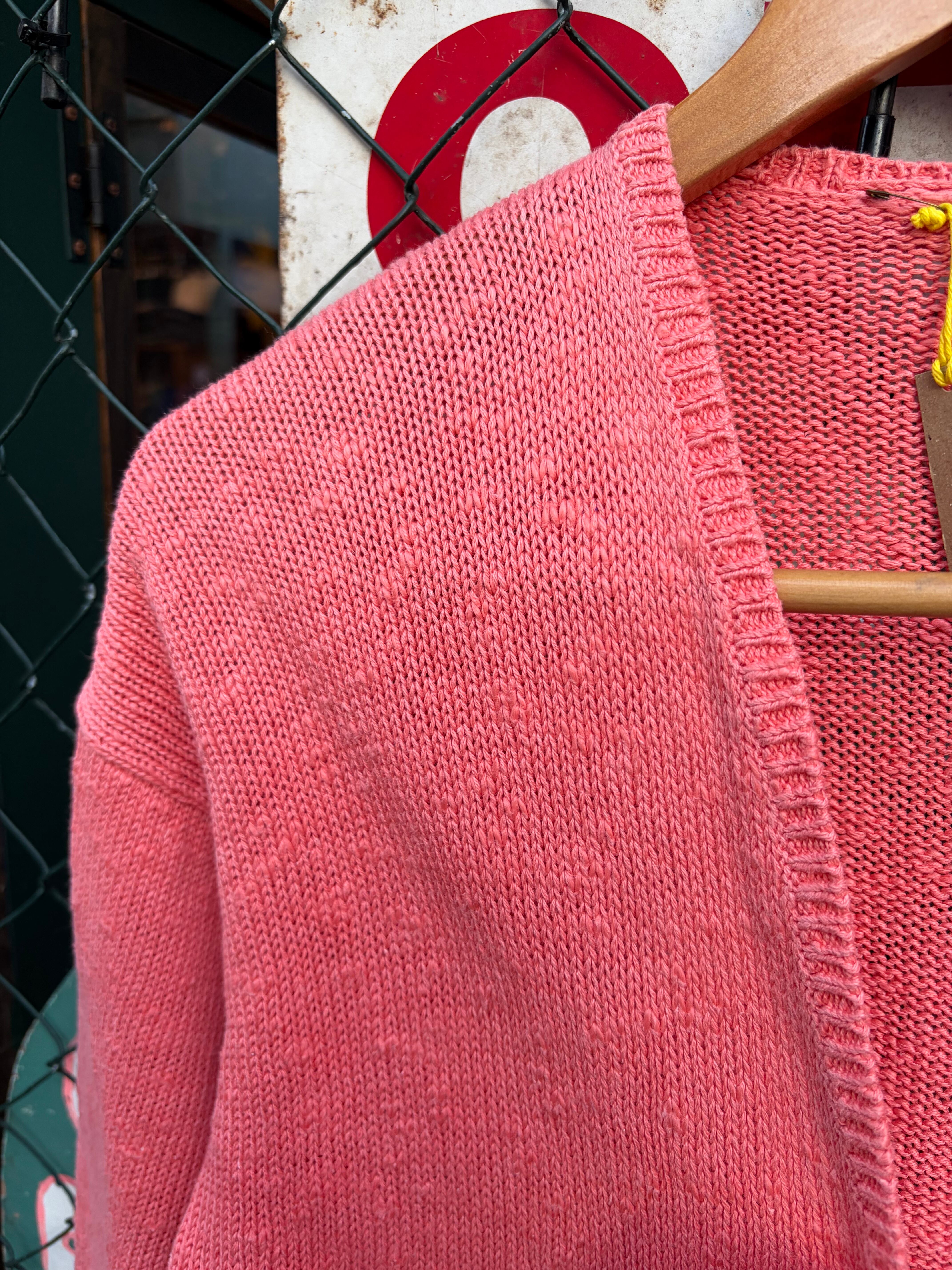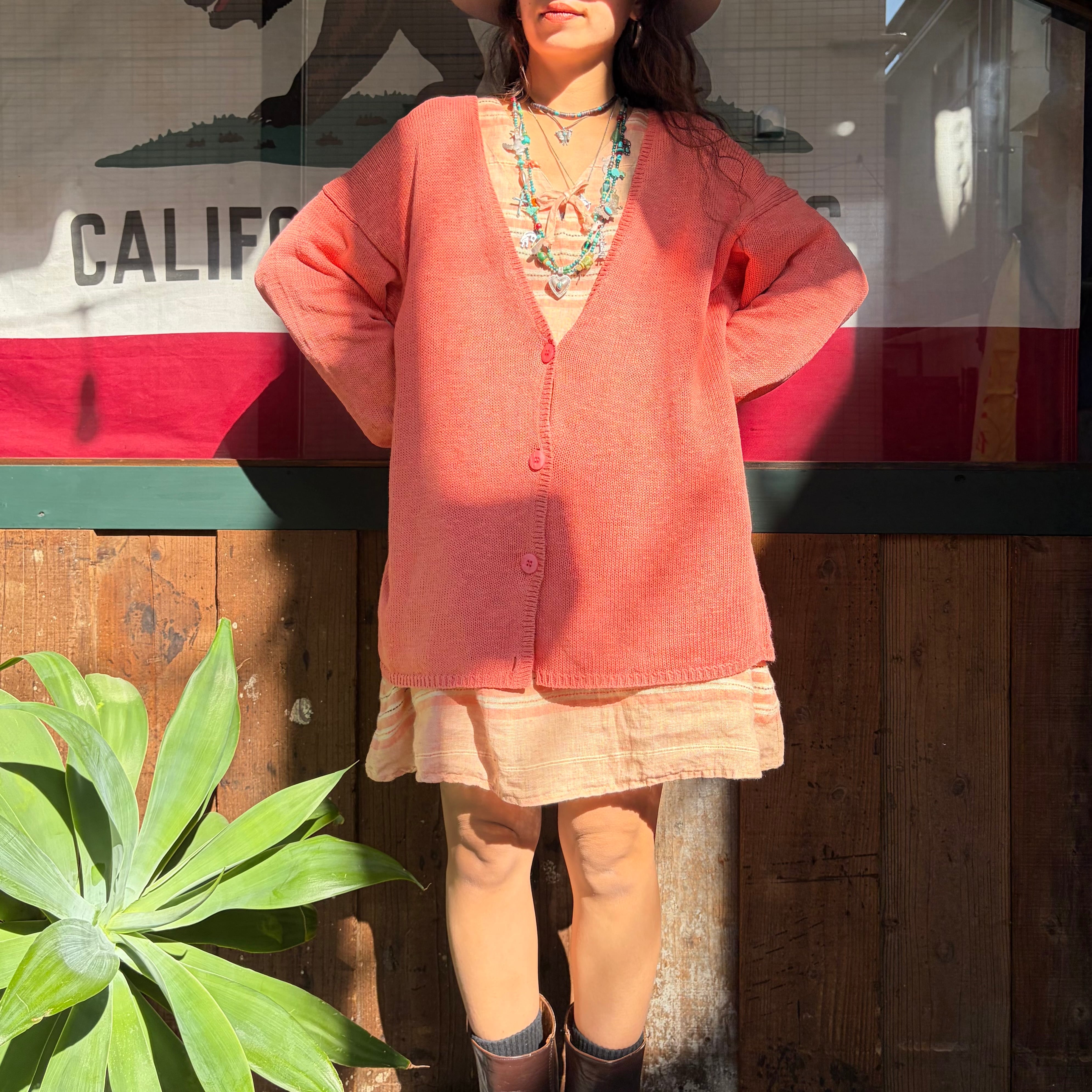 柔らかいピンクのゆったりルーズなシルエットがかわいいニットカーディガンです。