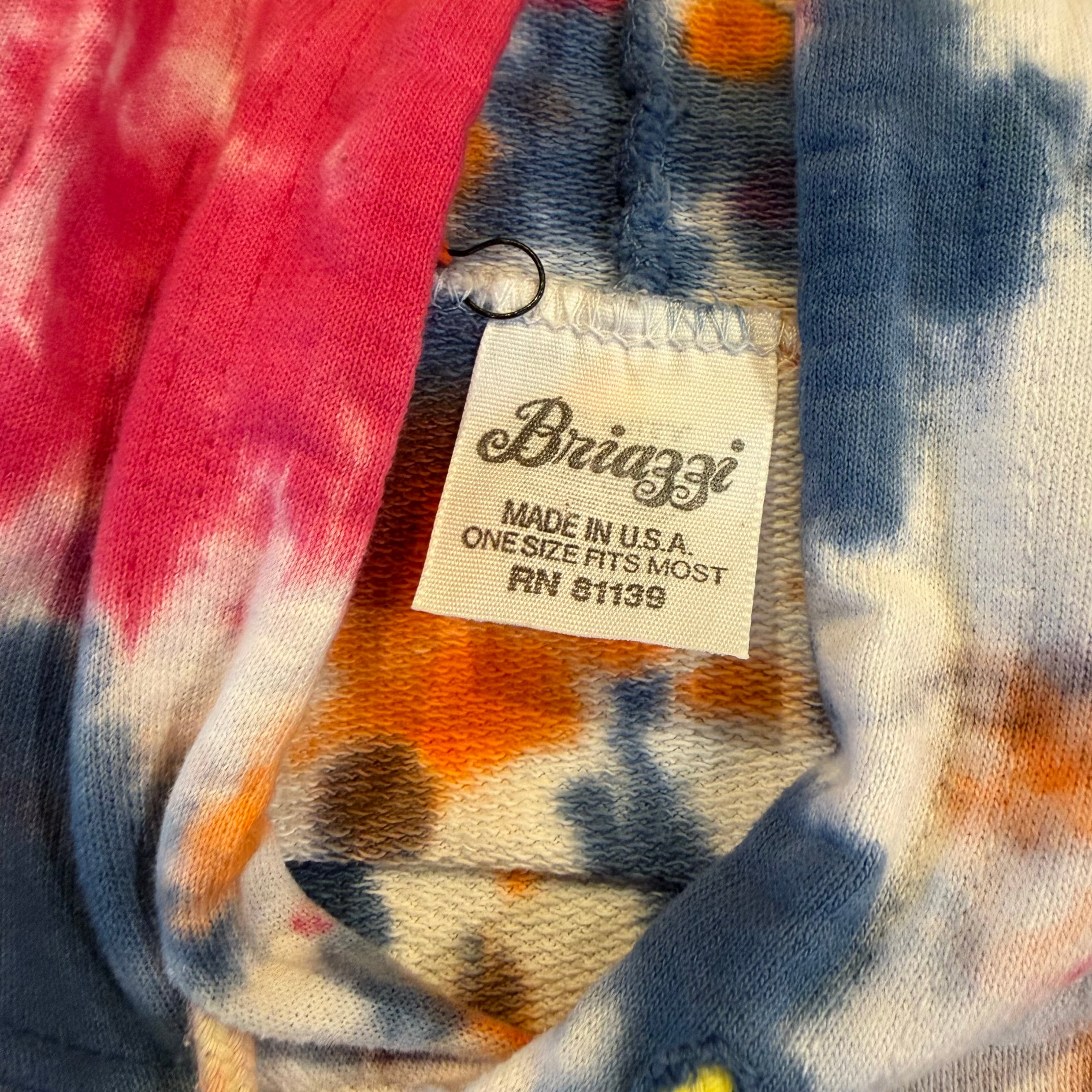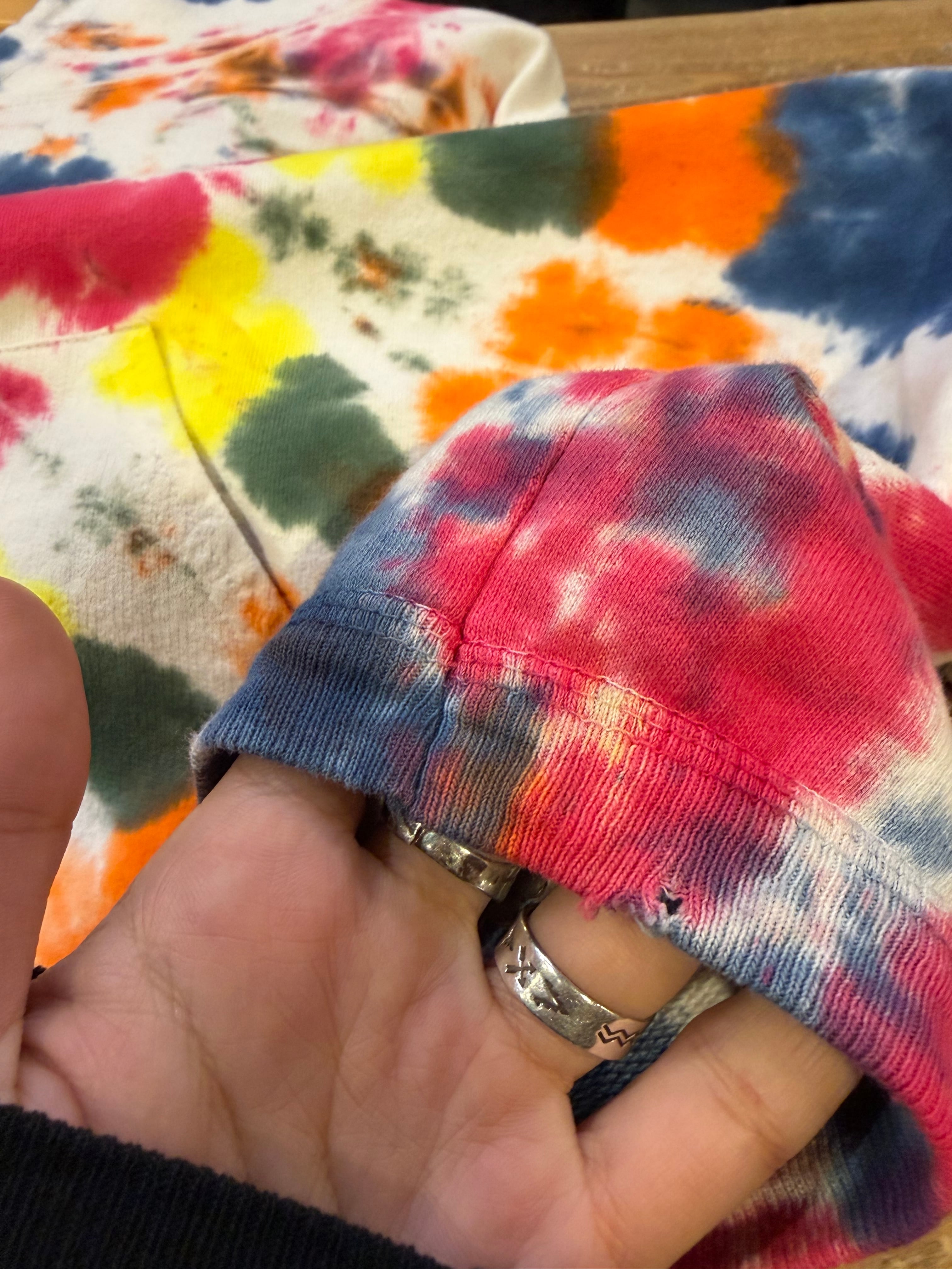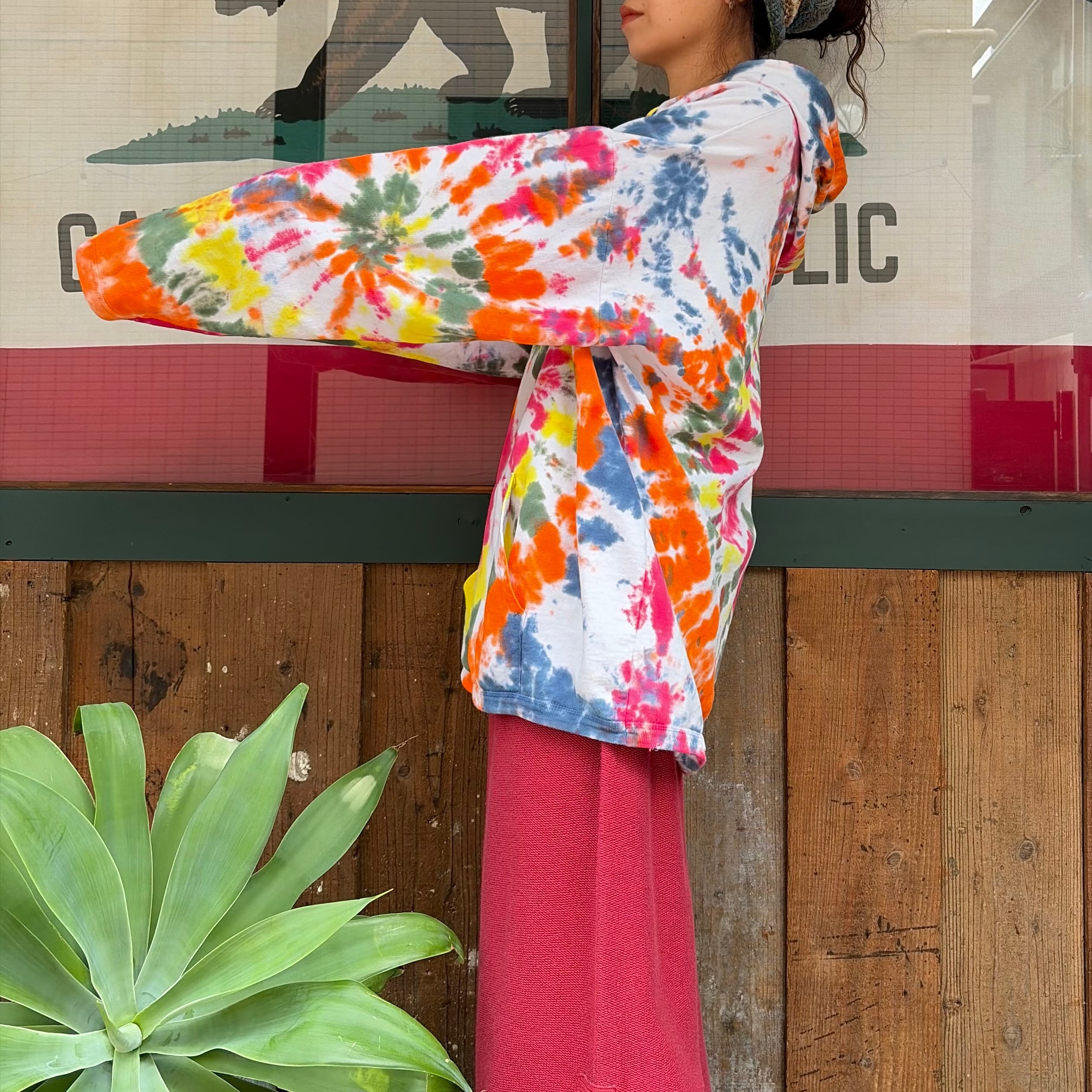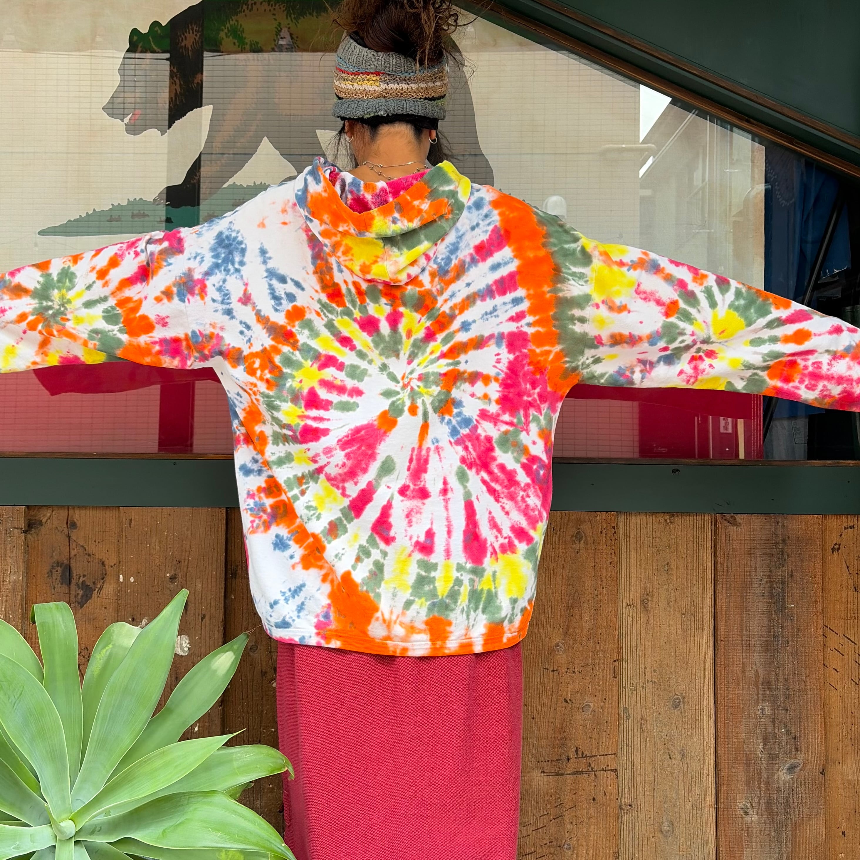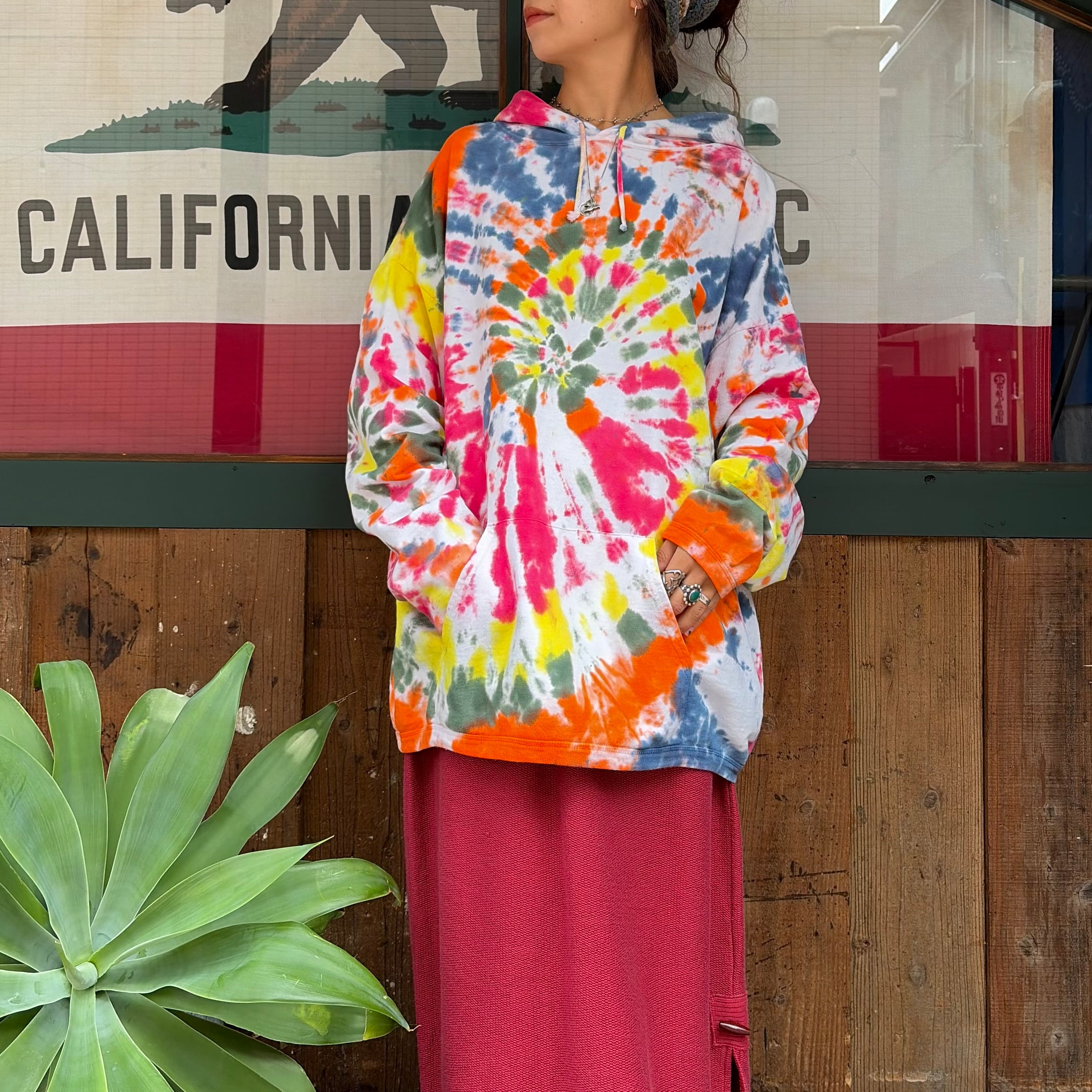 結構色味の激しめなタイダイがかわいいパーカーです。タイダイがかわいいのはもちろんなのですが、普通のスウェットより生地が薄手で、ゆったりオーバーサイズなシルエット、裾も袖口もリブで絞られずストーンと落ちる感じのボディ自体がとても良い感じの一着です。