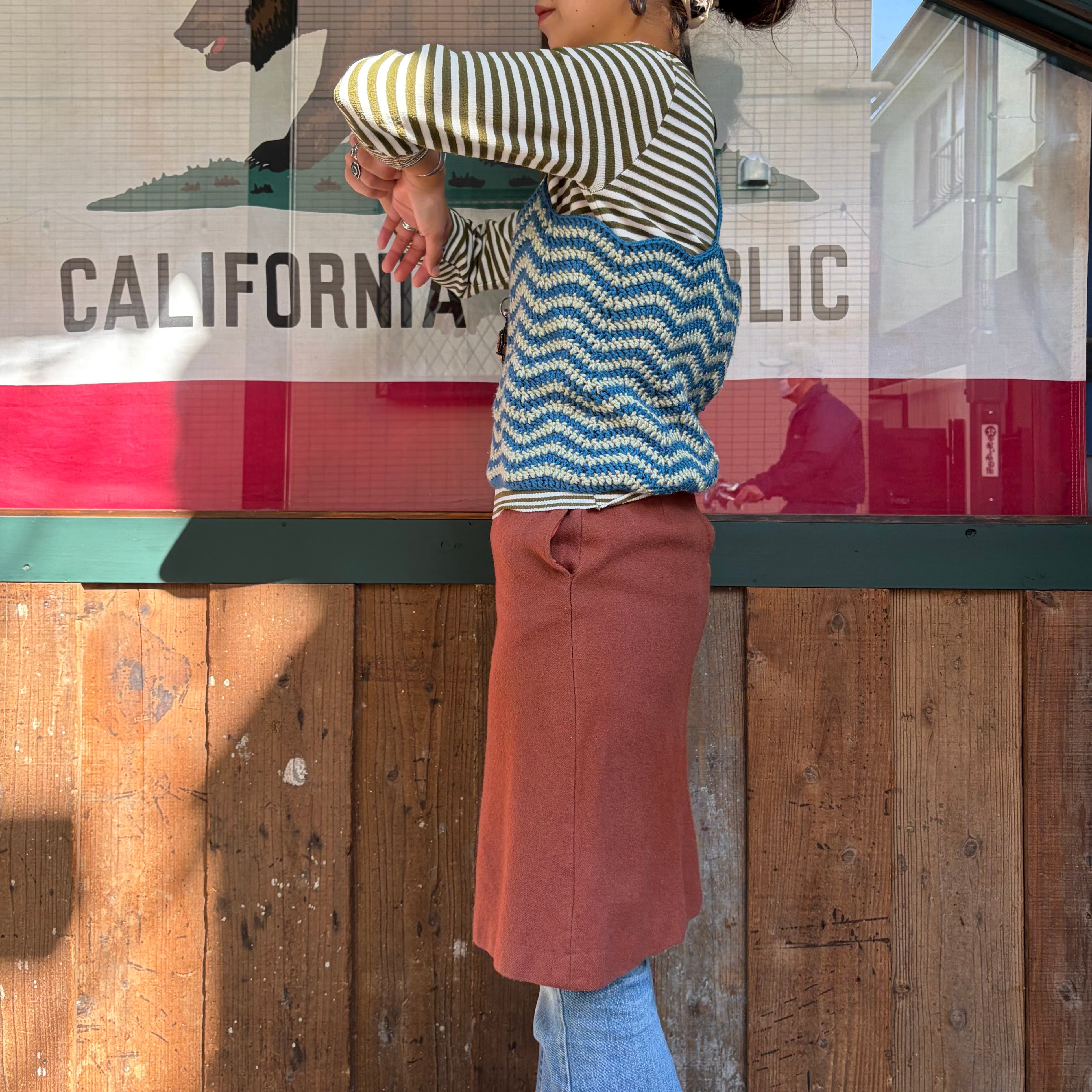 なみなみのボーダーがかわいい、手編みのキャミソールです。くすんだブルーと薄い緑の色合わせもセンスを感じますね。