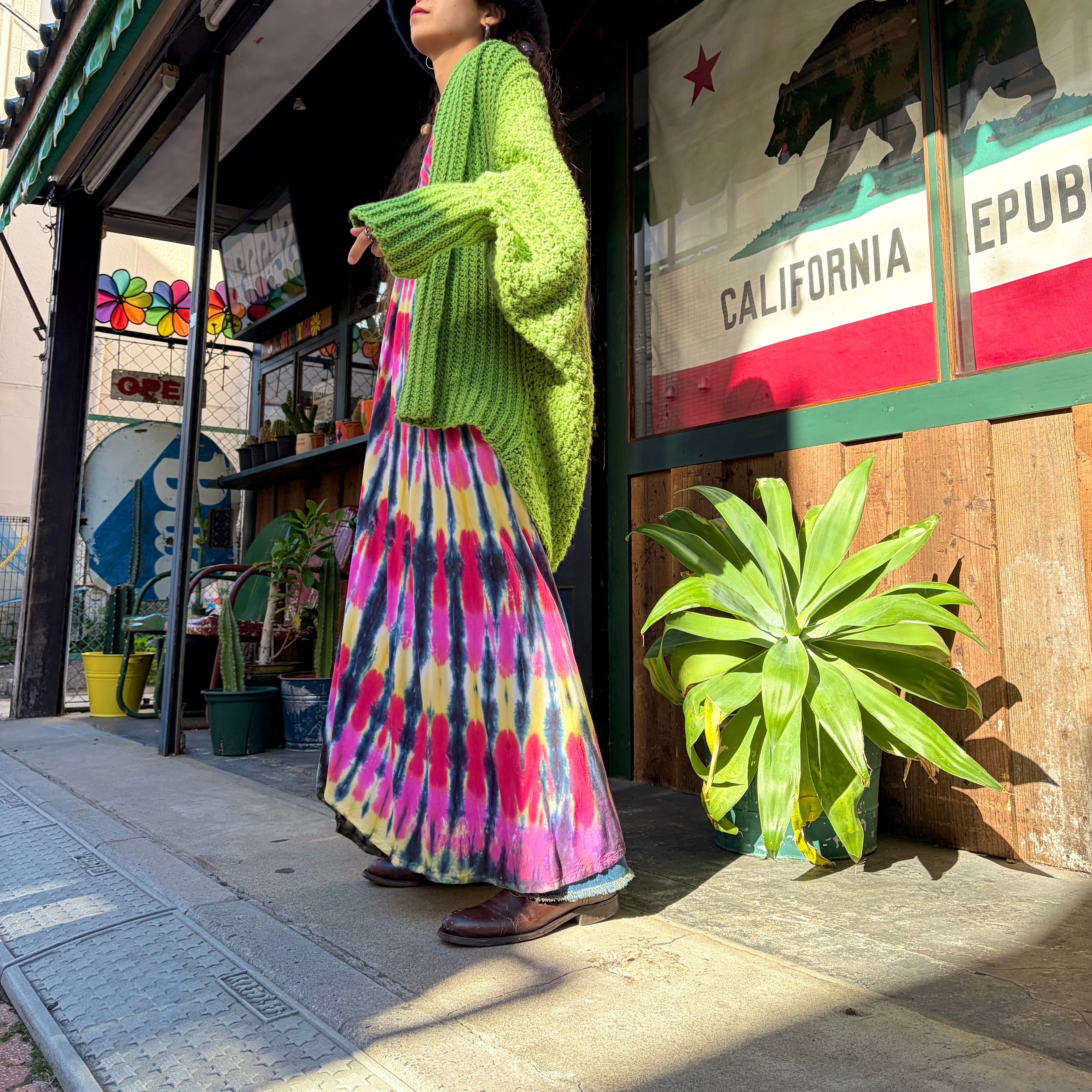 体を包み込むようなシルエットがおもしろい手編みのカーディガンです。