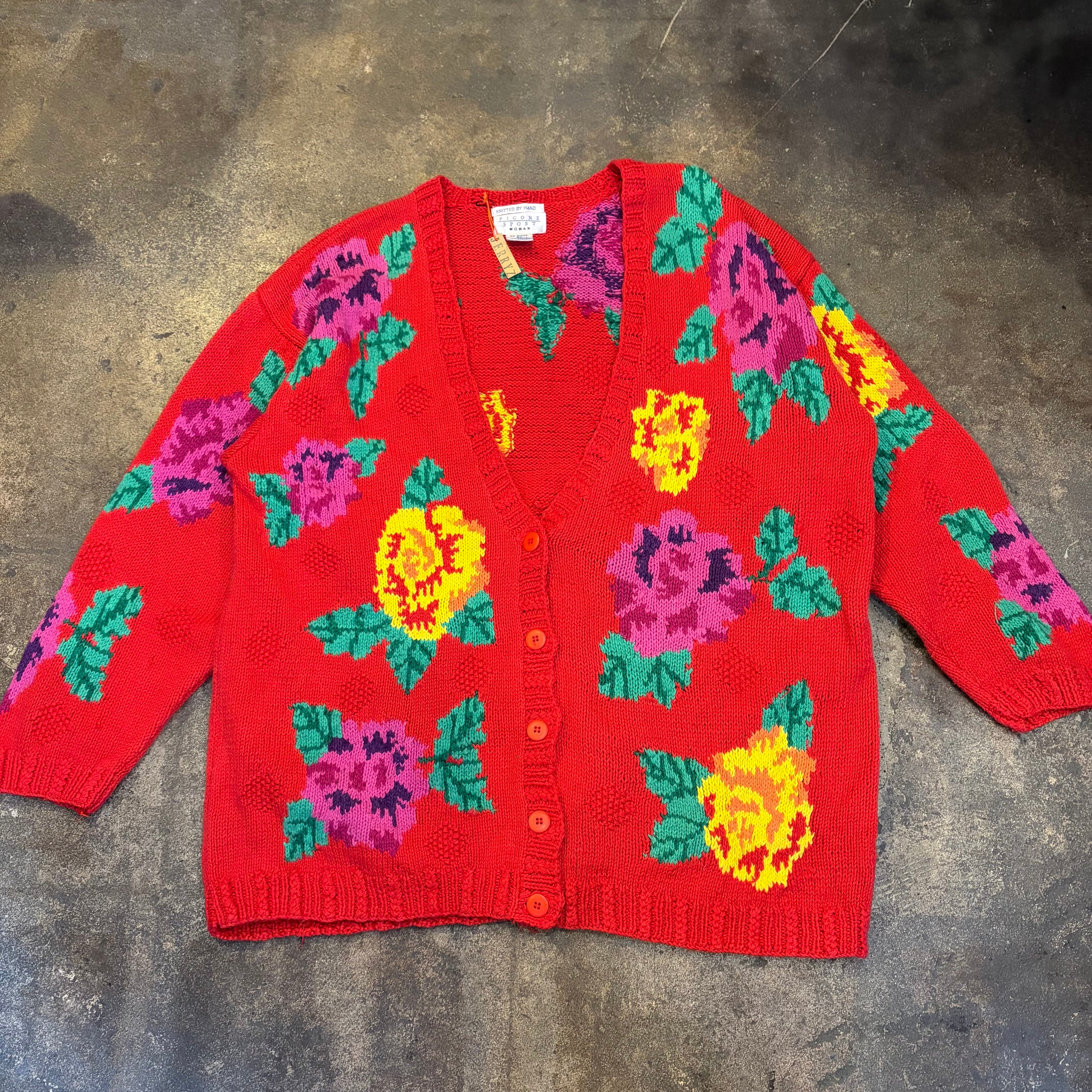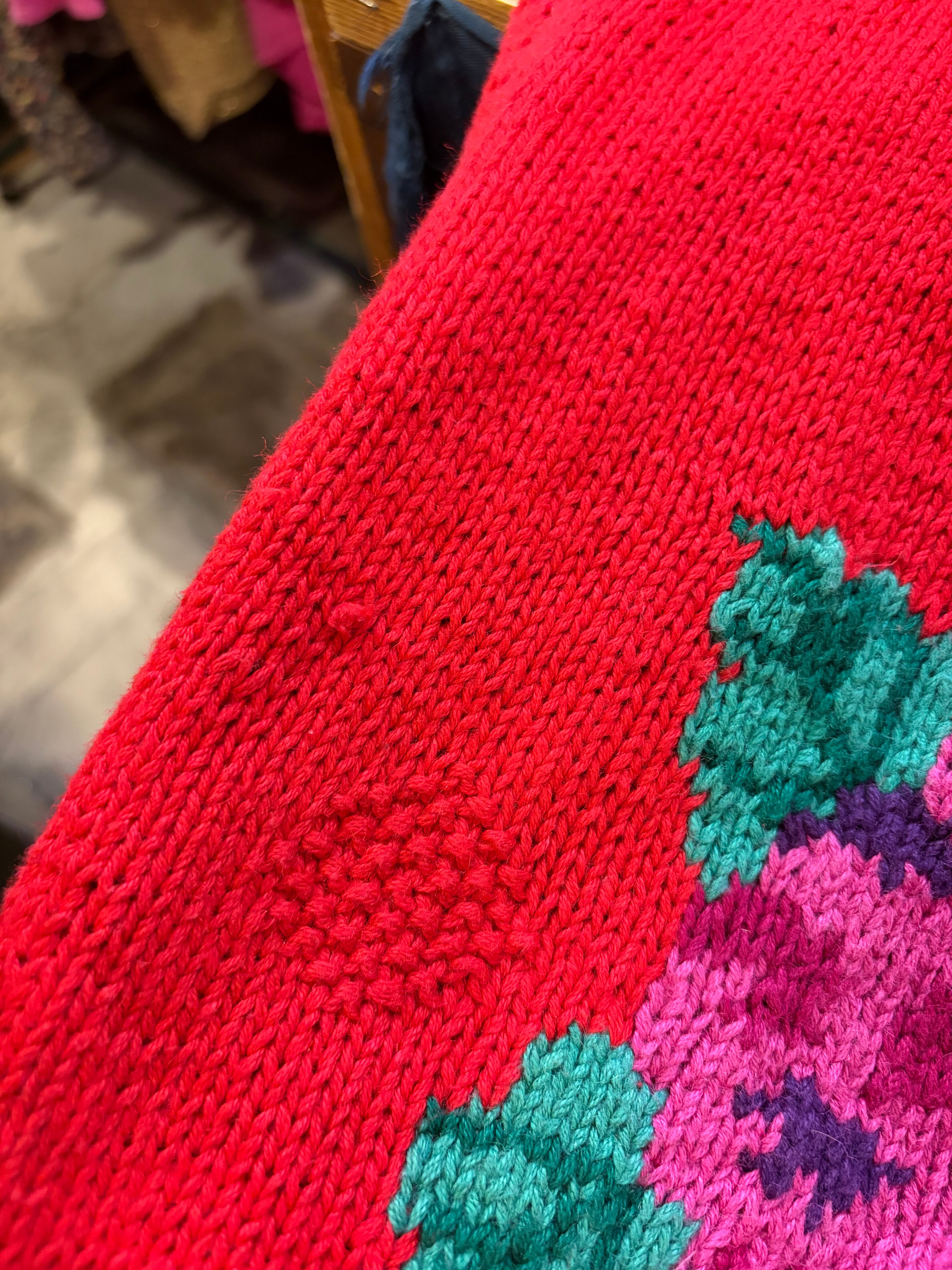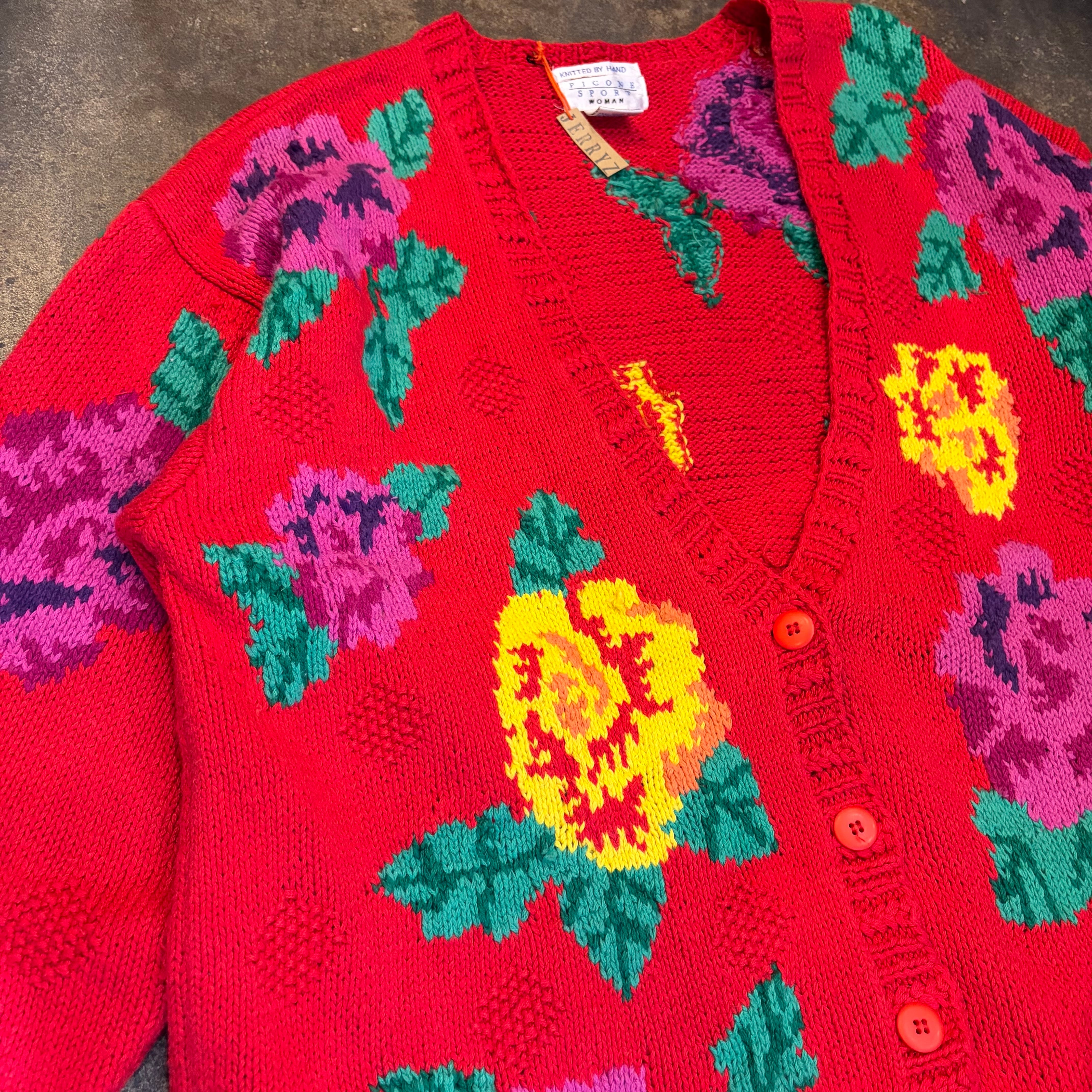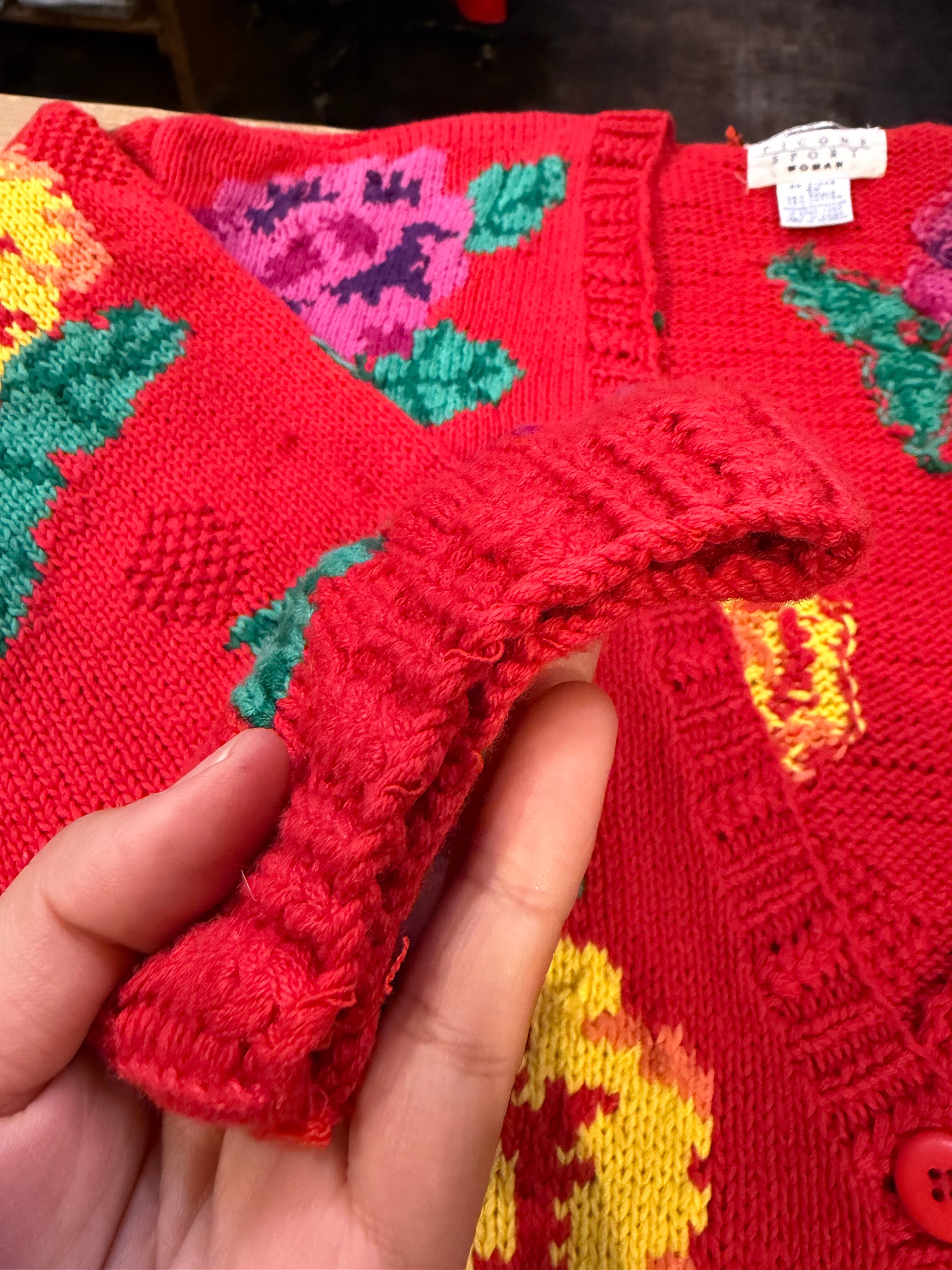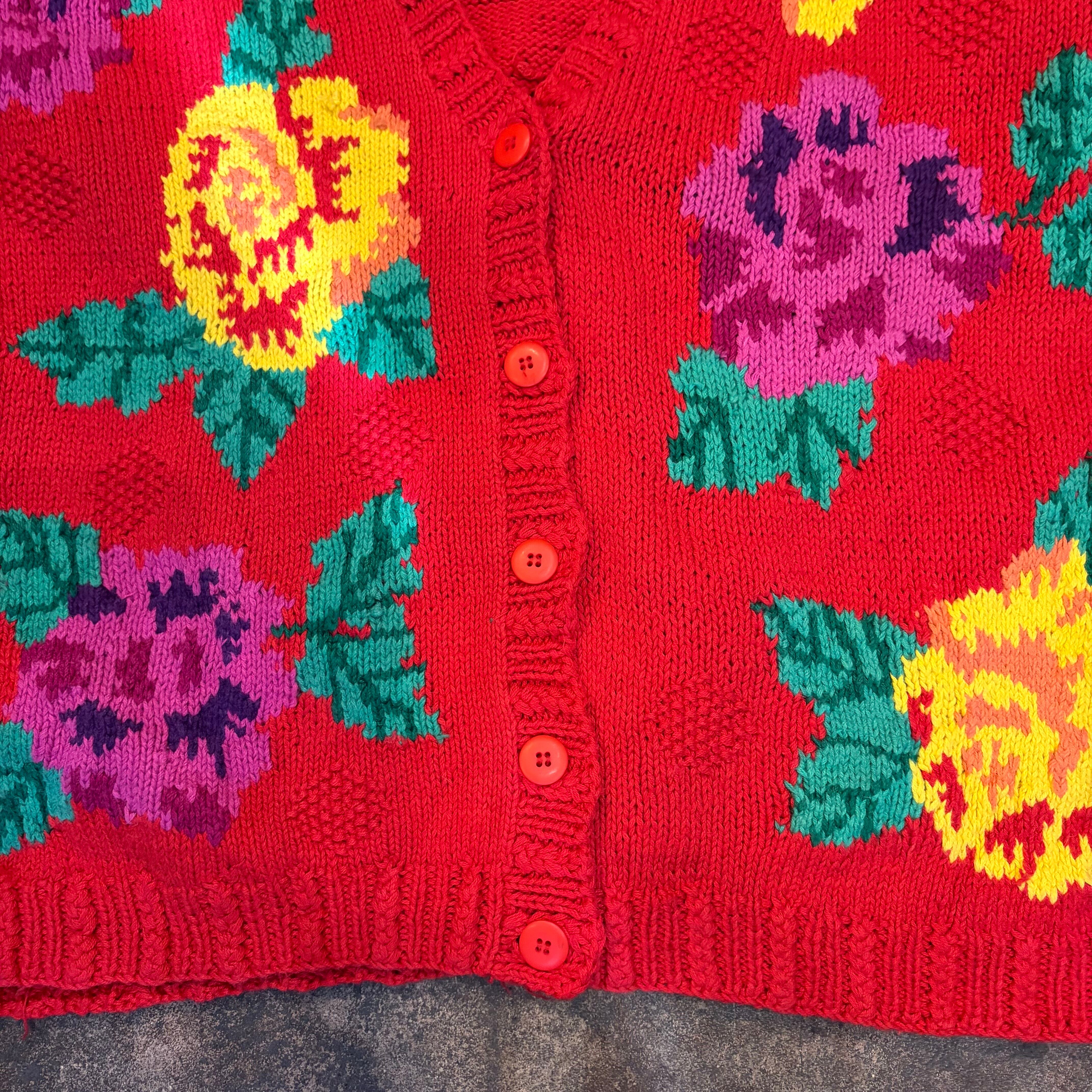赤ベースに黄色とムラサキのお花がとてもハッピーでかわいい手編みのニットカーディガンです。