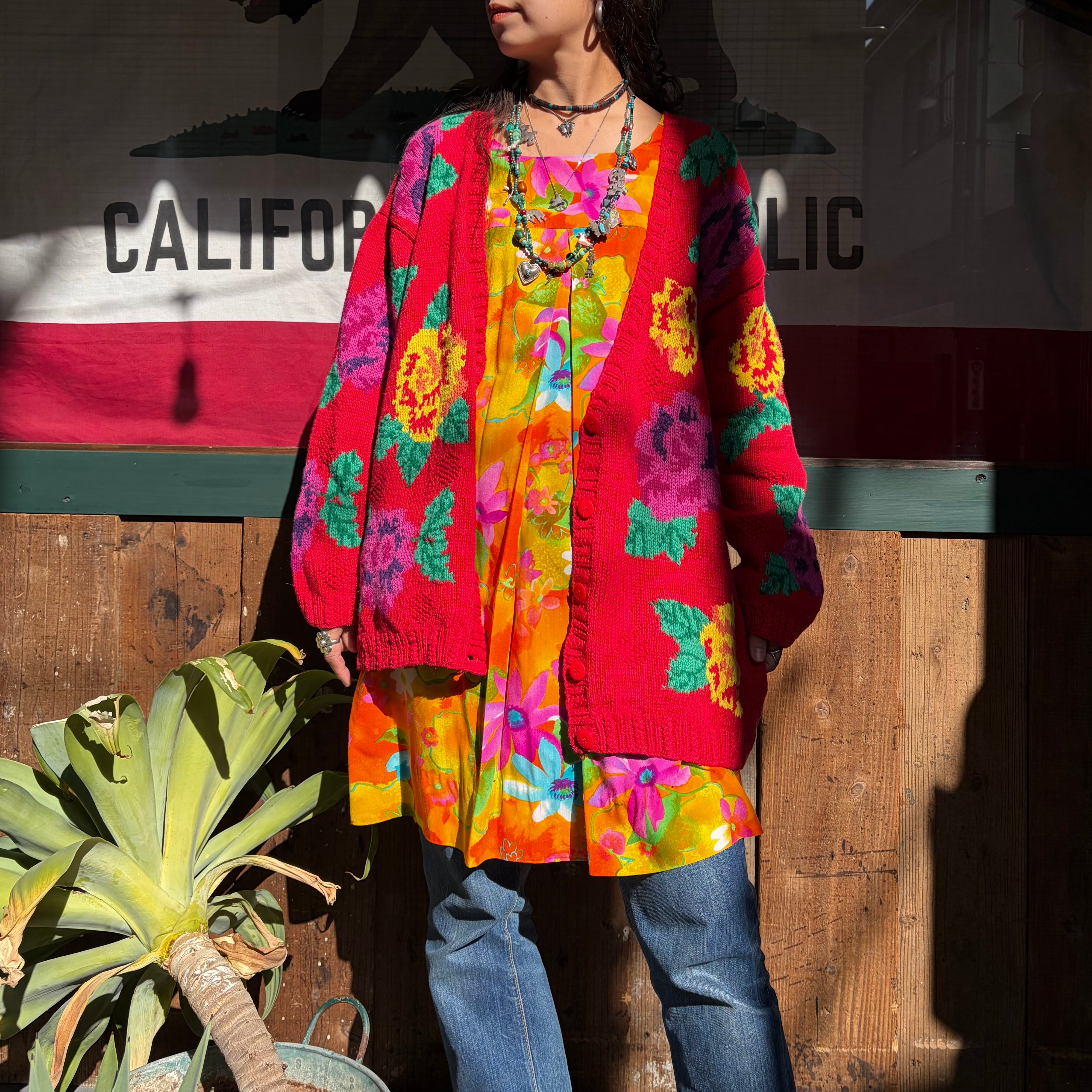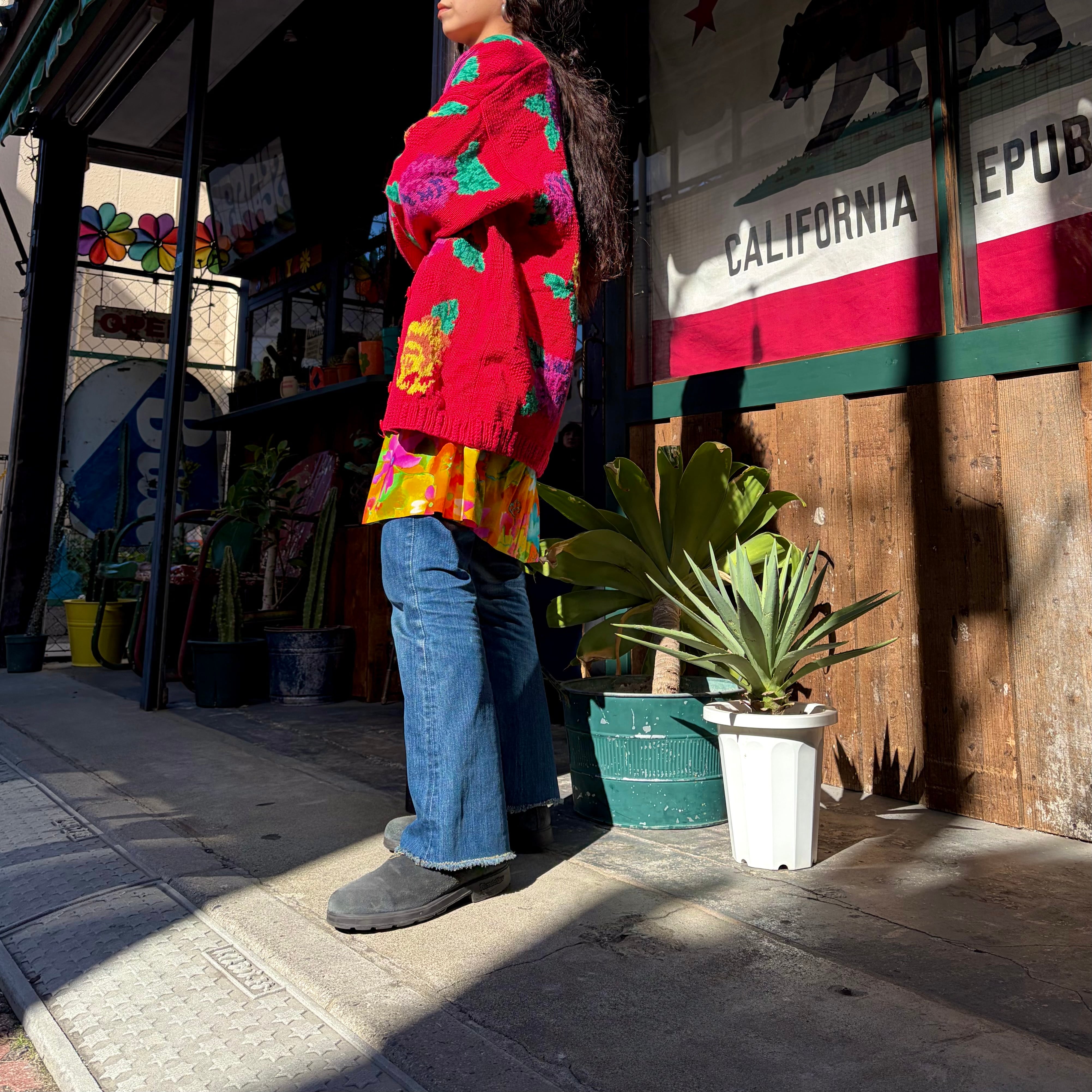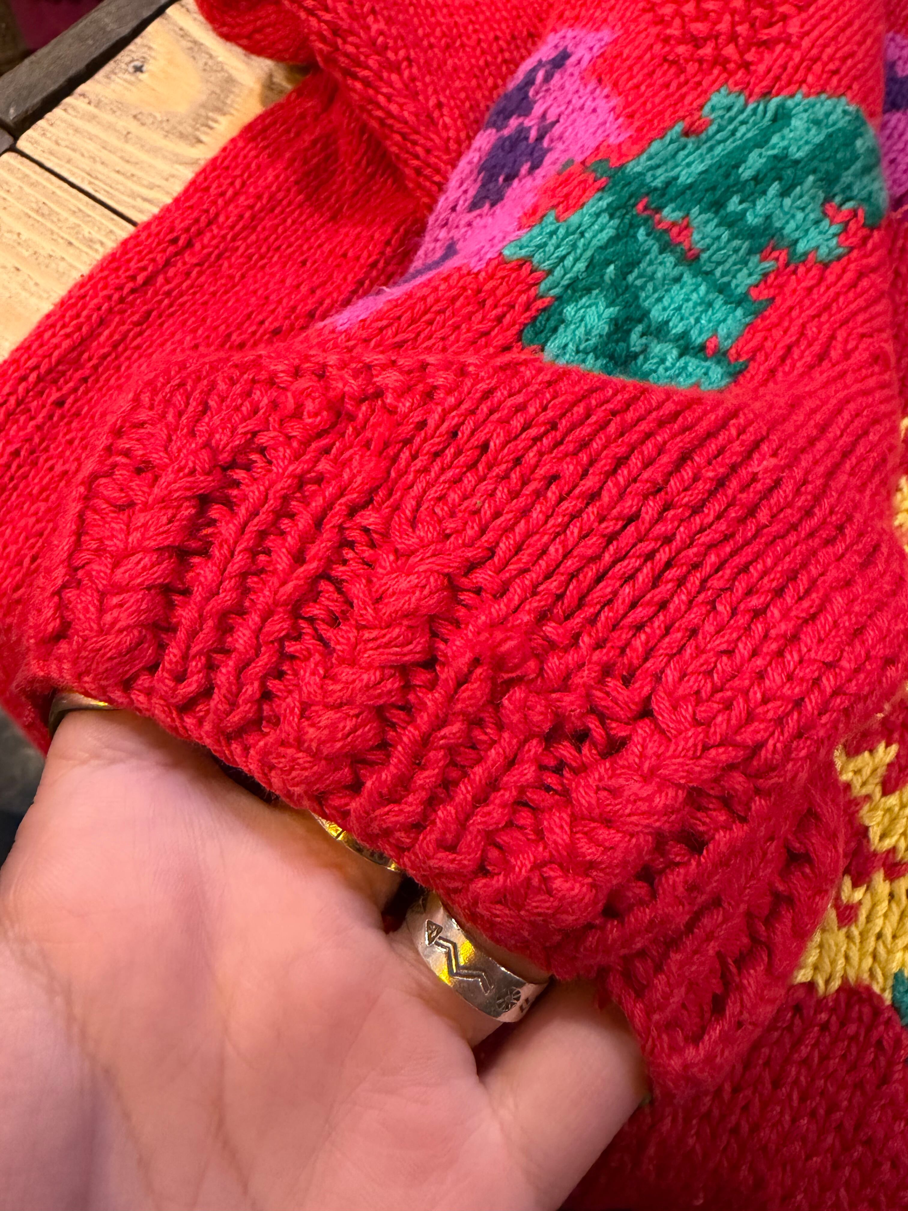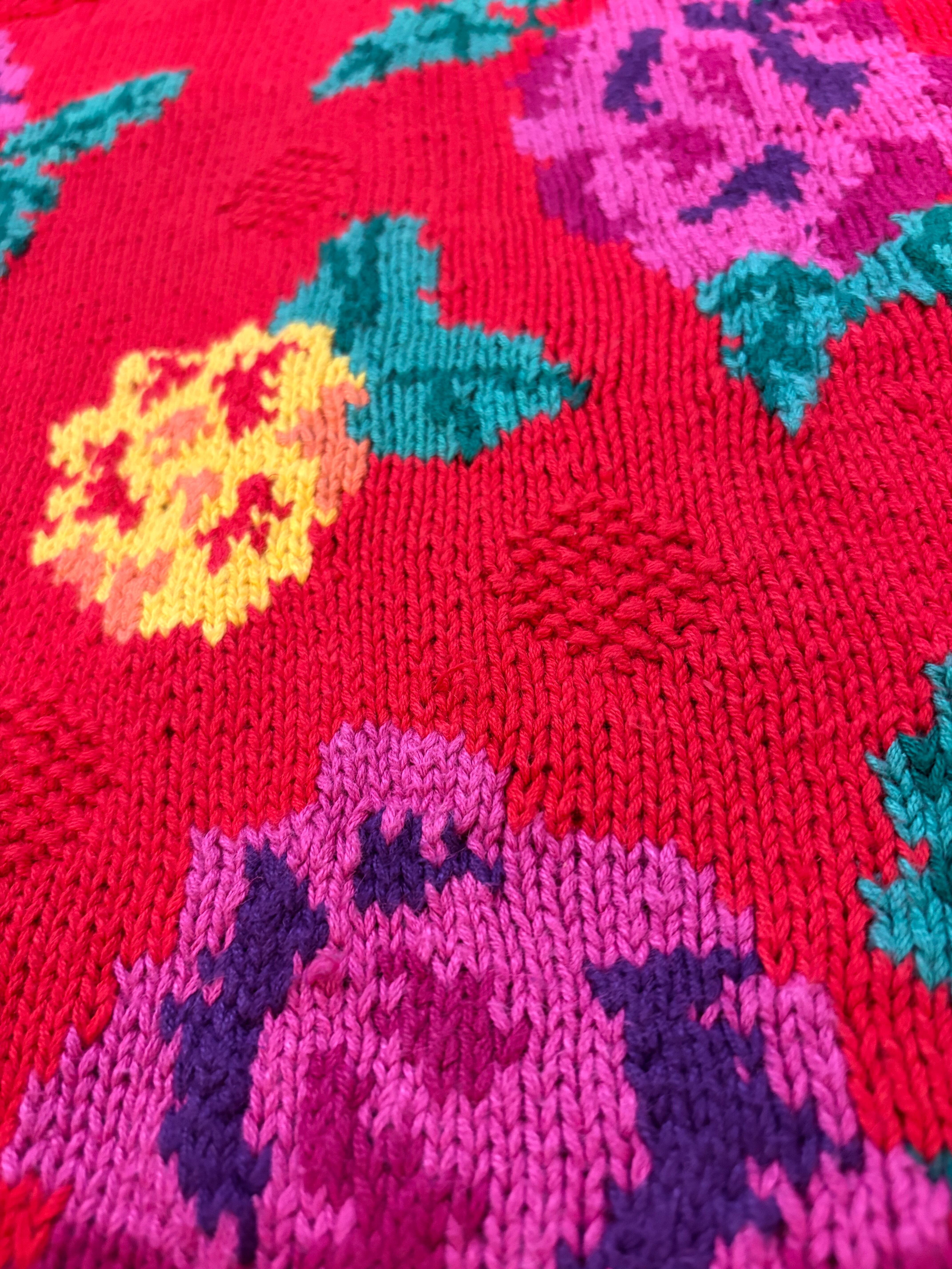 赤ベースに黄色とムラサキのお花がとてもハッピーでかわいい手編みのニットカーディガンです。