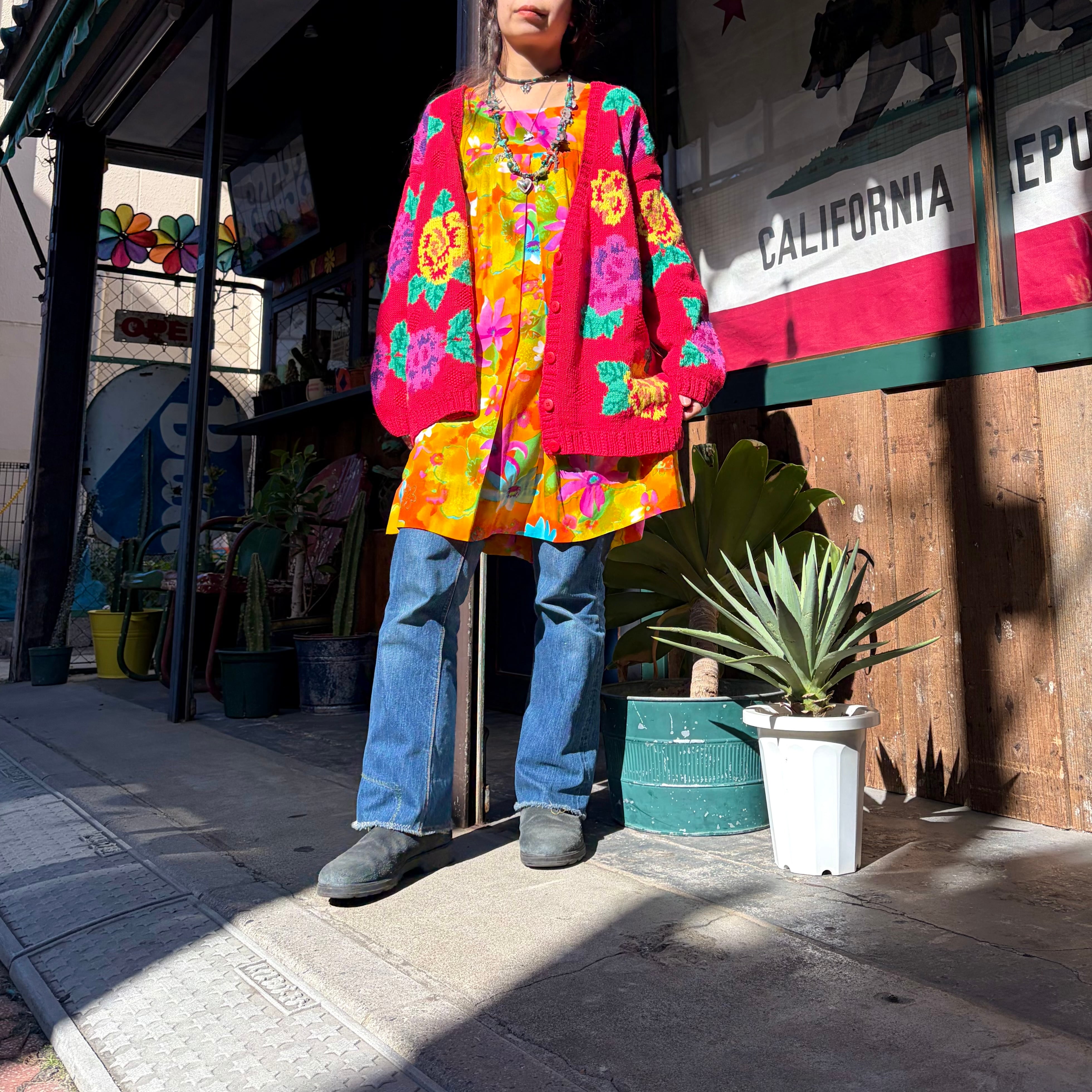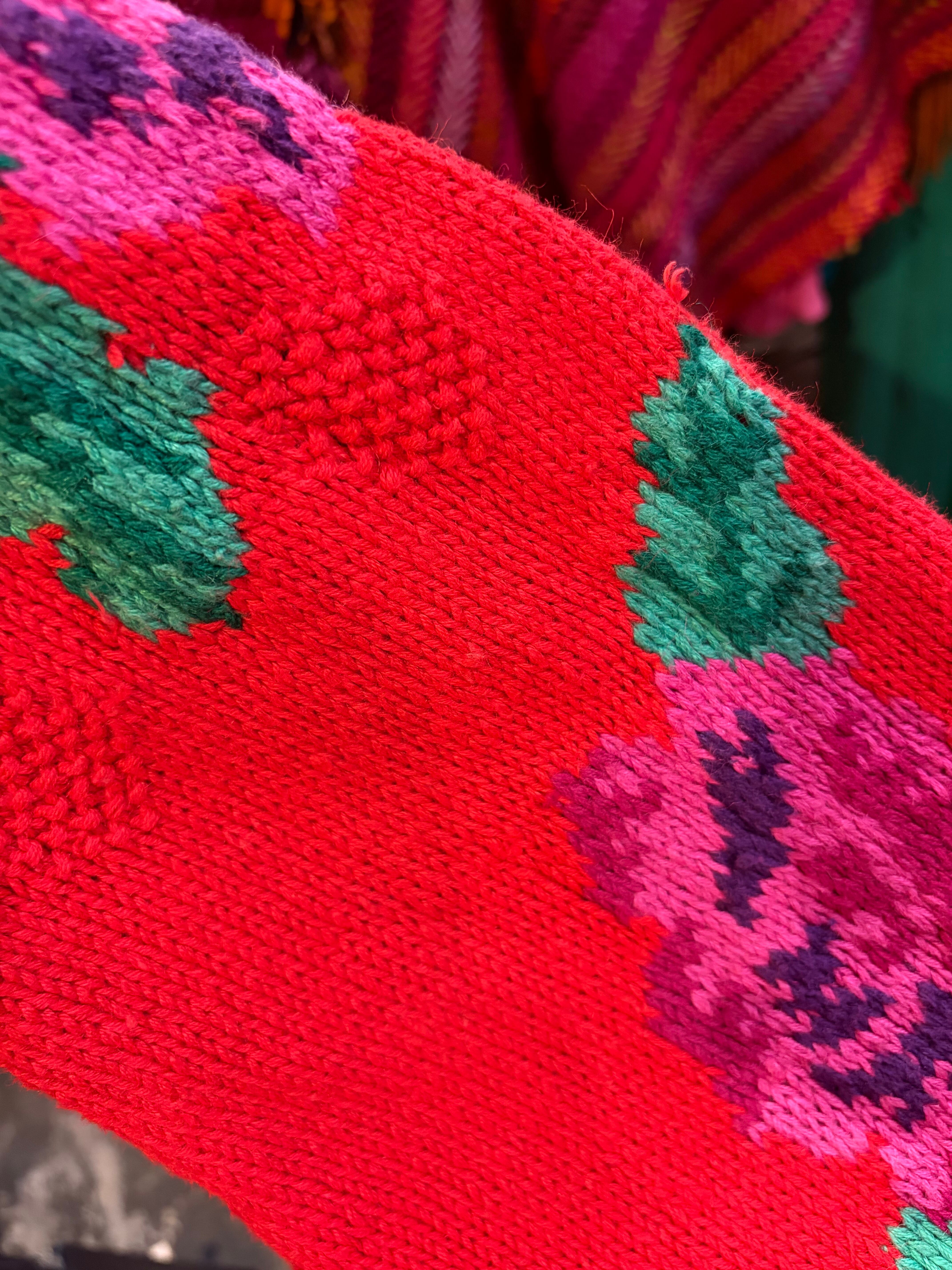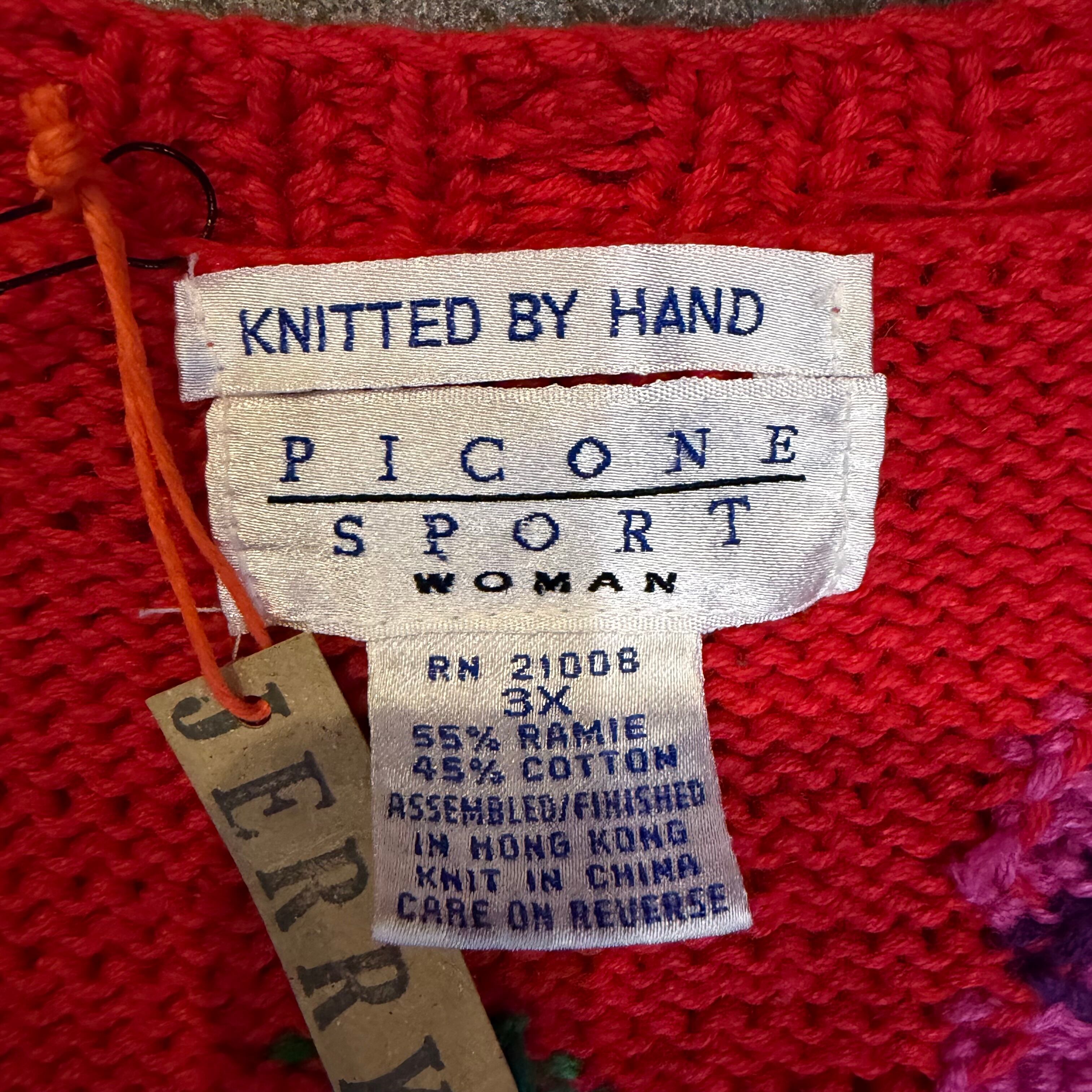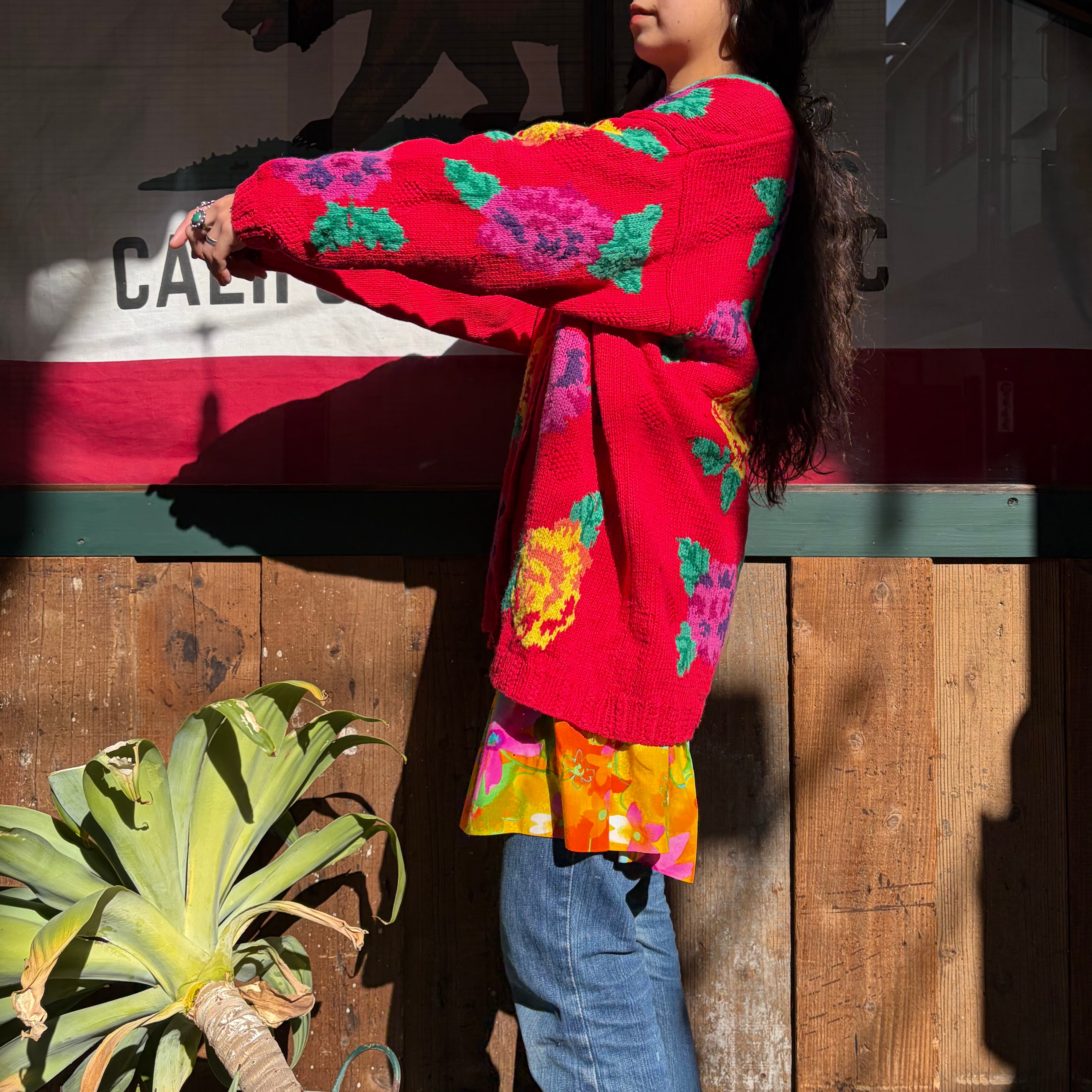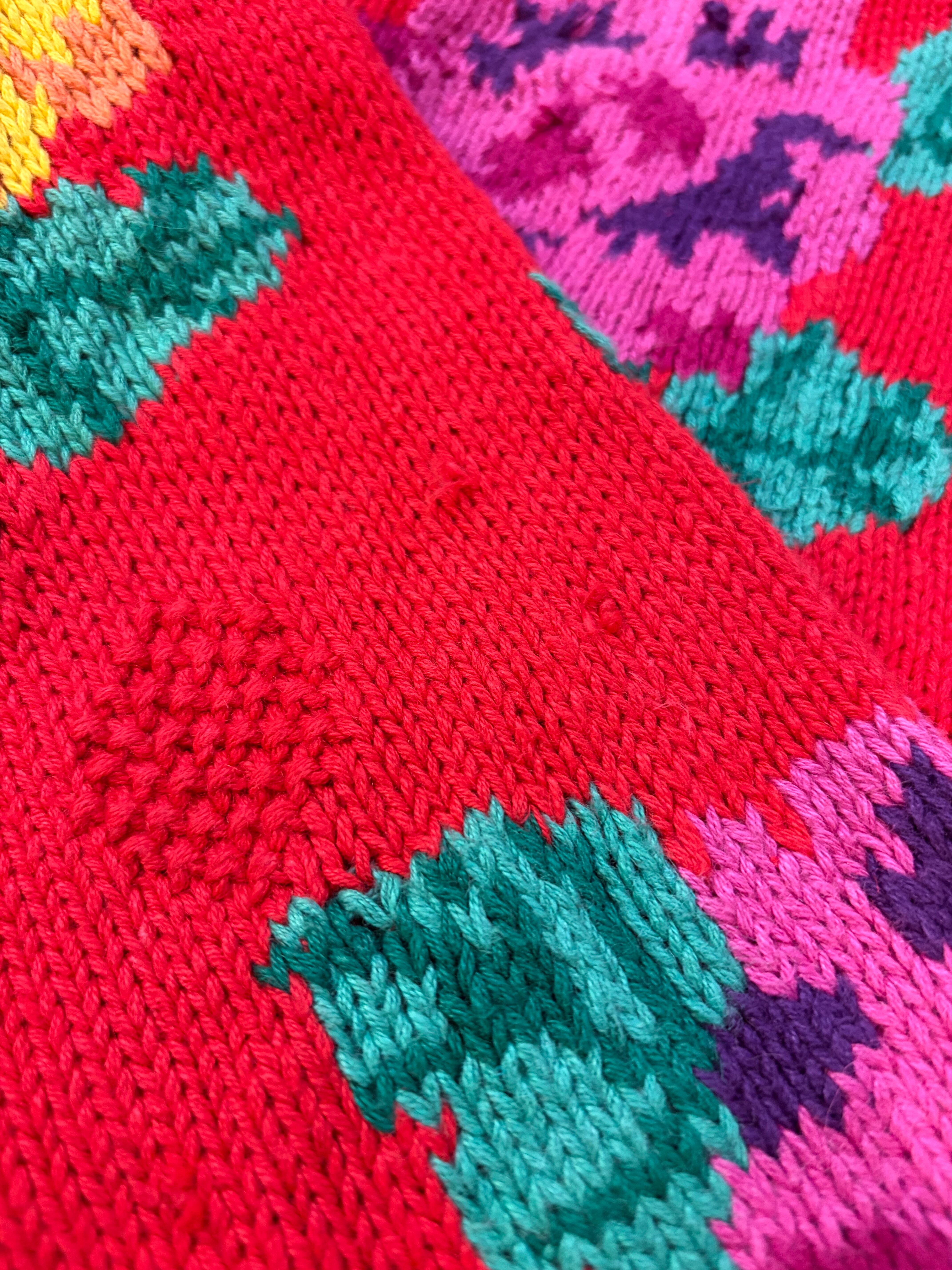 赤ベースに黄色とムラサキのお花がとてもハッピーでかわいい手編みのニットカーディガンです。